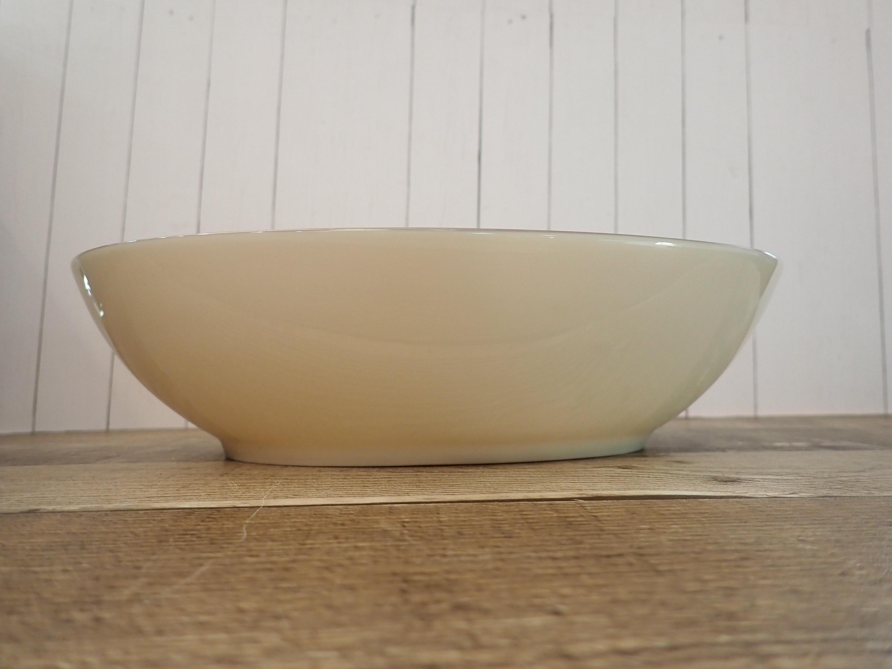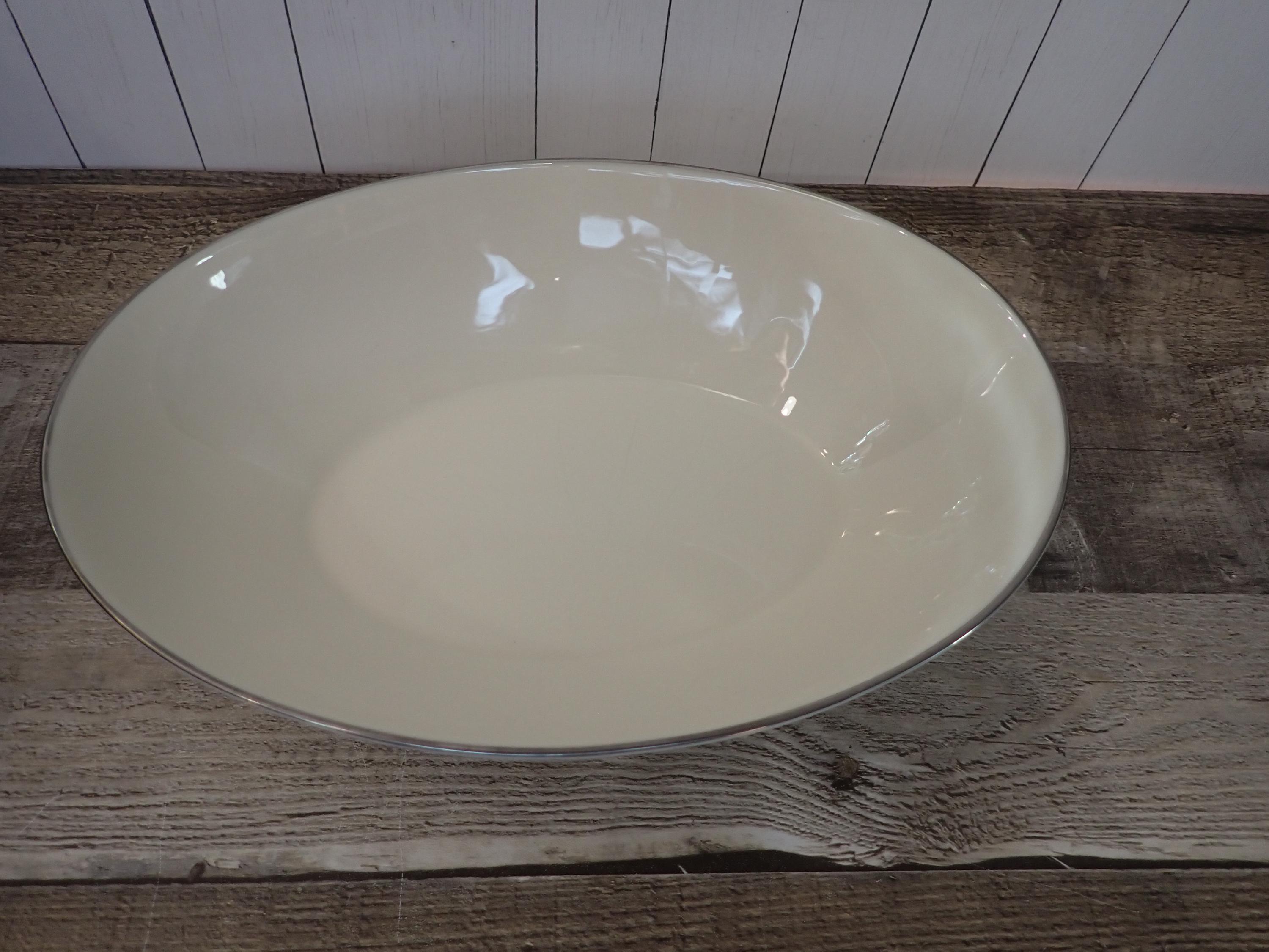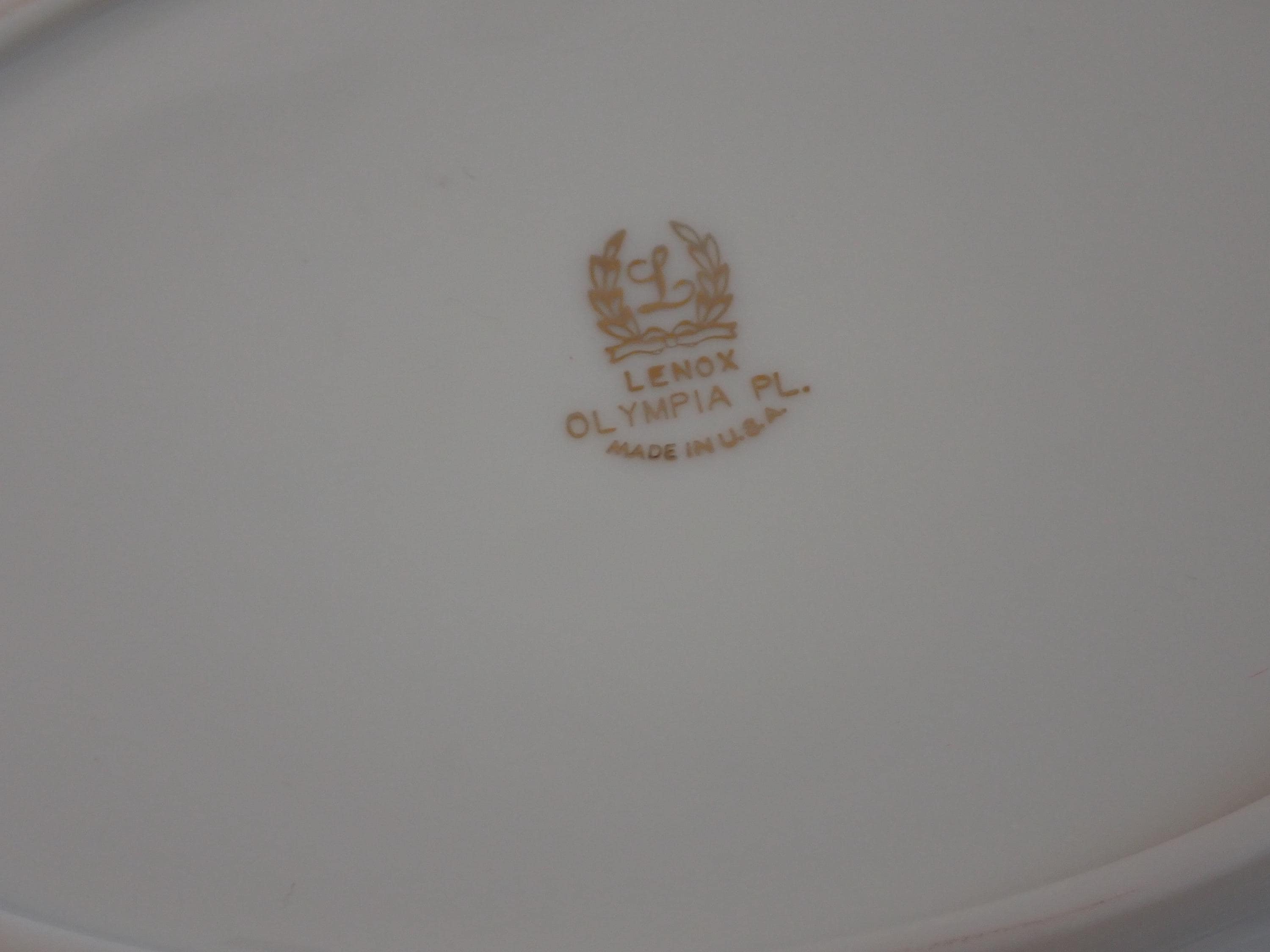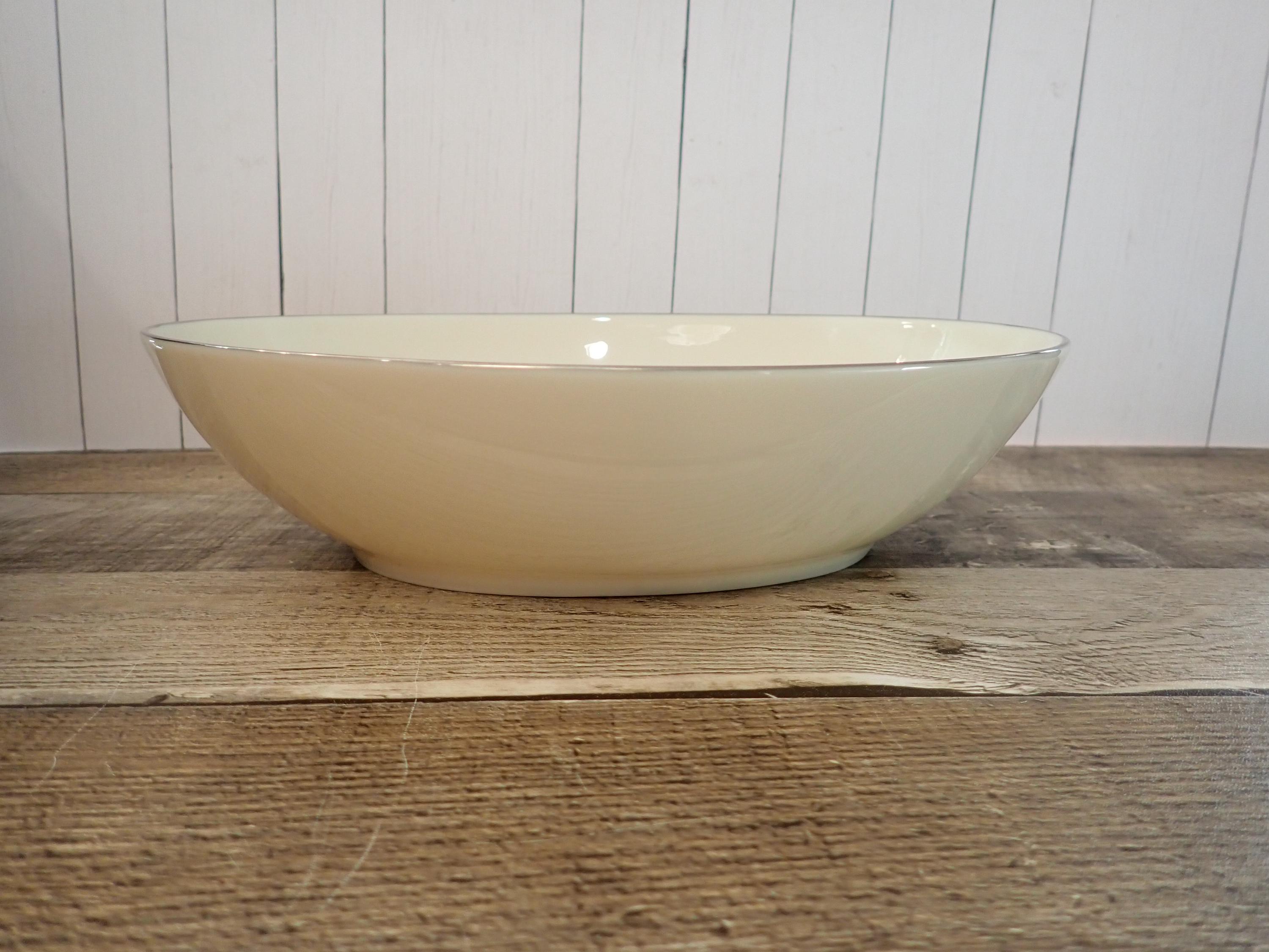This vegetable bowl by Lenox is in the Olympia Platinum pattern and is the 9" Oval Vegetable Bowl. The bowl is 9.75" long, 7" wide, and 2.5" high. It is an ivory colored ceramic, and has a band a silver around the rim. The bottom is marked: LENOX / OLYMPIA PL. / MADE IN USA. The bowl is in very good condition with no chips or cracks. The silver band around the rim is intact.