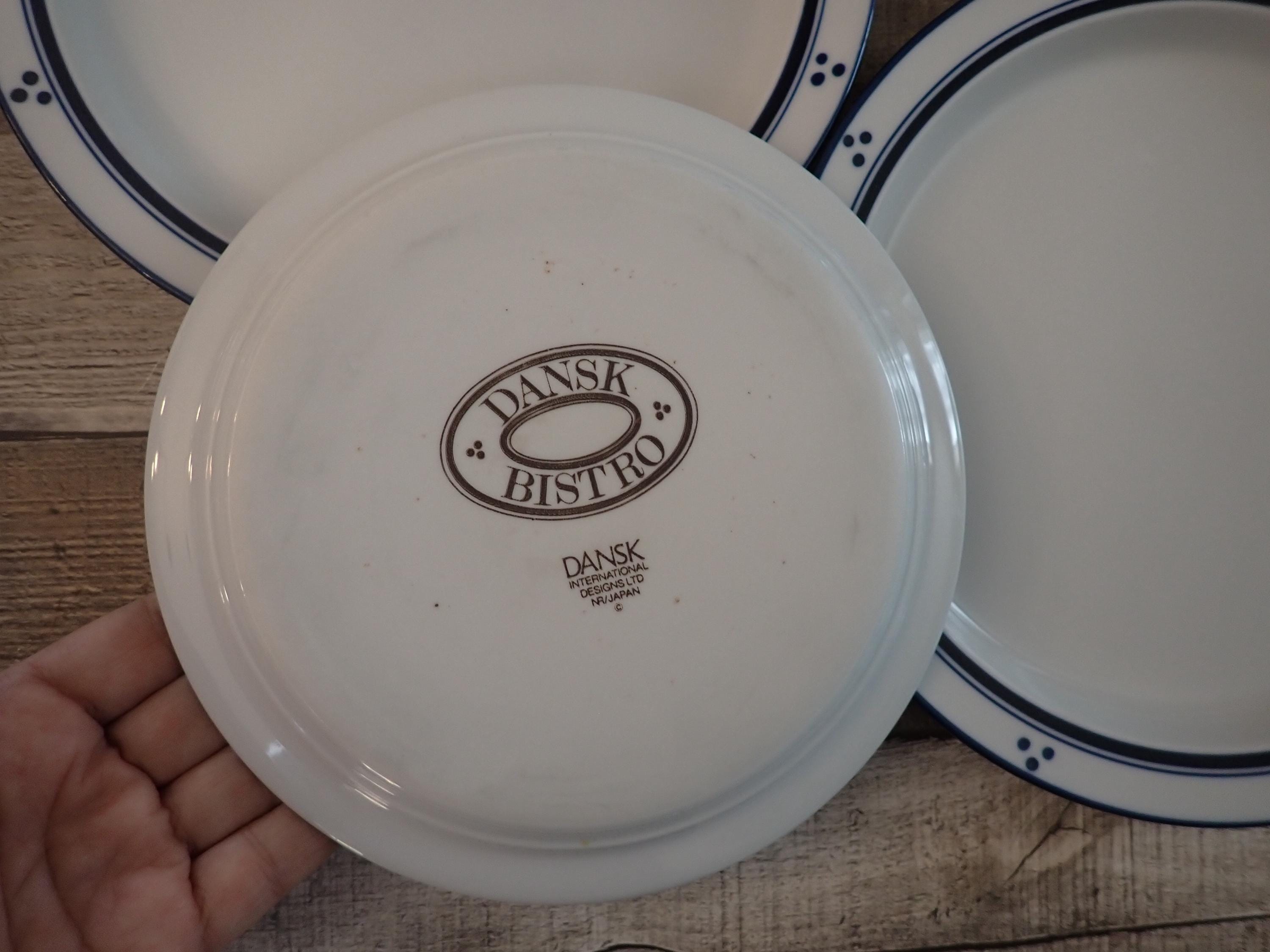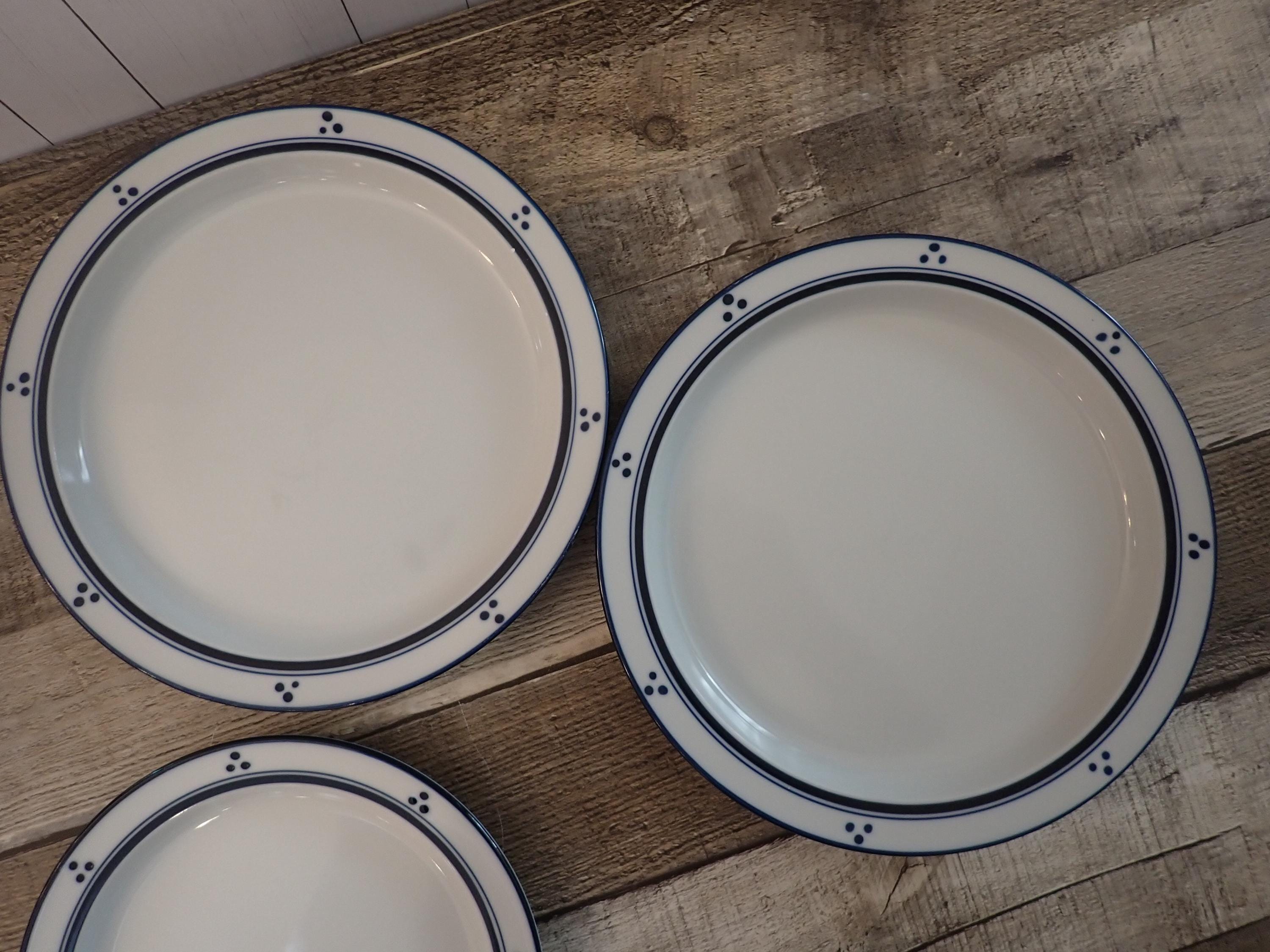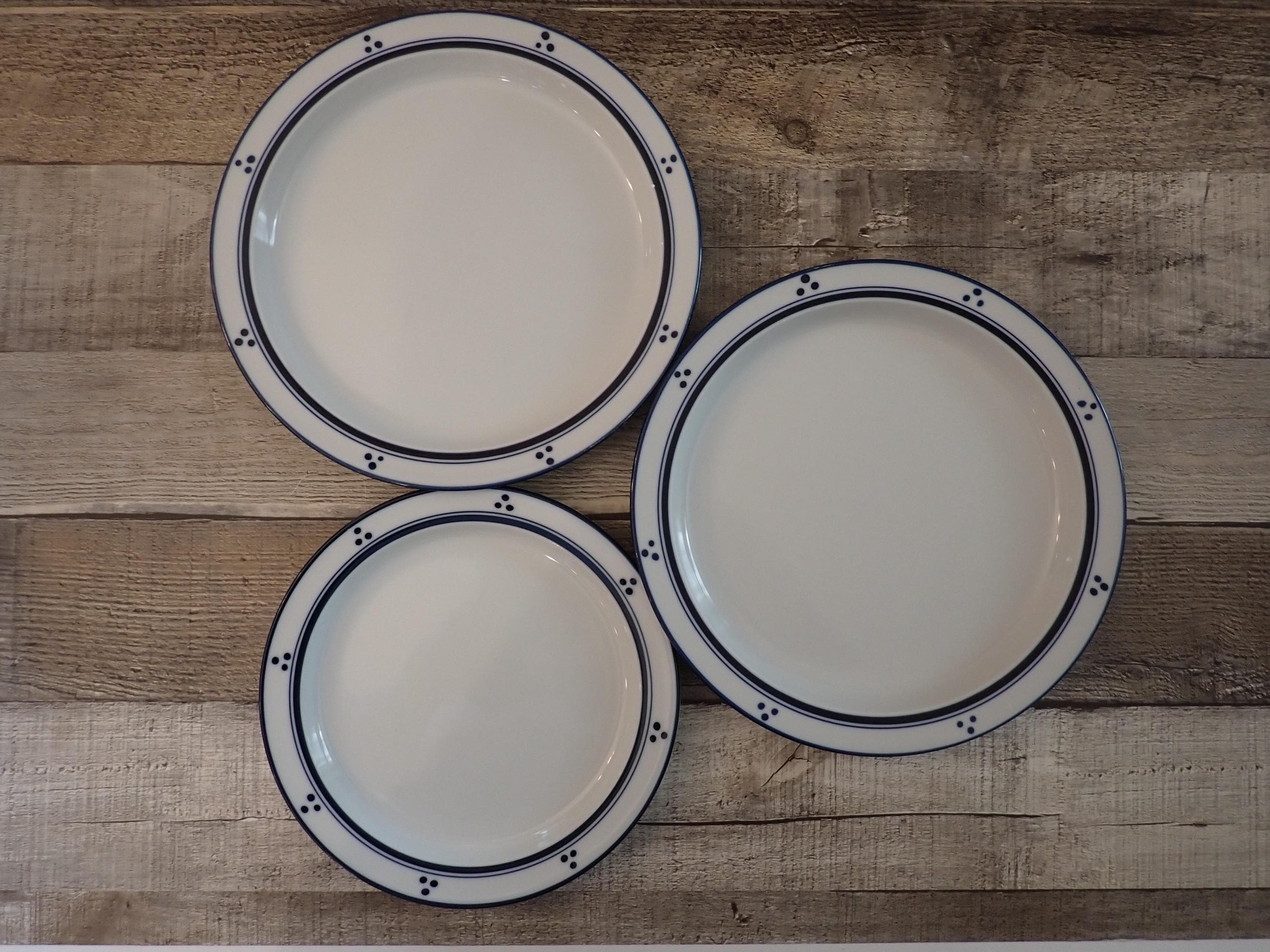 This set of plates by Dansk is in the Fredriksbog Blue Blue pattern and includes 2 salad plates and one bread plate. The plates are a white stoneware with a blue band and dot pattern around the rim. The salad plates are 8.5" in diameter and the bread plate is 7" in diameter. The bottom of each plate is marked: DANSK / INTERNATIONAL DESIGNS LTD / NR/JAPAN. All 3 plates are in very good condition with no chips or cracks. There are some light scratches from use.