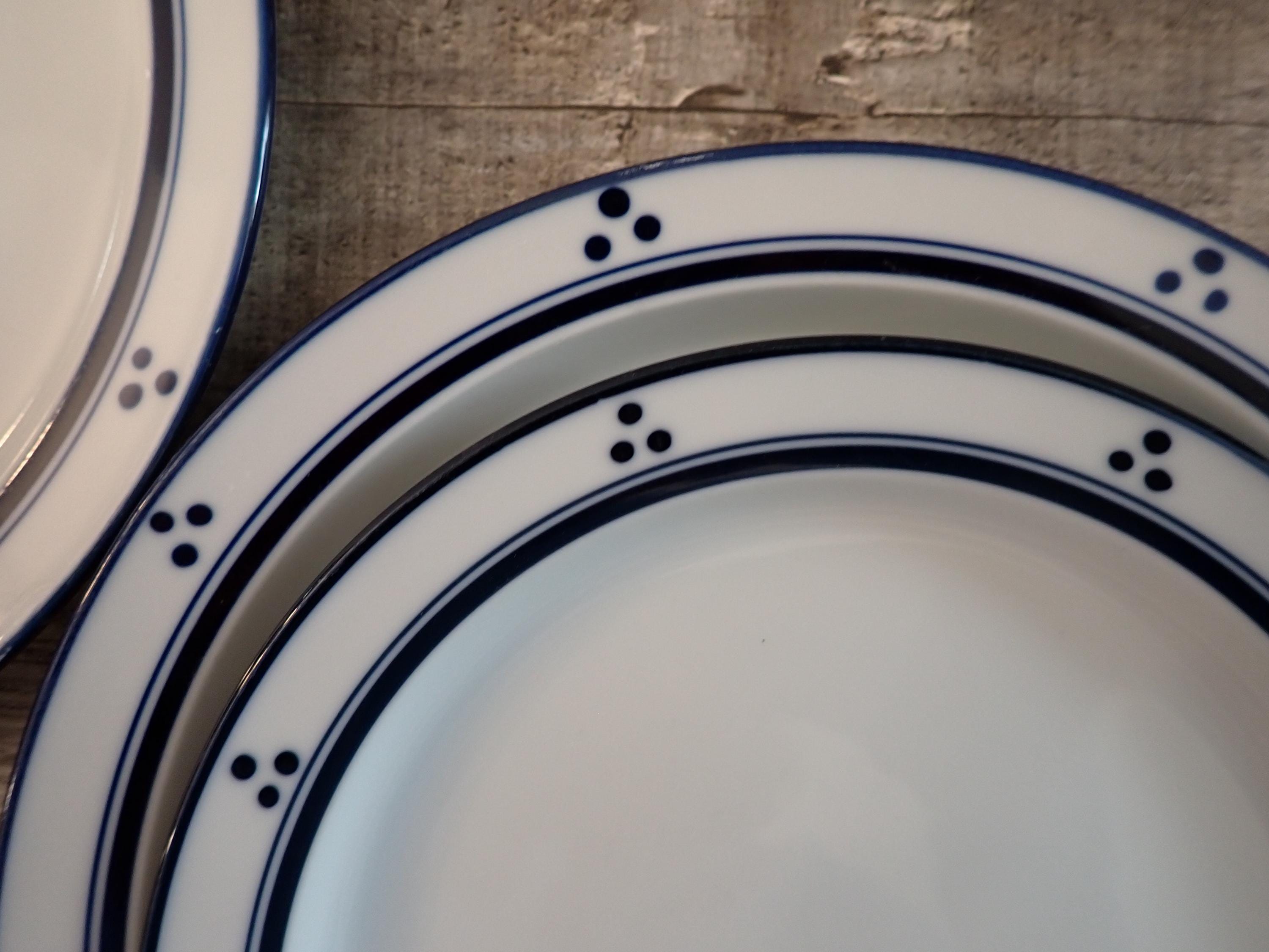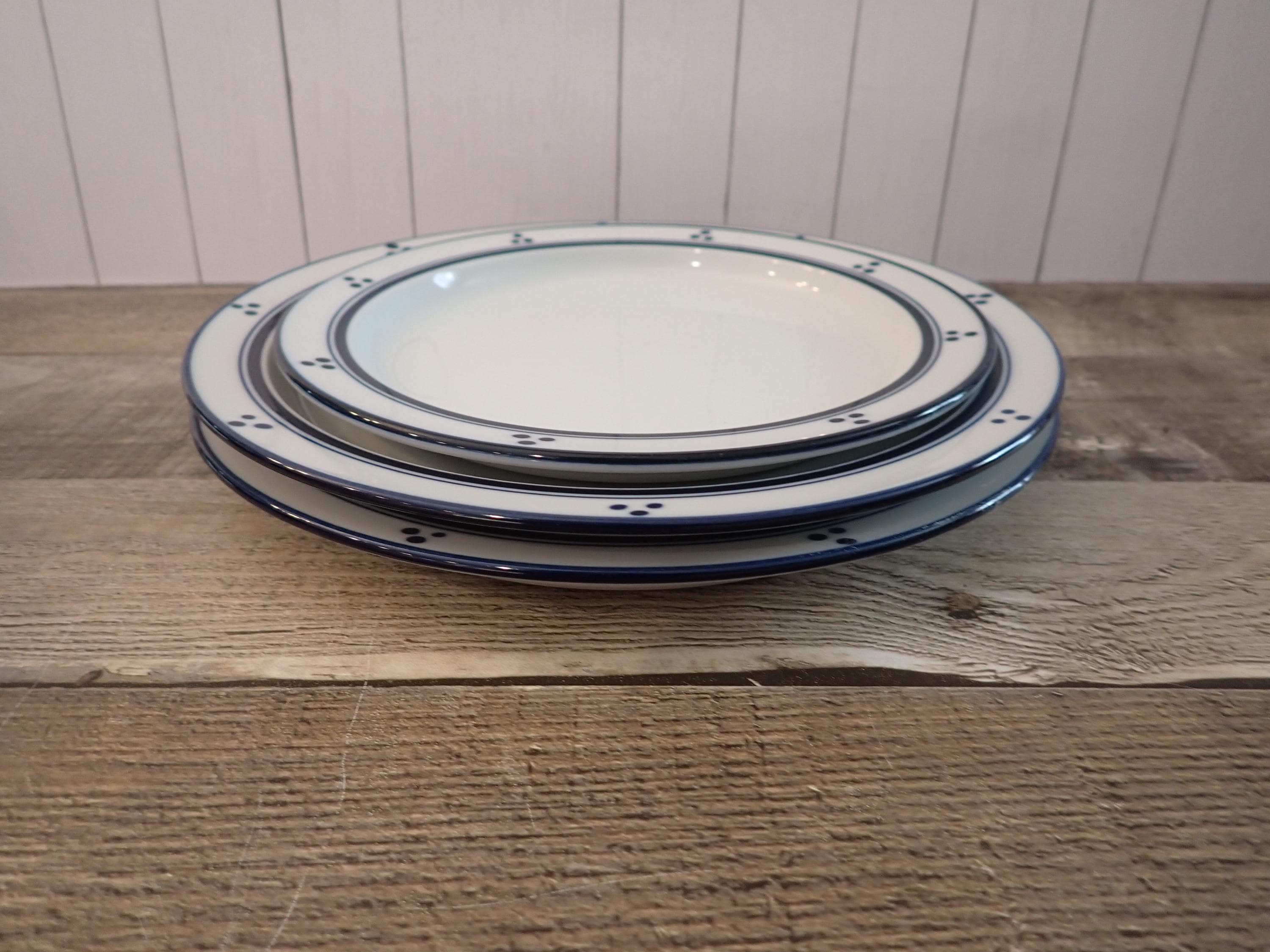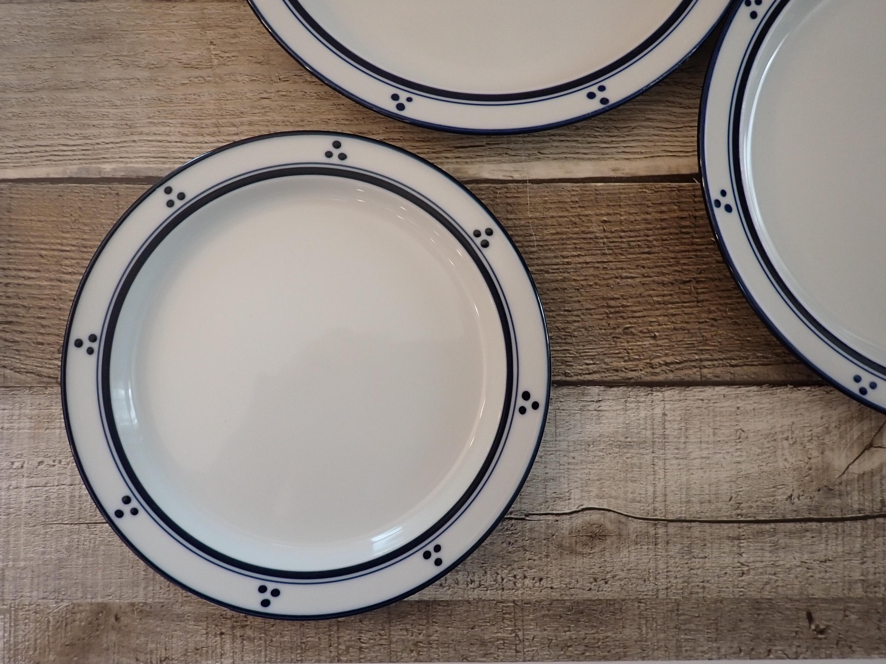 This set of plates by Dansk is in the Fredriksbog Blue Blue pattern and includes 2 salad plates and one bread plate. The plates are a white stoneware with a blue band and dot pattern around the rim. The salad plates are 8.5" in diameter and the bread plate is 7" in diameter. The bottom of each plate is marked: DANSK / INTERNATIONAL DESIGNS LTD / NR/JAPAN. All 3 plates are in very good condition with no chips or cracks. There are some light scratches from use.