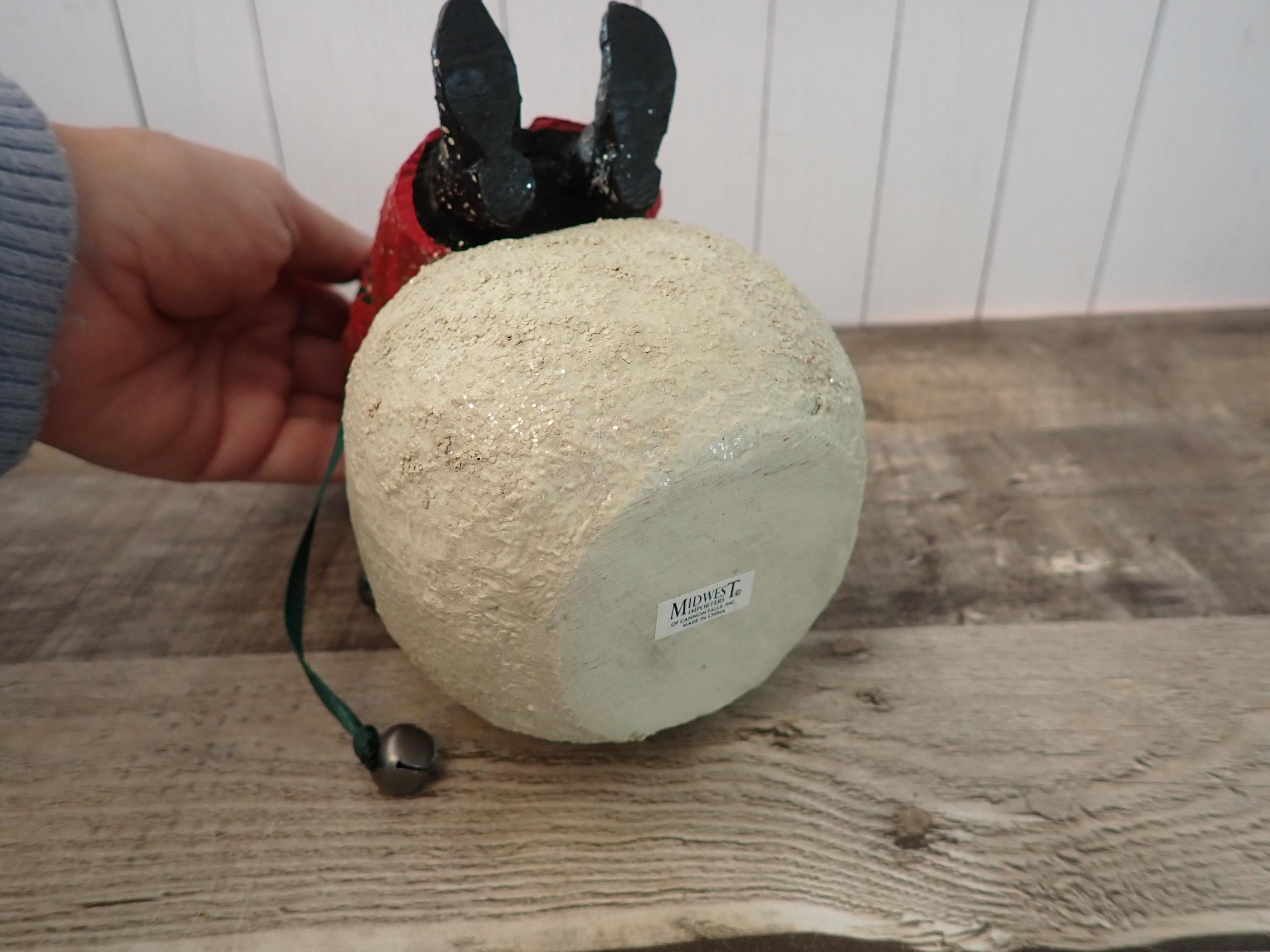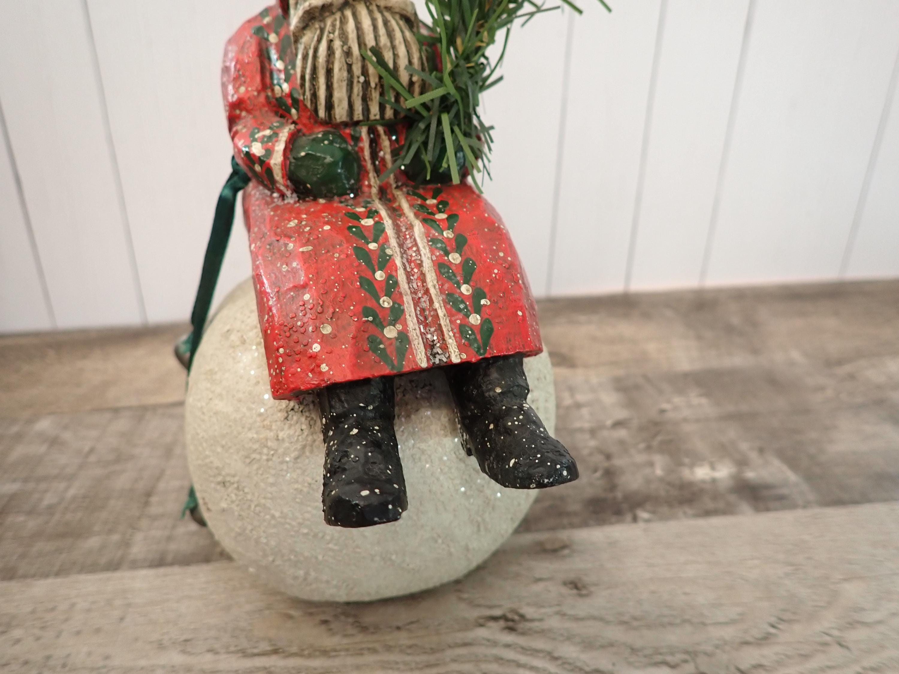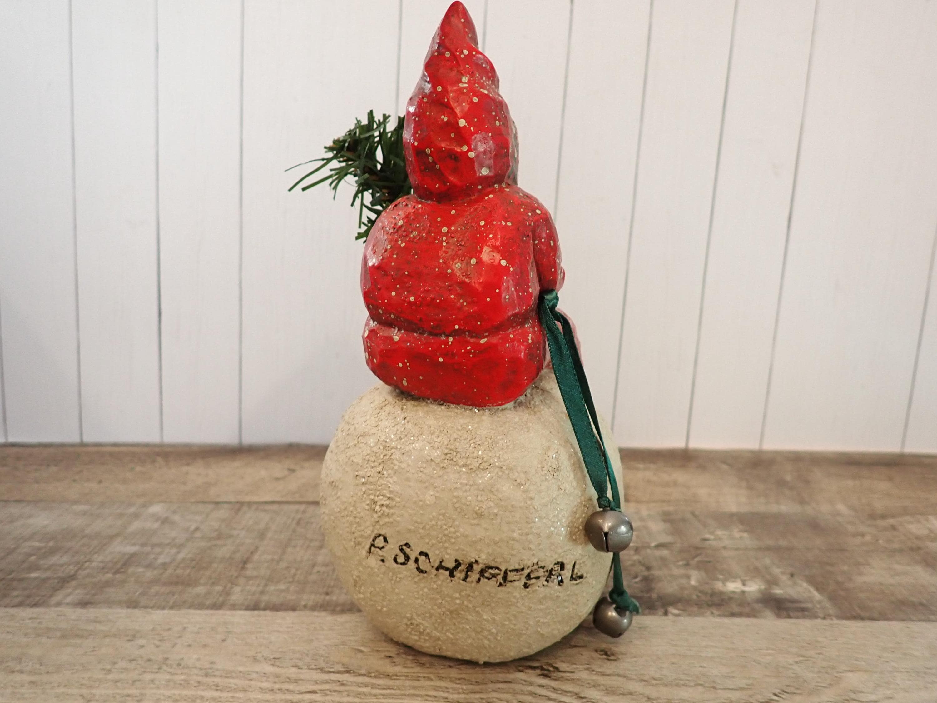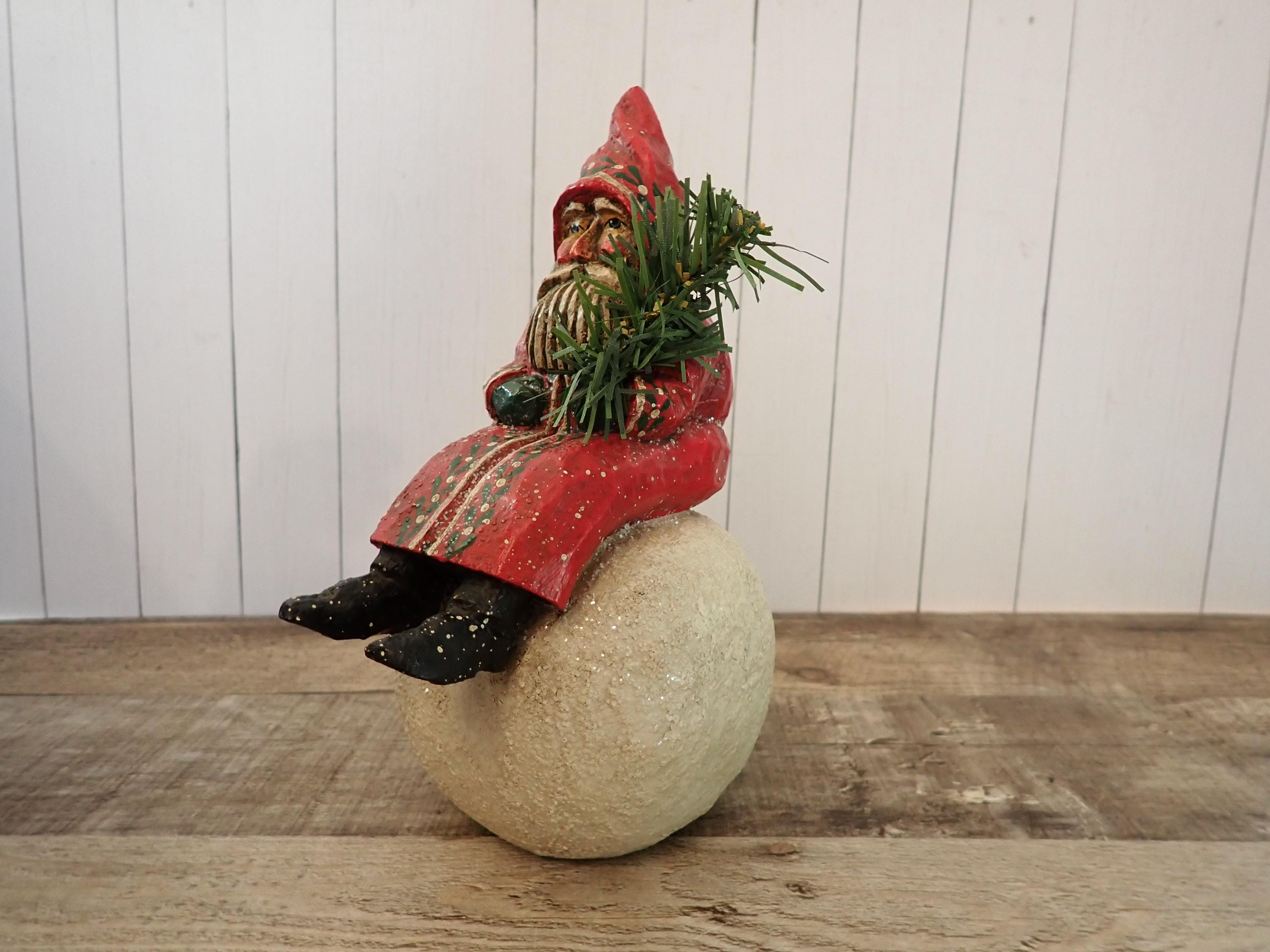 This Santa figurine by Pam Schifferl is 7.75" tall and 4" wide and deep. It is a resin piece made to look like carved wood and features a Santa Claus sitting on a large snowball. The back of the piece is marked SCHIFFERL. The figurine is in very nice condition with no chips, cracks or damage.