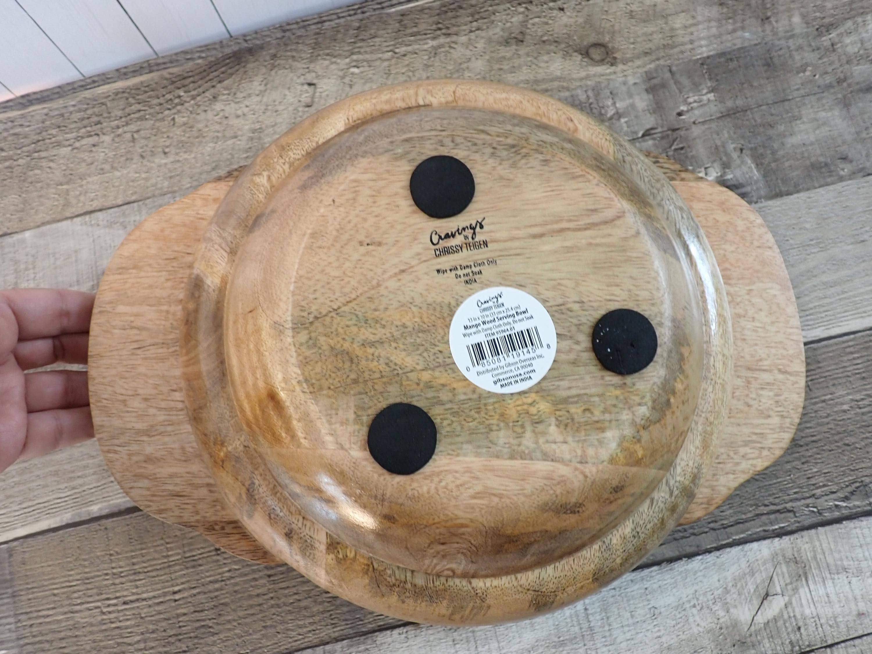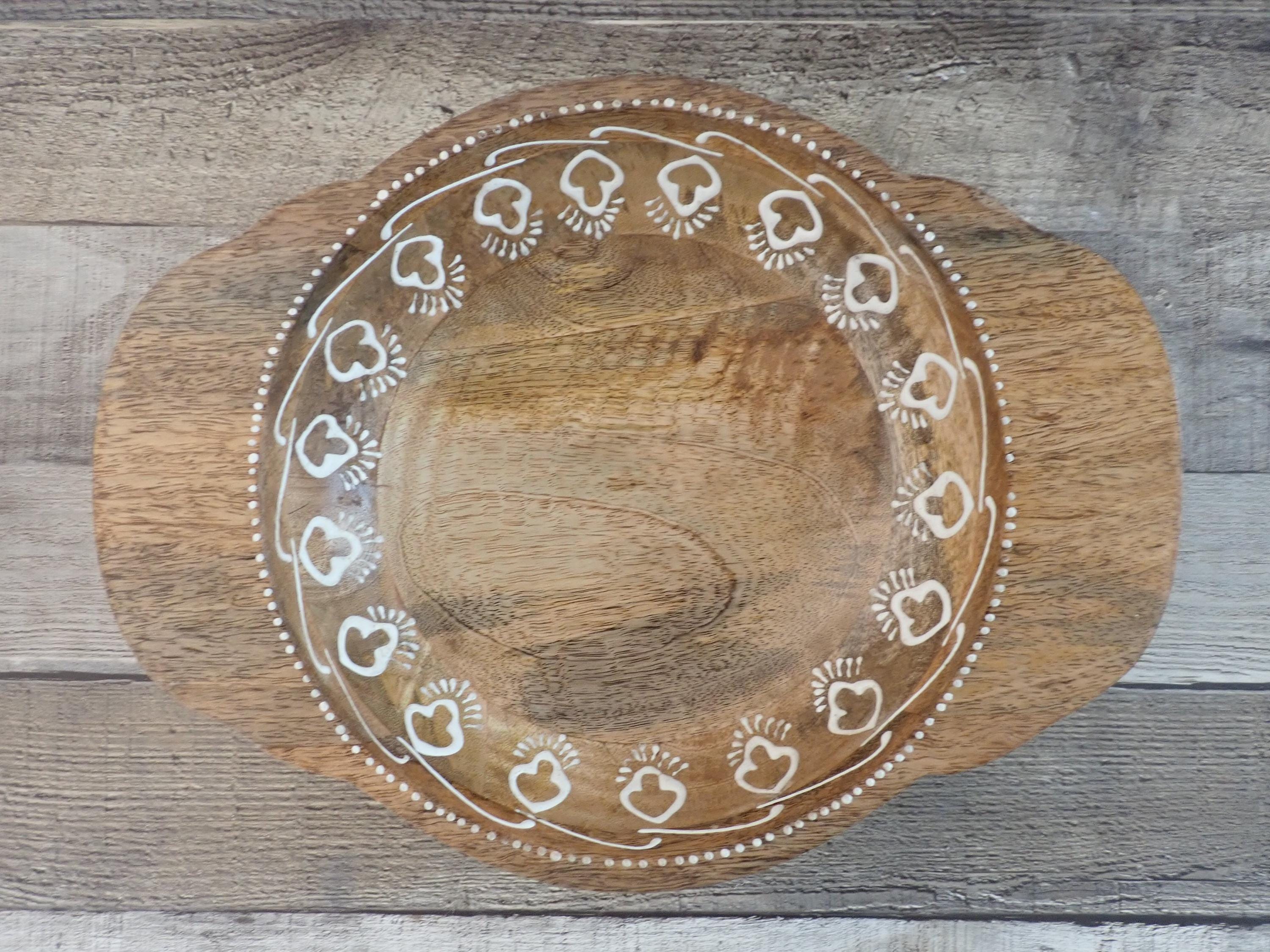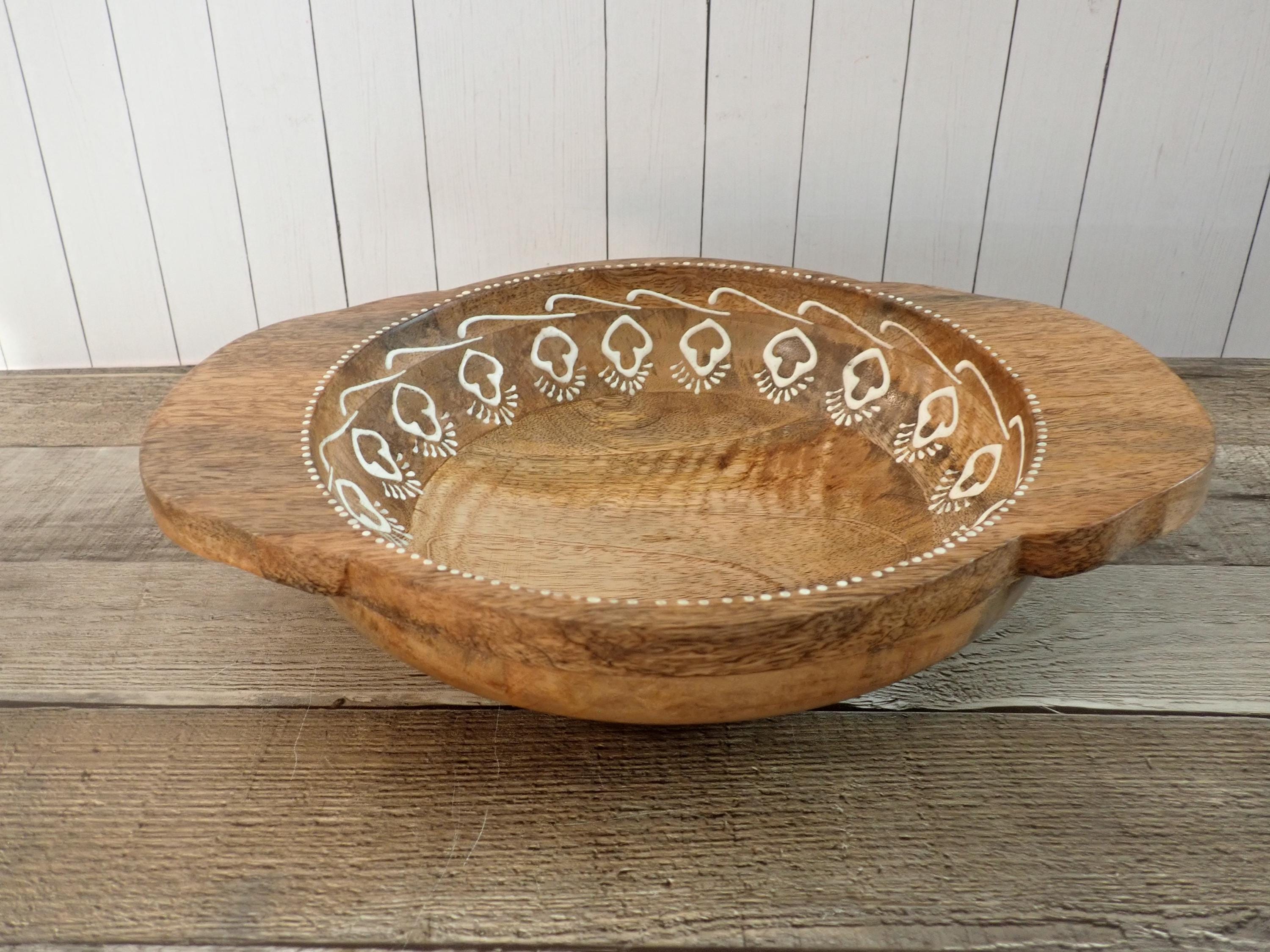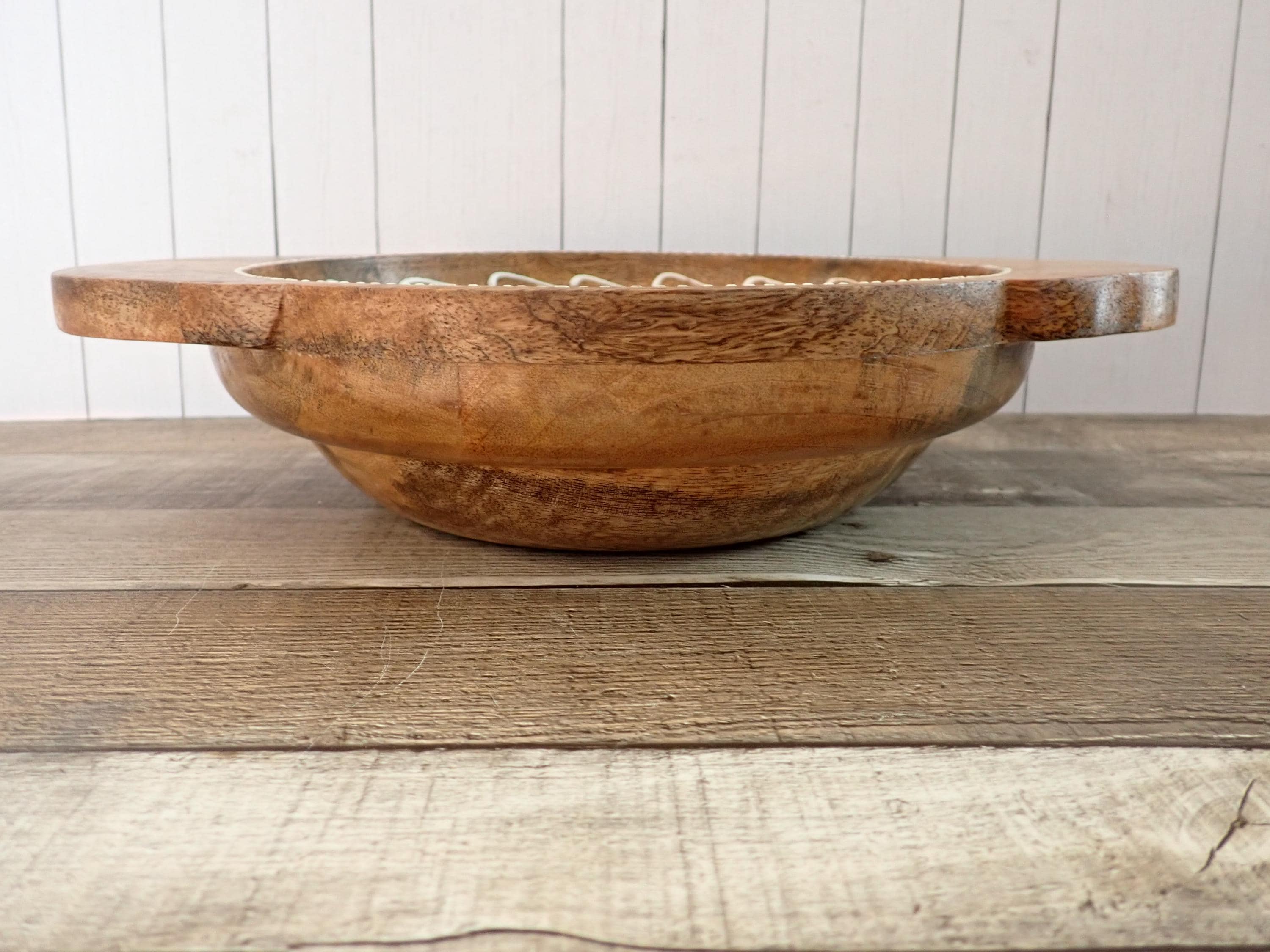 This lovely wood bowl is 3" tall and 9.5" in diameter and has a handle on each side. The bowl is 13" wide from handle to handle. If is a medium toned brown bowl and is decorated with an applied white paint in a geometric design around the rim of the bowl. The bowl does have original labels on the bottom. The bowl is in very nice condition with no chips or nicks in the wood - there are a couple of areas where the white decorative paint is worn - this is shown in detail in the last 2 photo. There are some scratches here and there.