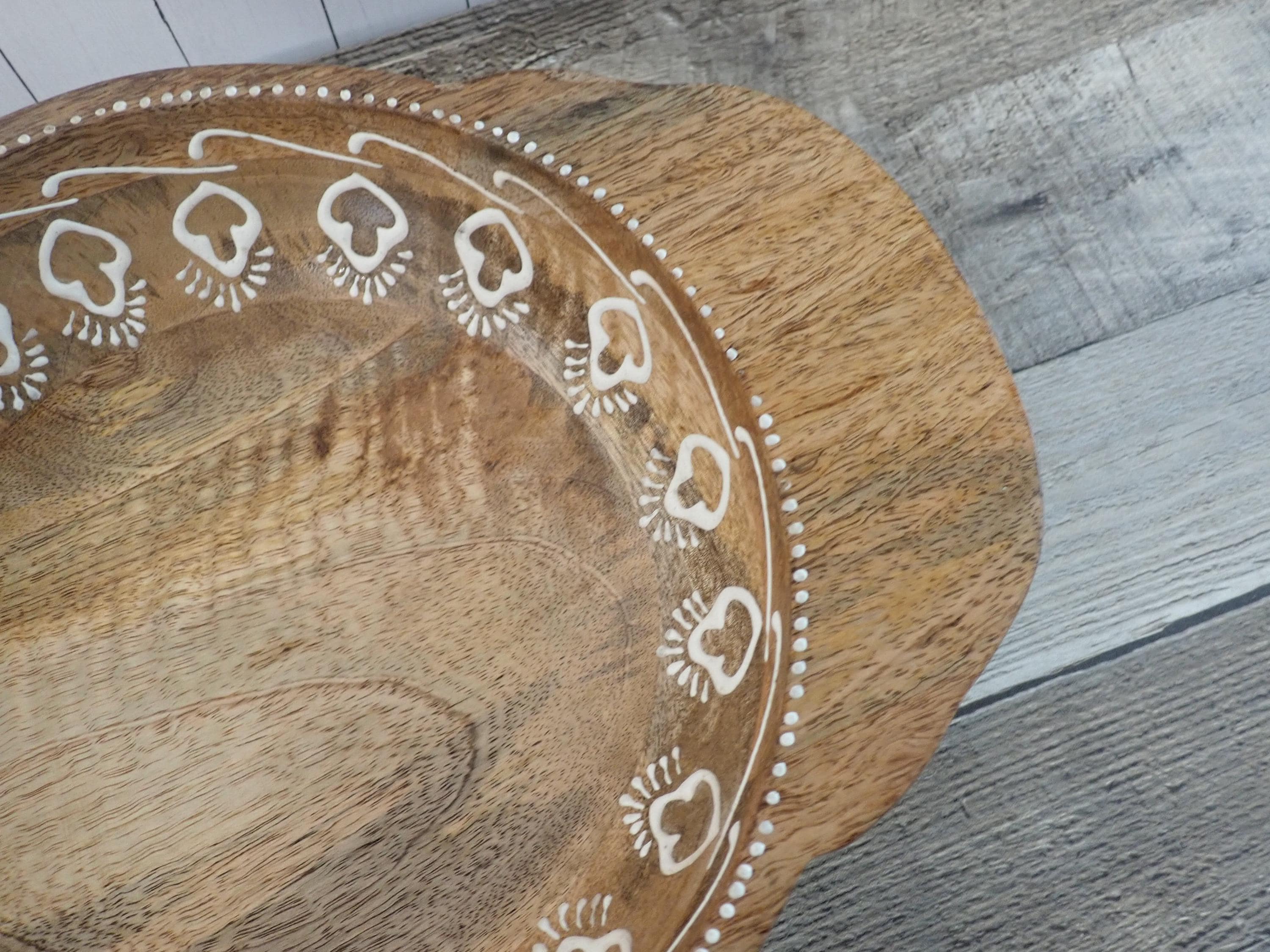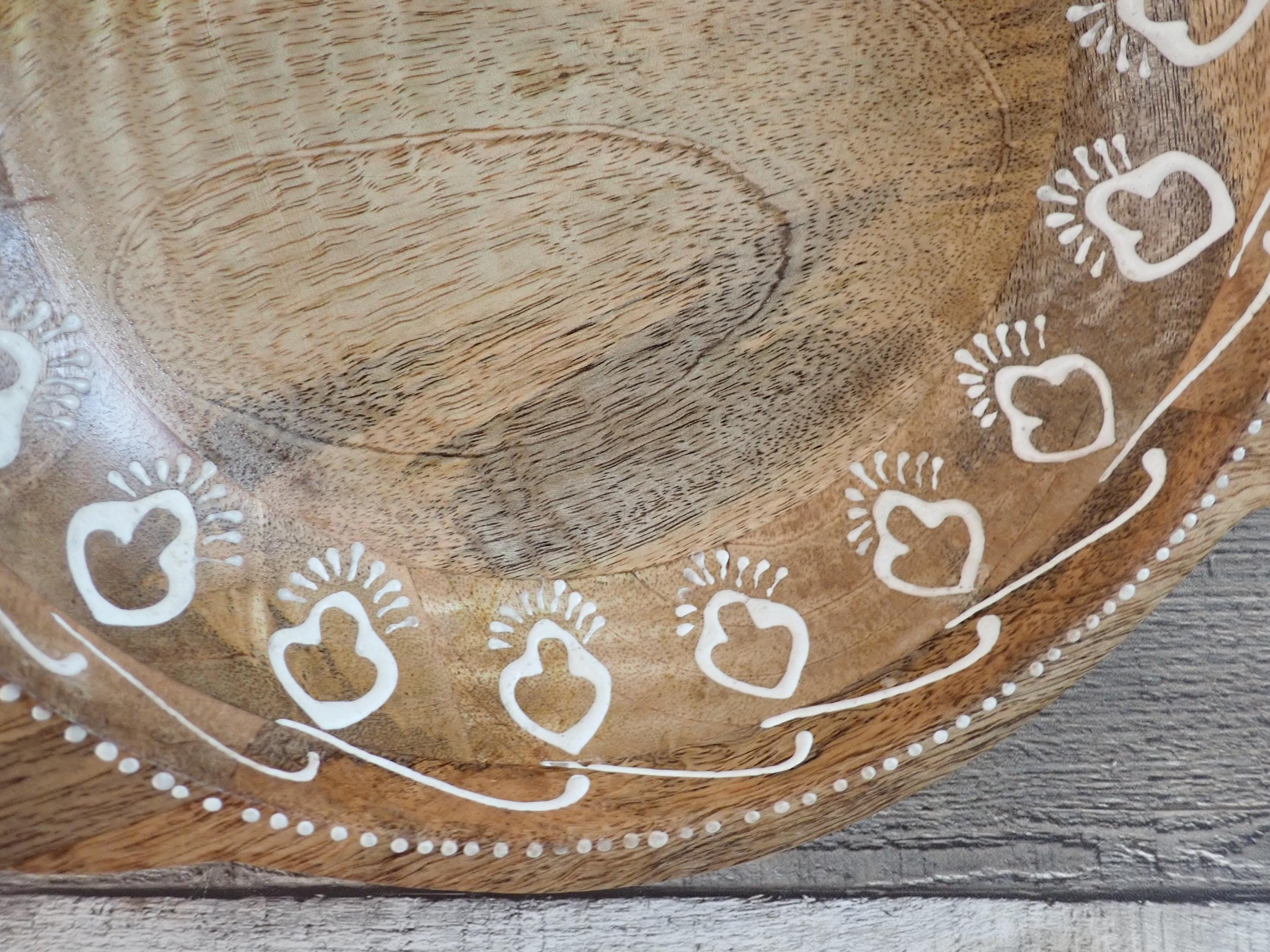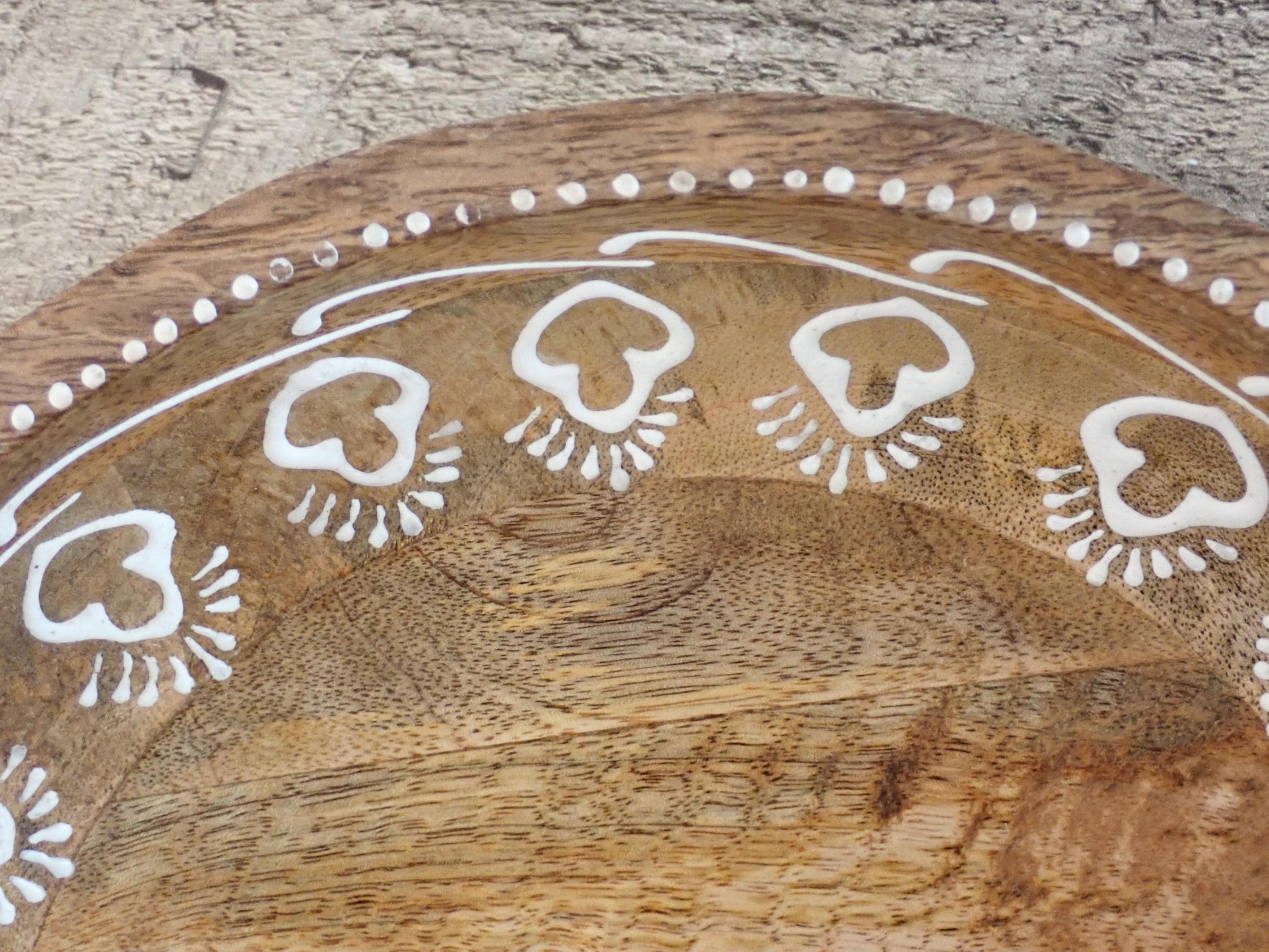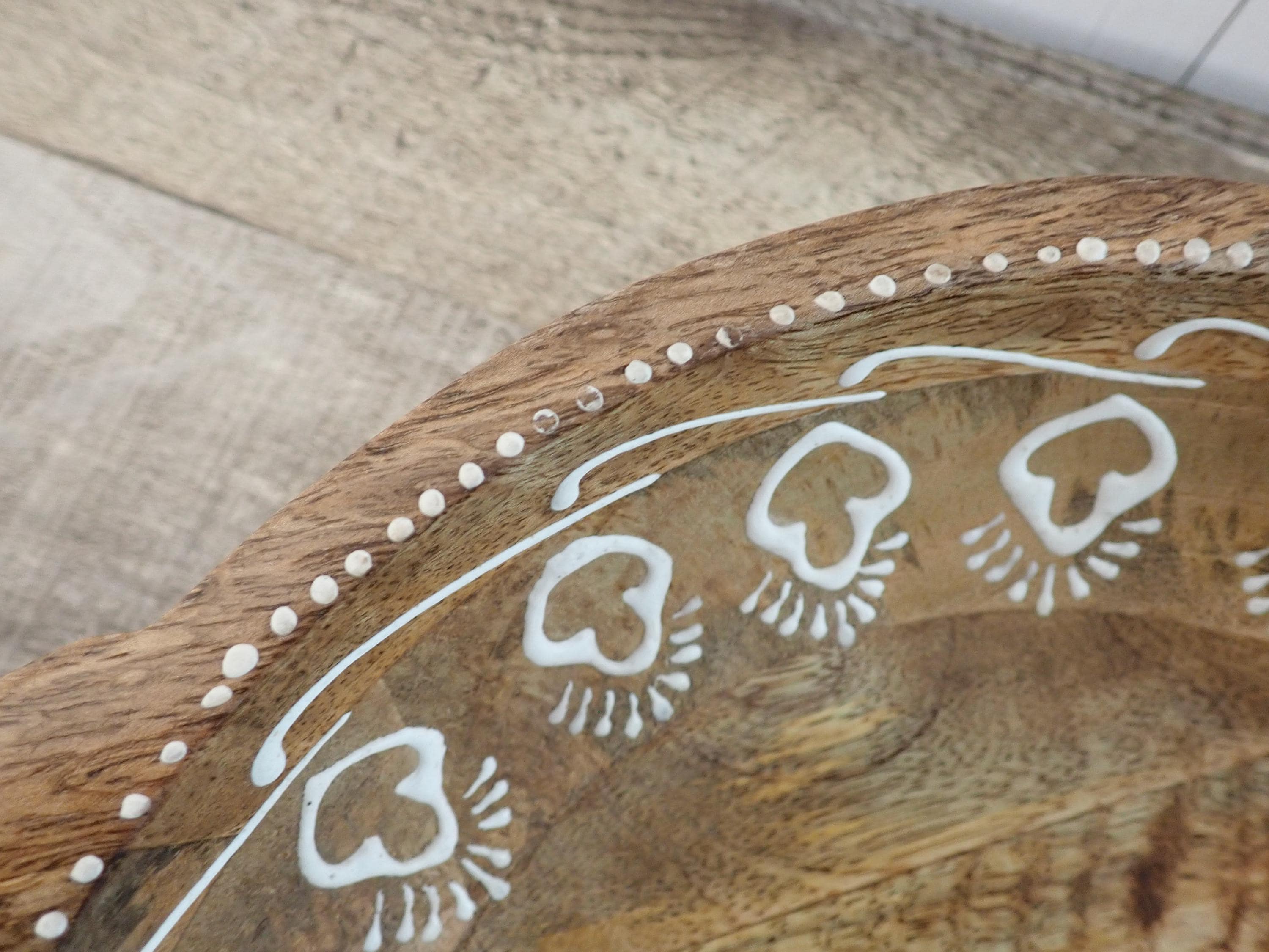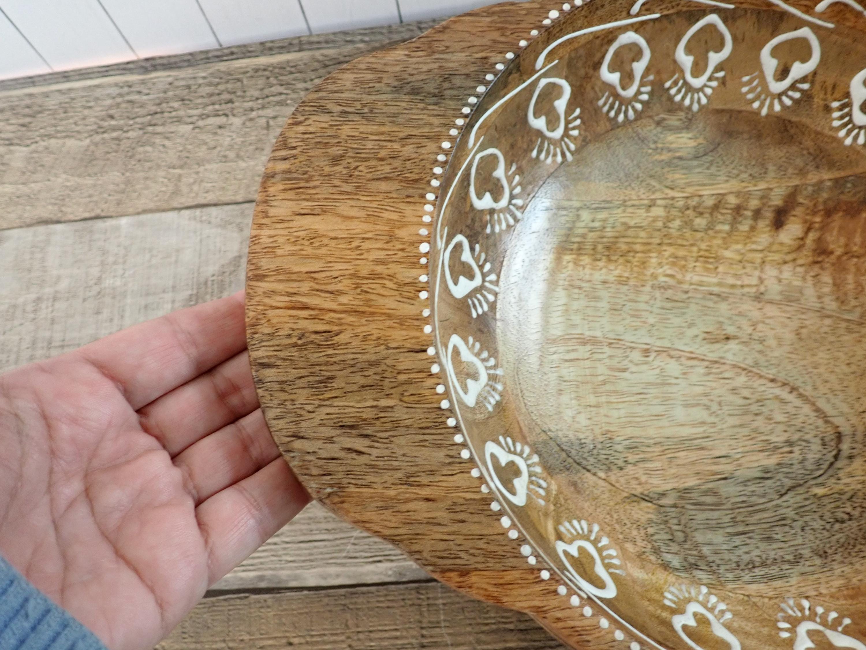 This lovely wood bowl is 3" tall and 9.5" in diameter and has a handle on each side. The bowl is 13" wide from handle to handle. If is a medium toned brown bowl and is decorated with an applied white paint in a geometric design around the rim of the bowl. The bowl does have original labels on the bottom. The bowl is in very nice condition with no chips or nicks in the wood - there are a couple of areas where the white decorative paint is worn - this is shown in detail in the last 2 photo. There are some scratches here and there.