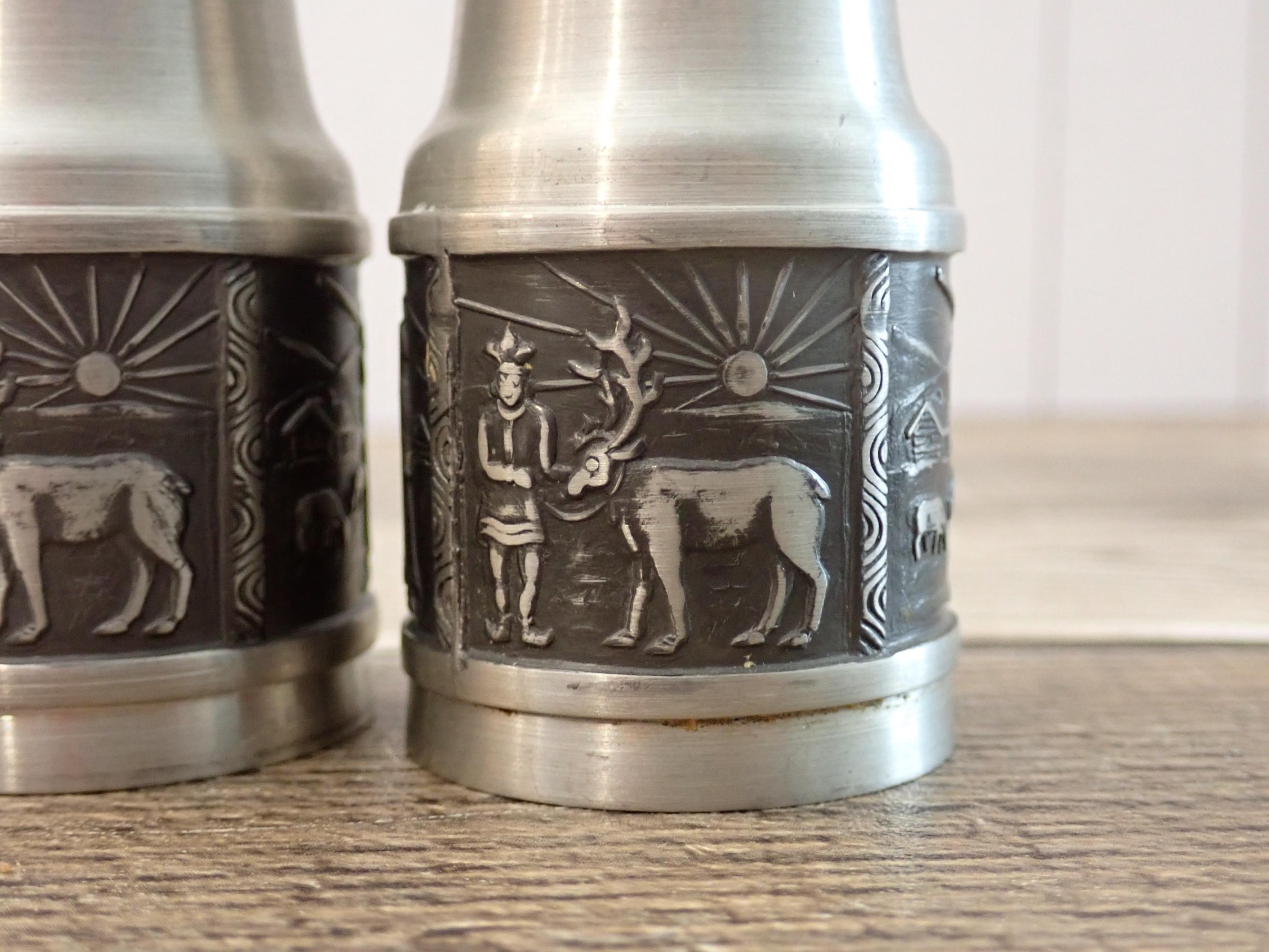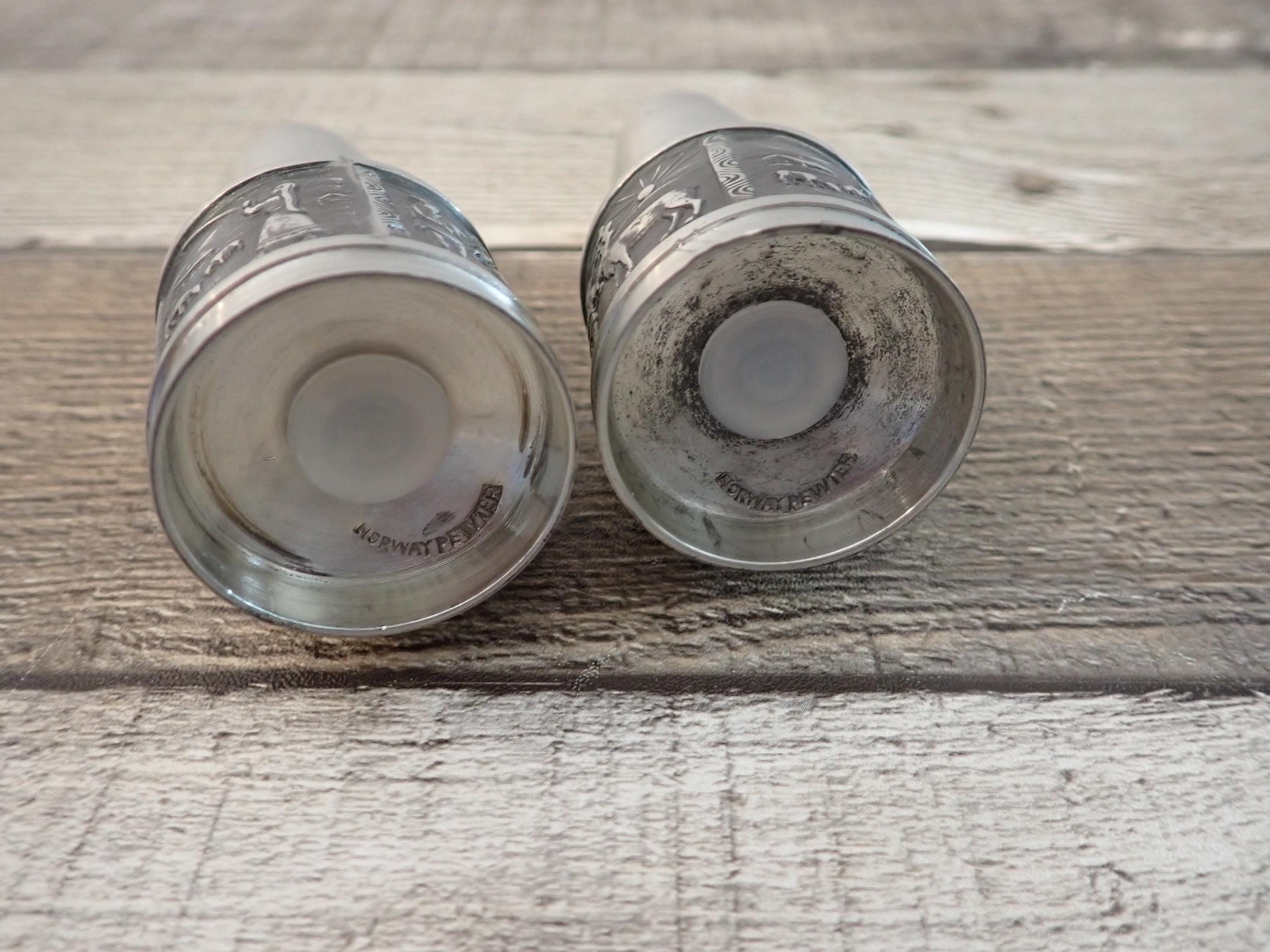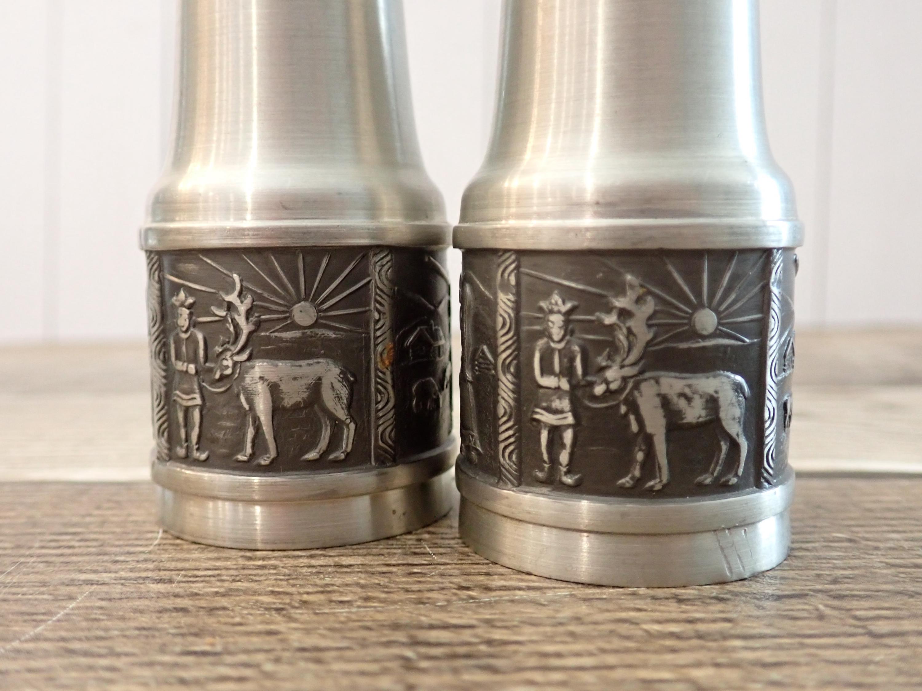 This pair of pewter shakers are 3.5" tall and 1.5" in diameter. They are a silver pewter and have a modern style with a design with a man and reindeer and woman with sheep around the base. They are marked NORWAY PEWTER on the bottoms and have original plastic stoppers. Both shakes are in very nice condition, there are some light scratches here and there.