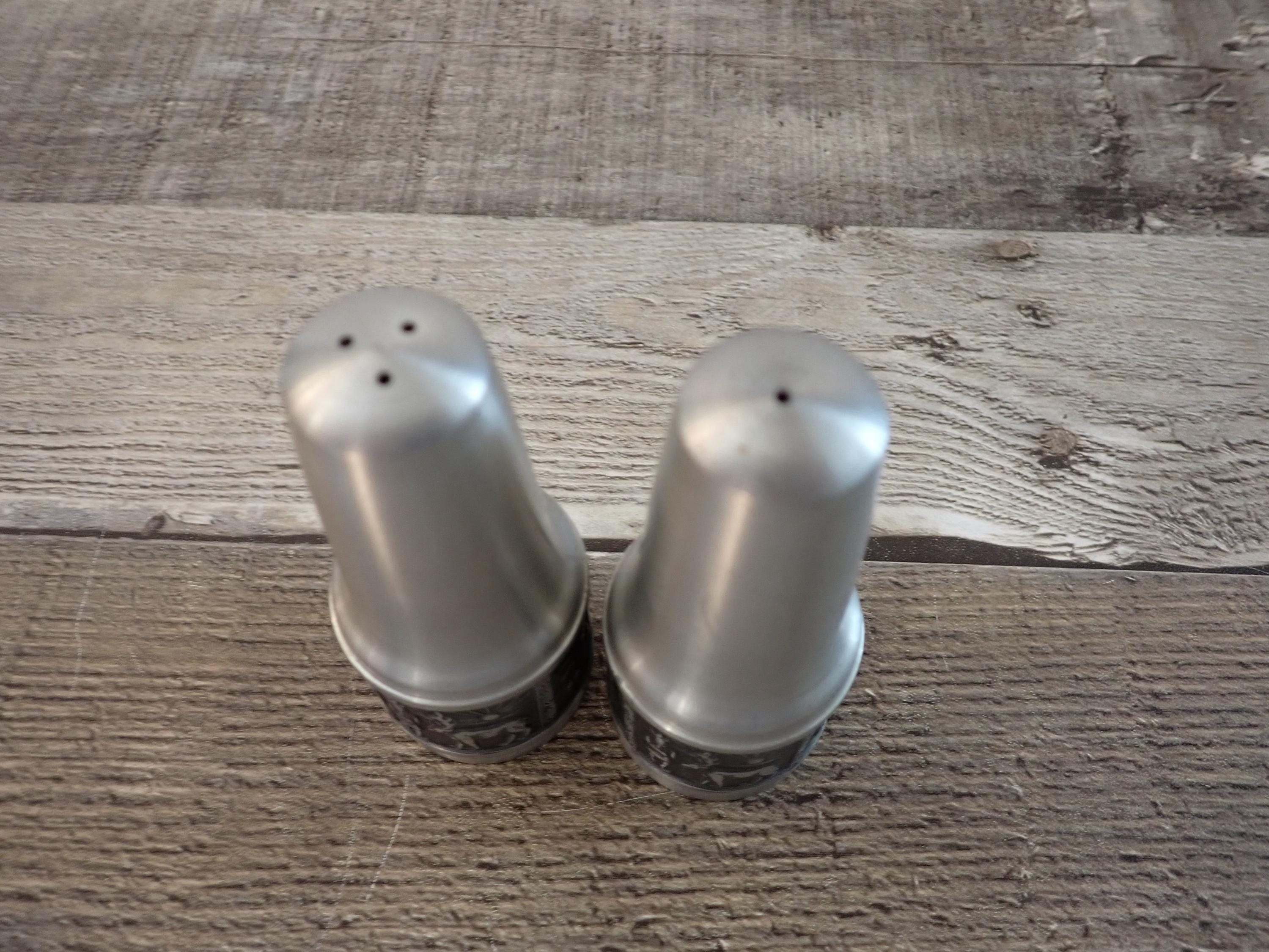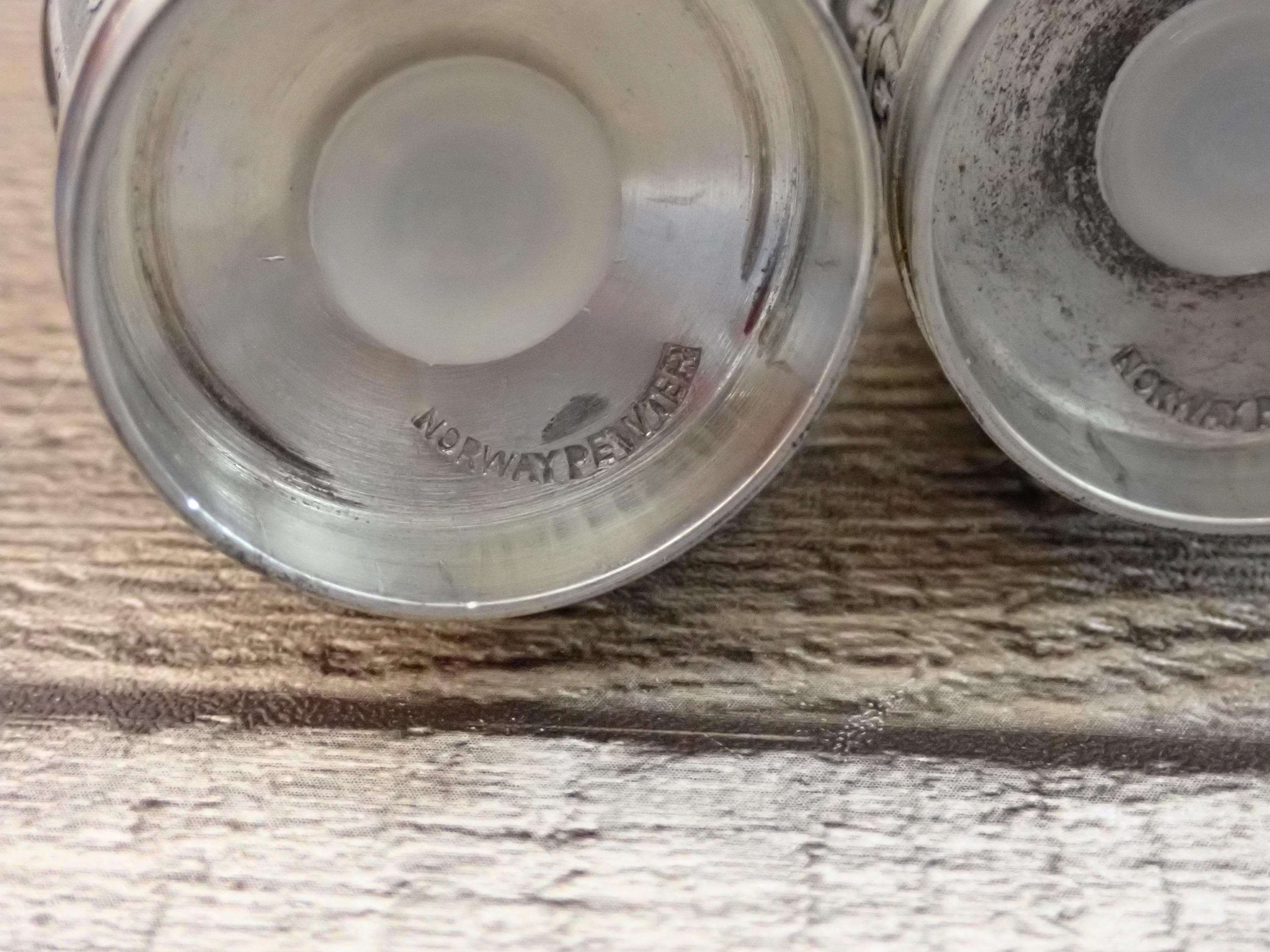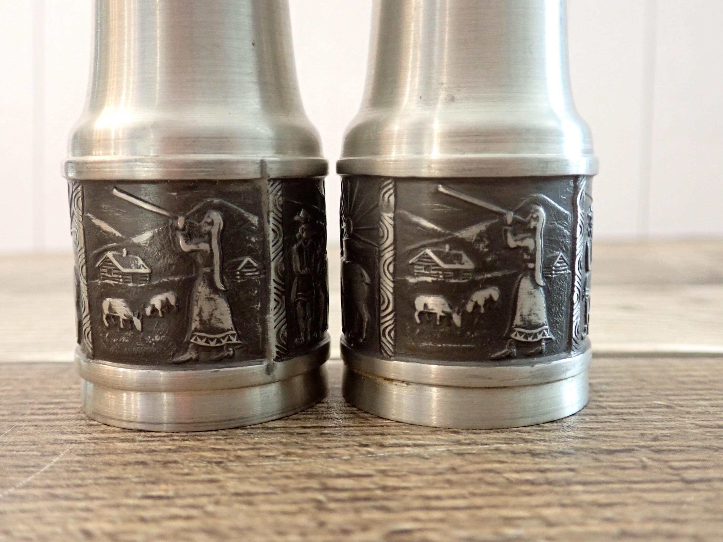 This pair of pewter shakers are 3.5" tall and 1.5" in diameter. They are a silver pewter and have a modern style with a design with a man and reindeer and woman with sheep around the base. They are marked NORWAY PEWTER on the bottoms and have original plastic stoppers. Both shakes are in very nice condition, there are some light scratches here and there.