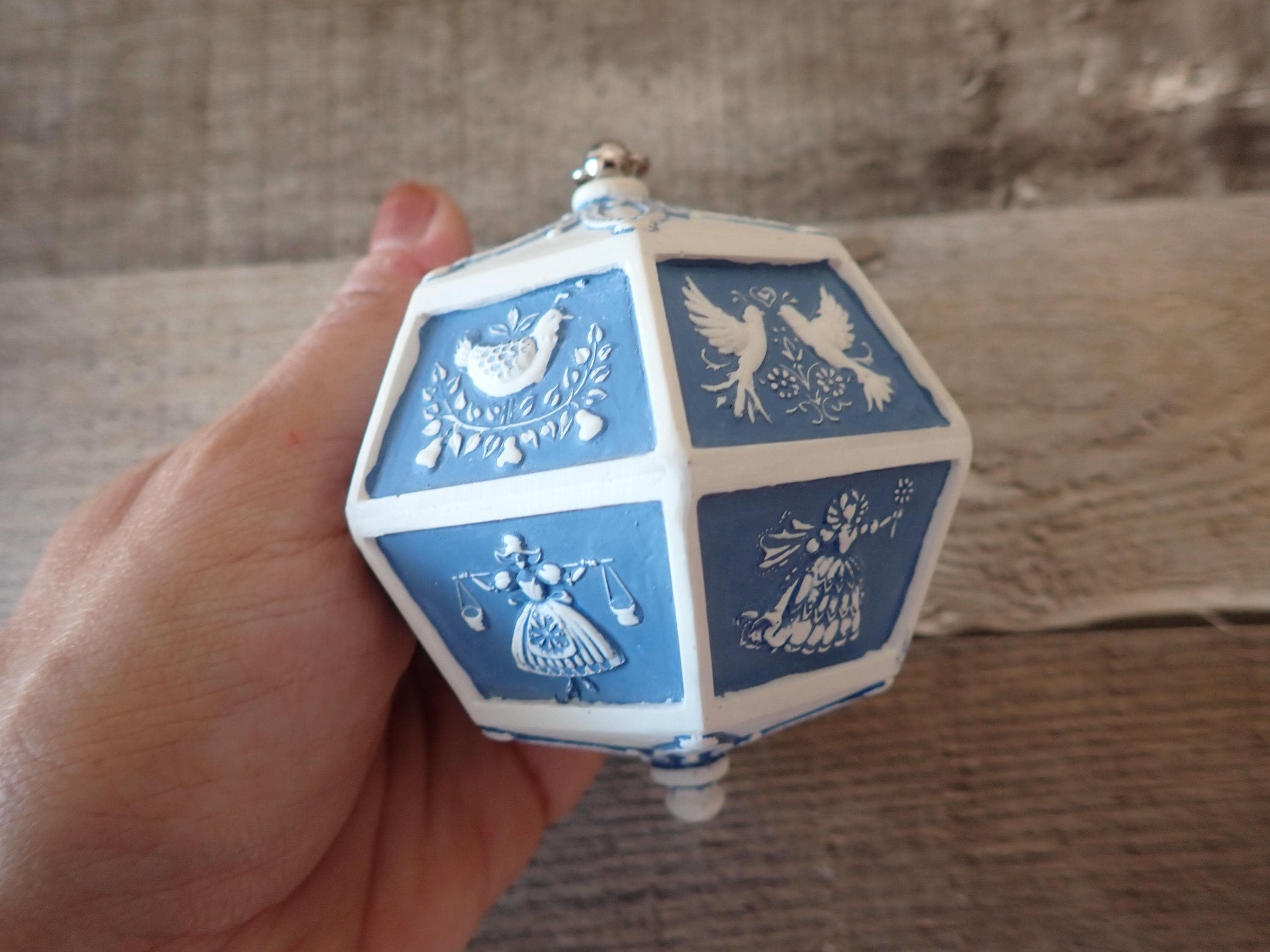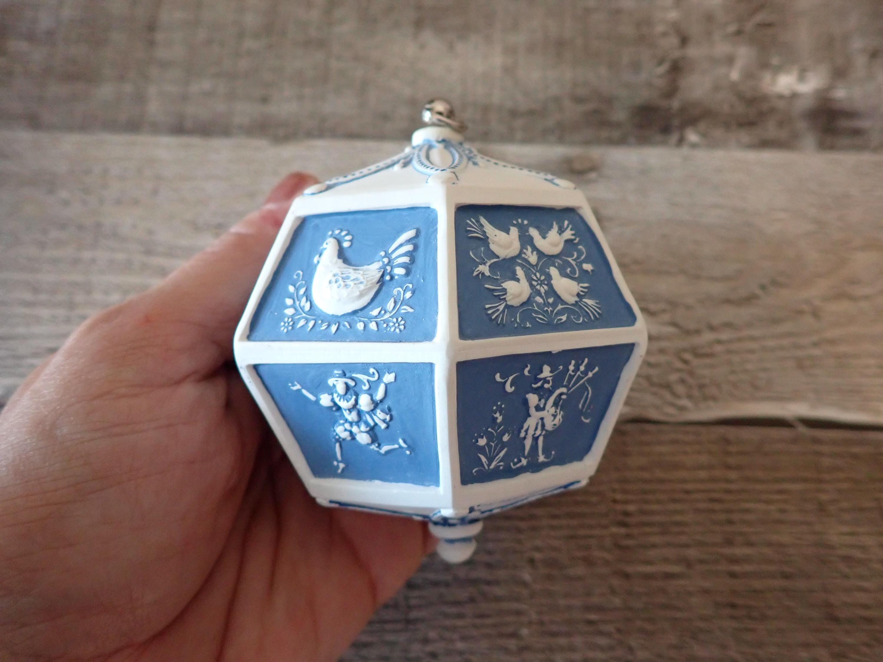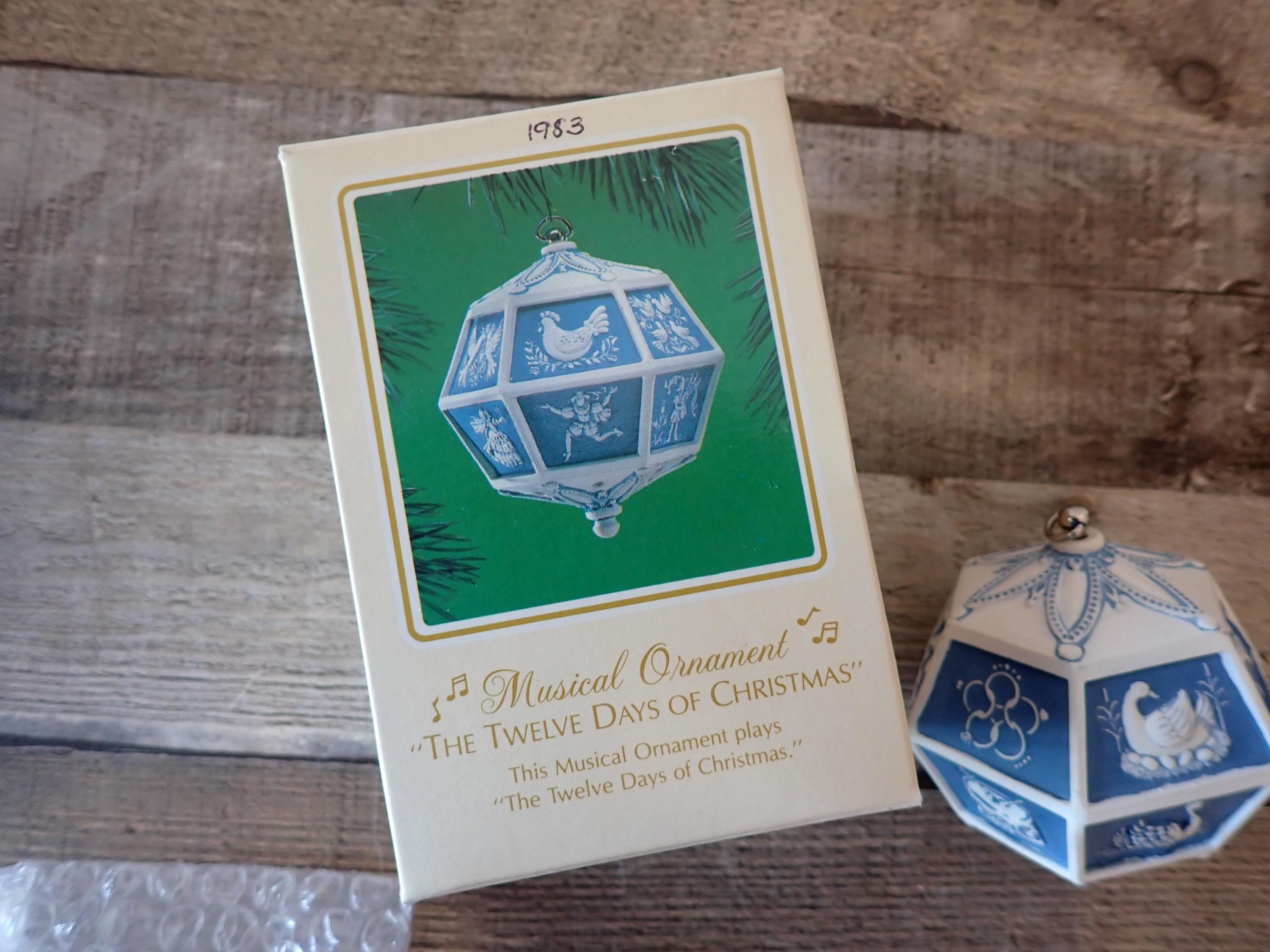This vintage Hallmark ornament from 1983 is the 12 Days of Christmas Musical ornament. The ornament is a blue and white piece with 12 flat panels each depicting a scene from the 12 days of Christmas. The ornament is musical and plays the 12 days of Christmas then the metal hanger at the top is wound up. The ornament is in very good condition with no damage. The box is also in very nice condition but does have some writing on the front of the box.