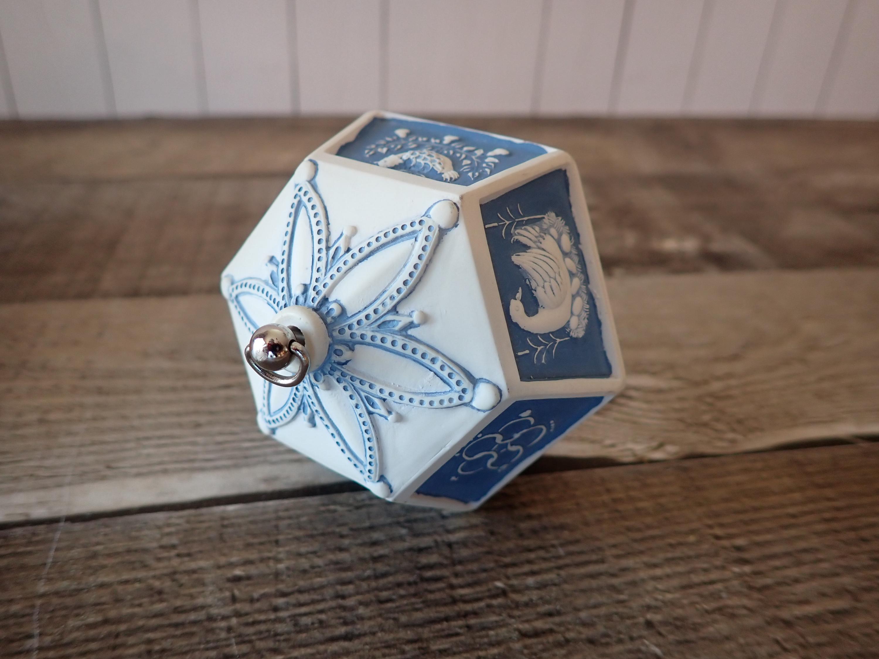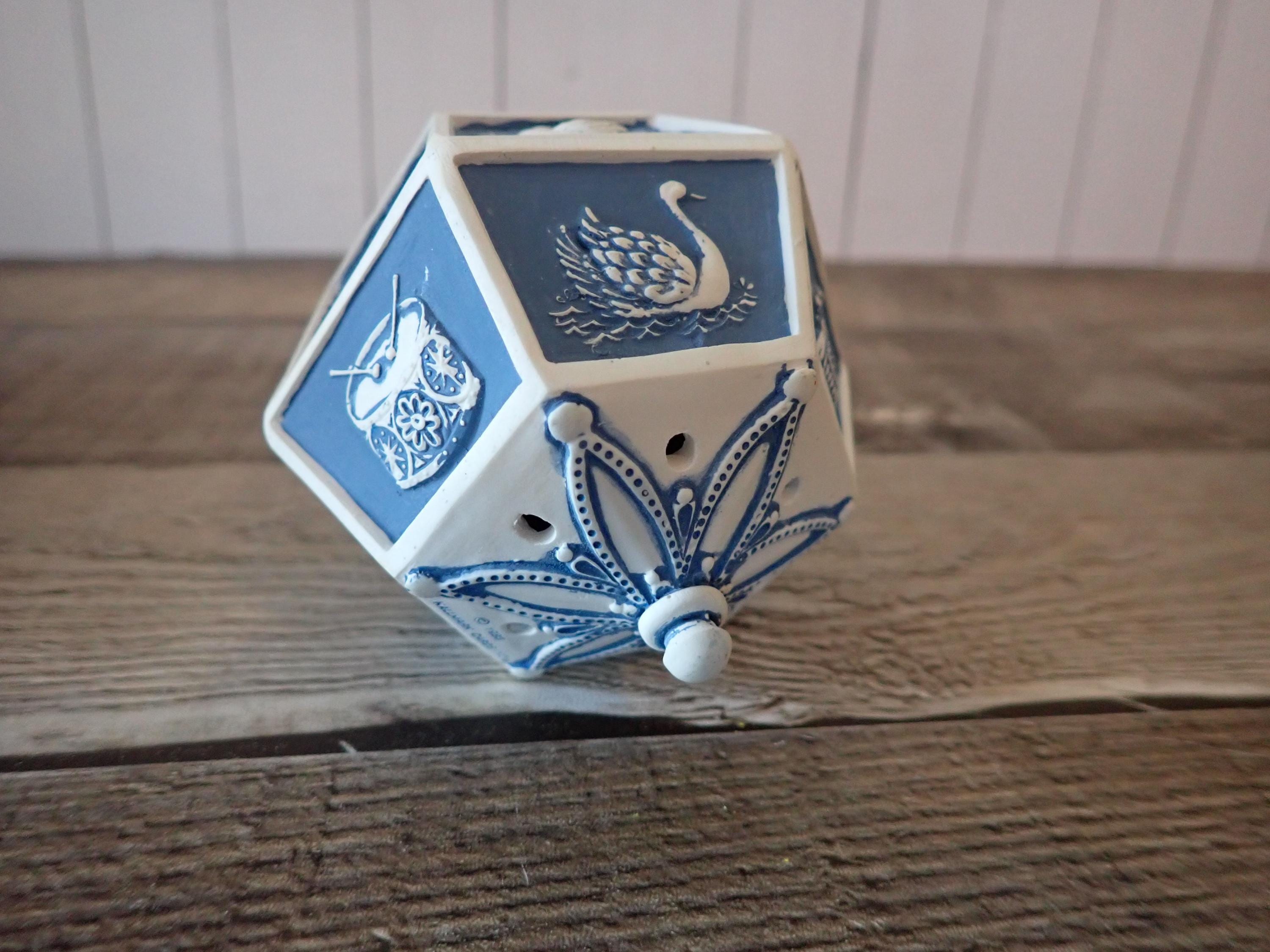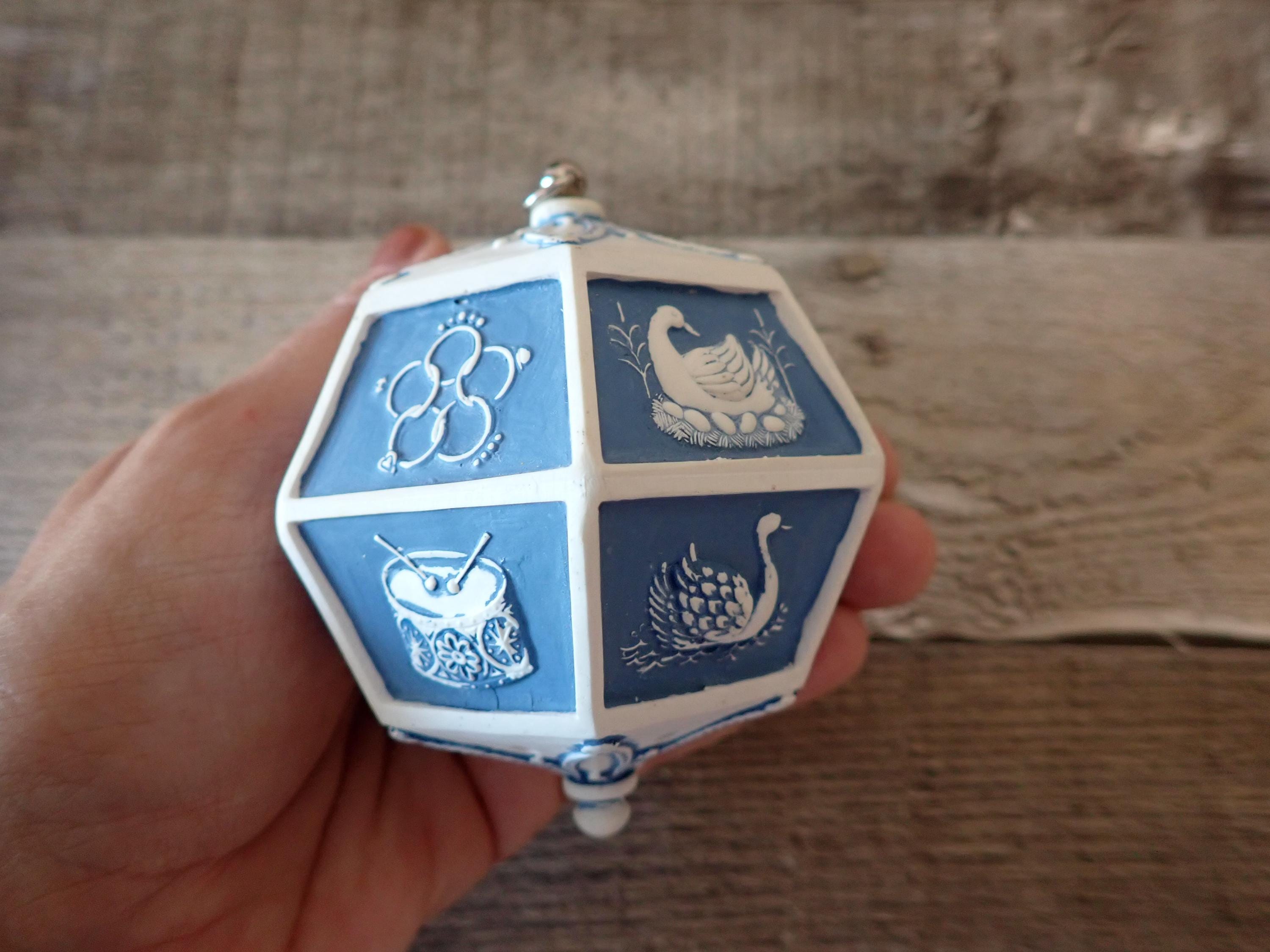 This vintage Hallmark ornament from 1983 is the 12 Days of Christmas Musical ornament. The ornament is a blue and white piece with 12 flat panels each depicting a scene from the 12 days of Christmas. The ornament is musical and plays the 12 days of Christmas then the metal hanger at the top is wound up. The ornament is in very good condition with no damage. The box is also in very nice condition but does have some writing on the front of the box.