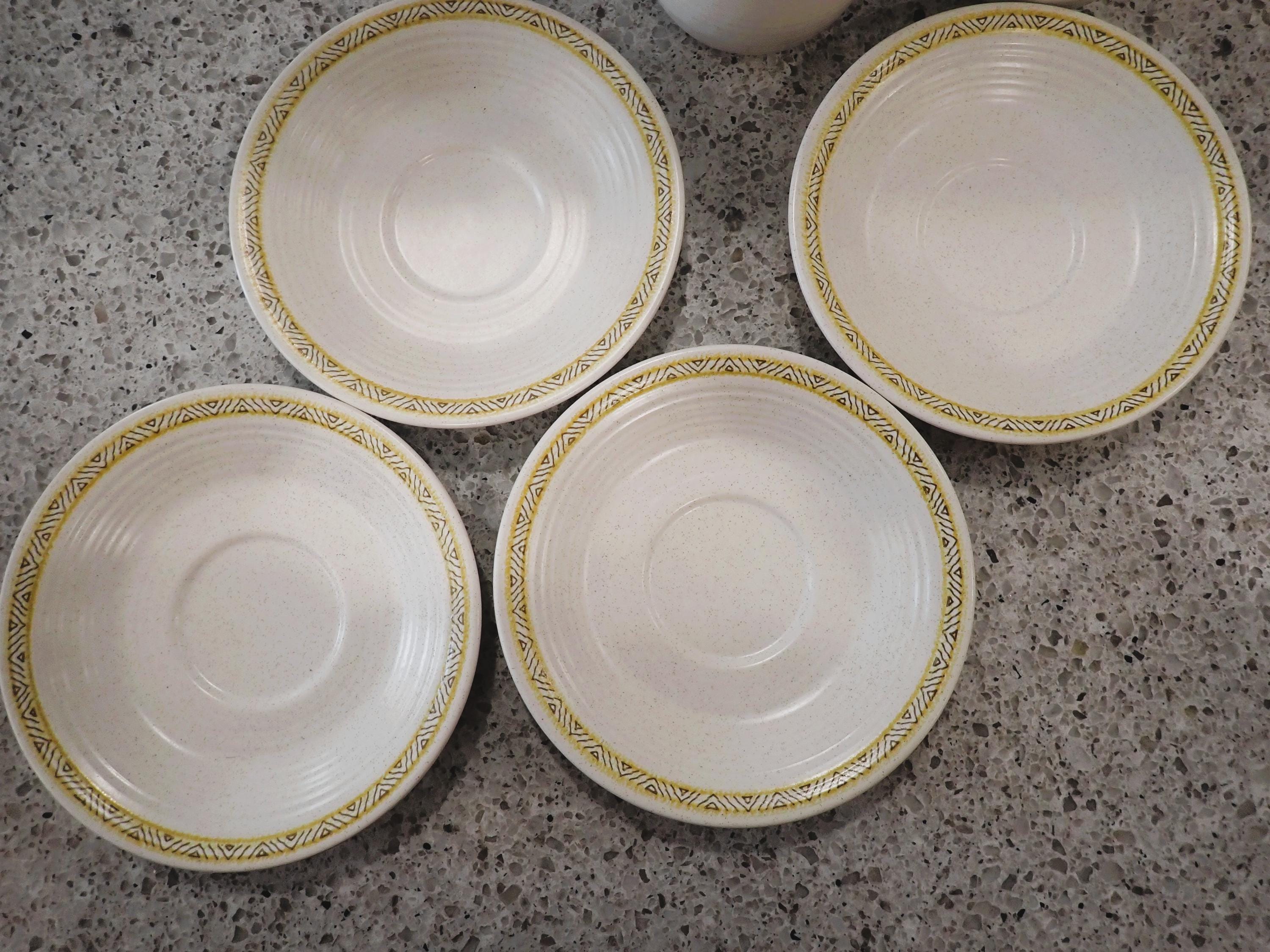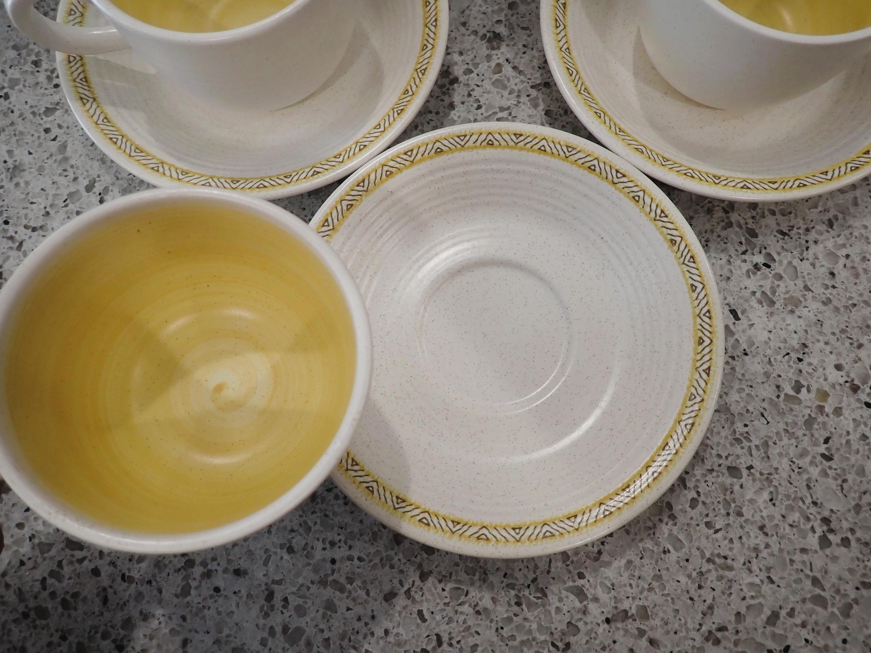 This set of cups and saucers by Franciscan are in the Hacienda Gold pattern. They are a white ceramic with light brown flecking, and are accented with a yellow on the inside of the cup. The cups are 3.75" in diameter, and 3.5" tall and can hold 8 oz filled to the rim. All 4 cups and saucers are in very good condition with no chips or cracks. There are 2 sets of 4 cups/saucers available if you are looking for a larger set.