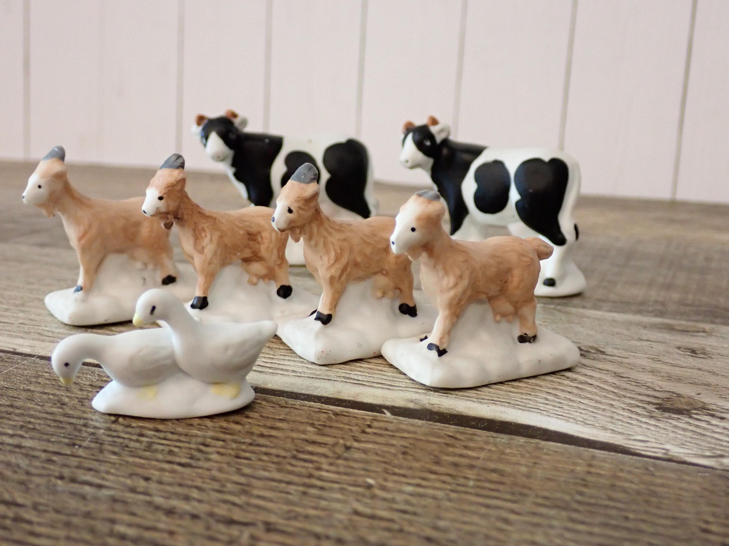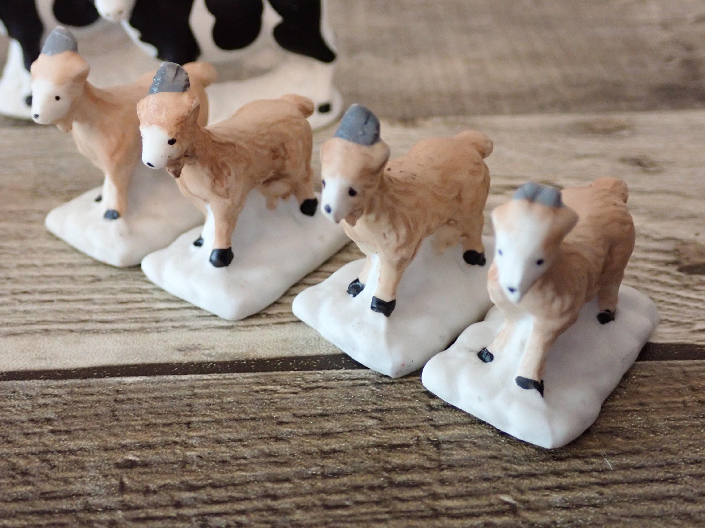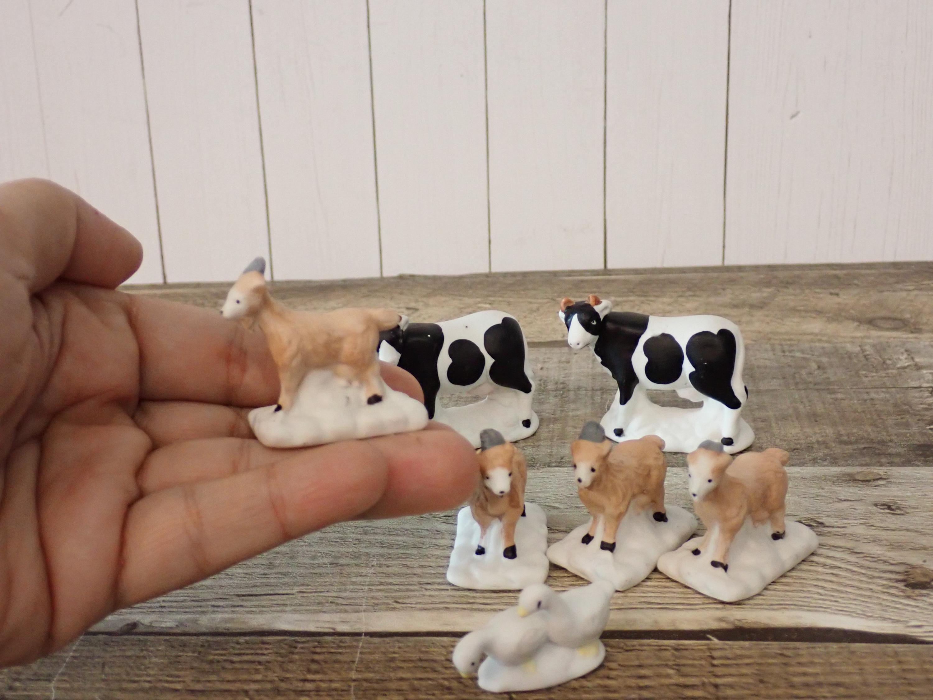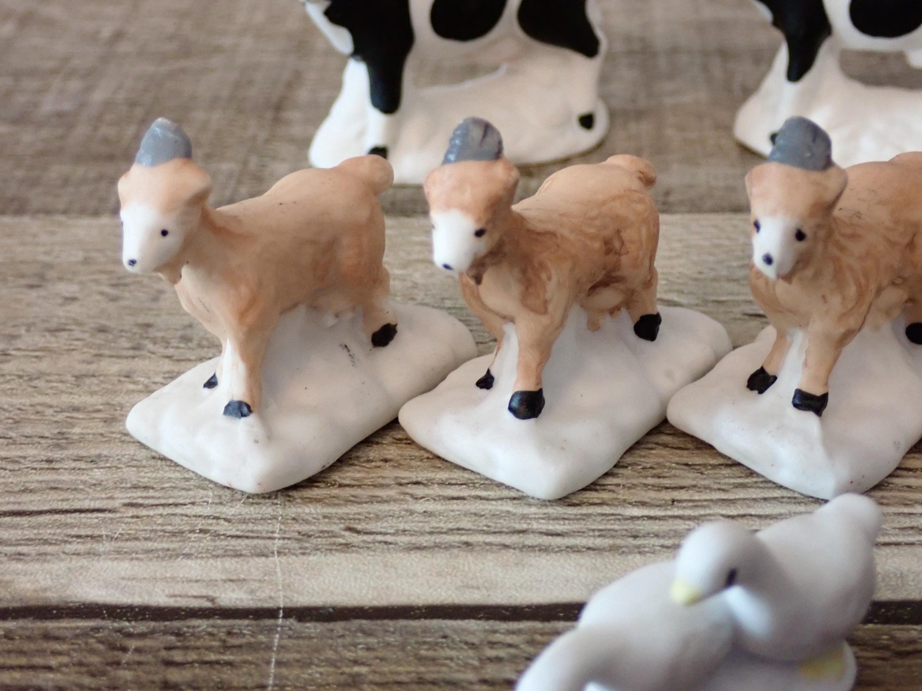 This set of ceramic village figurines includes 7 animal pieces - 2 cows, 4 goats, and one pair of swans. They are all ceramic pieces. The cows are the largest and measure 2" long and 1.5" high. The goats are smaller at 1.5" long and 1.5" high, and the pair of swans is 1.25" long and 1" high. There are no makers marks on the pieces. They are in very nice condition, however one of the goats does appear to have been repaired - this is shown in detail in the last photo.