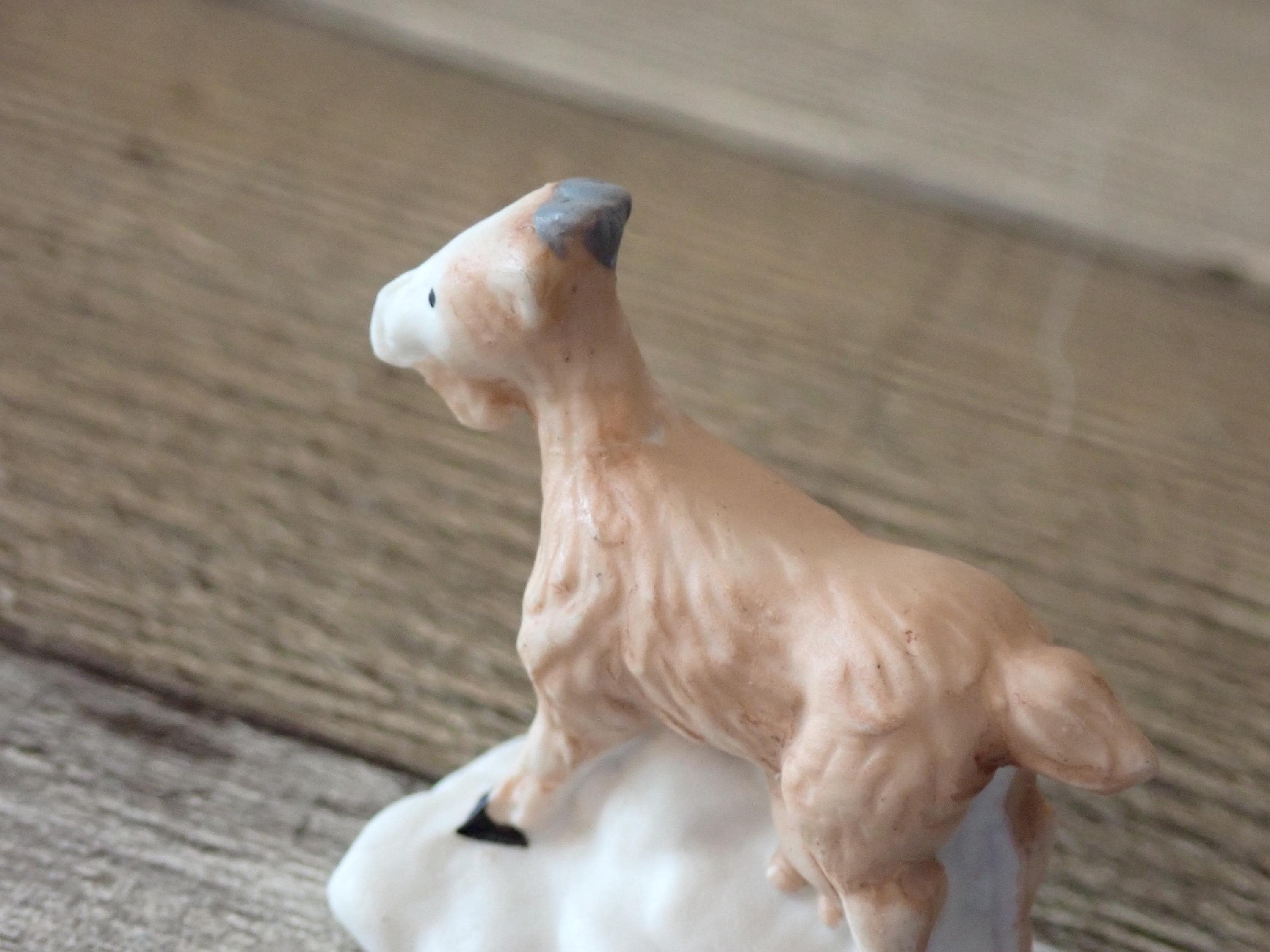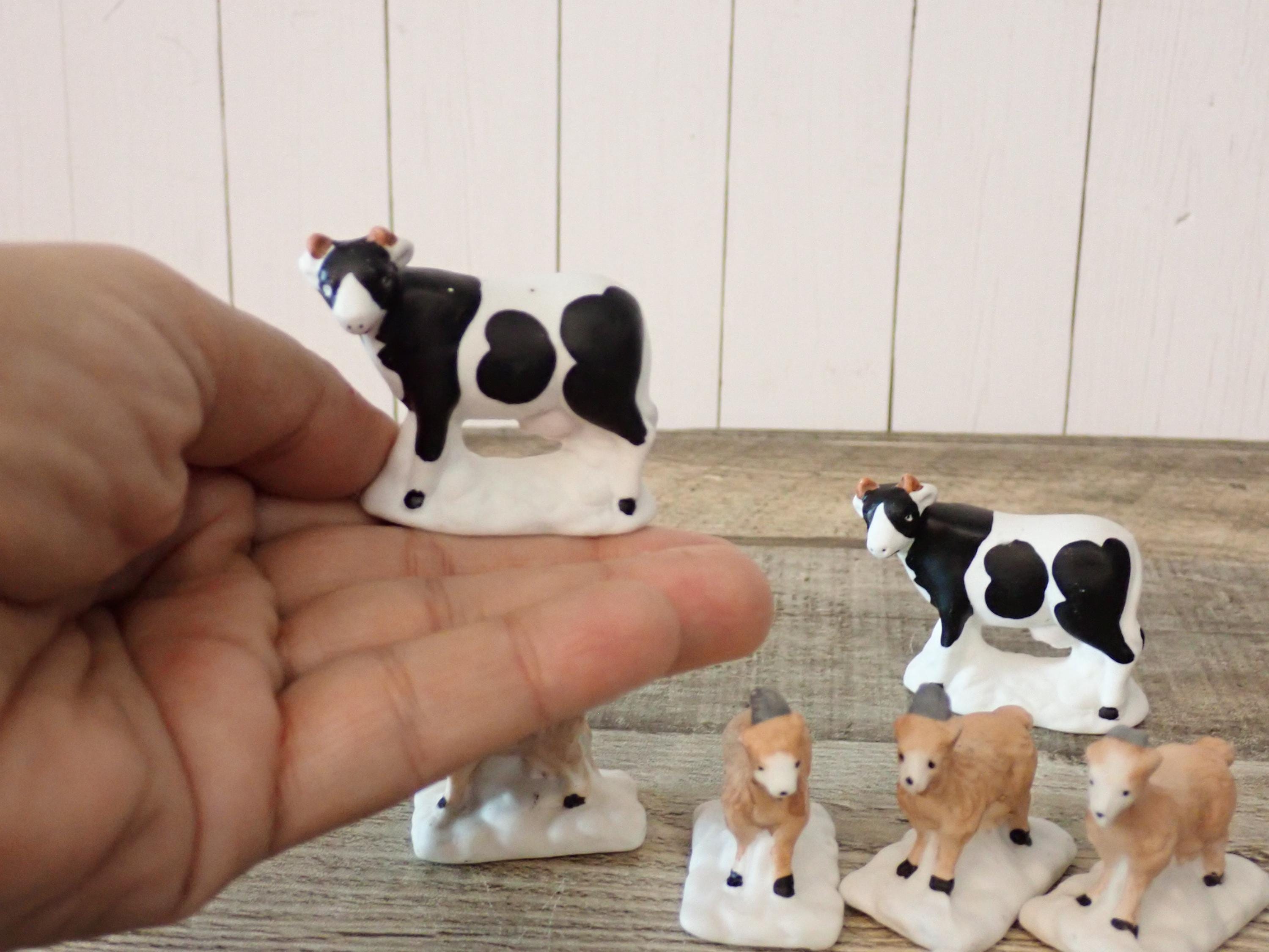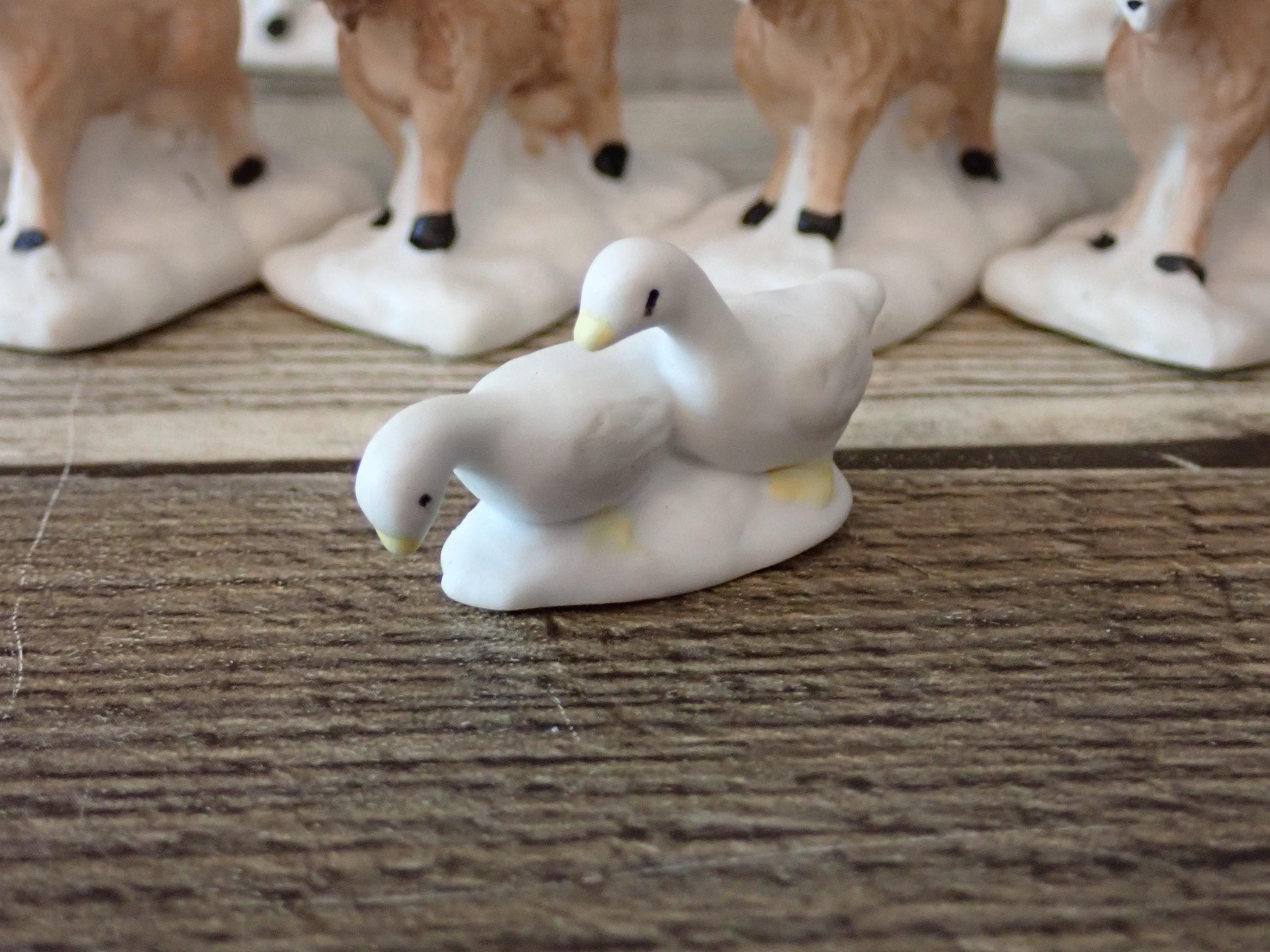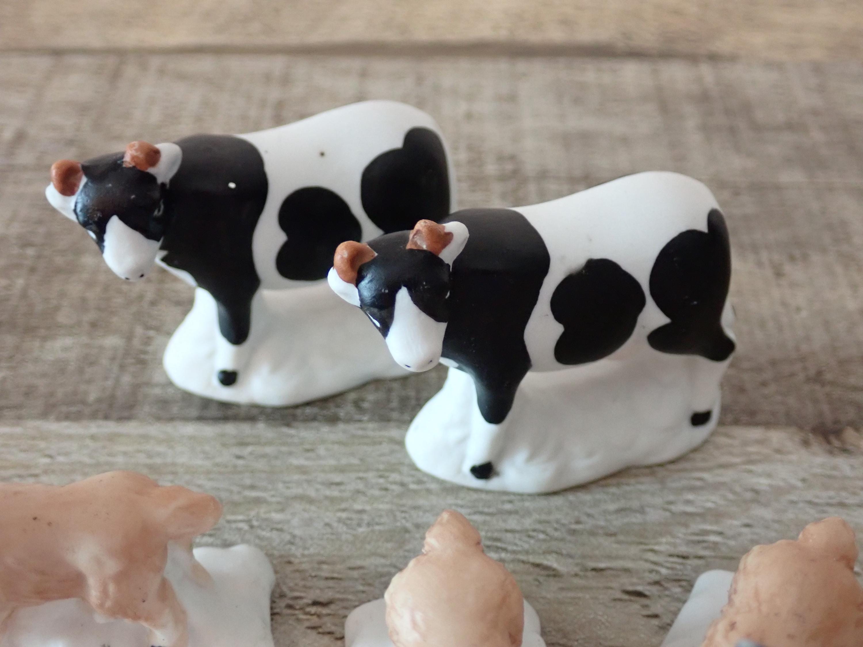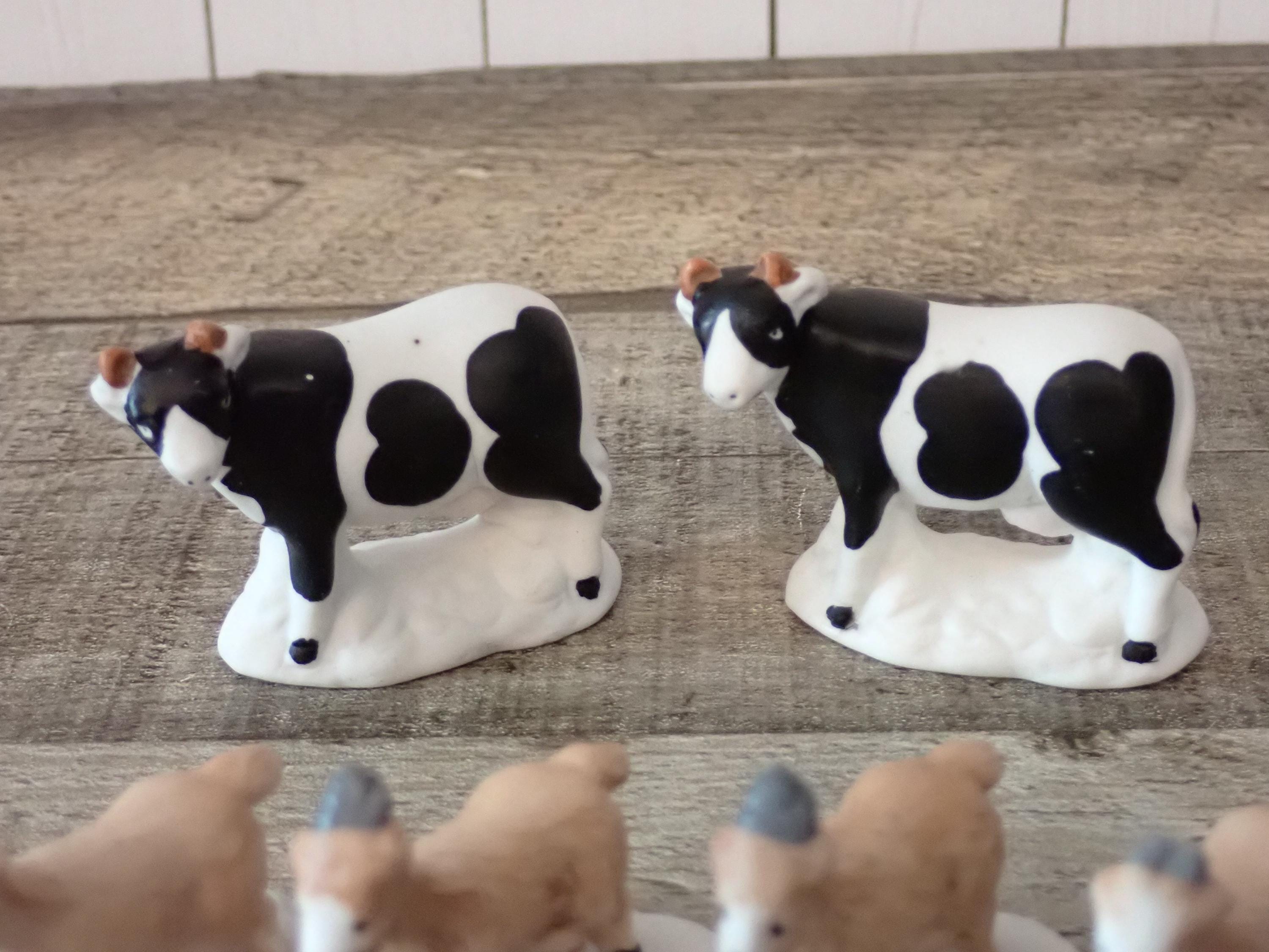 This set of ceramic village figurines includes 7 animal pieces - 2 cows, 4 goats, and one pair of swans. They are all ceramic pieces. The cows are the largest and measure 2" long and 1.5" high. The goats are smaller at 1.5" long and 1.5" high, and the pair of swans is 1.25" long and 1" high. There are no makers marks on the pieces. They are in very nice condition, however one of the goats does appear to have been repaired - this is shown in detail in the last photo.