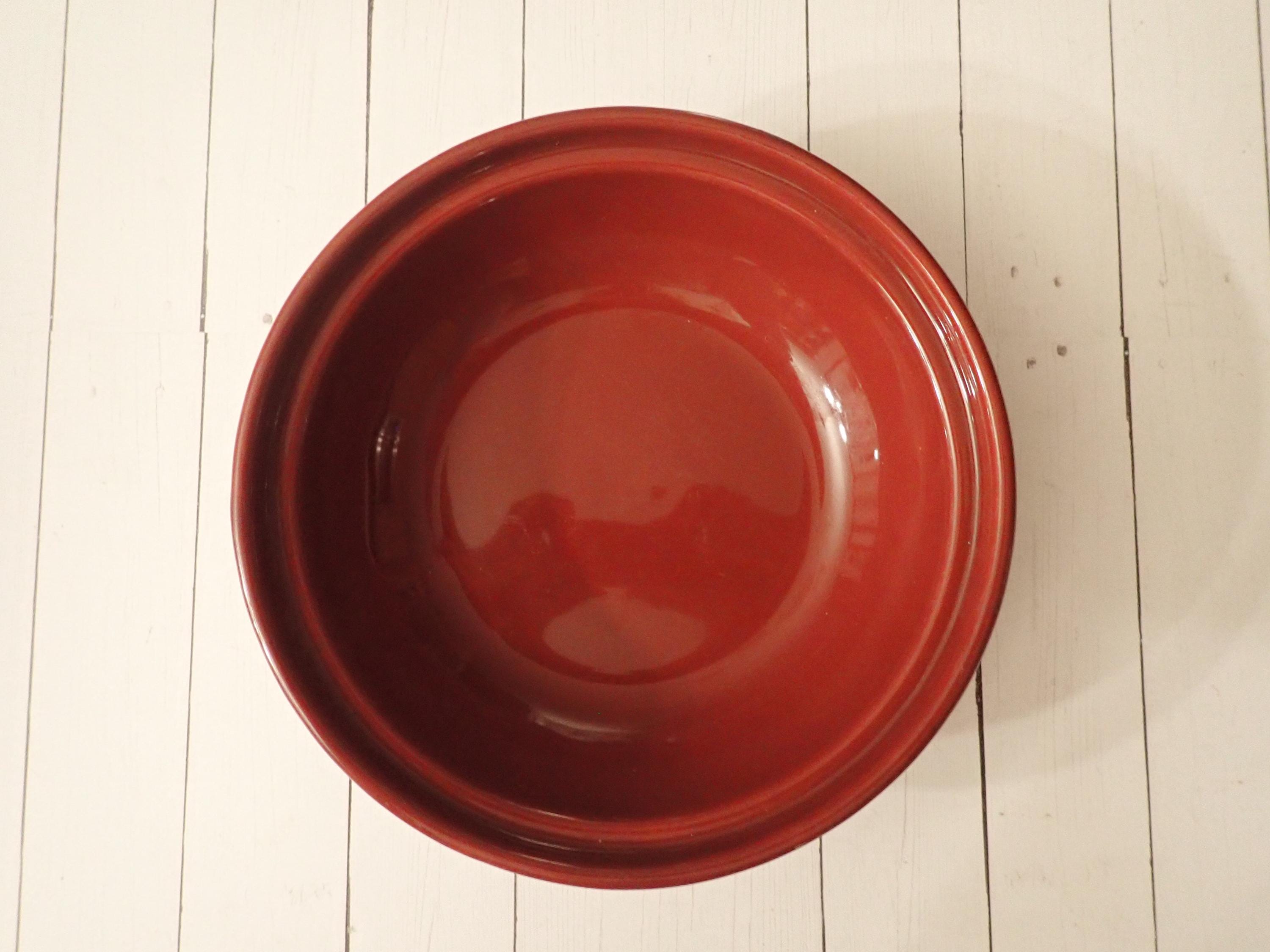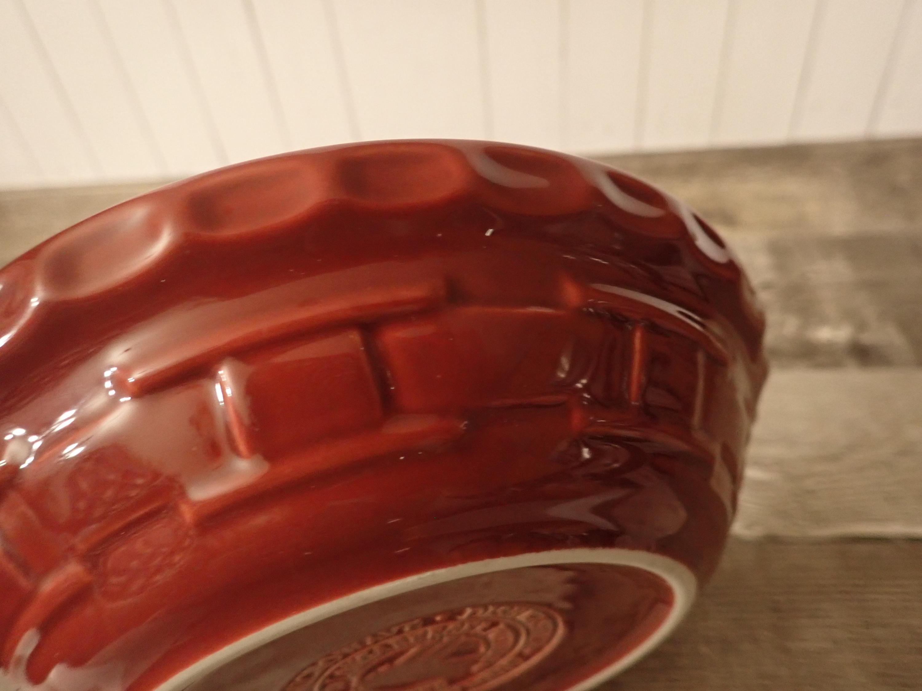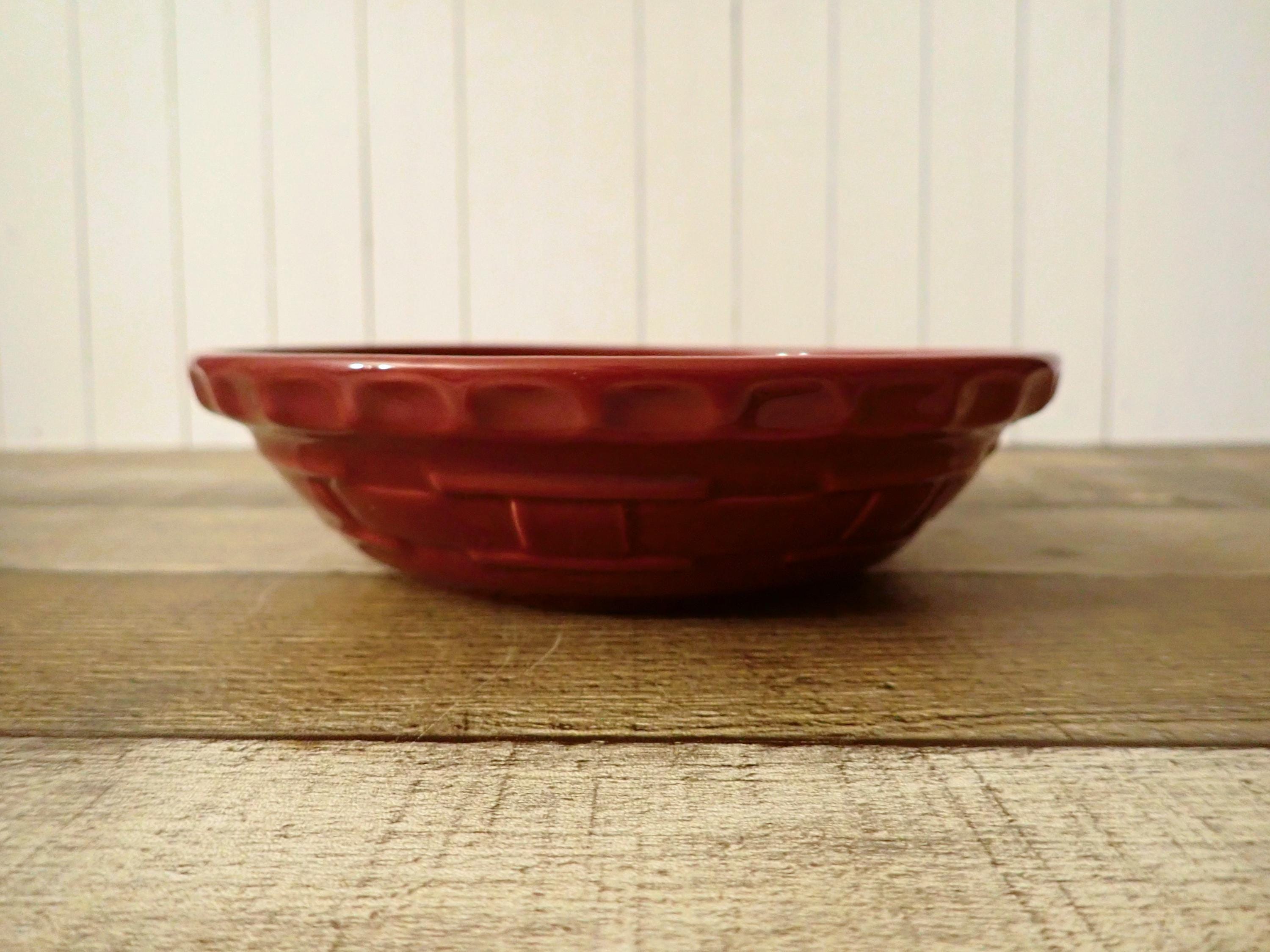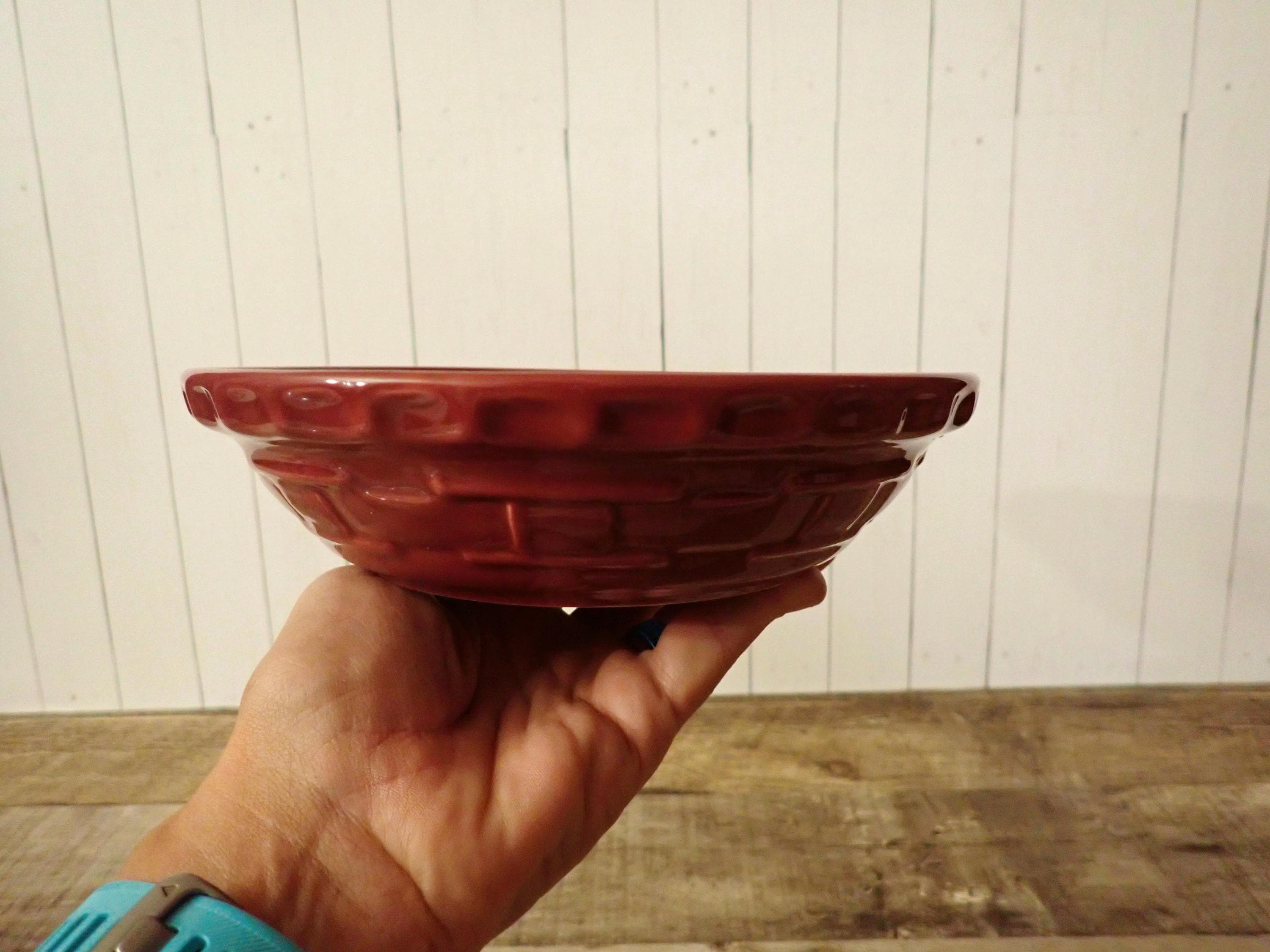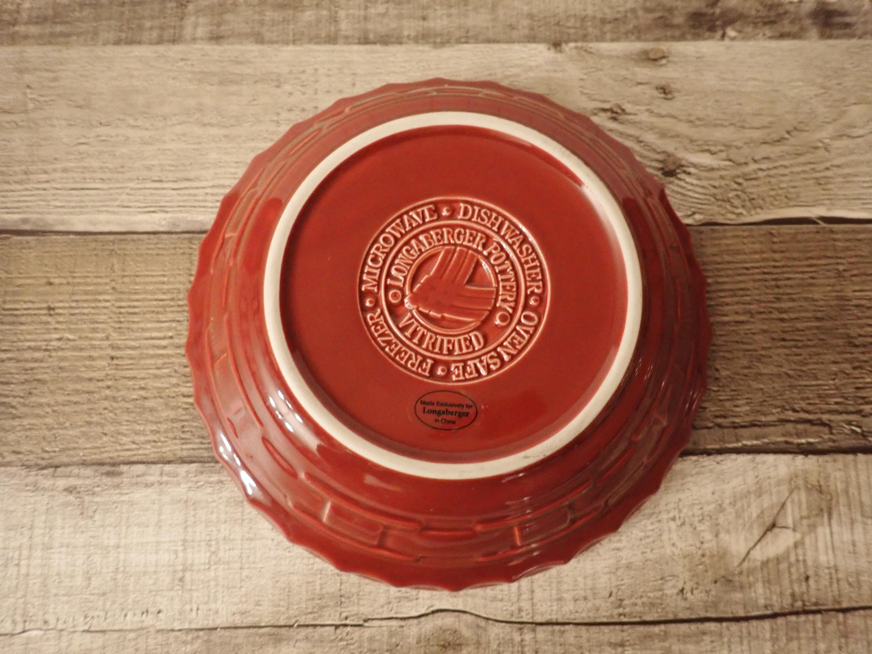 This Longaberger pie plate is in the Woven Traditions Paprika pattern and is the 7" Round Pie Plate. This plate measures 7.25" in diameter and 2" high. The plate is a thick purple ceramic with a woven design around the outside of the pie plate. The bottom is stamped : LONGABERGER POTTERY / VITRIFIED / DISHWASHER OVEN SAFE FREEZER MICROWAVE. There is a sticker that says Made in China. This plate is in very good condition with no chips or cracks. There are some surface scratches from use.