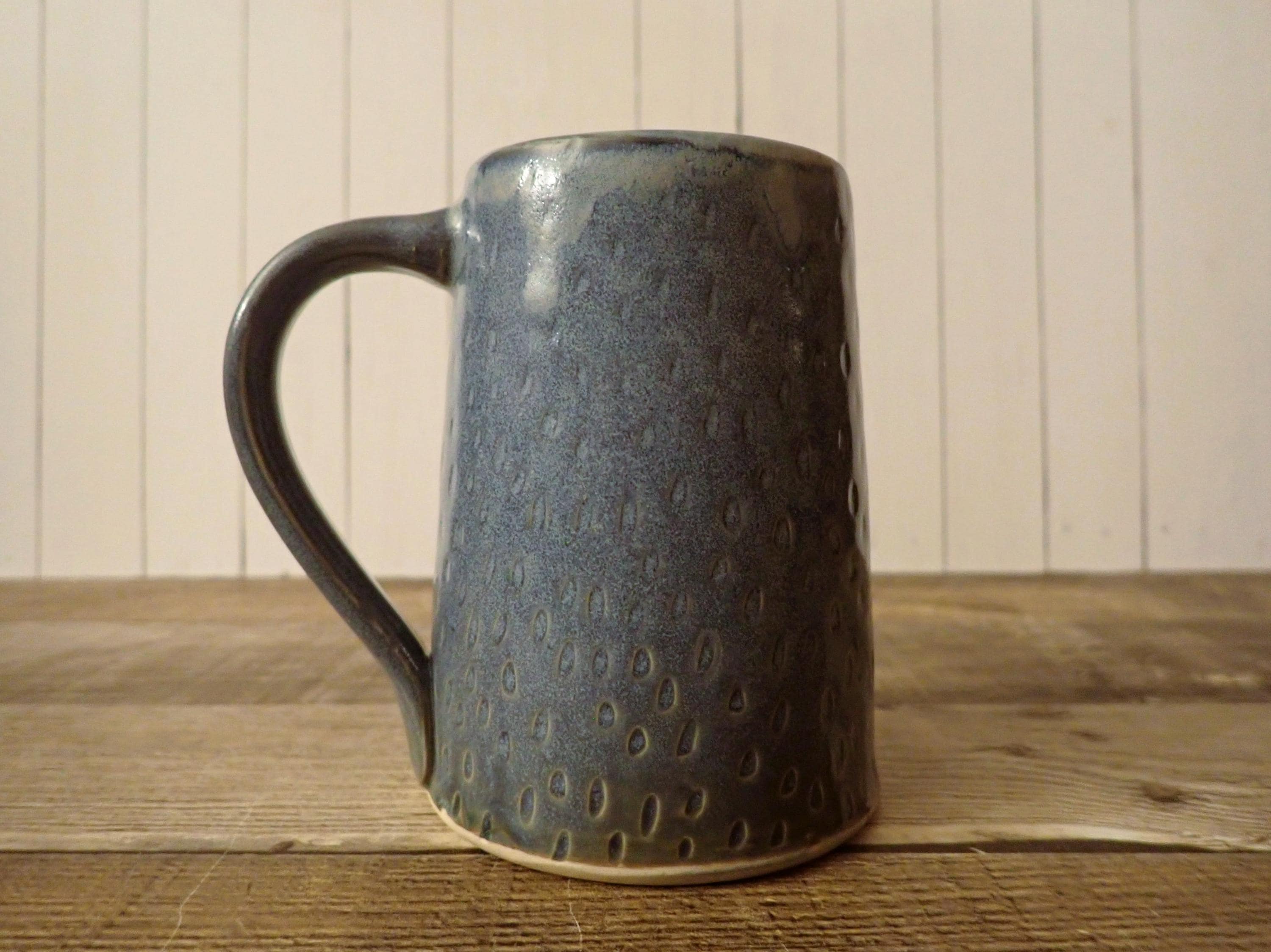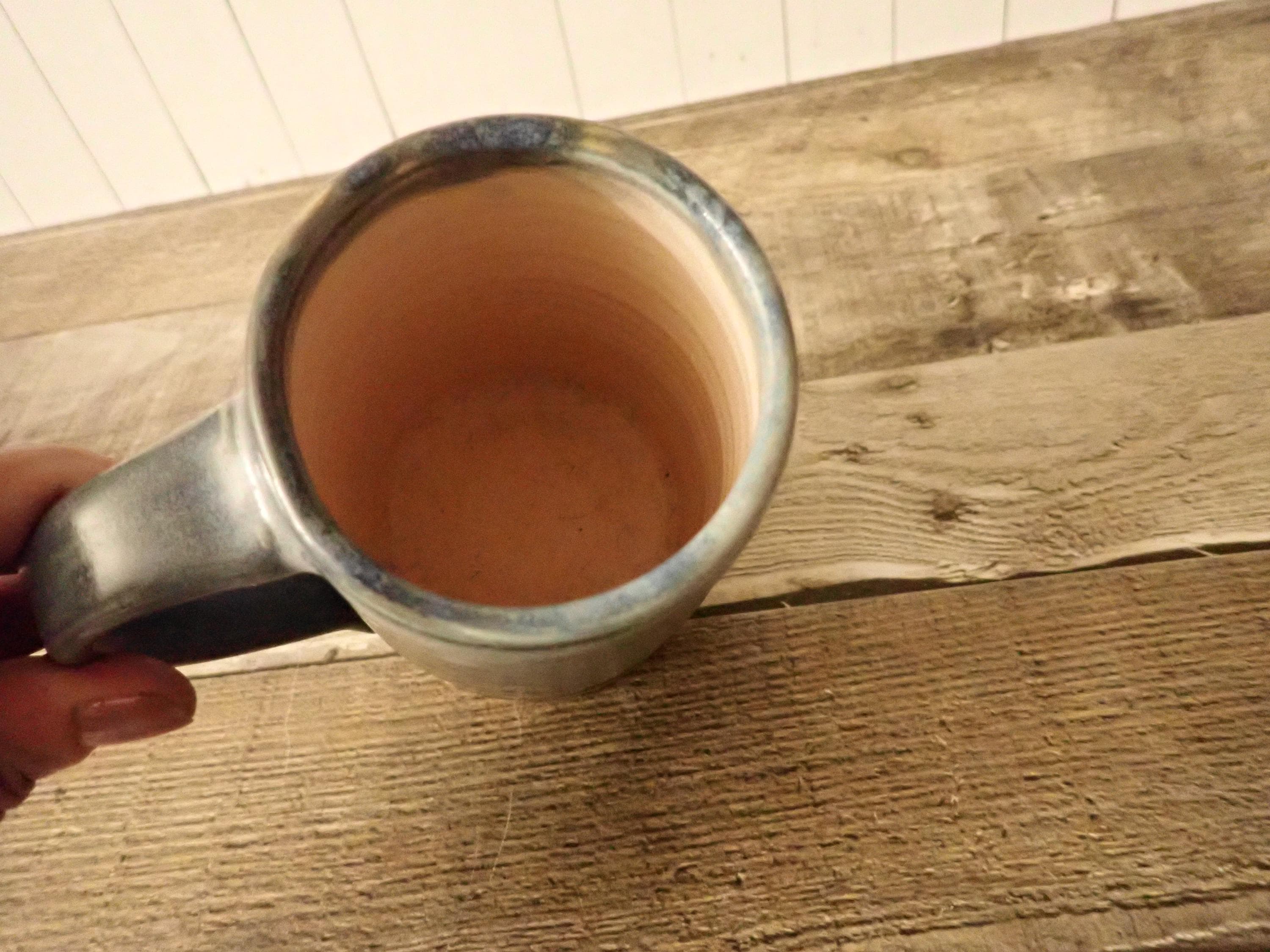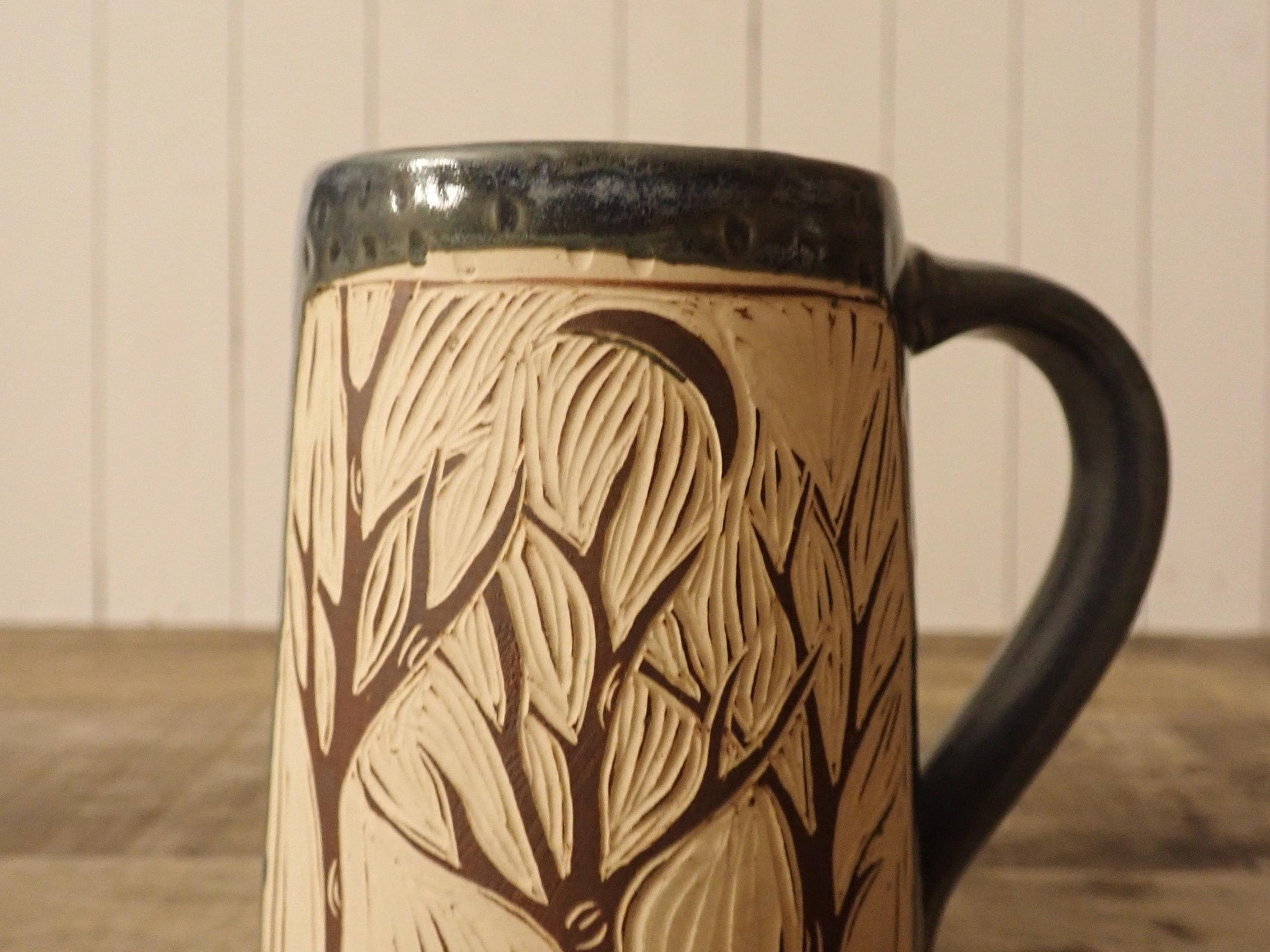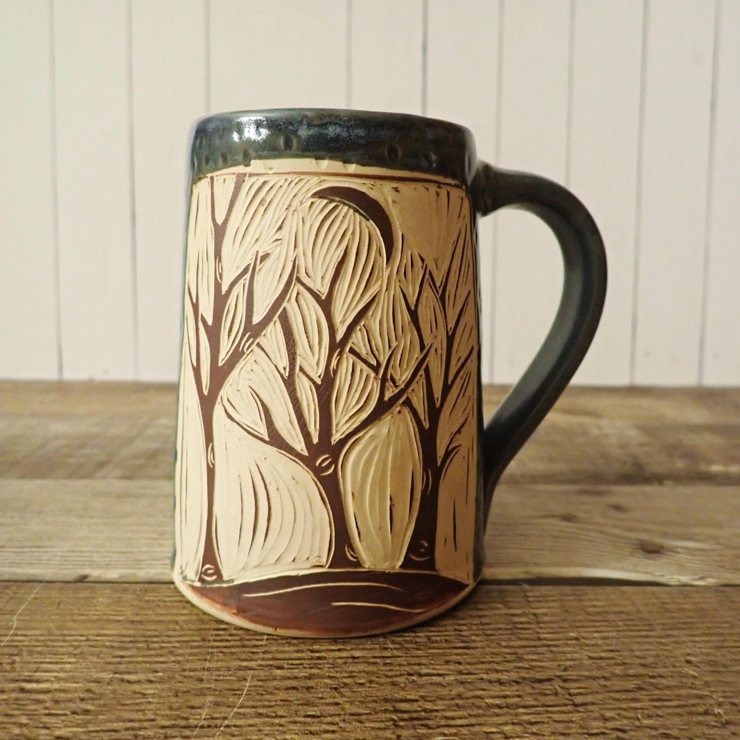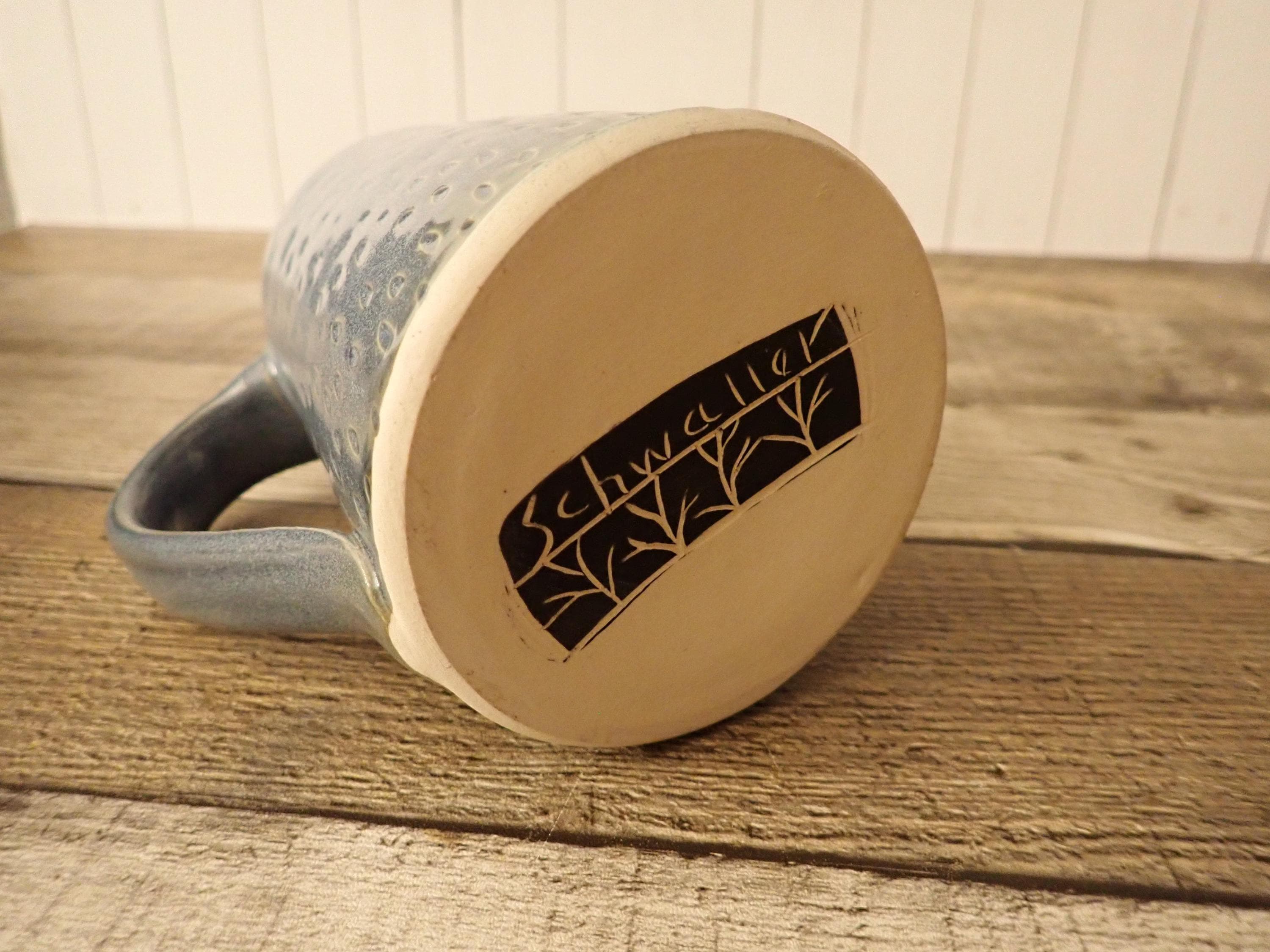 This lovely pottery mug was made by artist Renee Schwaller of Egg Harbor, Wisconsin. The mug is 4.75" tall and 3.5" in diameter at the base. It is a white stoneware with a blue glaze around most of the mug. The front is the mug is white with an etched tree design. The bottom of the mug is marked SCHWALLER. The mug can hold 14 oz. filled to the rim.