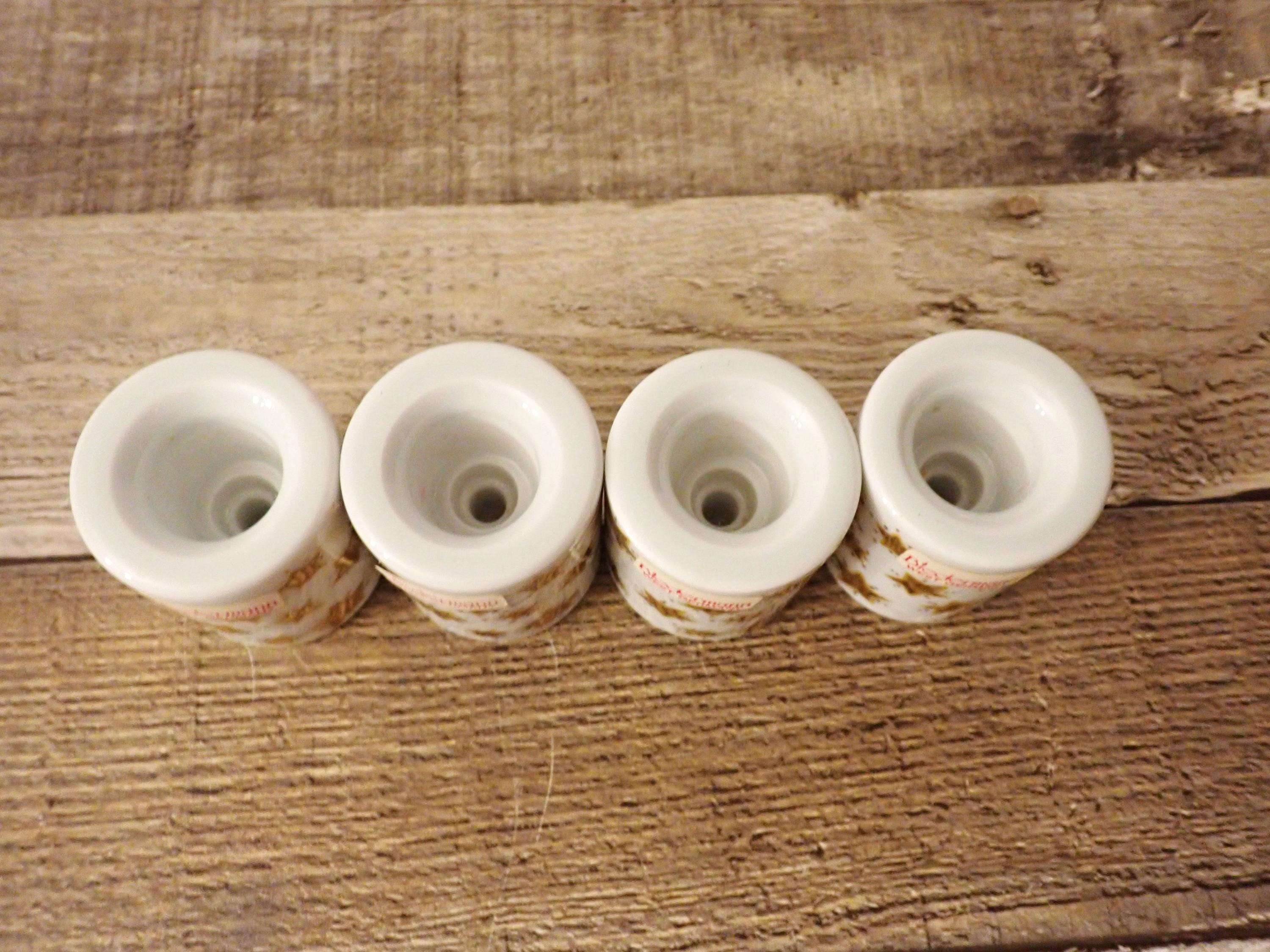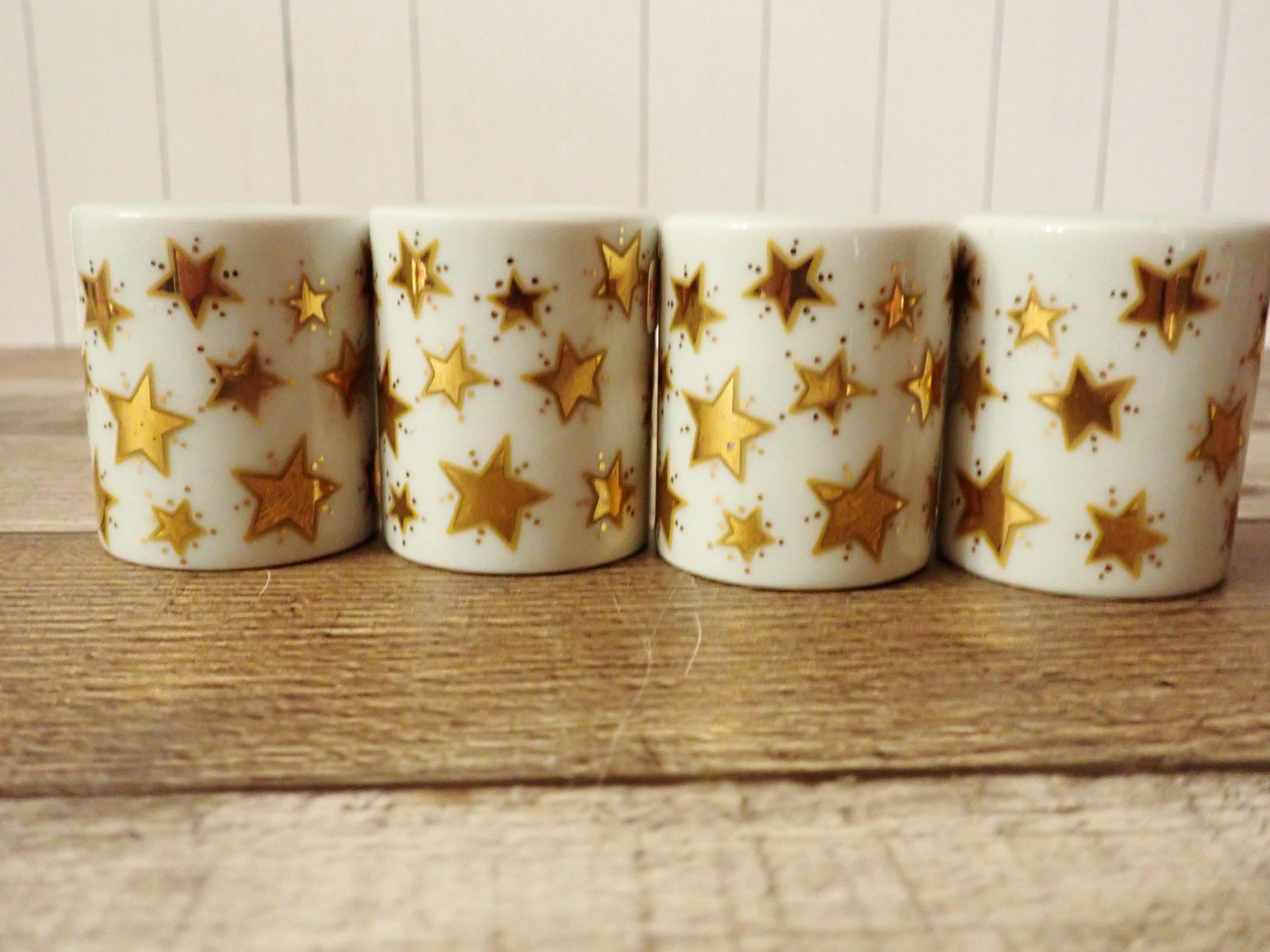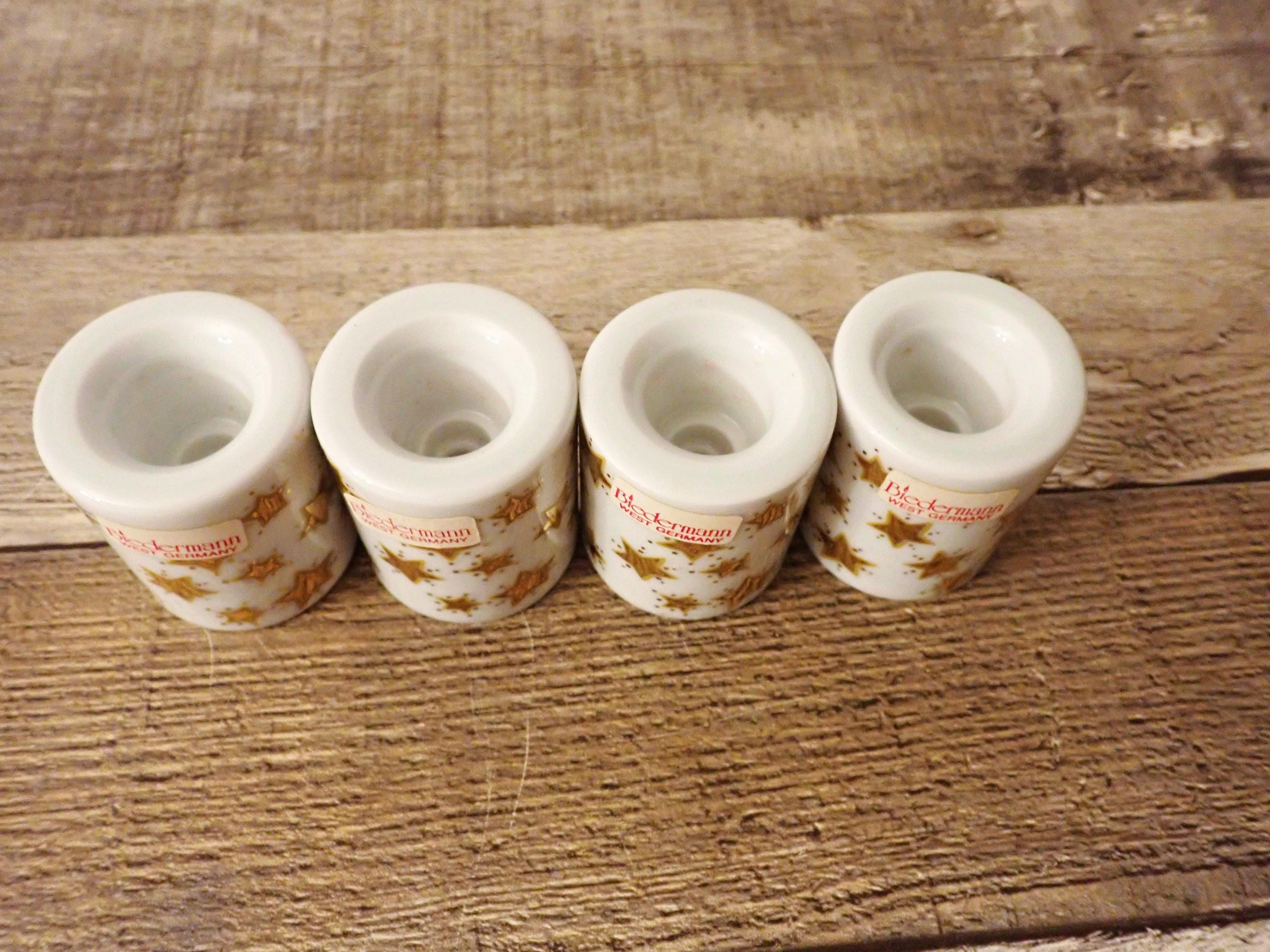 This set of ceramic candle holders includes 4 matching holders with a gold star design. They are 2" tall and 1.75" in diameter and are a modern round design. There is a 3/4" opening in each holder to hold one standard size taper candle. All 4 holders are in very good condition with no chips or cracks.