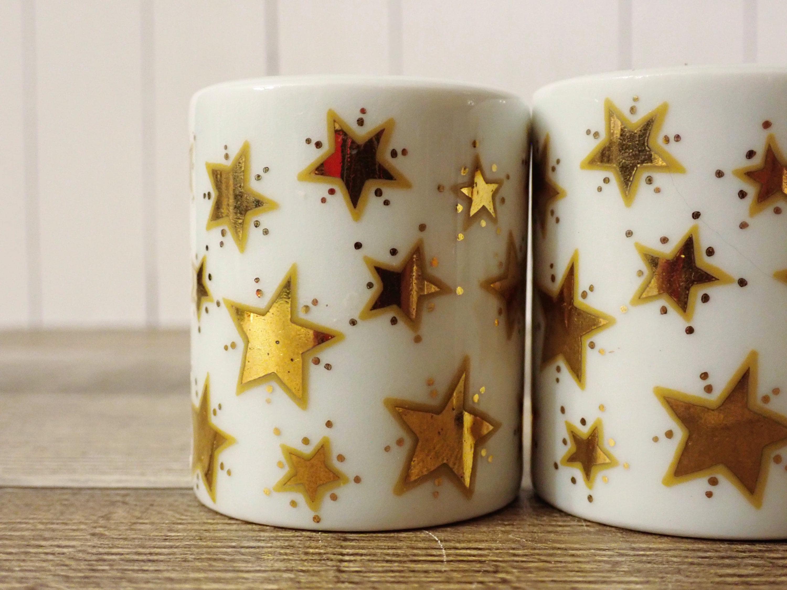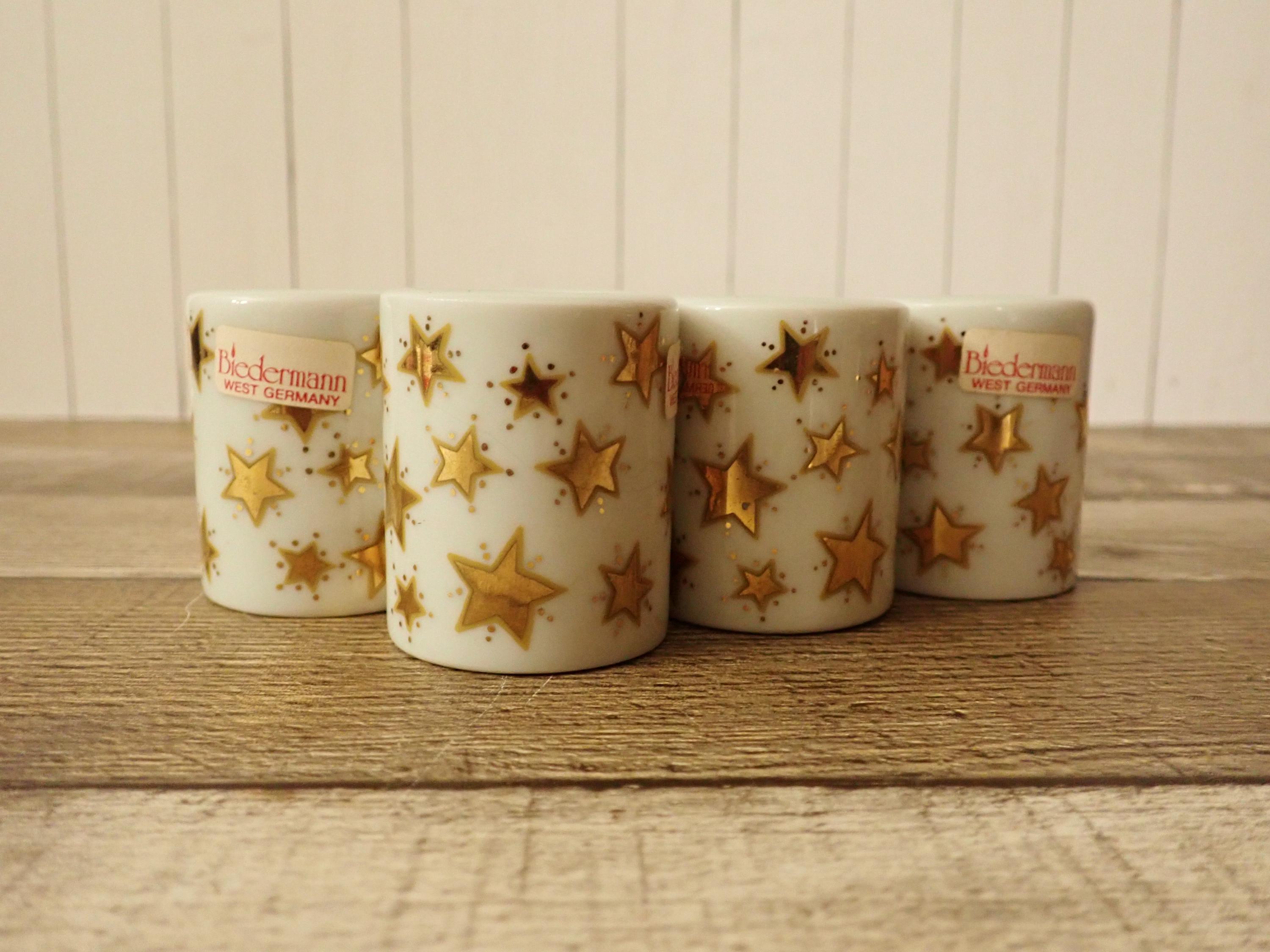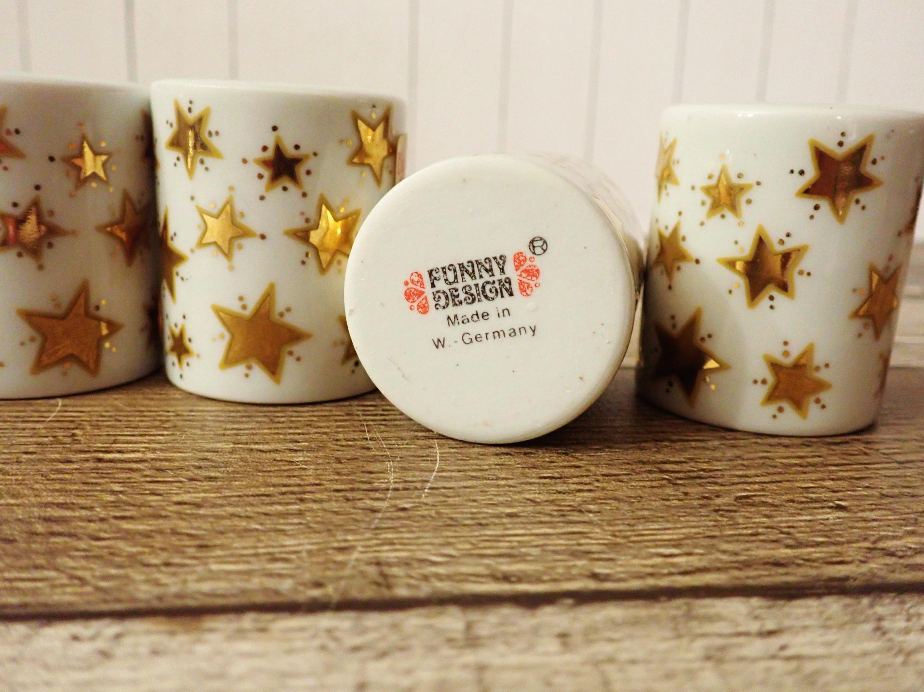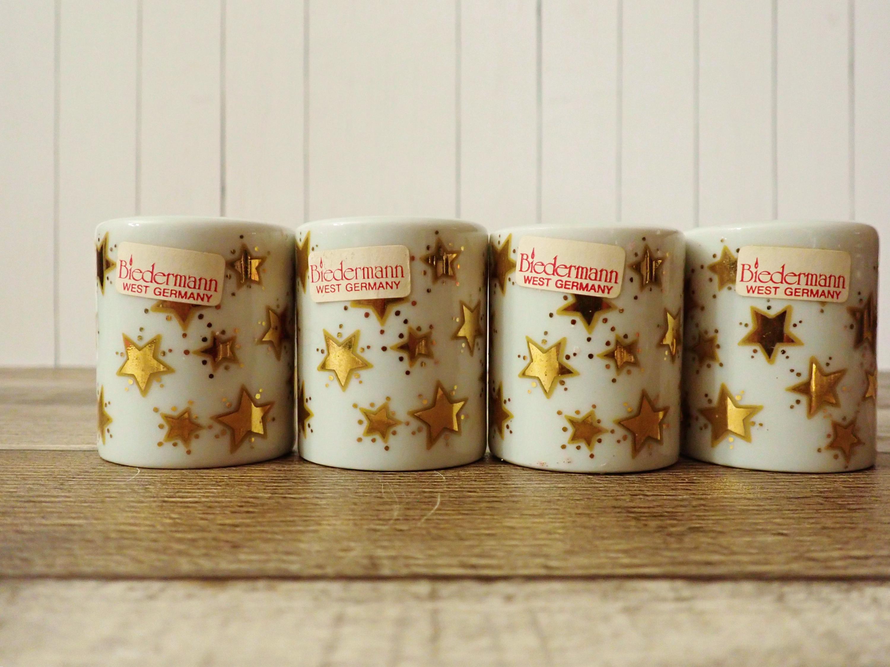 This set of ceramic candle holders includes 4 matching holders with a gold star design. They are 2" tall and 1.75" in diameter and are a modern round design. There is a 3/4" opening in each holder to hold one standard size taper candle. All 4 holders are in very good condition with no chips or cracks.