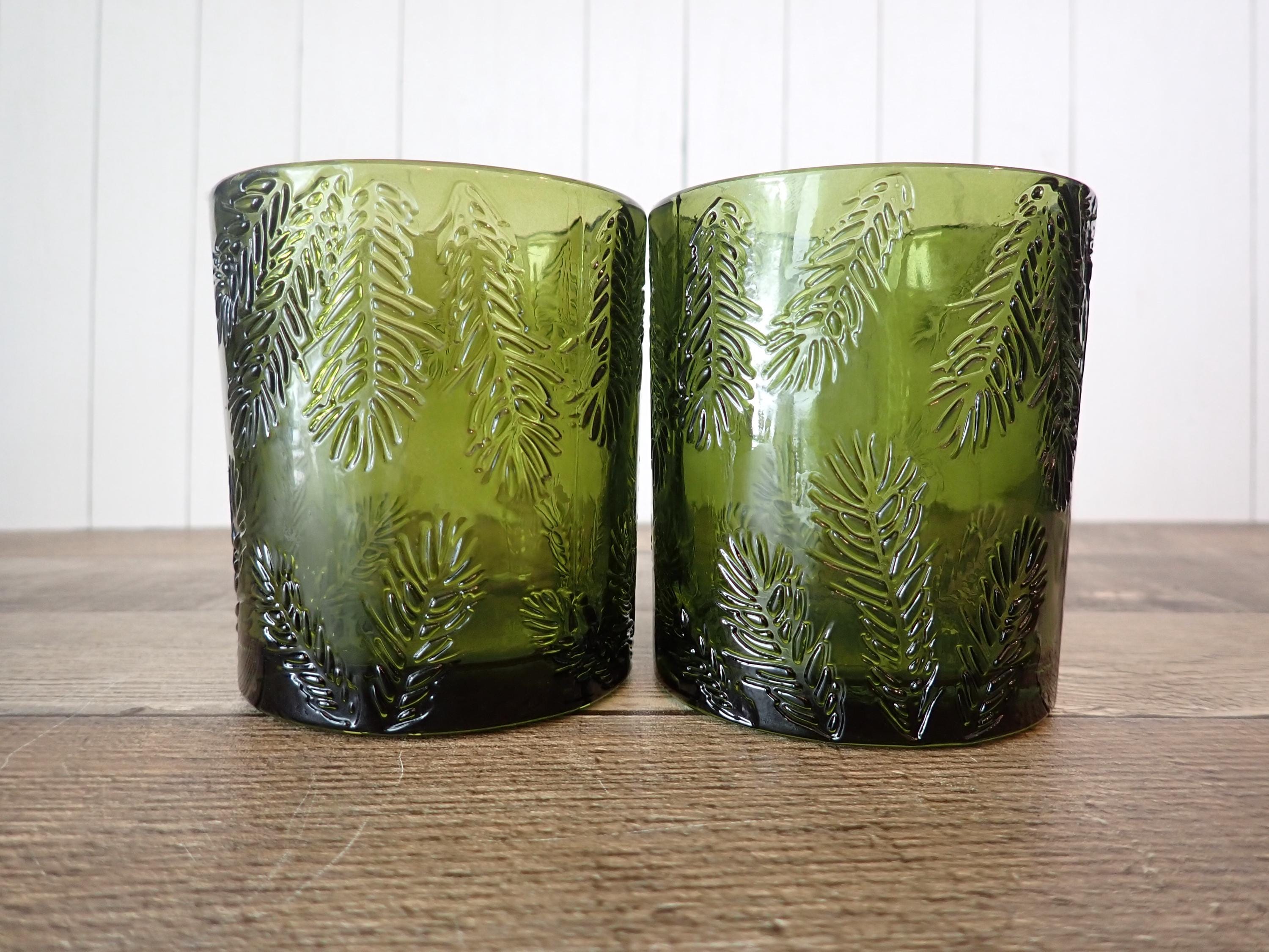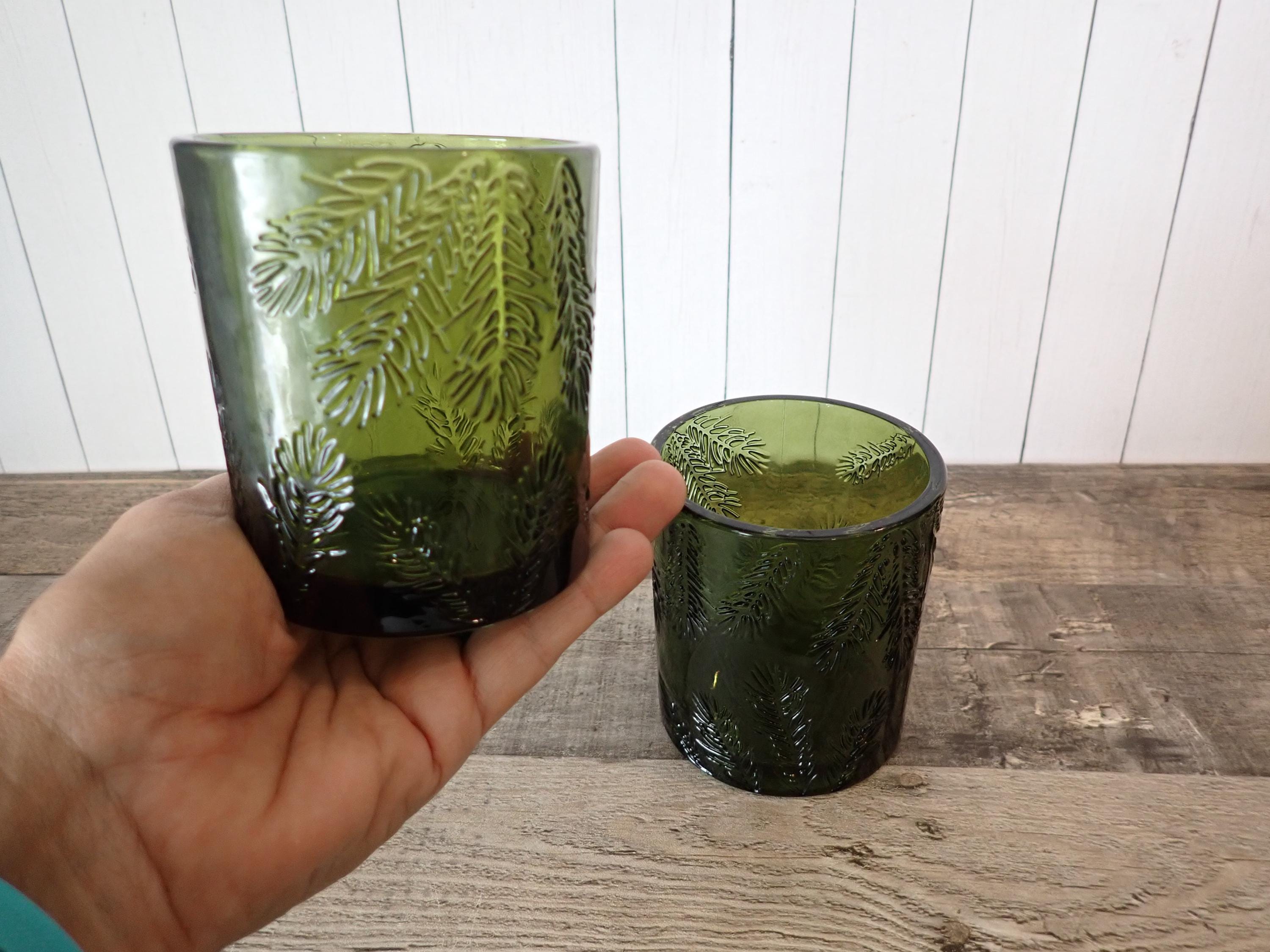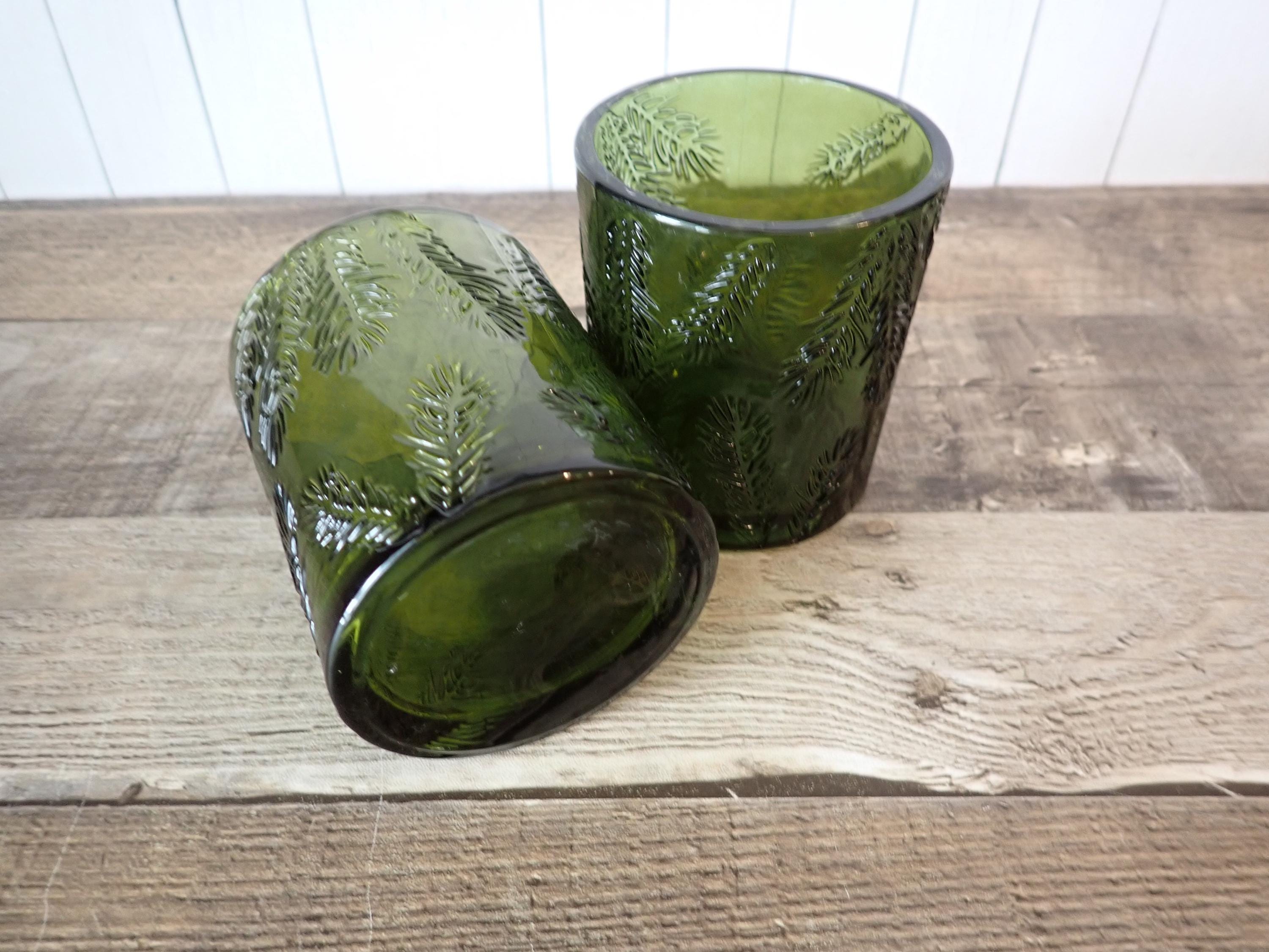 This set of glass candle holders includes 2 holders in the same pattern. The holders are each 3.5" tall and 3" in diameter. They are a green glass with an evergreen branch design around the holder. They can hold a votive or tealight candle. The candle holders are in in very good condition with no chips or cracks.