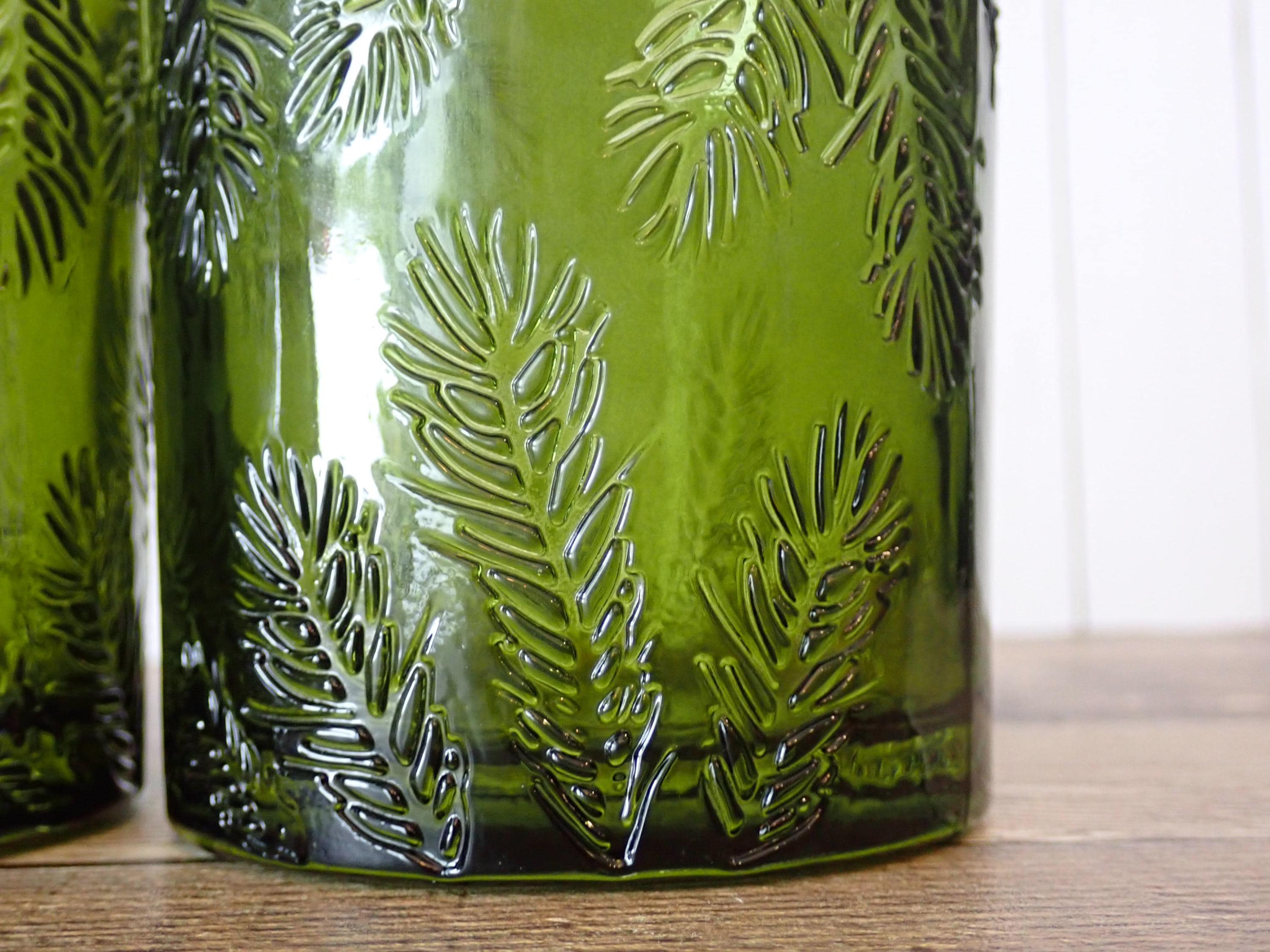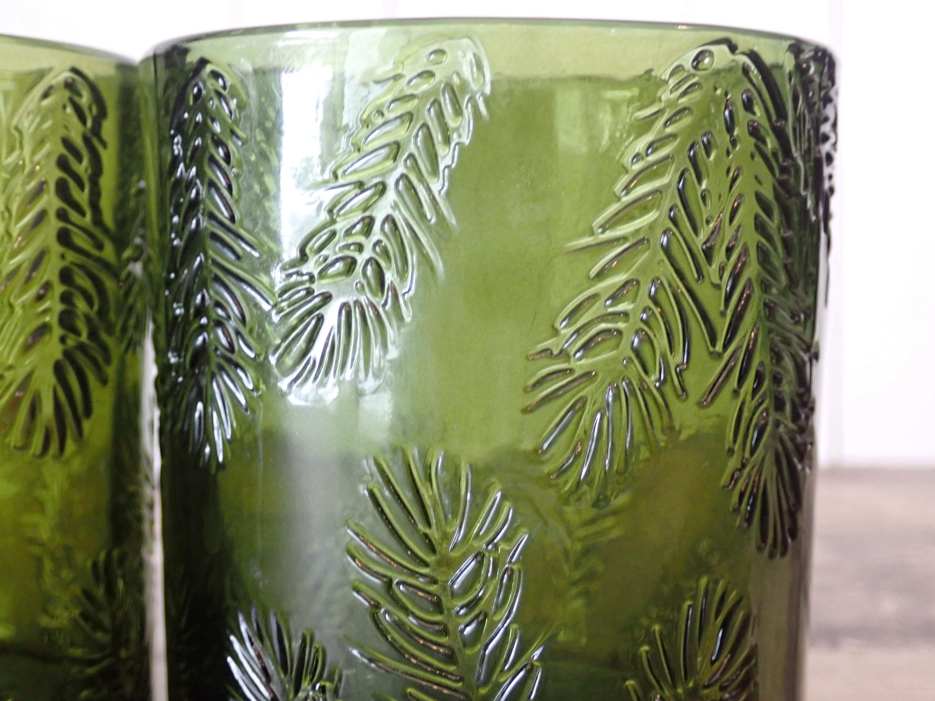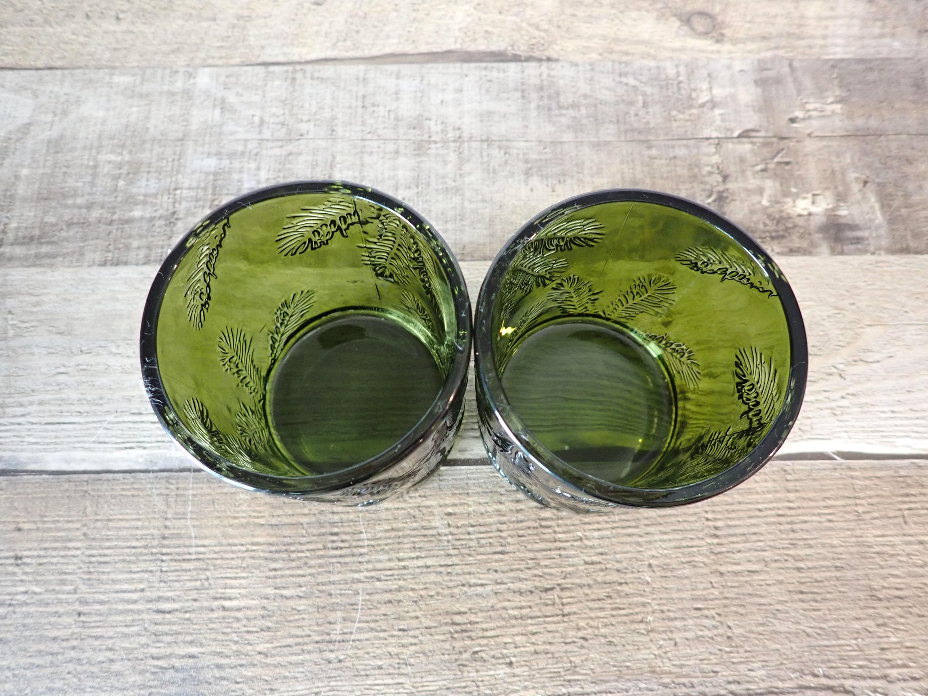 This set of glass candle holders includes 2 holders in the same pattern. The holders are each 3.5" tall and 3" in diameter. They are a green glass with an evergreen branch design around the holder. They can hold a votive or tealight candle. The candle holders are in in very good condition with no chips or cracks.