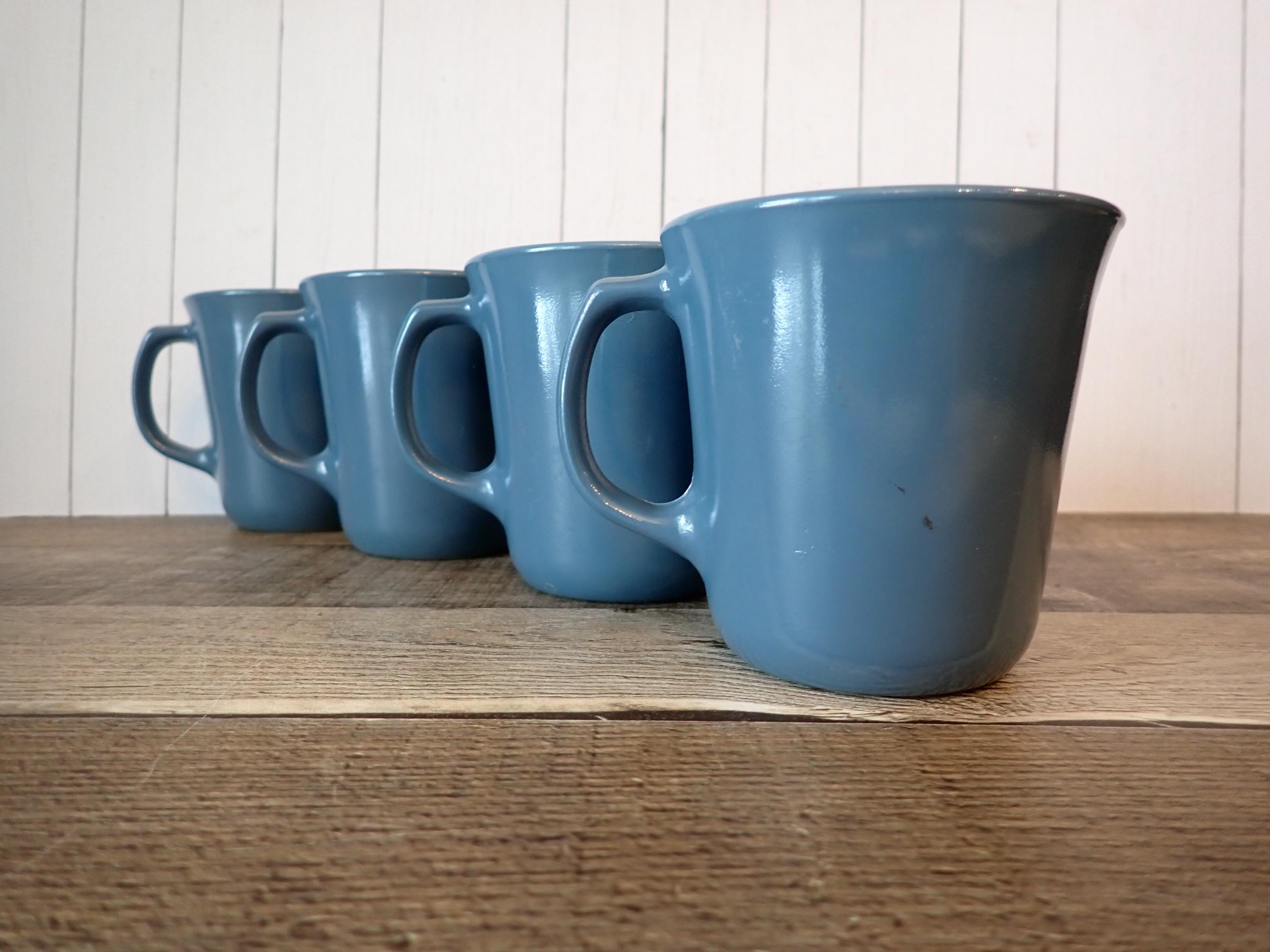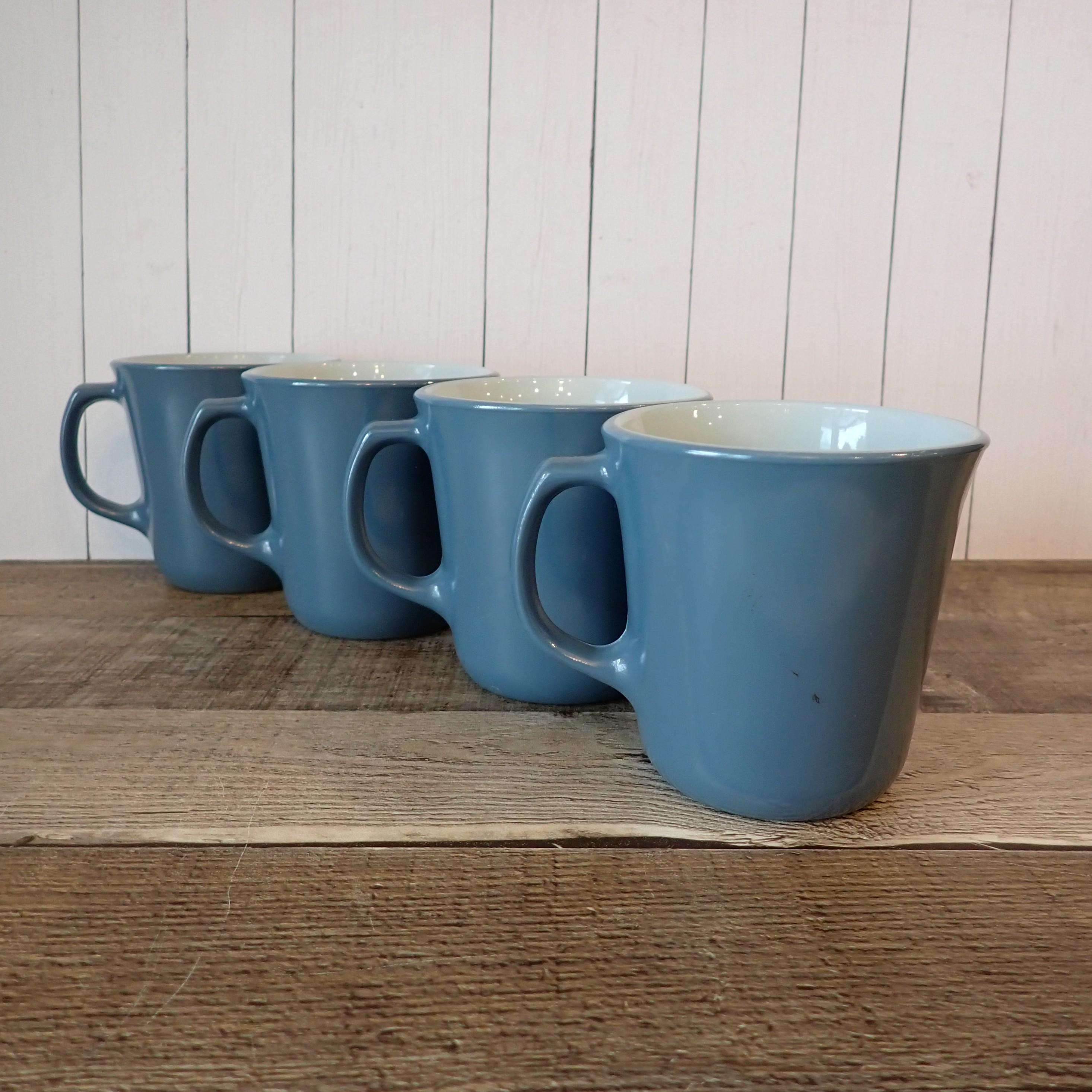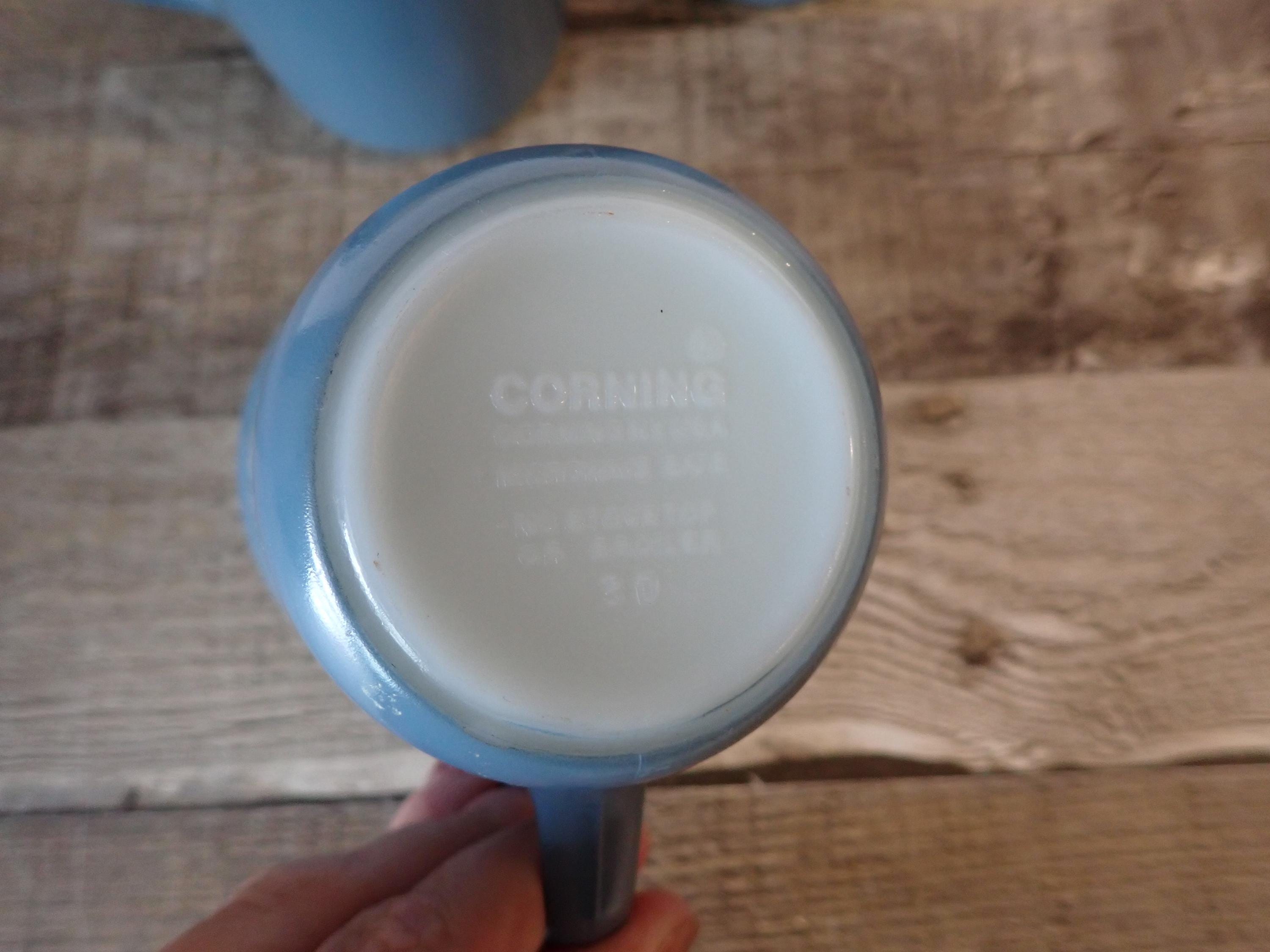 This set of 4 glass mugs by Corning are 3 1/2" high and 3 1/2" in diameter at the top. They are a white milk glass with a slate blue painted coating on the outside of the mugs - the insides are white. They are marked on the bottom: CORNING / CORNING, NY USA / MICROWAVE SAFE / NO STOVETOP / OR BROILER. All of the mugs are in very good condition with no chips or cracks. There are a few light scratches from use.
