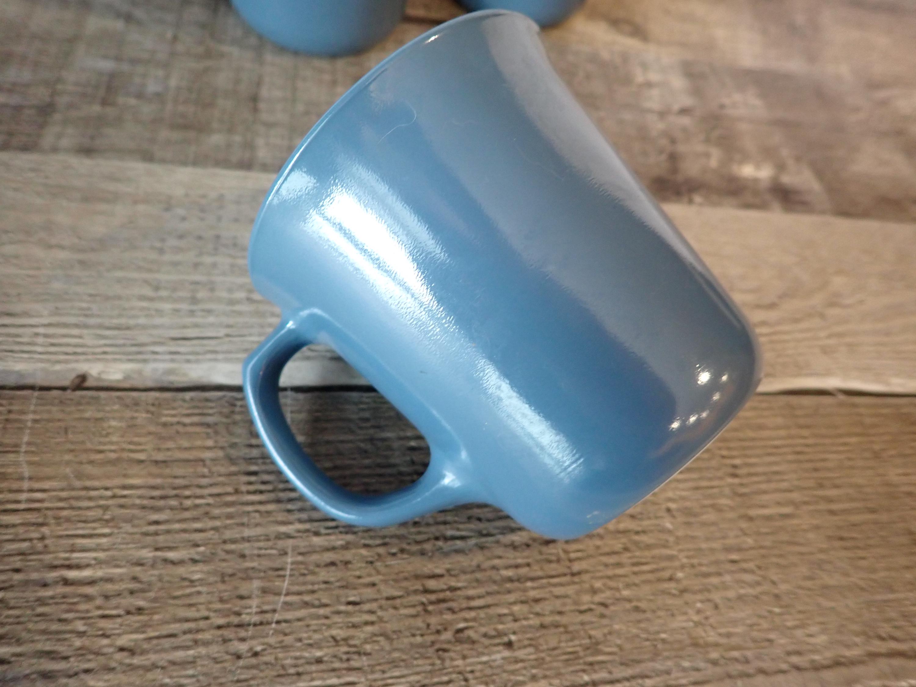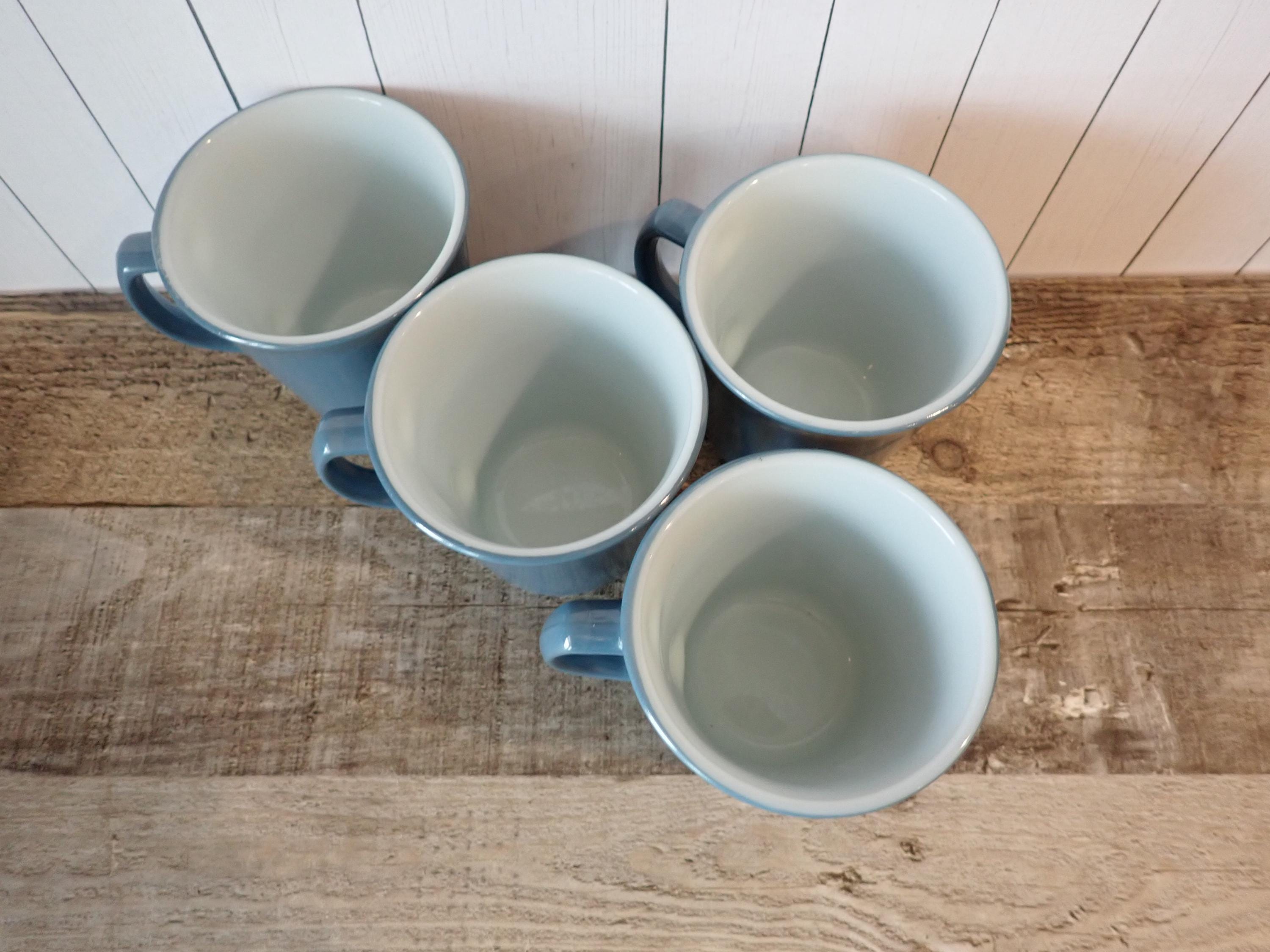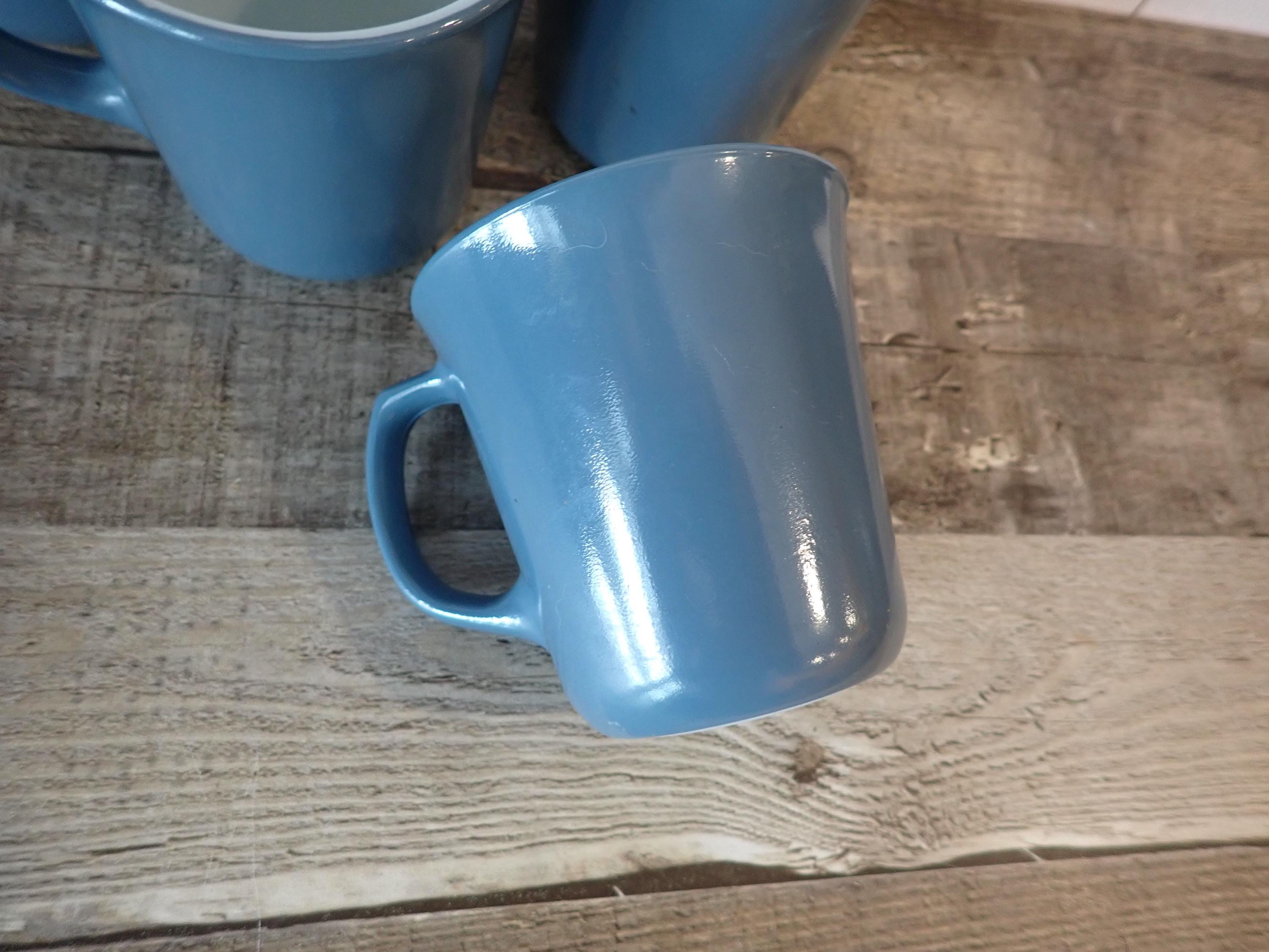 This set of 4 glass mugs by Corning are 3 1/2" high and 3 1/2" in diameter at the top. They are a white milk glass with a slate blue painted coating on the outside of the mugs - the insides are white. They are marked on the bottom: CORNING / CORNING, NY USA / MICROWAVE SAFE / NO STOVETOP / OR BROILER. All of the mugs are in very good condition with no chips or cracks. There are a few light scratches from use.
