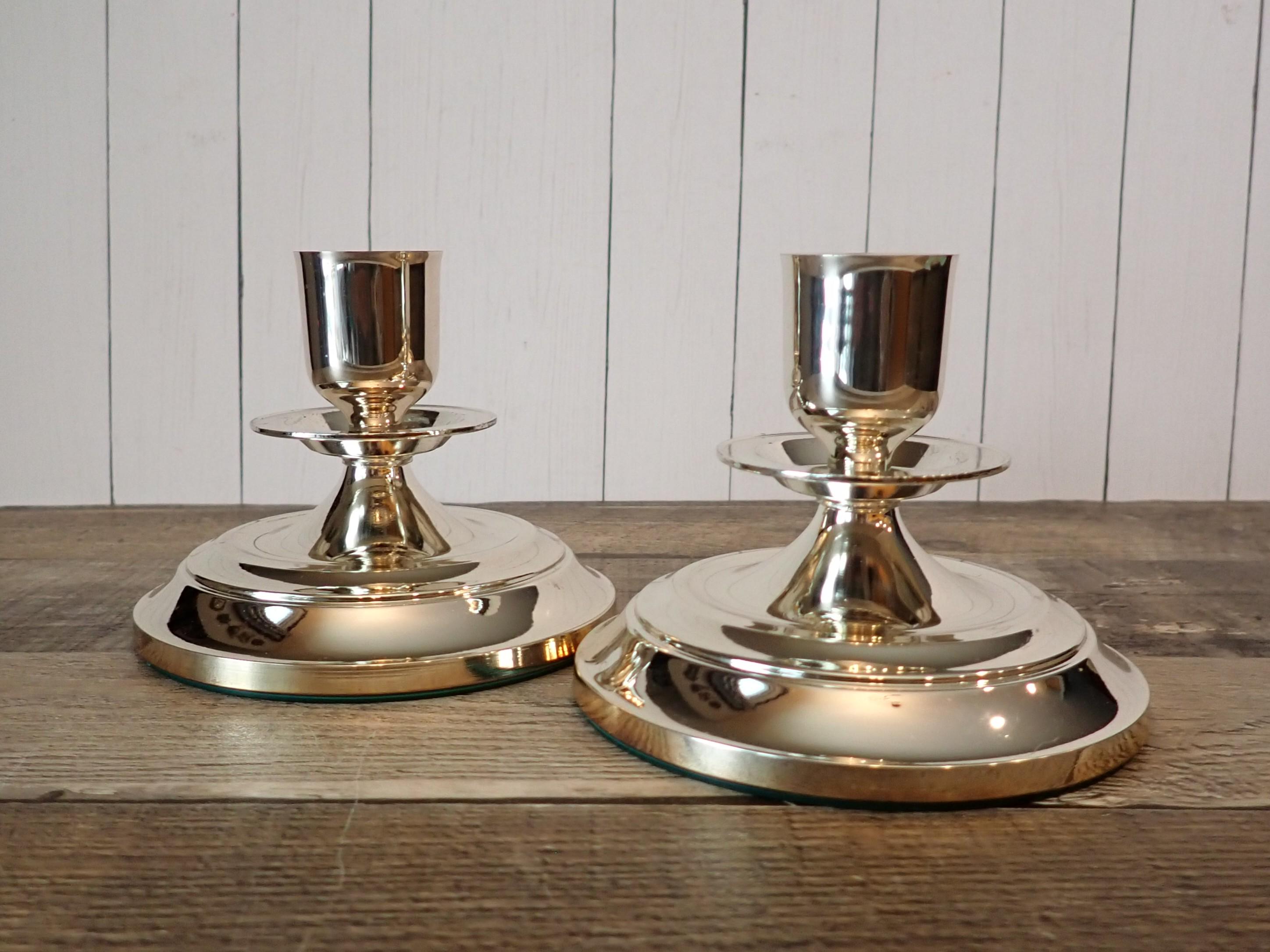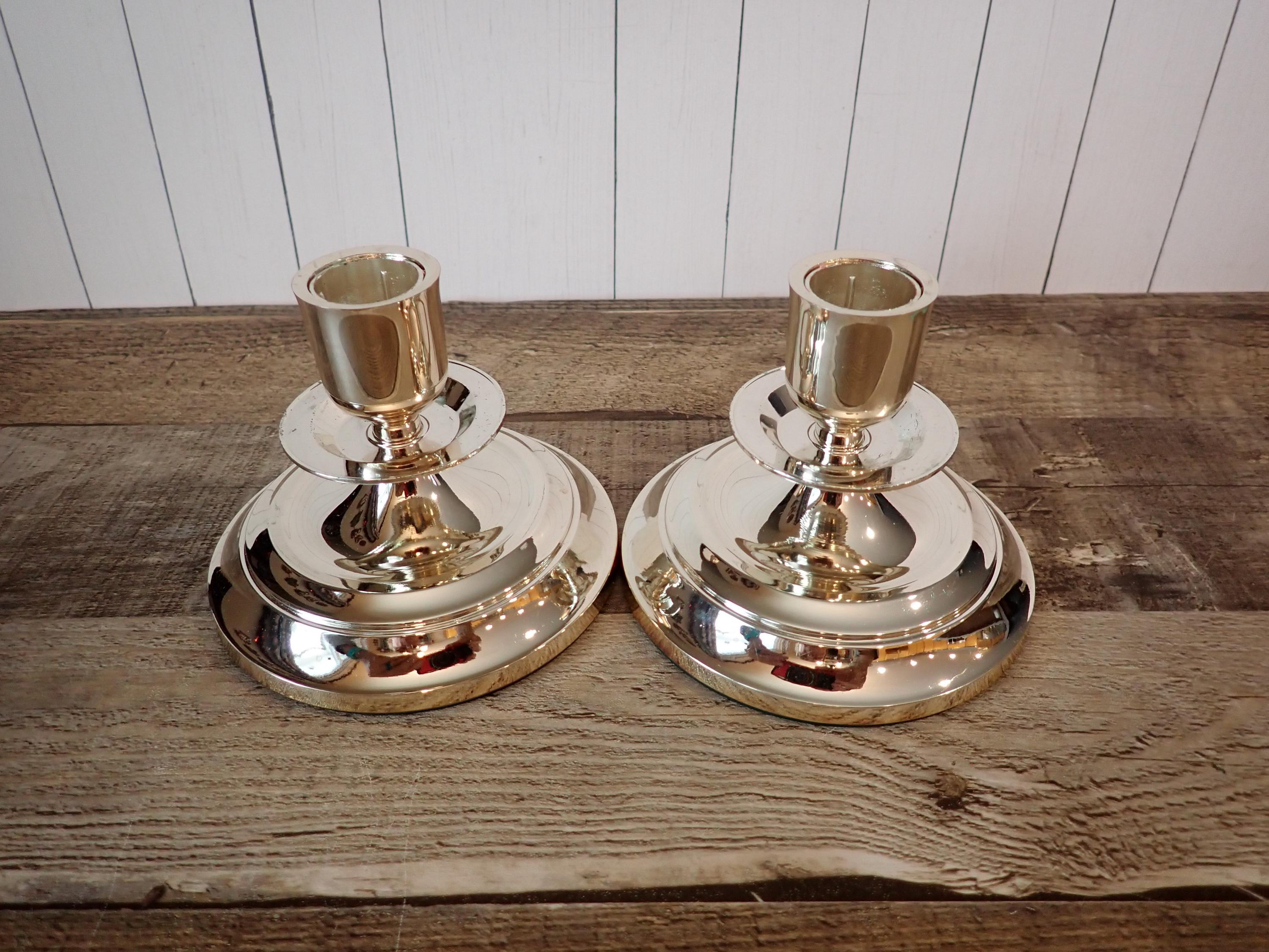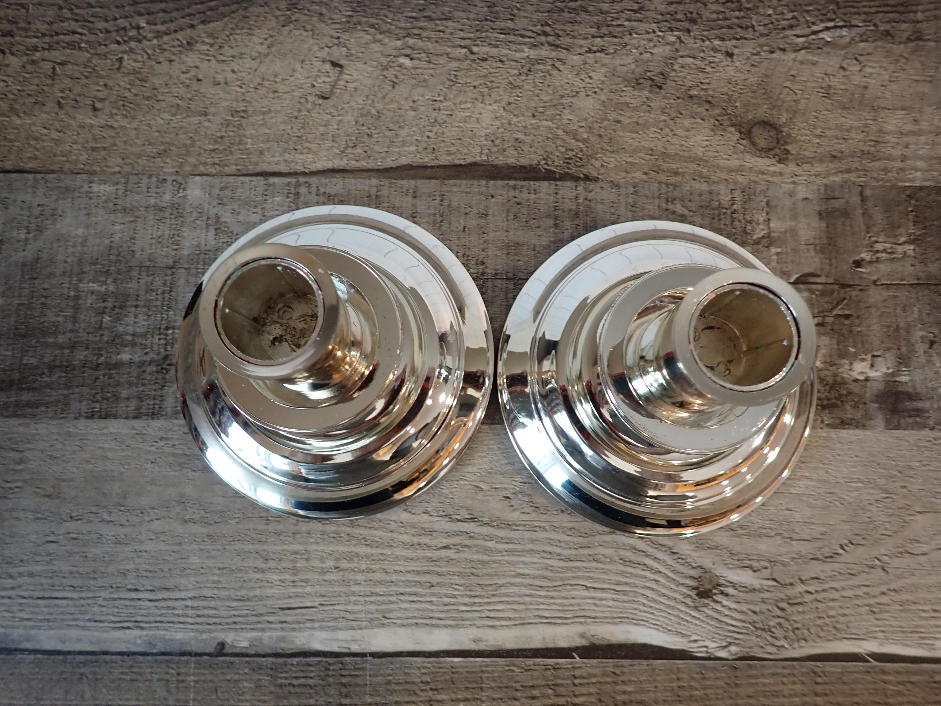 This set of 2 silver plated candlesticks by Wm. Rogers/Oneida Silversmiths are 3 1/2" tall and 4 1/4" in diameter at the base. They have a 7/8" candle opening and can each hold one taper candle. Both candlesticks are in very nice condition and includes the original box.