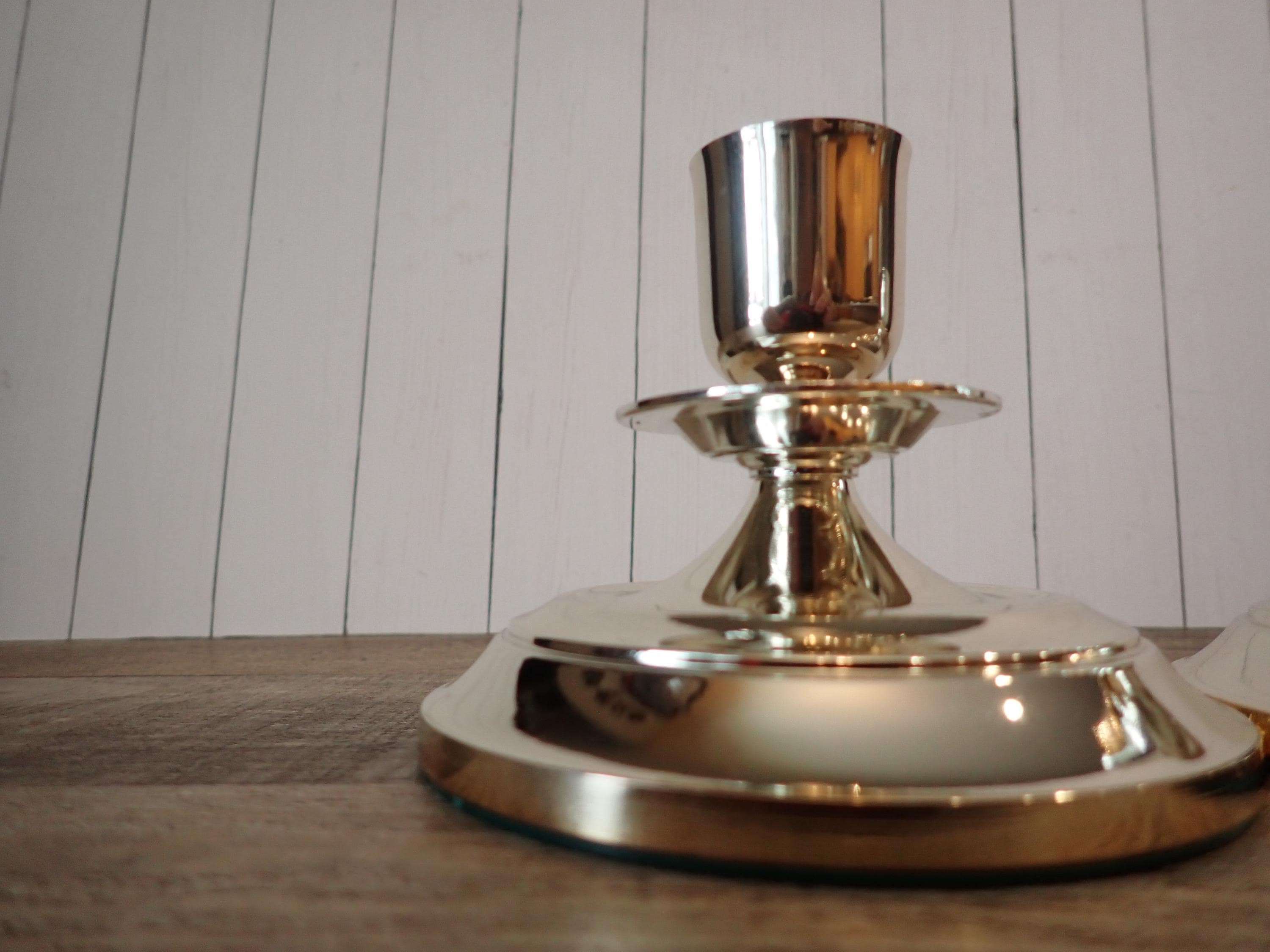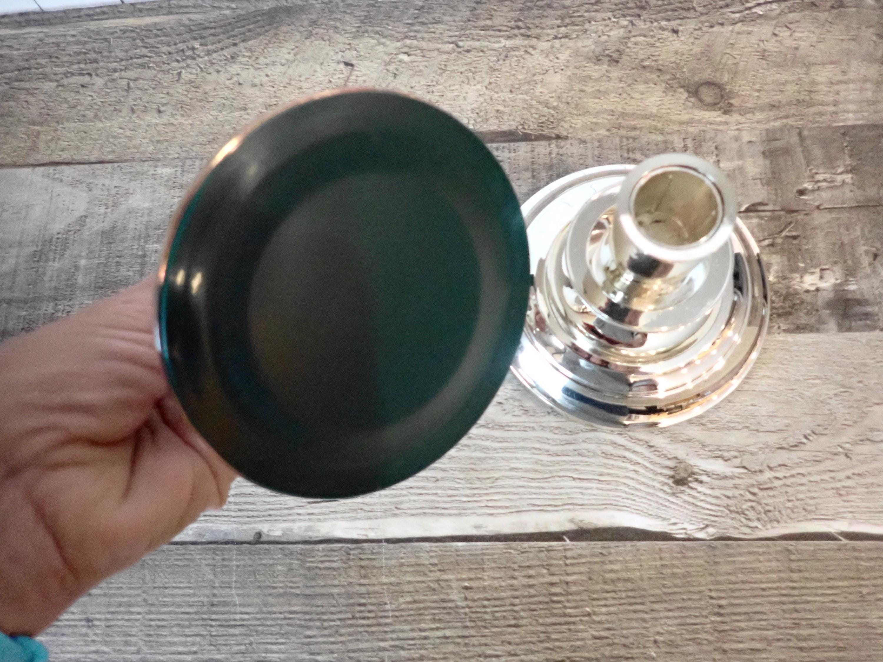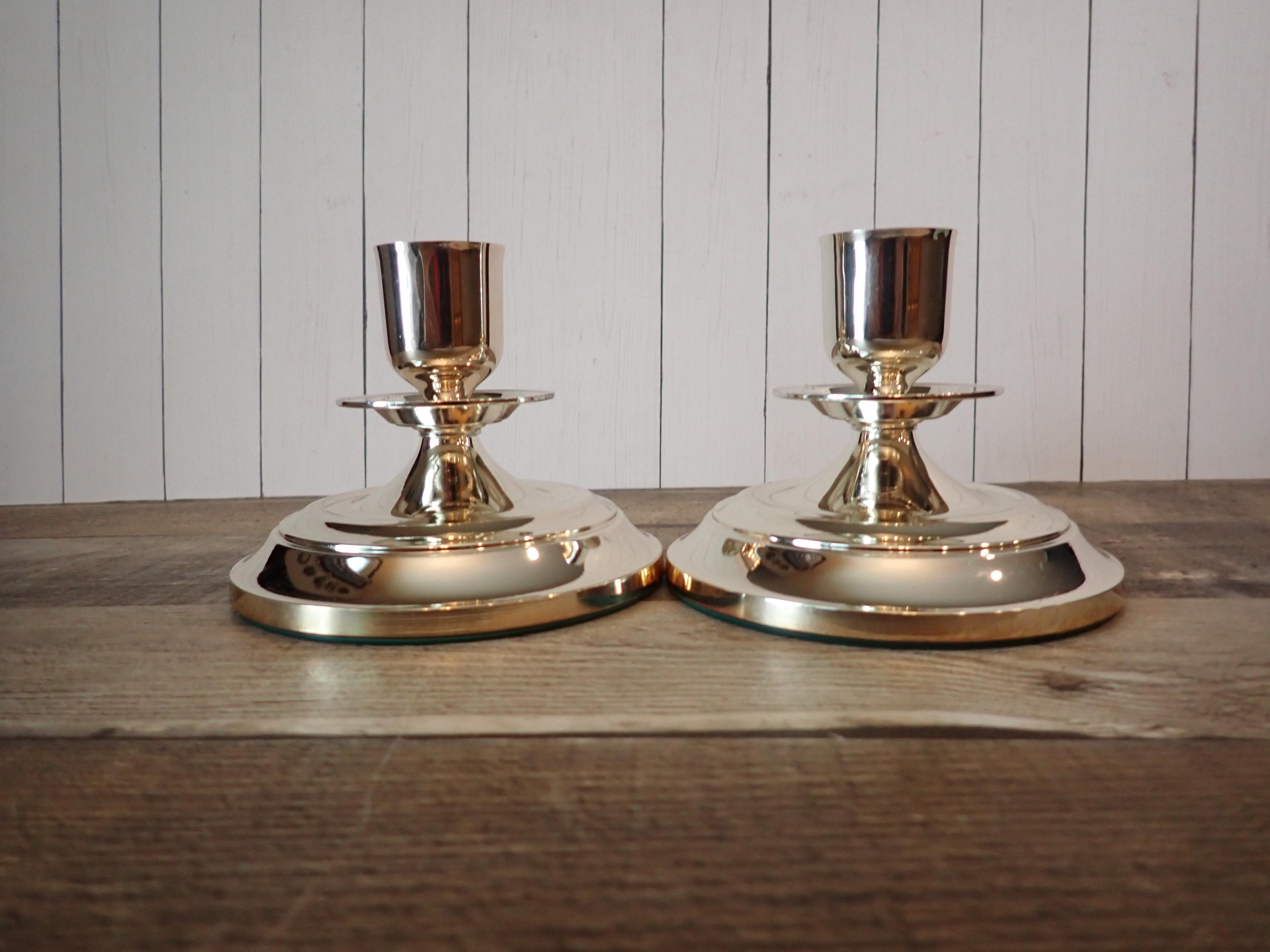 This set of 2 silver plated candlesticks by Wm. Rogers/Oneida Silversmiths are 3 1/2" tall and 4 1/4" in diameter at the base. They have a 7/8" candle opening and can each hold one taper candle. Both candlesticks are in very nice condition and includes the original box.
