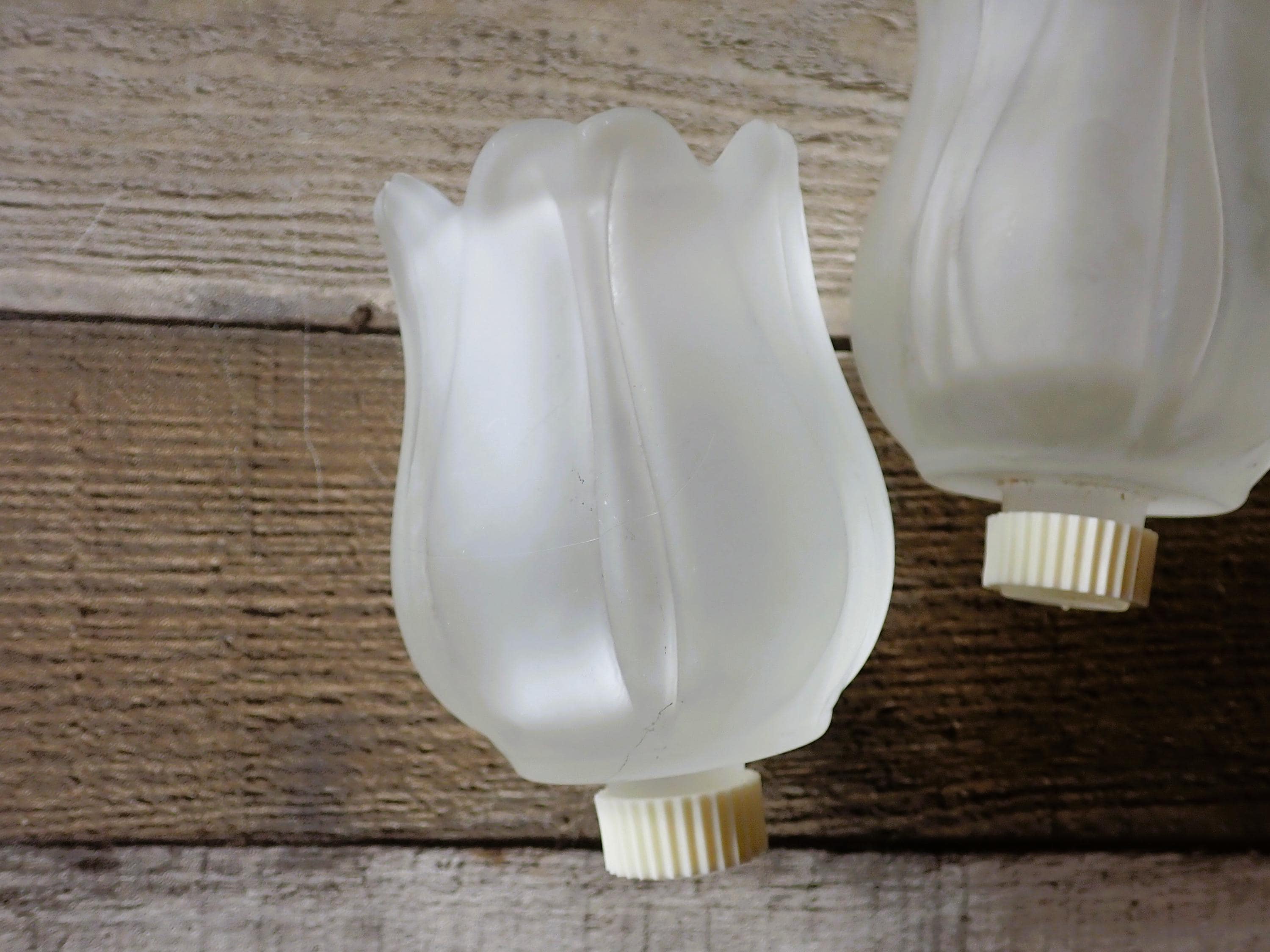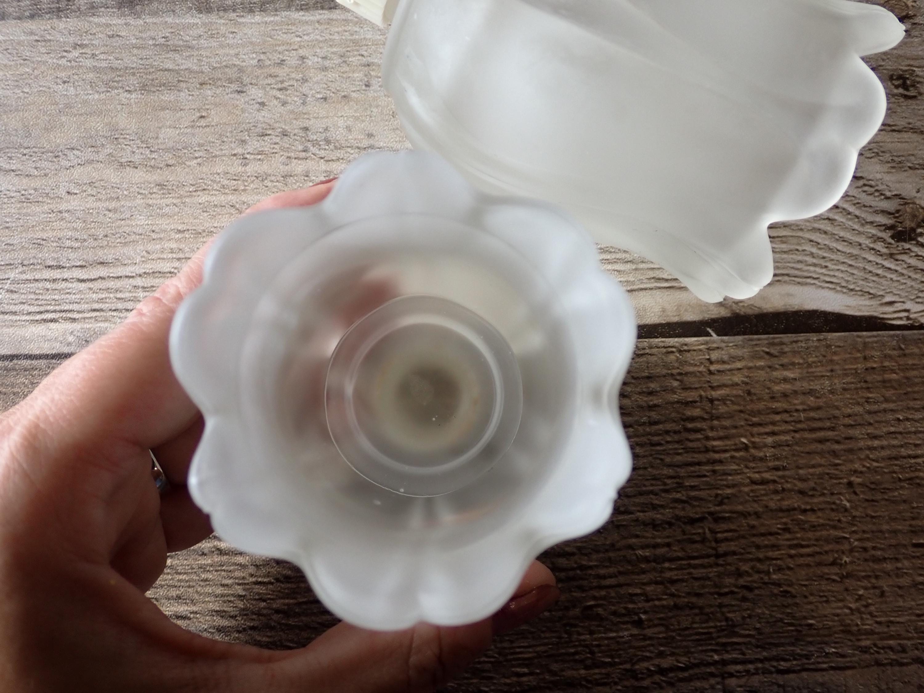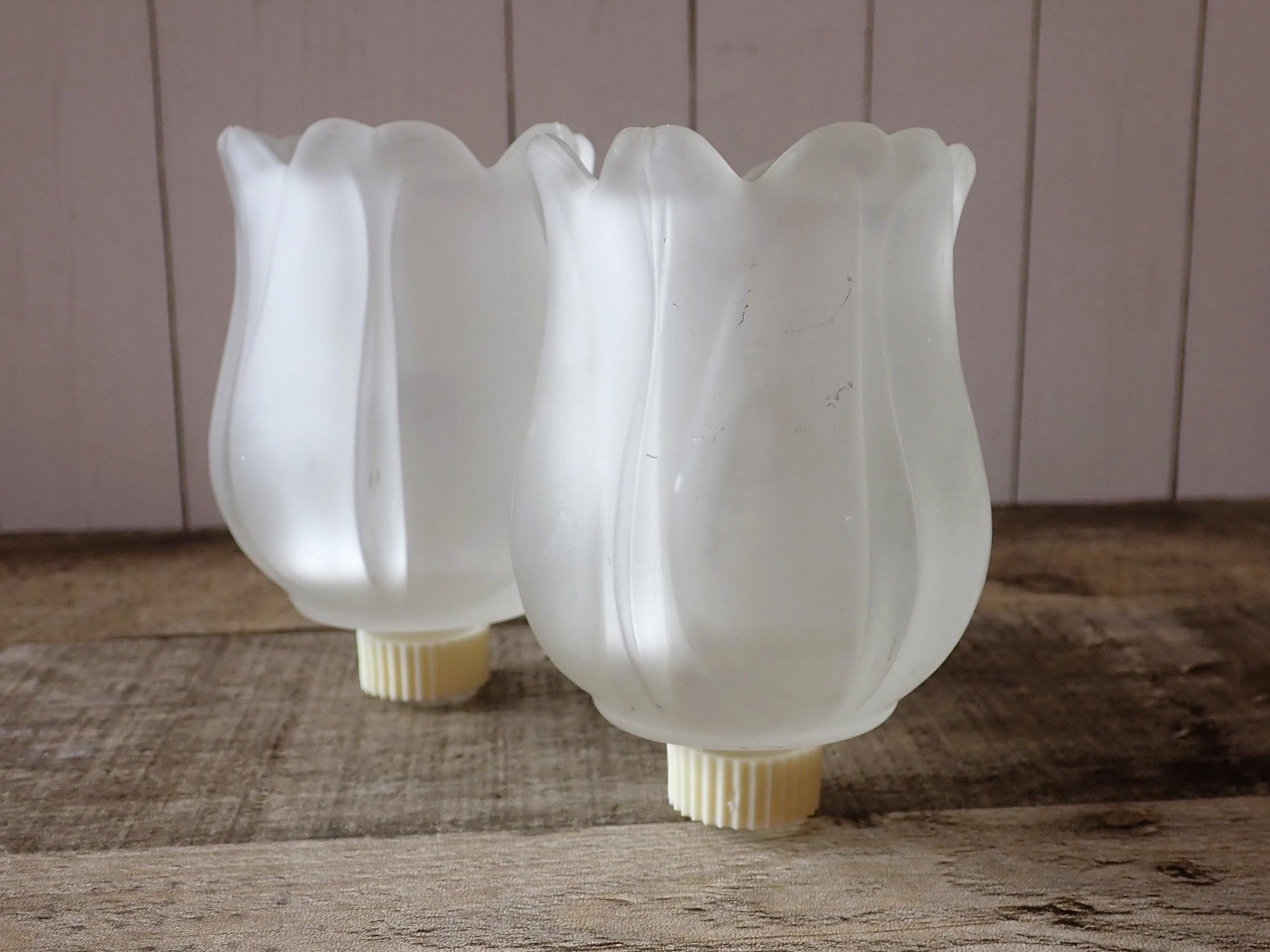 These clear frosted glass votive cups are glass and measure 3.25" tall (without the peg on the bottom) and 2.5" in diameter. They have a flower shape and the rim flares outward. They can hold a small tealight of votive candle. The inside diameter is 1.75 inches. They include the plastic grommets to secure into a candlestick. The holders are in very good condition with no chips or cracks.