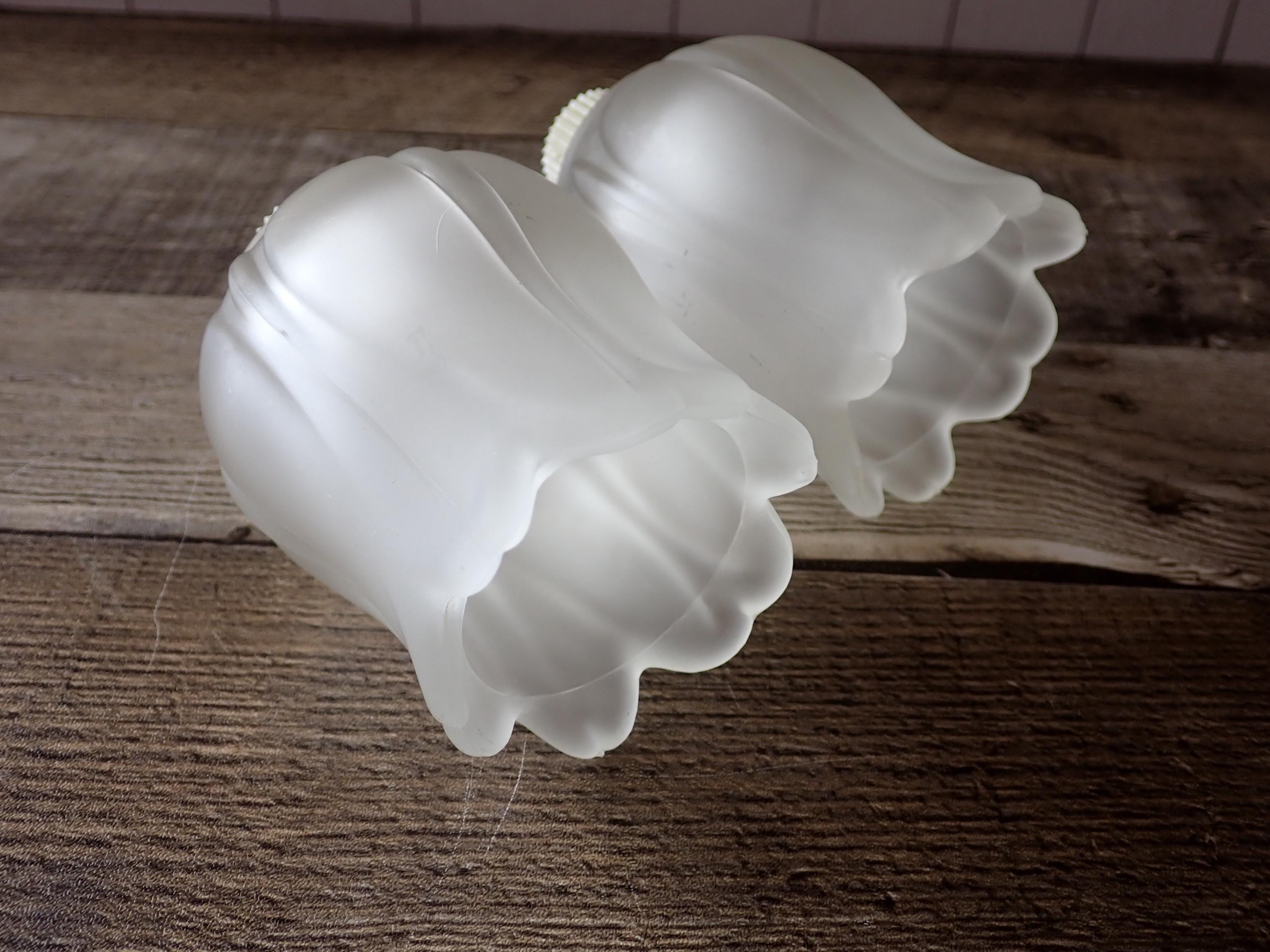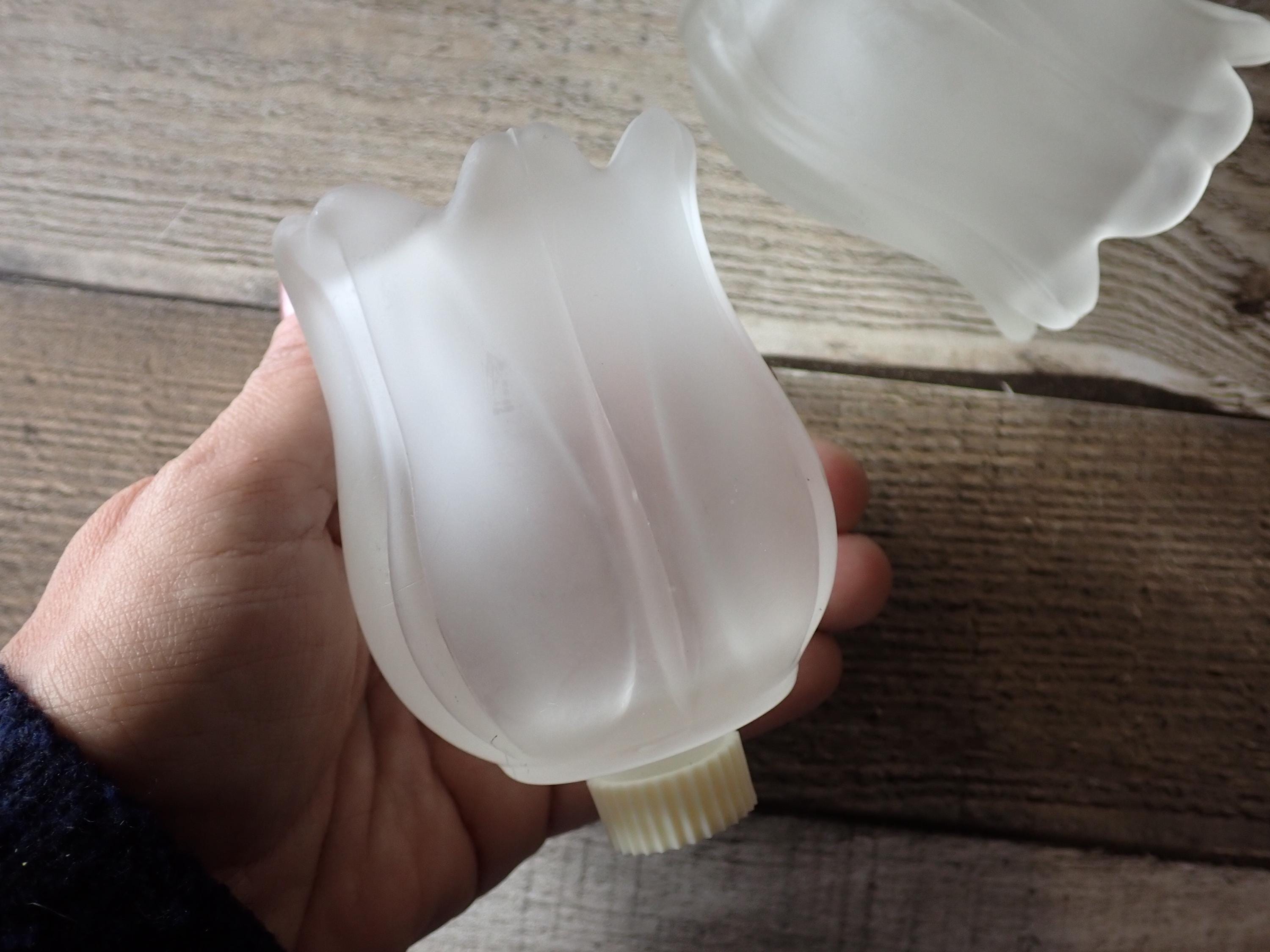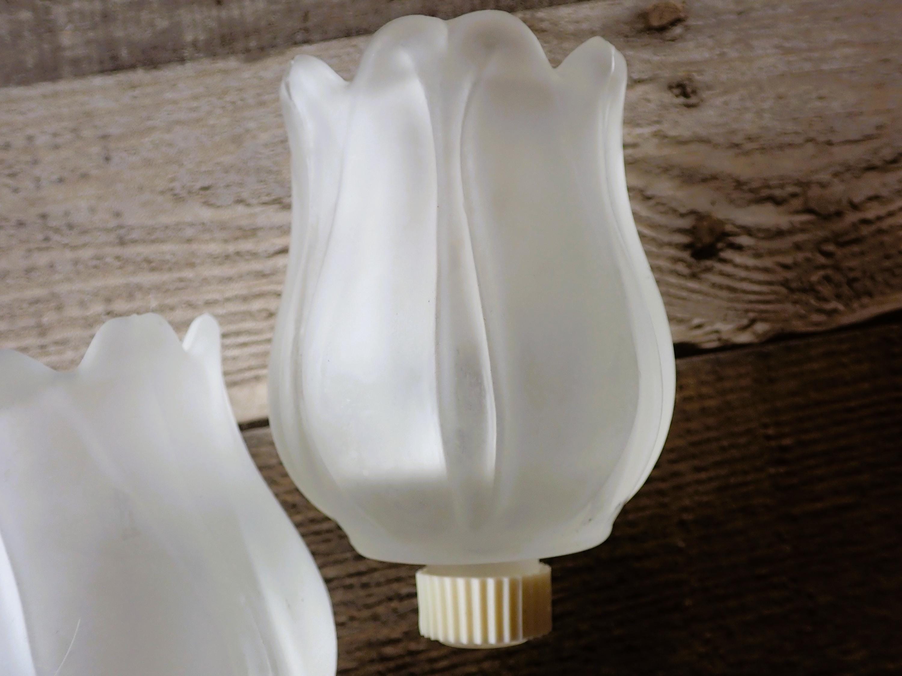 These clear frosted glass votive cups are glass and measure 3.25" tall (without the peg on the bottom) and 2.5" in diameter. They have a flower shape and the rim flares outward. They can hold a small tealight of votive candle. The inside diameter is 1.75 inches. They include the plastic grommets to secure into a candlestick. The holders are in very good condition with no chips or cracks.