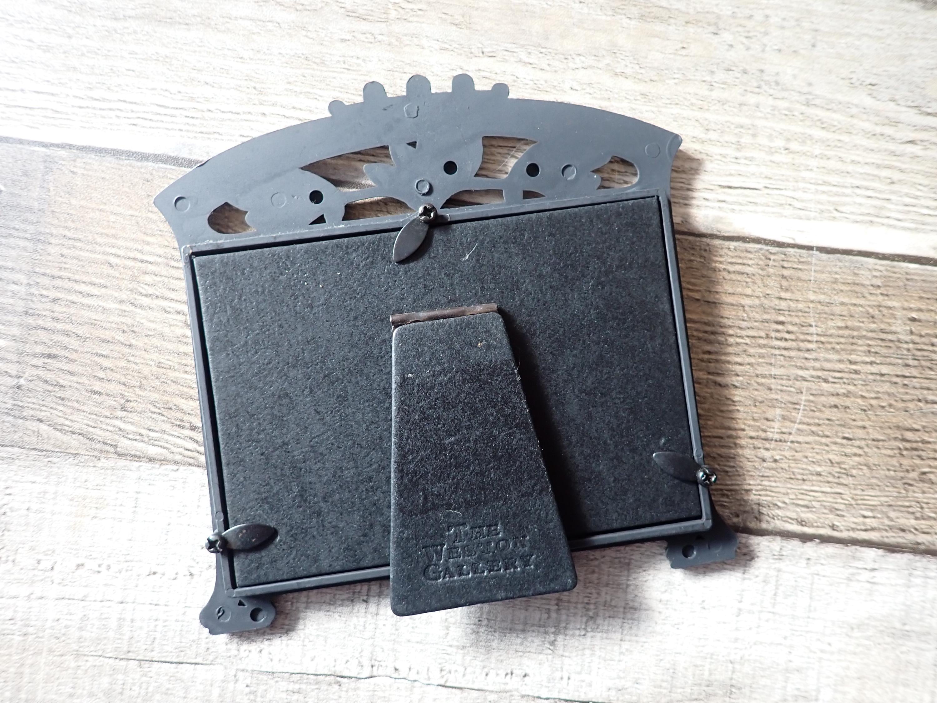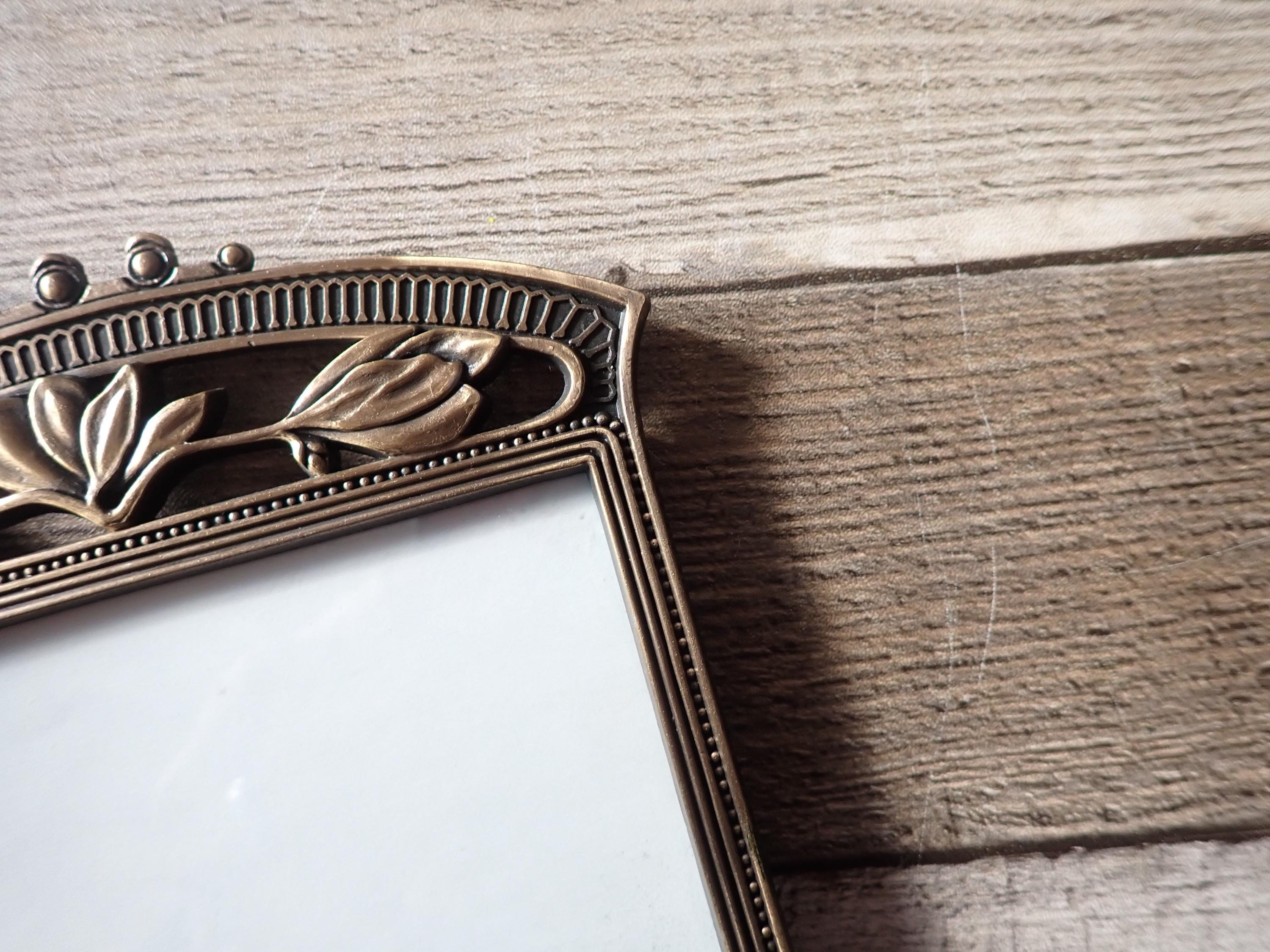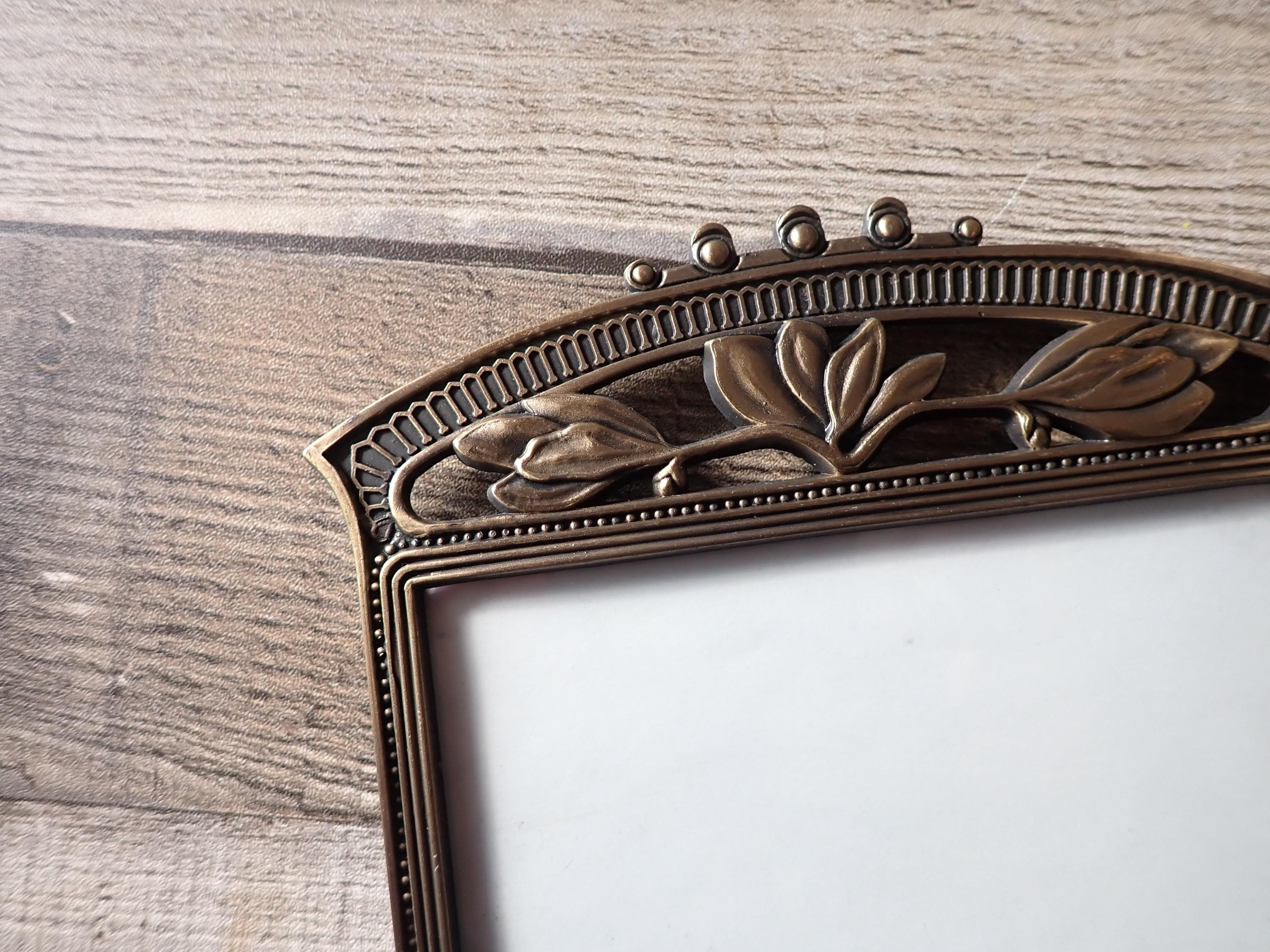 This bronze metal photo frame by The Weston Gallery is 5.75" tall by 6" wide and can hold one 3 1/2 x 5 photo horizontally. The frame is a bronze colored metal and has a ribbed design around the frame and is accented with a scroll and leaf design along the top of the frame. The frame has a clear glass insert over the photo opening, and a cardboard backing piece with a photo stand. The frame is in very good condition.