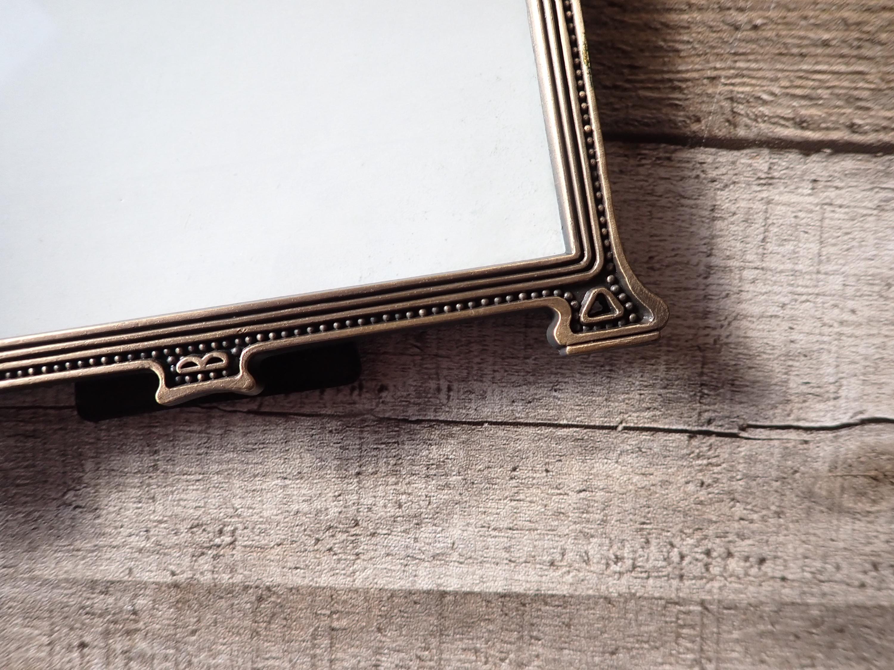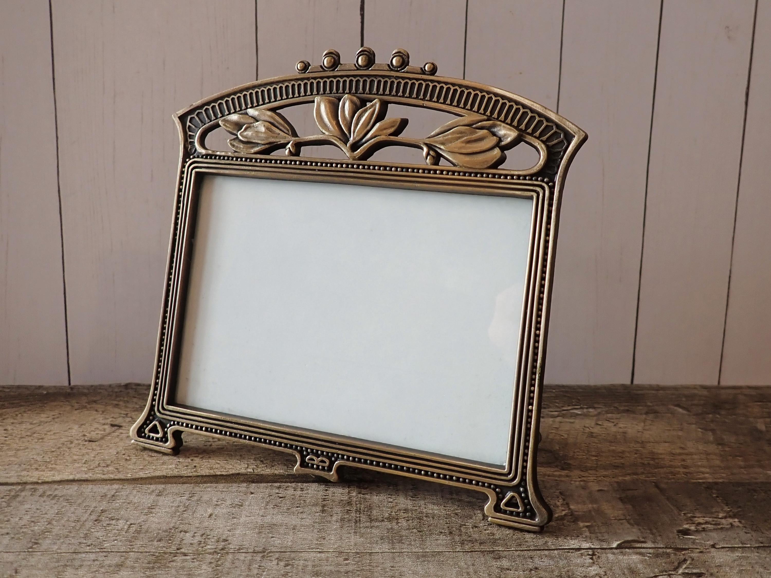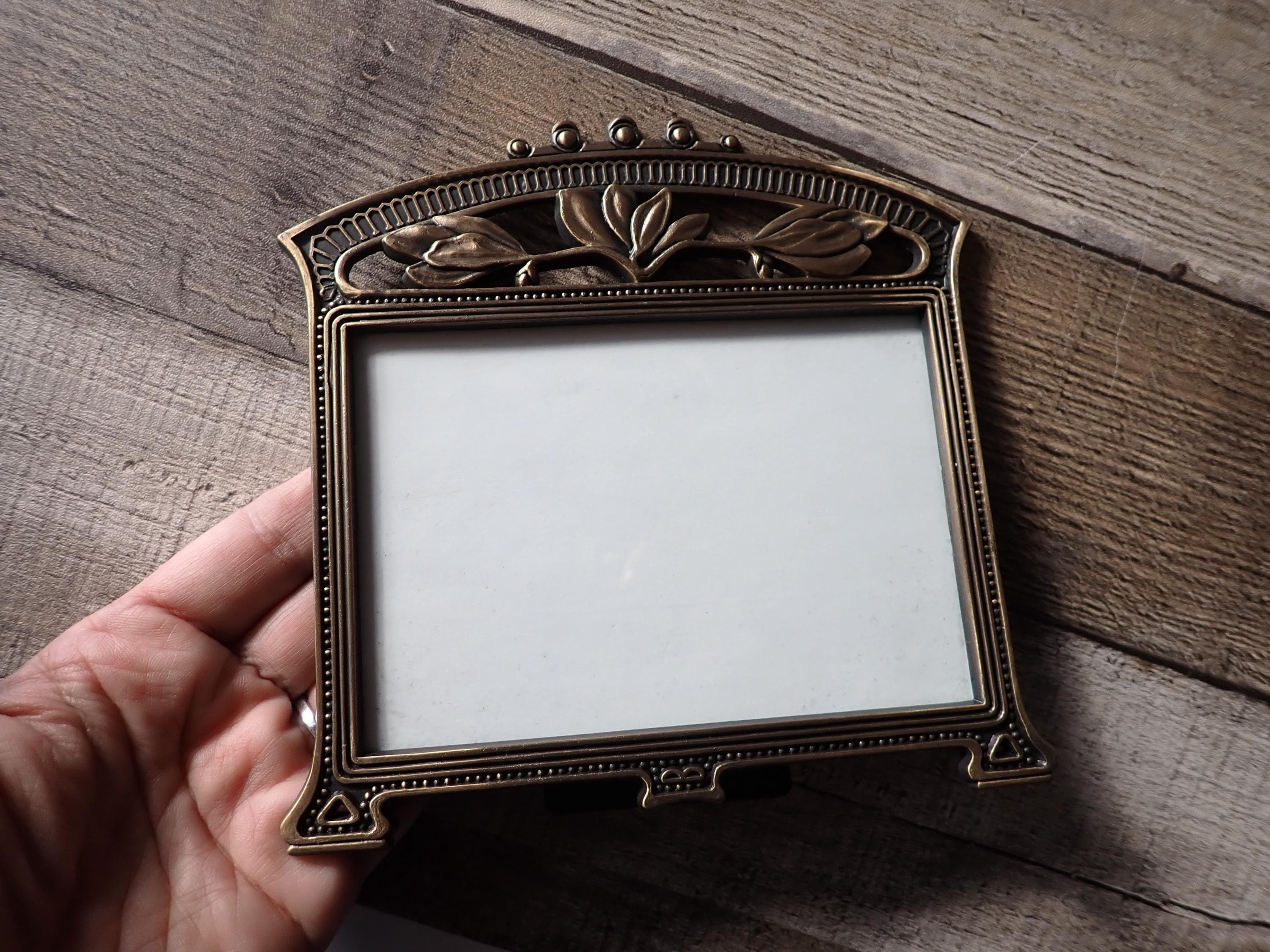 This bronze metal photo frame by The Weston Gallery is 5.75" tall by 6" wide and can hold one 3 1/2 x 5 photo horizontally. The frame is a bronze colored metal and has a ribbed design around the frame and is accented with a scroll and leaf design along the top of the frame. The frame has a clear glass insert over the photo opening, and a cardboard backing piece with a photo stand. The frame is in very good condition.