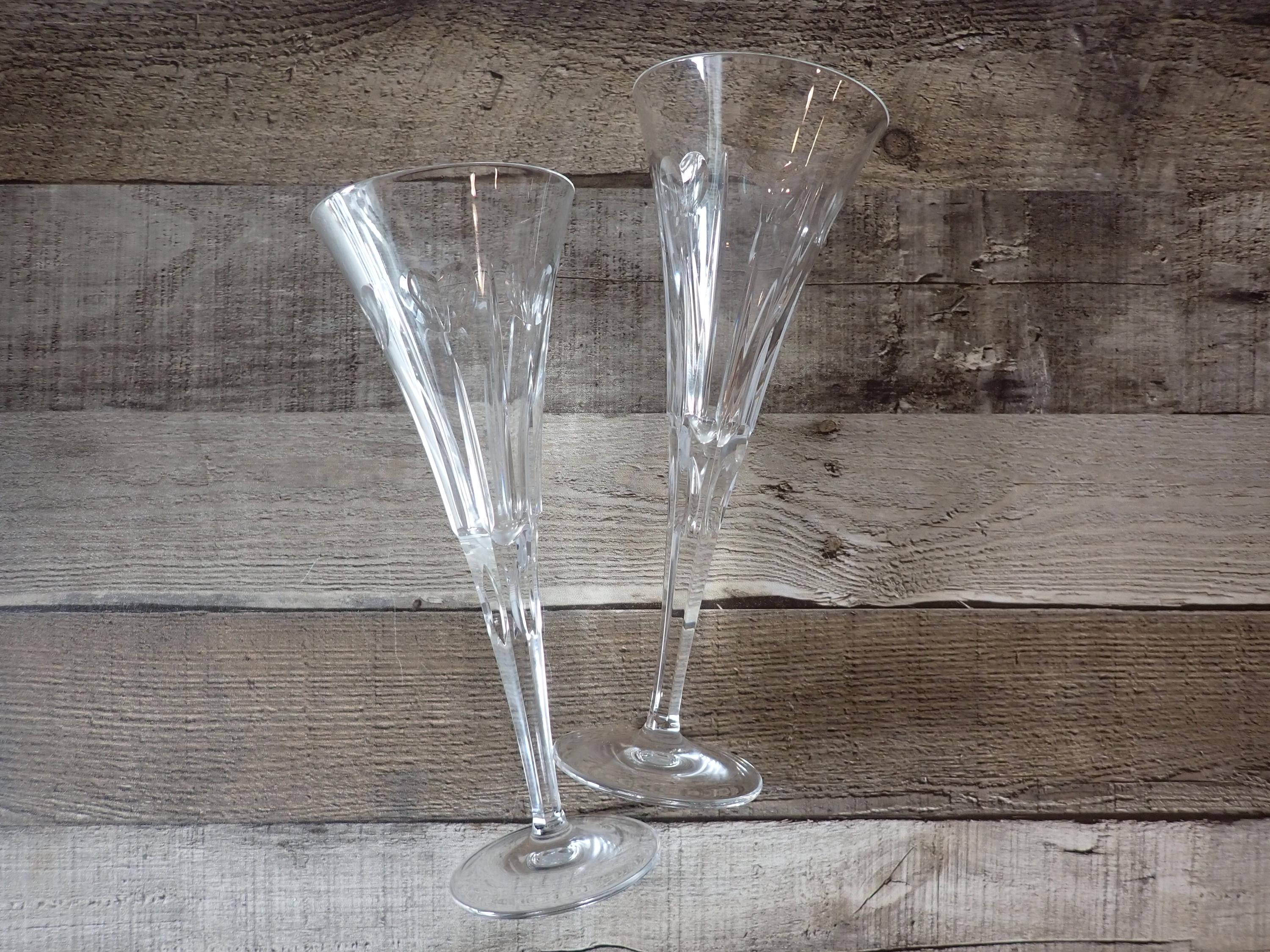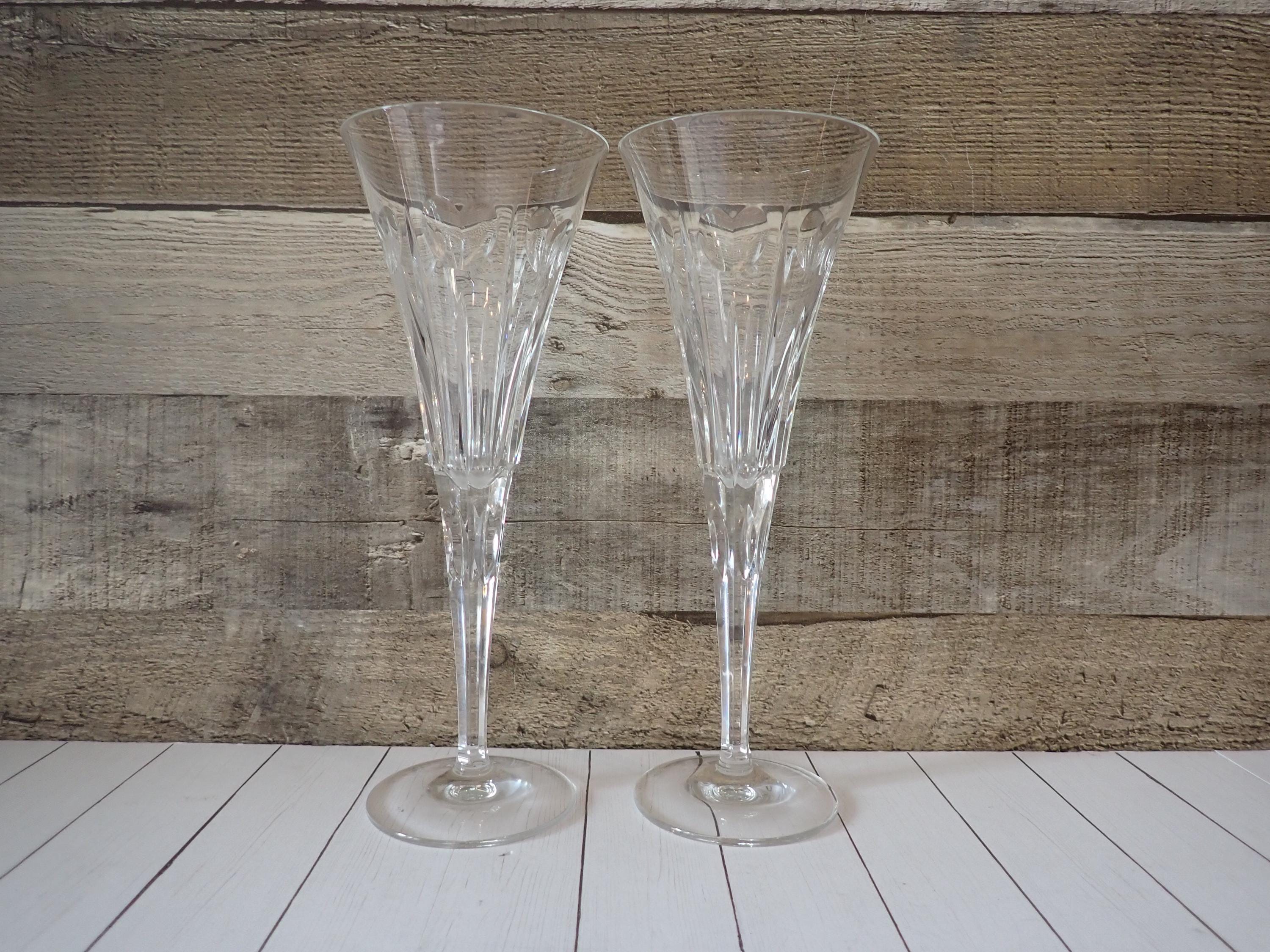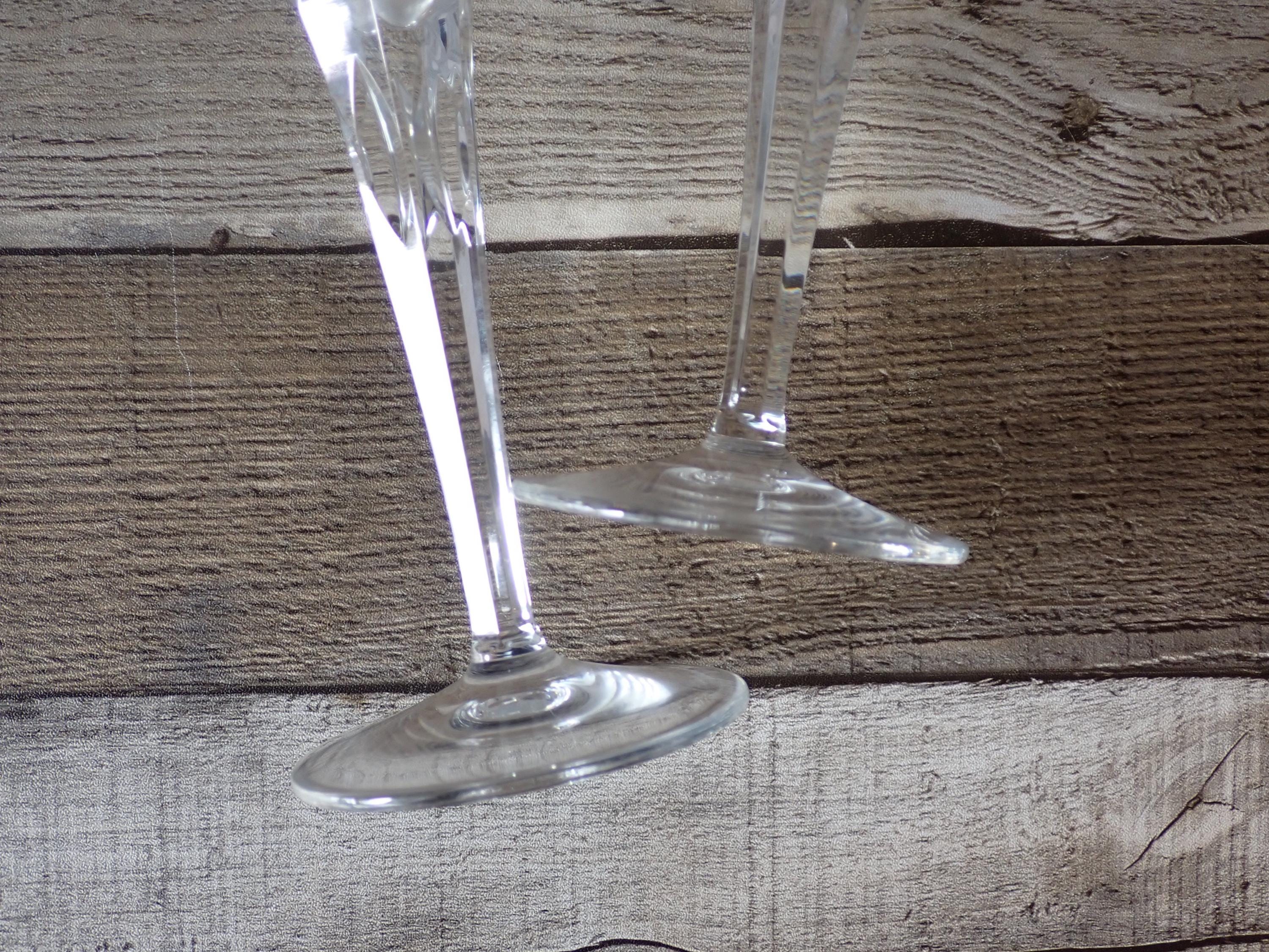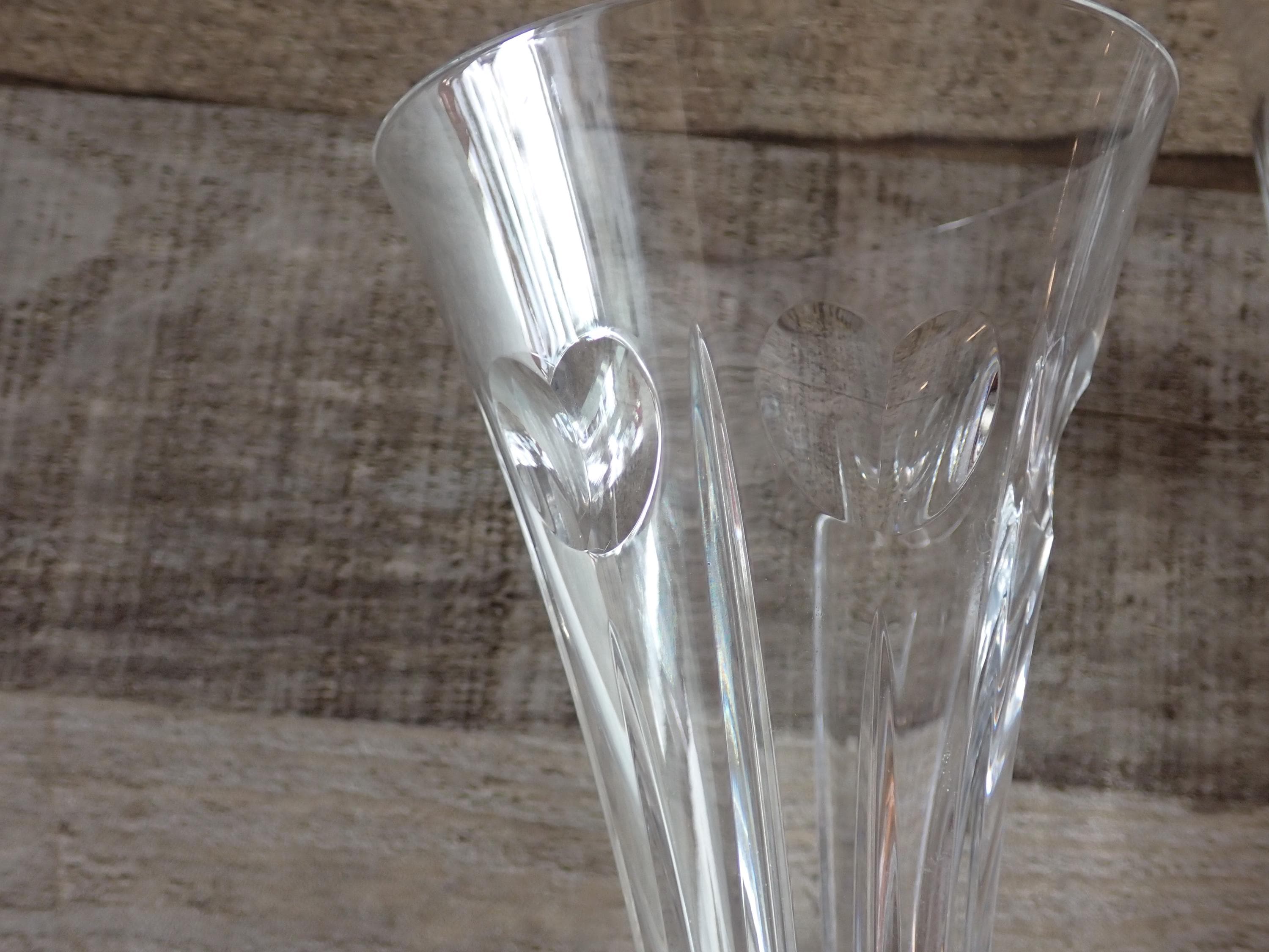 This set of goblets by Waterford are in the Millennium series and are the Love Fluted Champagne Glasses. They are each 9.25" tall and 3.5" in diameter at the rim. They are a clear glass with an impressed heart design that repeats around the top of the glass. They have a fluted stem and round base. The glasses are both marked Waterford. Both goblets are in very nice condition, however one goblet does have a very small nick in the rim - this is shown in detail in the last photo.