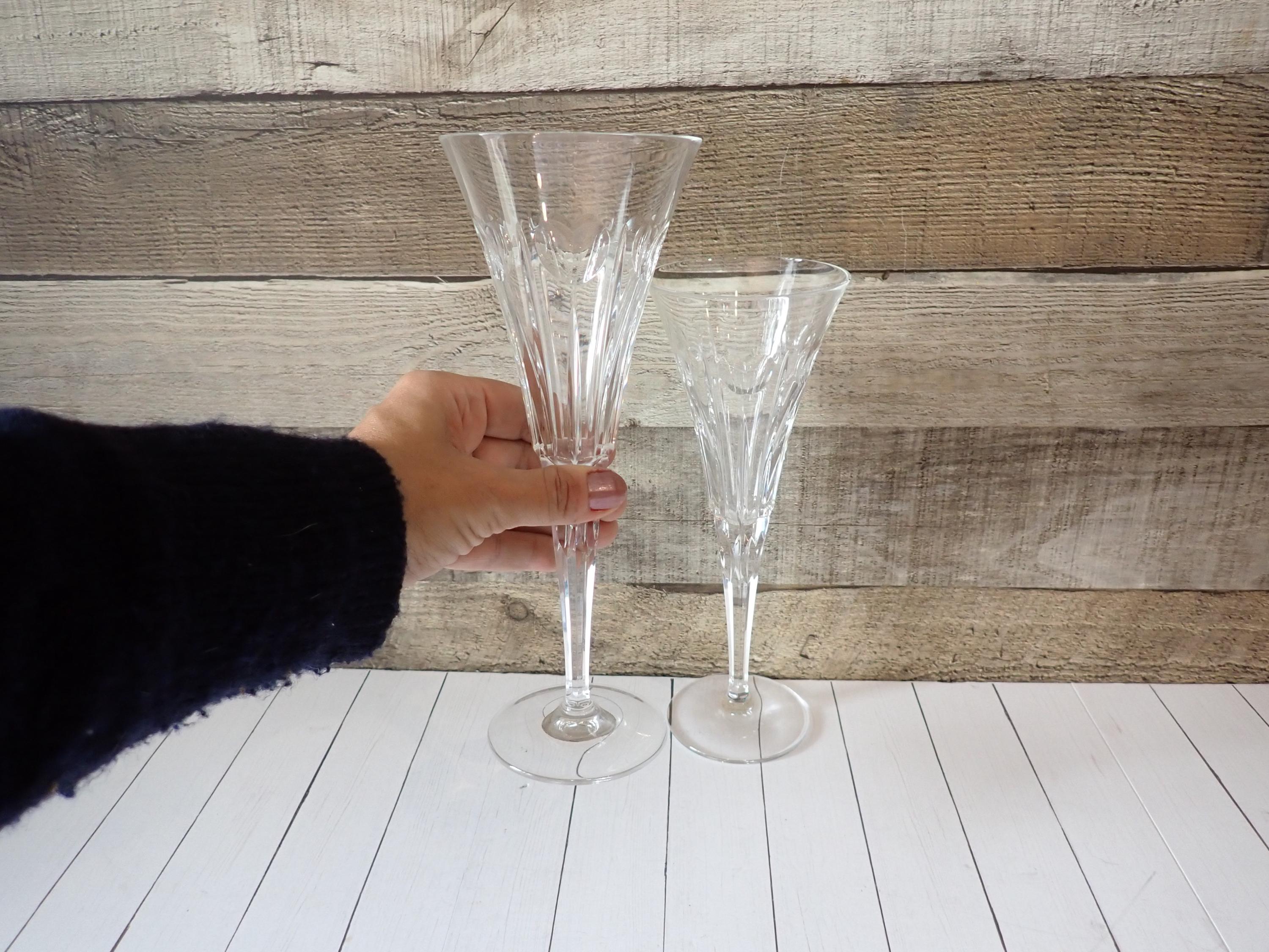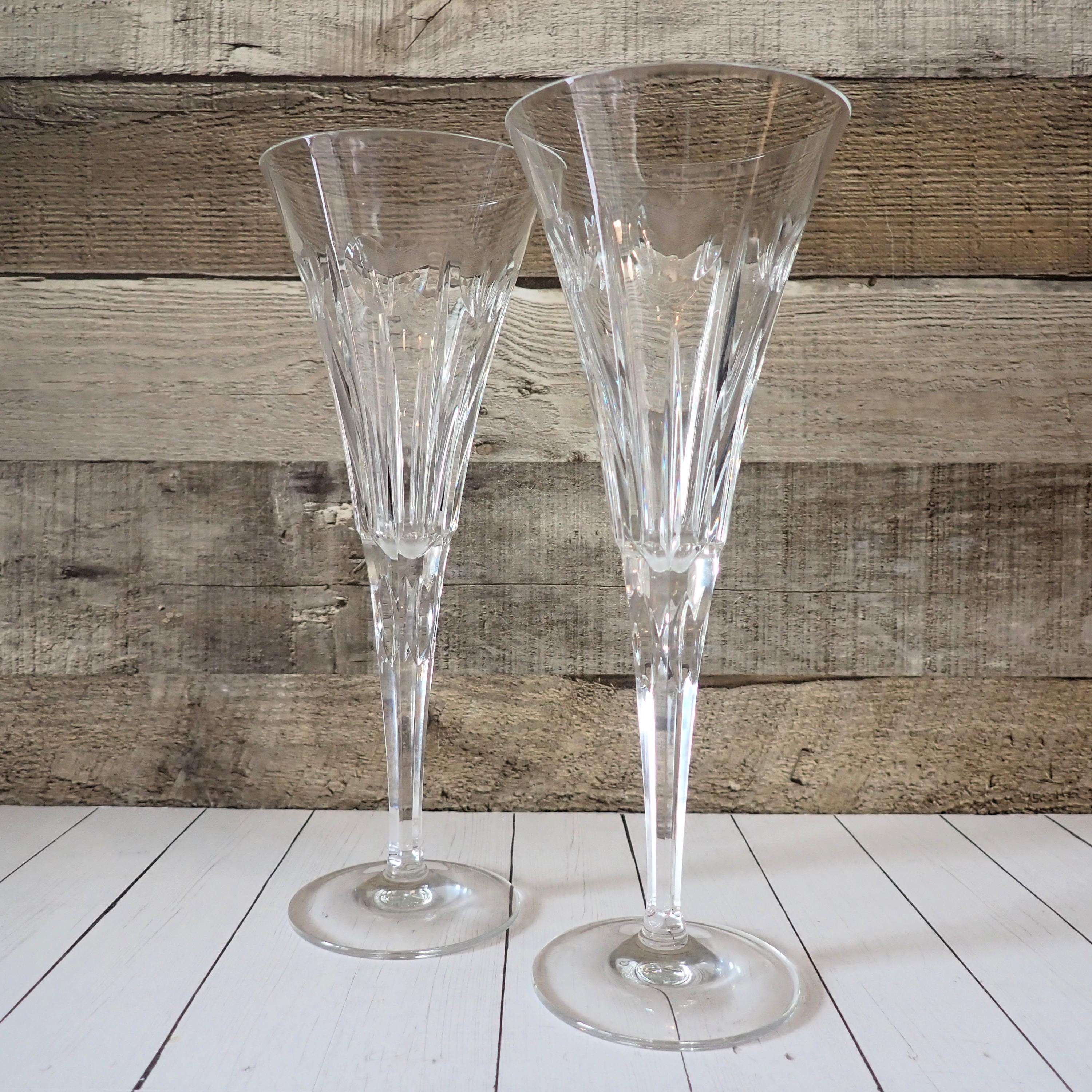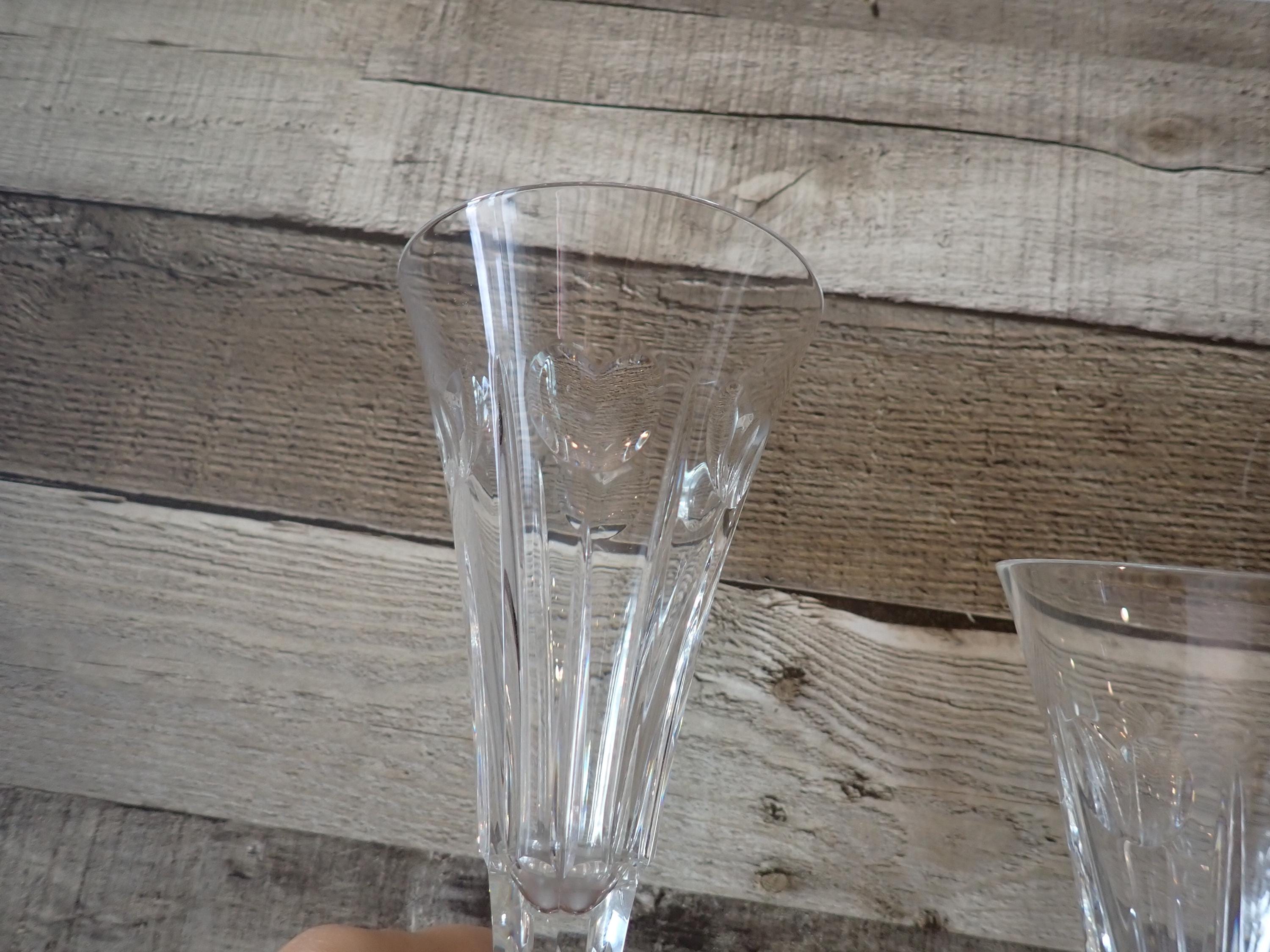 This set of goblets by Waterford are in the Millennium series and are the Love Fluted Champagne Glasses. They are each 9.25" tall and 3.5" in diameter at the rim. They are a clear glass with an impressed heart design that repeats around the top of the glass. They have a fluted stem and round base. The glasses are both marked Waterford. Both goblets are in very nice condition, however one goblet does have a very small nick in the rim - this is shown in detail in the last photo.
