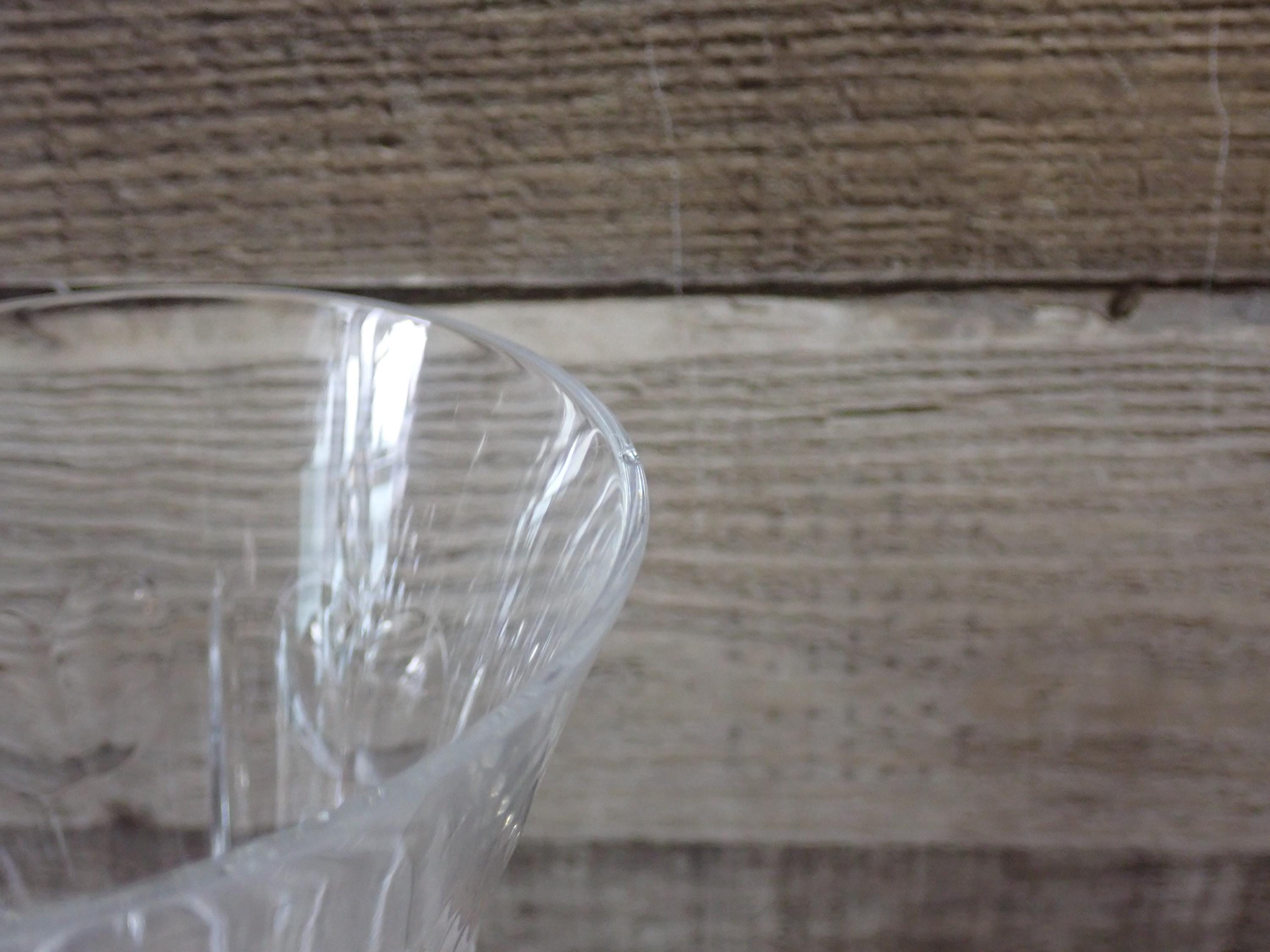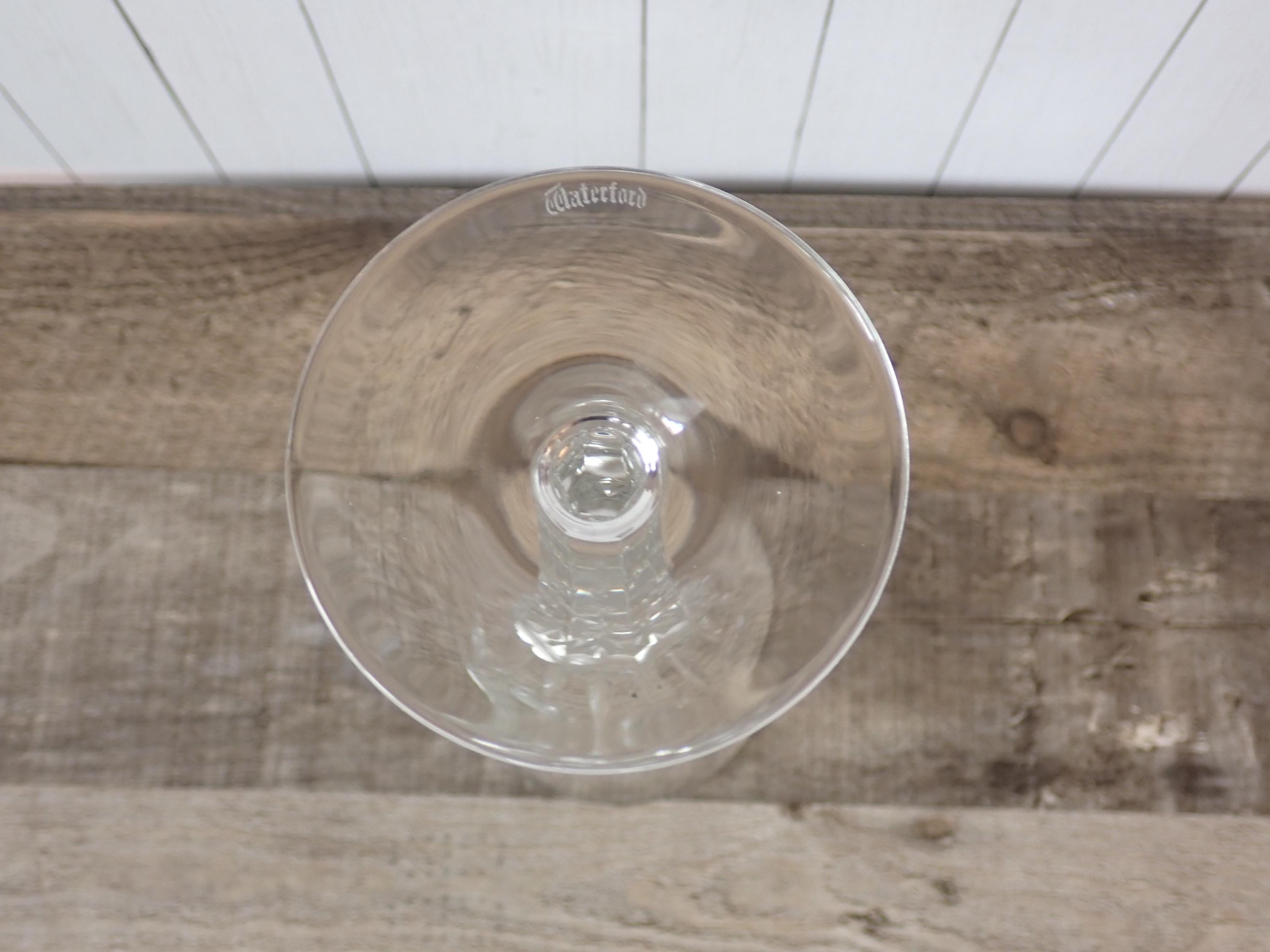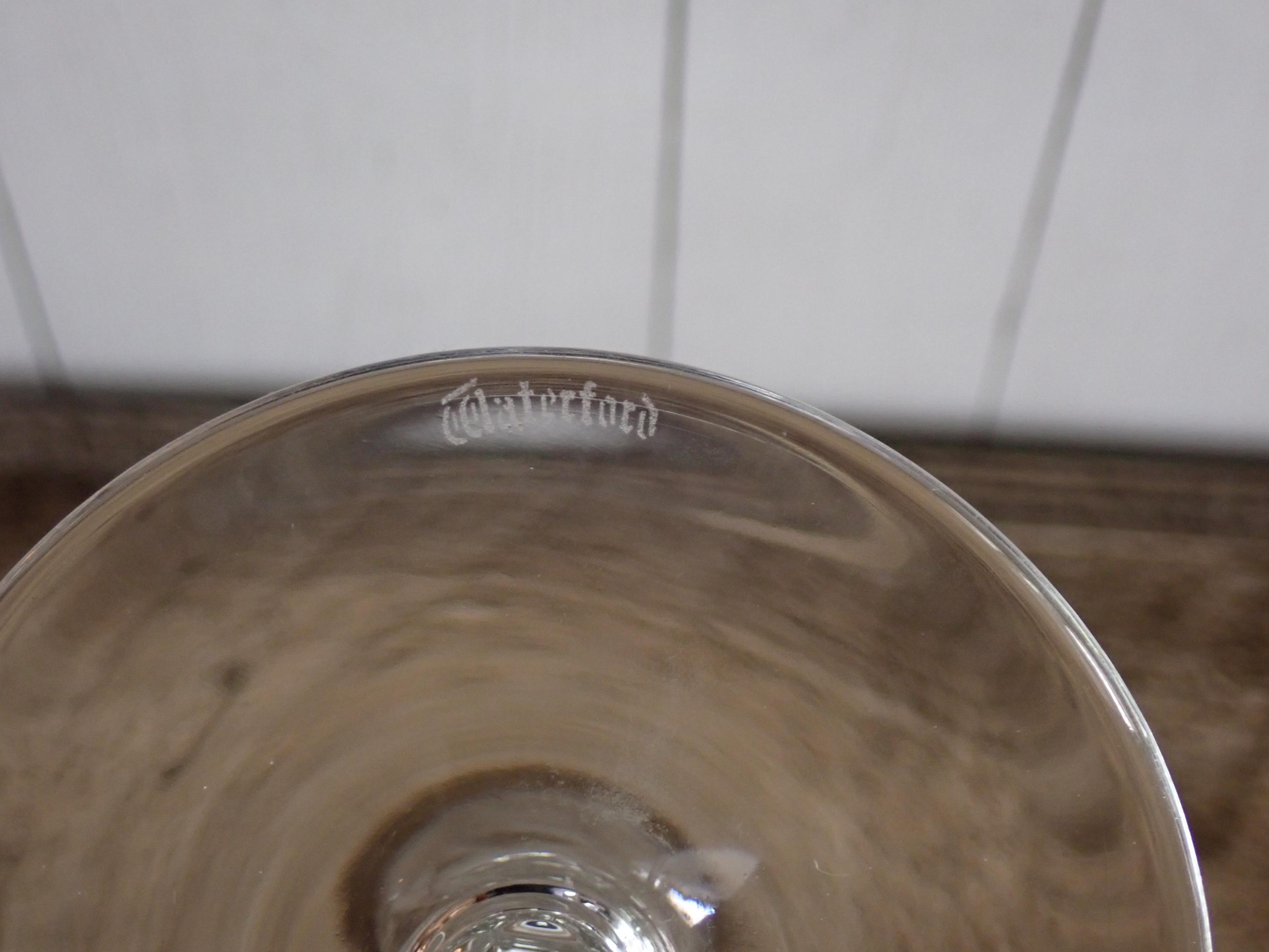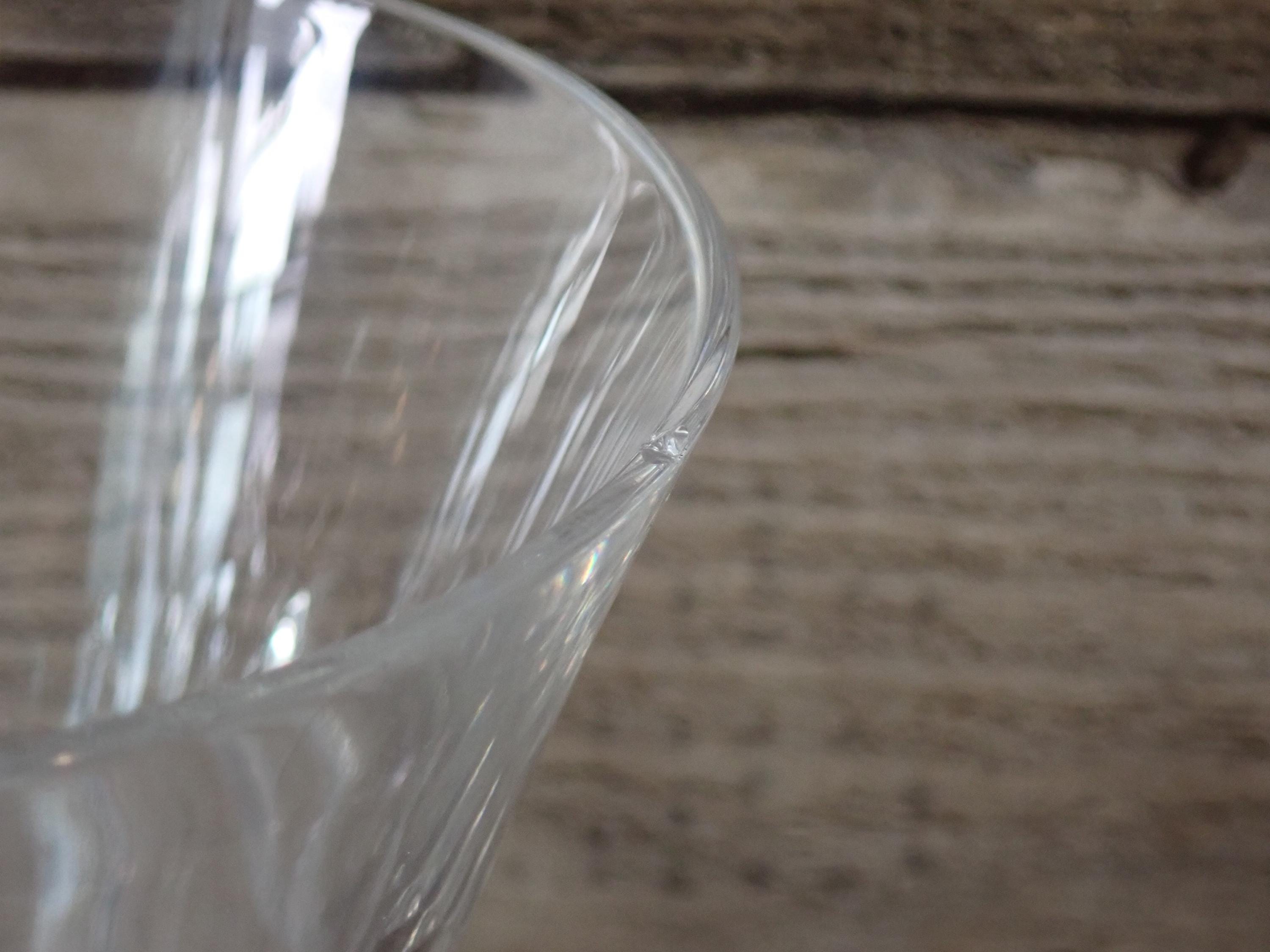 This set of goblets by Waterford are in the Millennium series and are the Love Fluted Champagne Glasses. They are each 9.25" tall and 3.5" in diameter at the rim. They are a clear glass with an impressed heart design that repeats around the top of the glass. They have a fluted stem and round base. The glasses are both marked Waterford. Both goblets are in very nice condition, however one goblet does have a very small nick in the rim - this is shown in detail in the last photo.