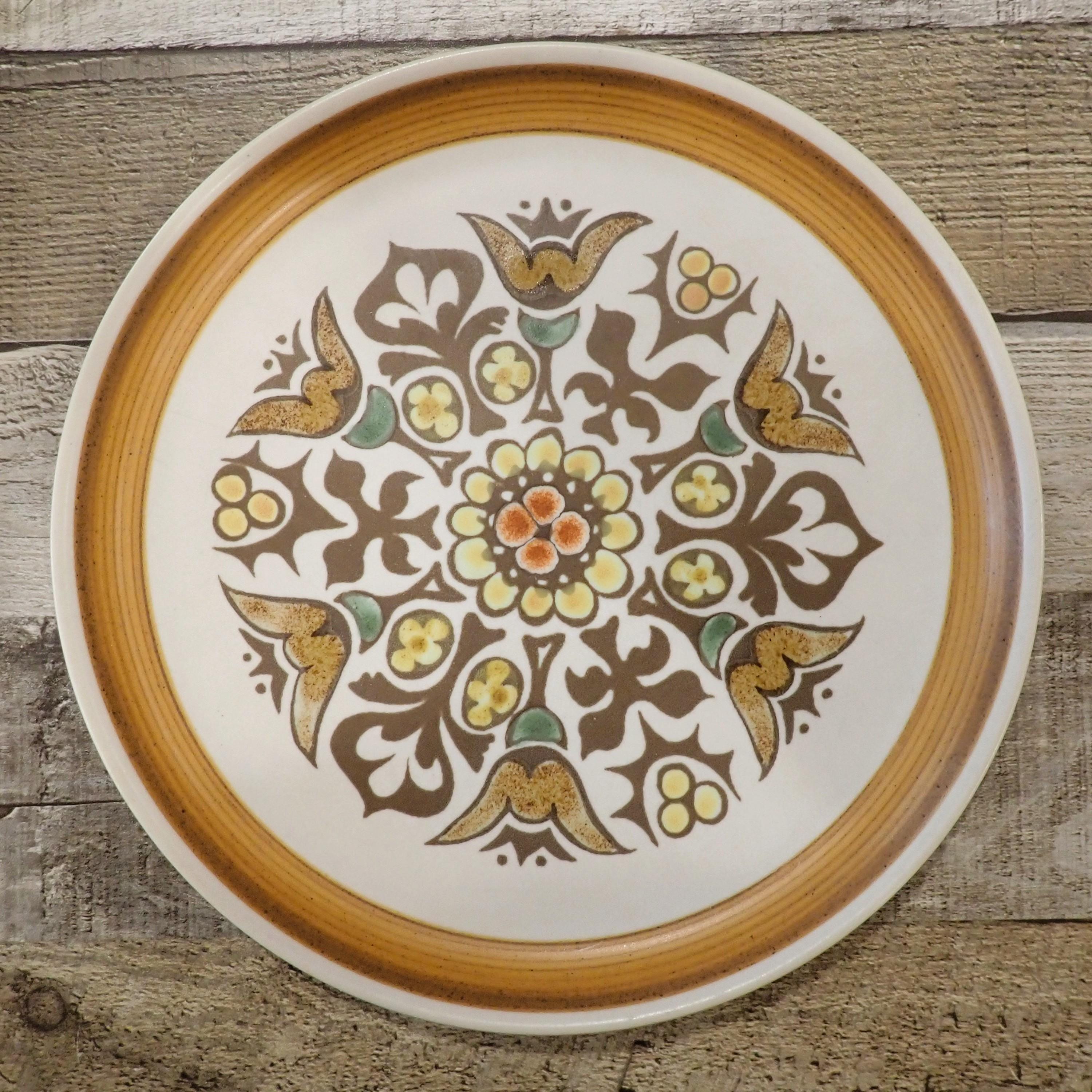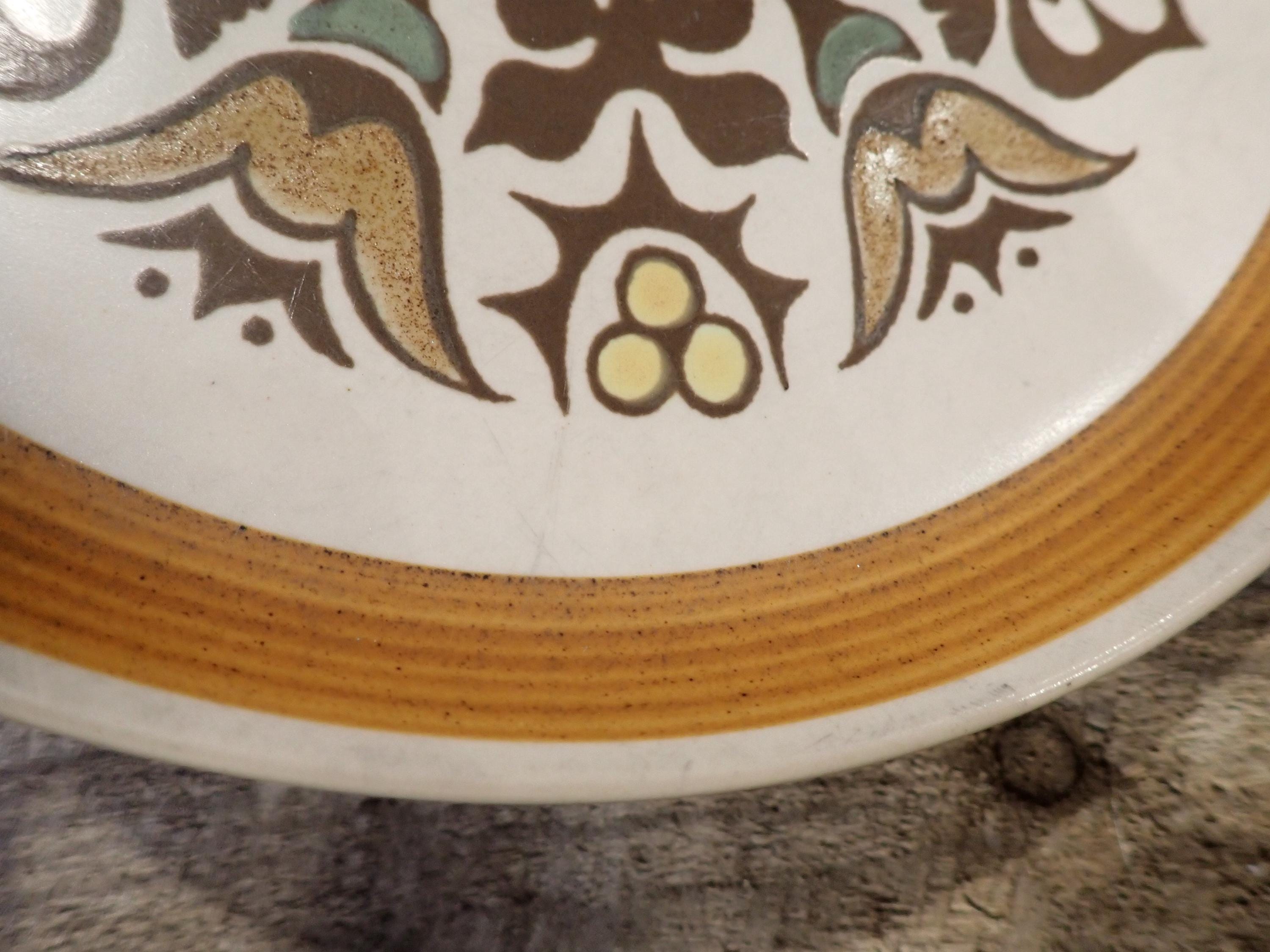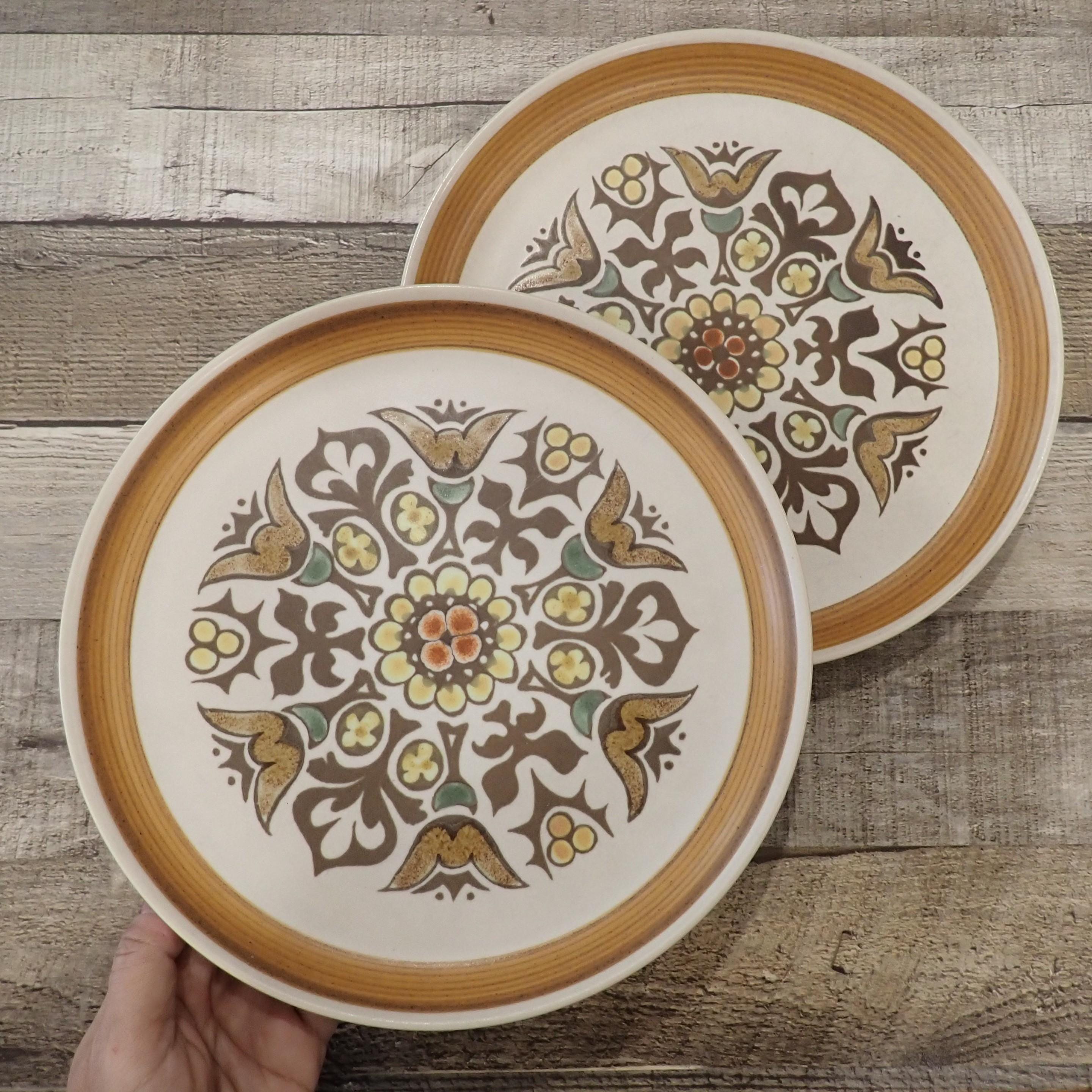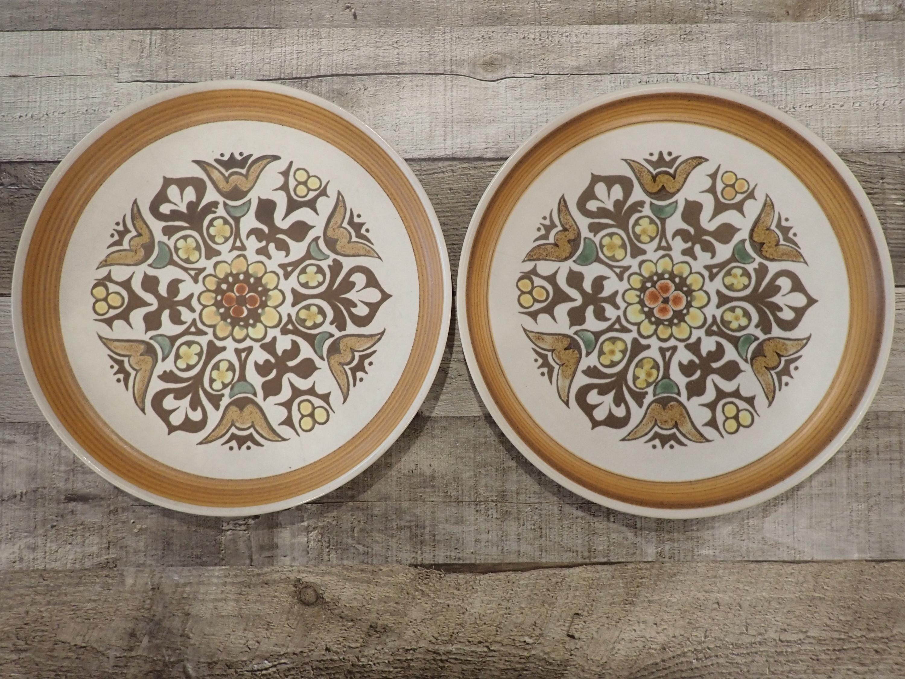 This set of 2 plates by Denby are in the Canterbury pattern and are the 10" dinner plates. They are a white, brown and green stoneware plate with a floral medallion design in the center of the plate. They are accented by a ribbed band around the rim. The bottoms are marked with a Langley/Denby logo. Both plates are in very good condition with no chips or cracks, however there are some surface scratches from use - this is more noticeable on one of the plates more than the other.