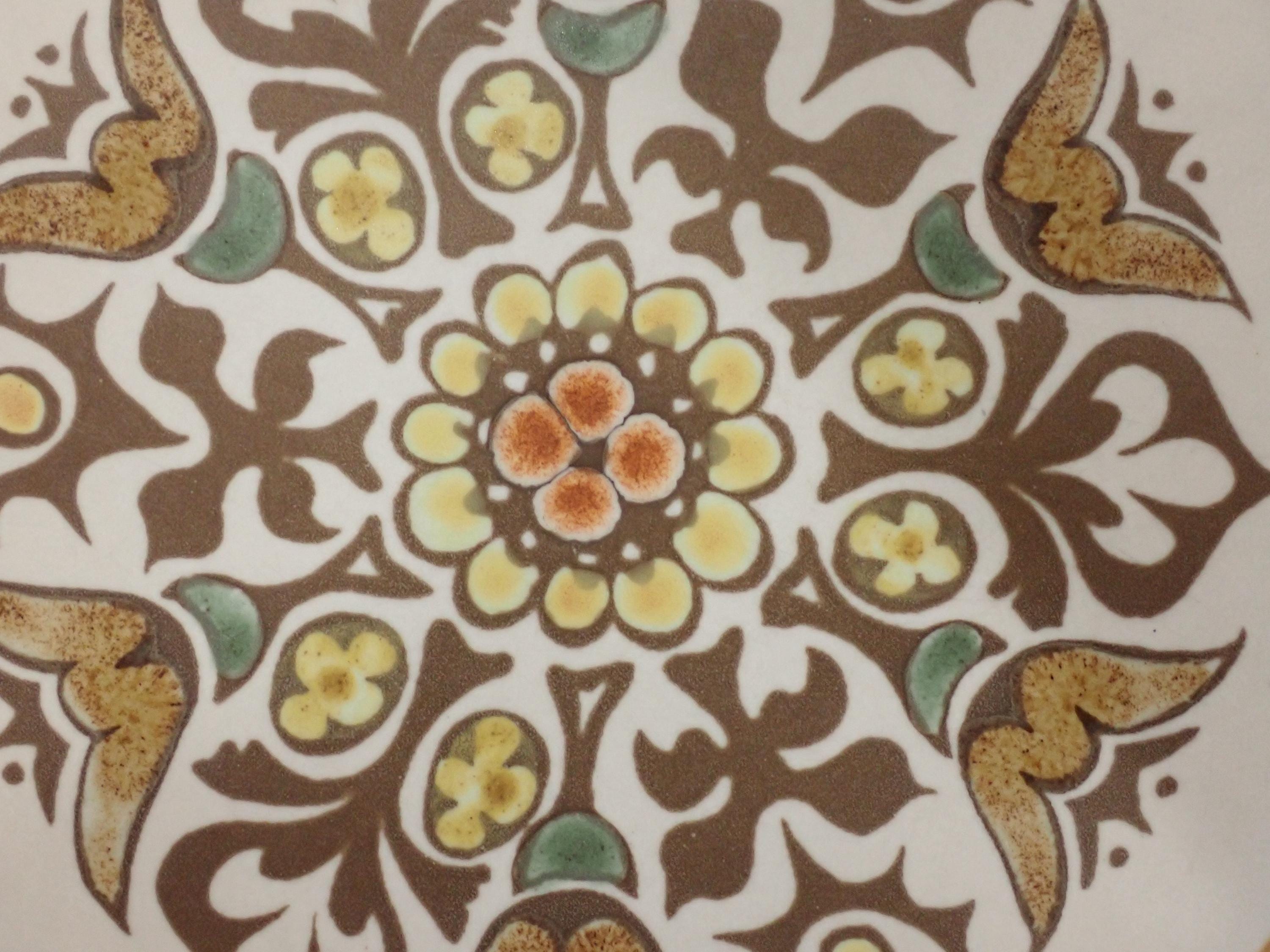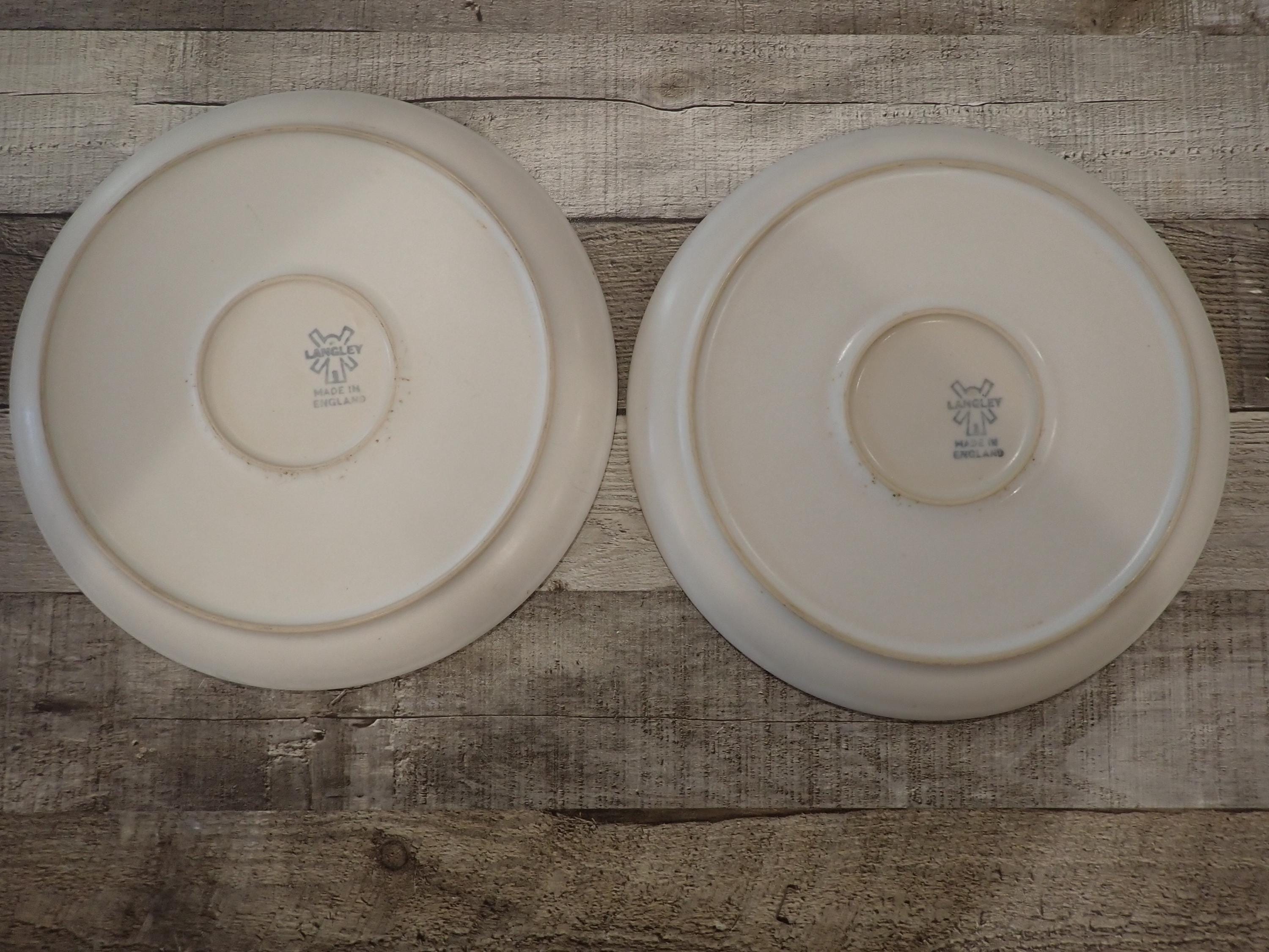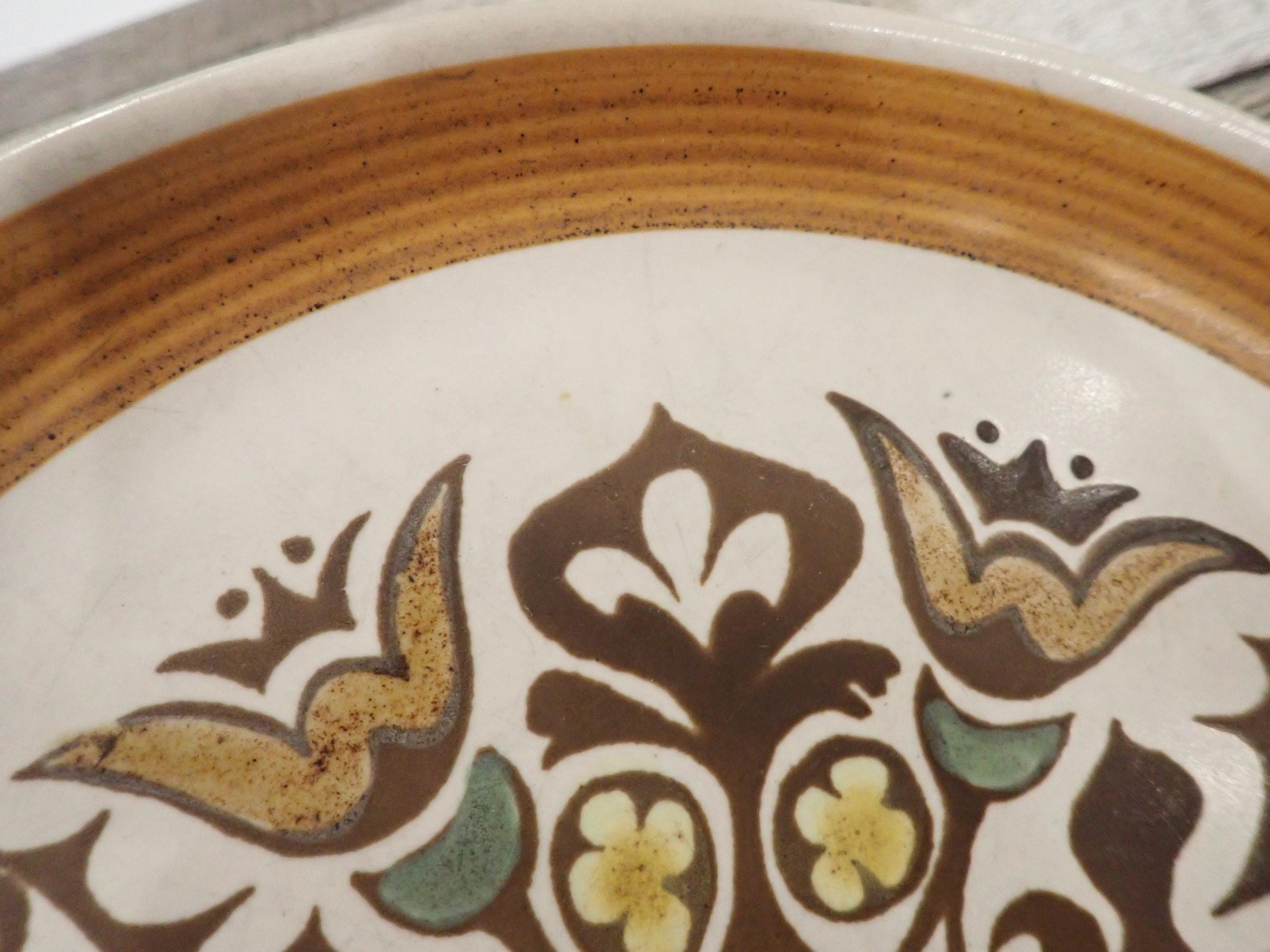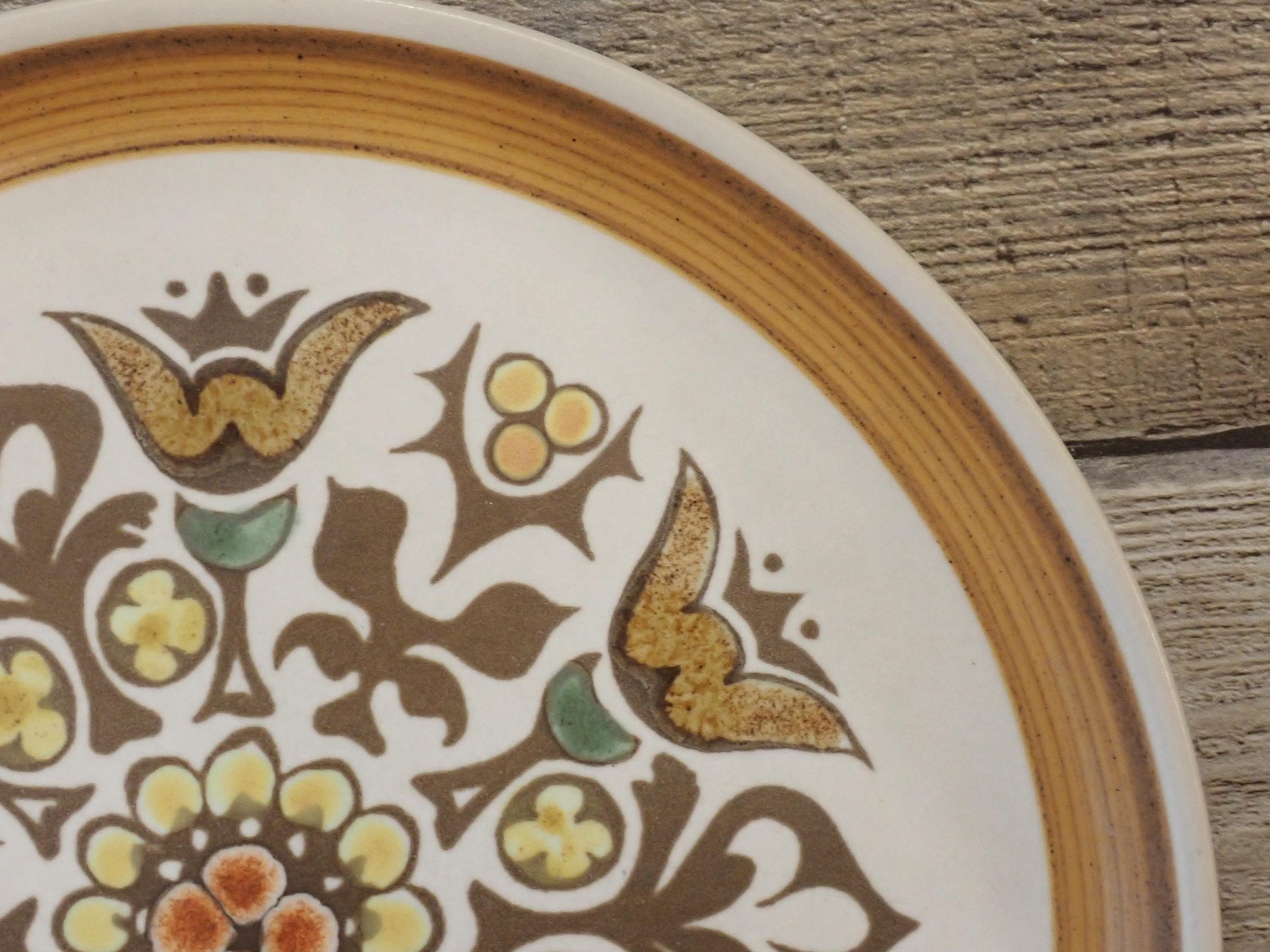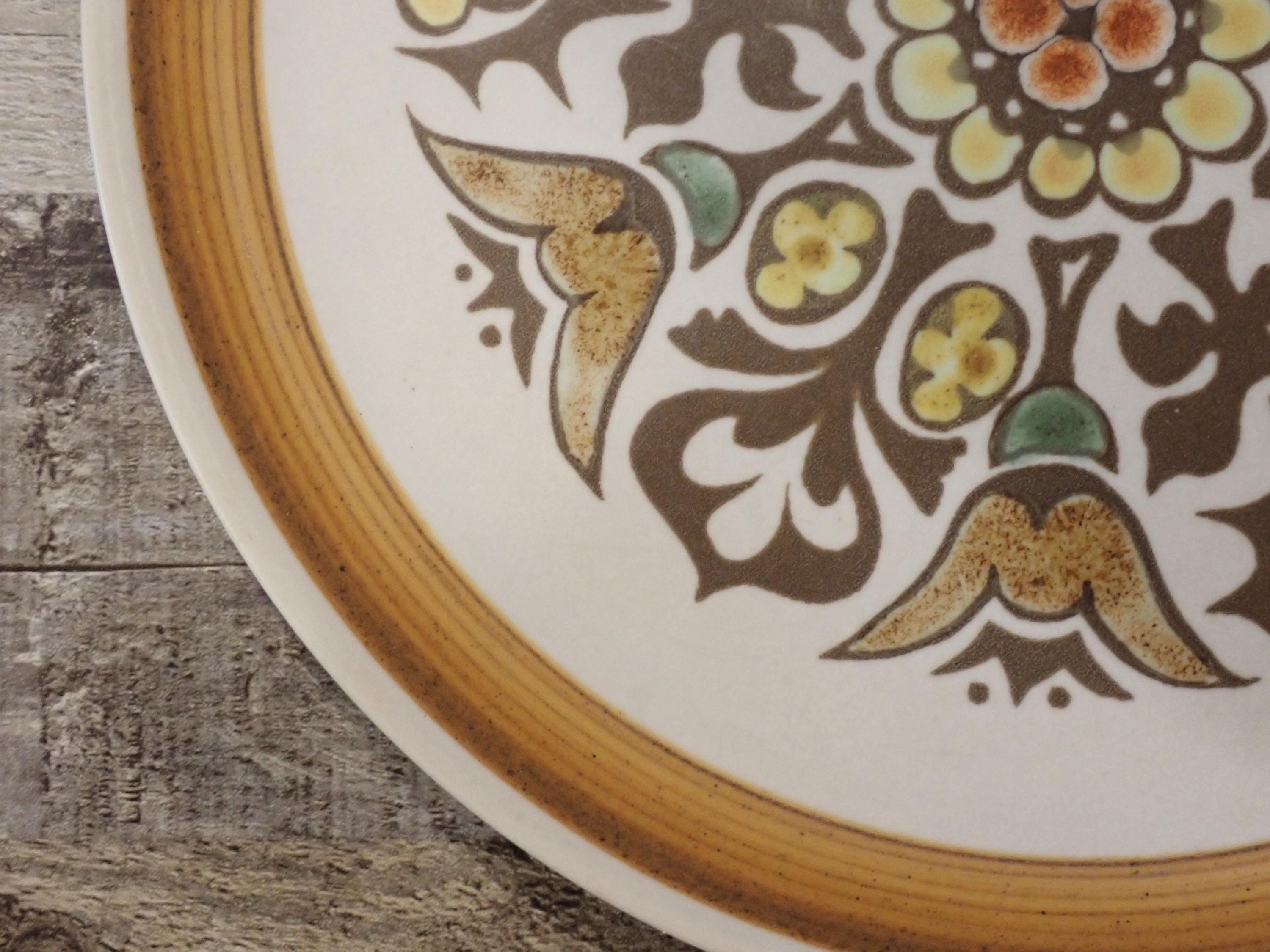 This set of 2 plates by Denby are in the Canterbury pattern and are the 10" dinner plates. They are a white, brown and green stoneware plate with a floral medallion design in the center of the plate. They are accented by a ribbed band around the rim. The bottoms are marked with a Langley/Denby logo. Both plates are in very good condition with no chips or cracks, however there are some surface scratches from use - this is more noticeable on one of the plates more than the other.