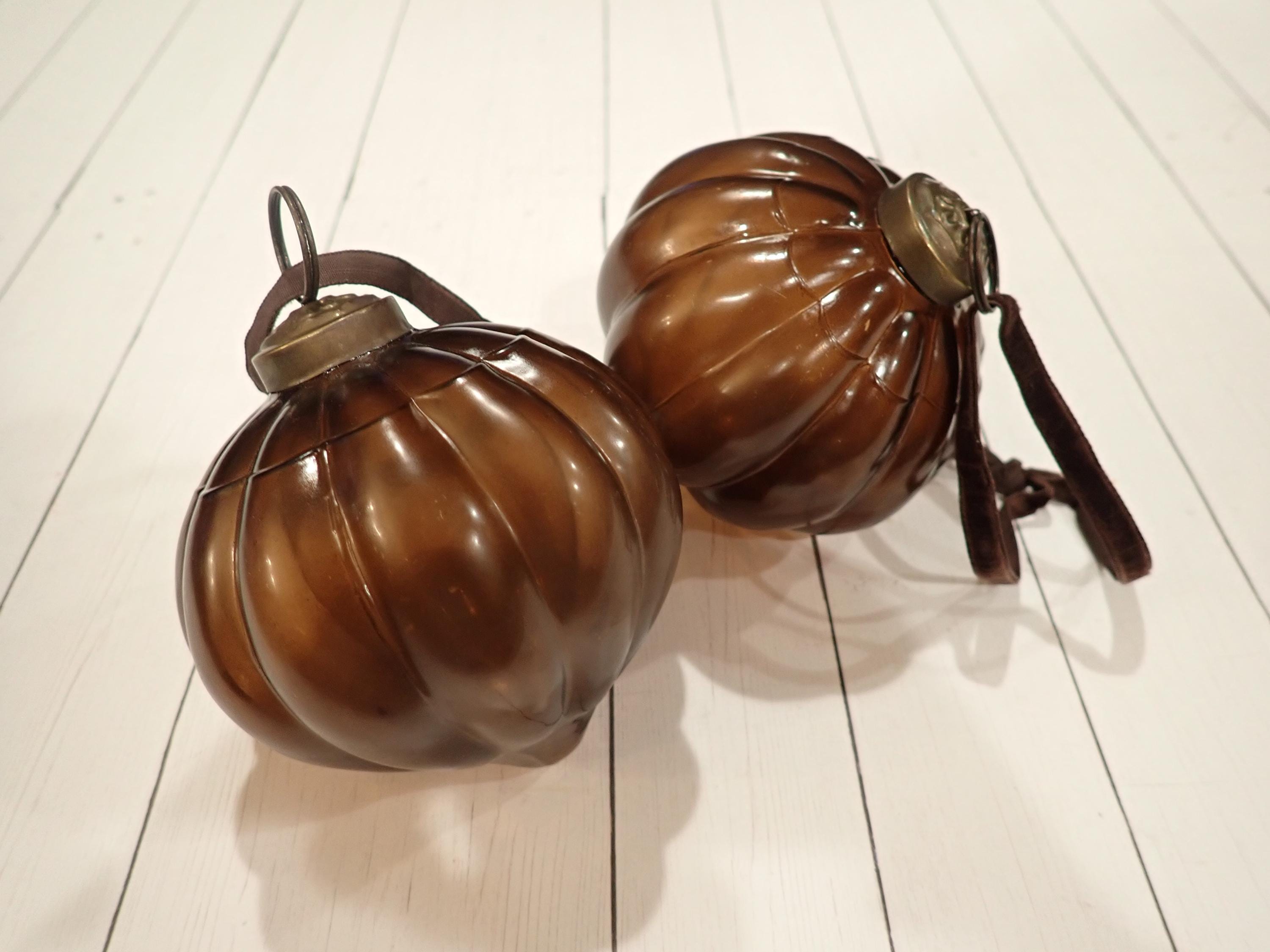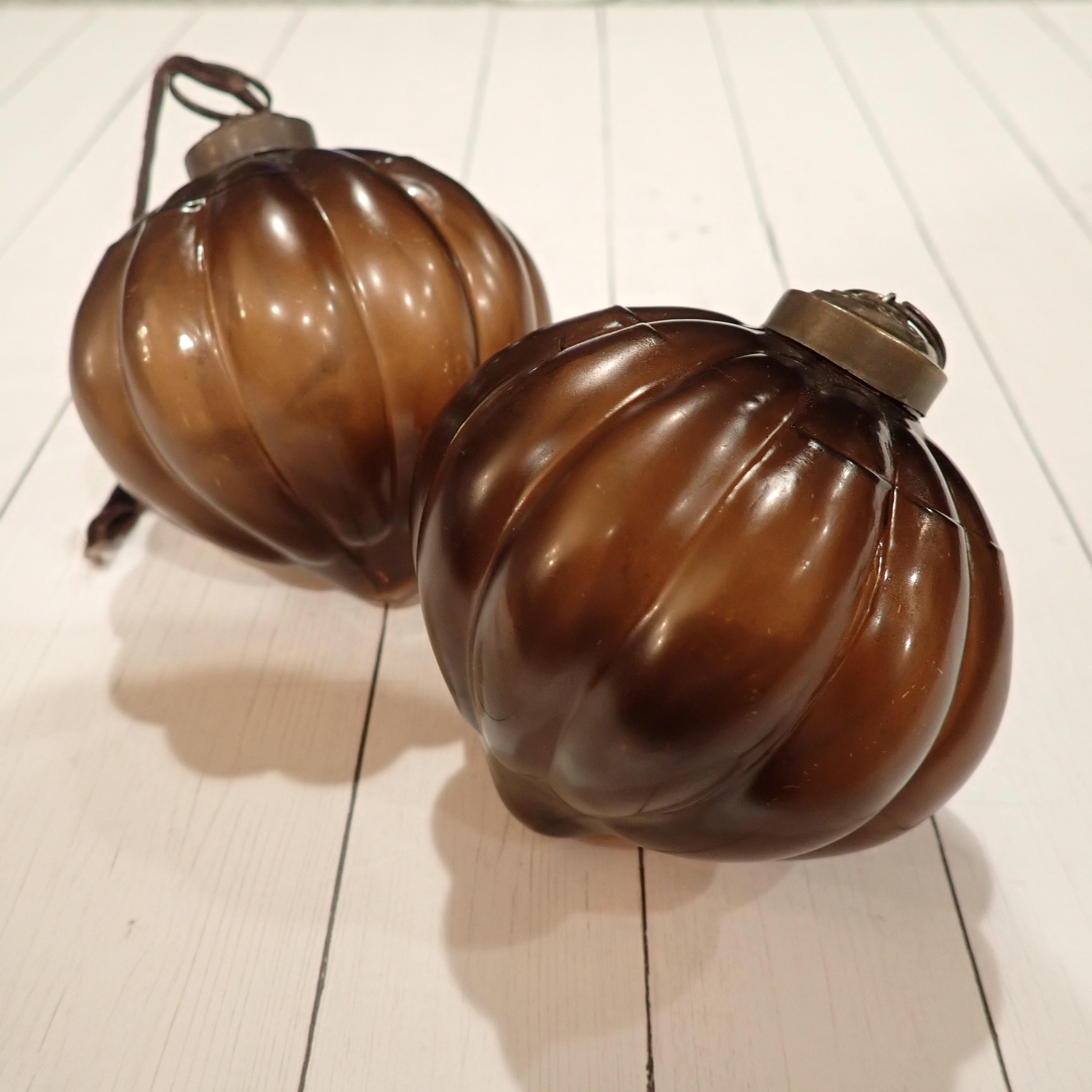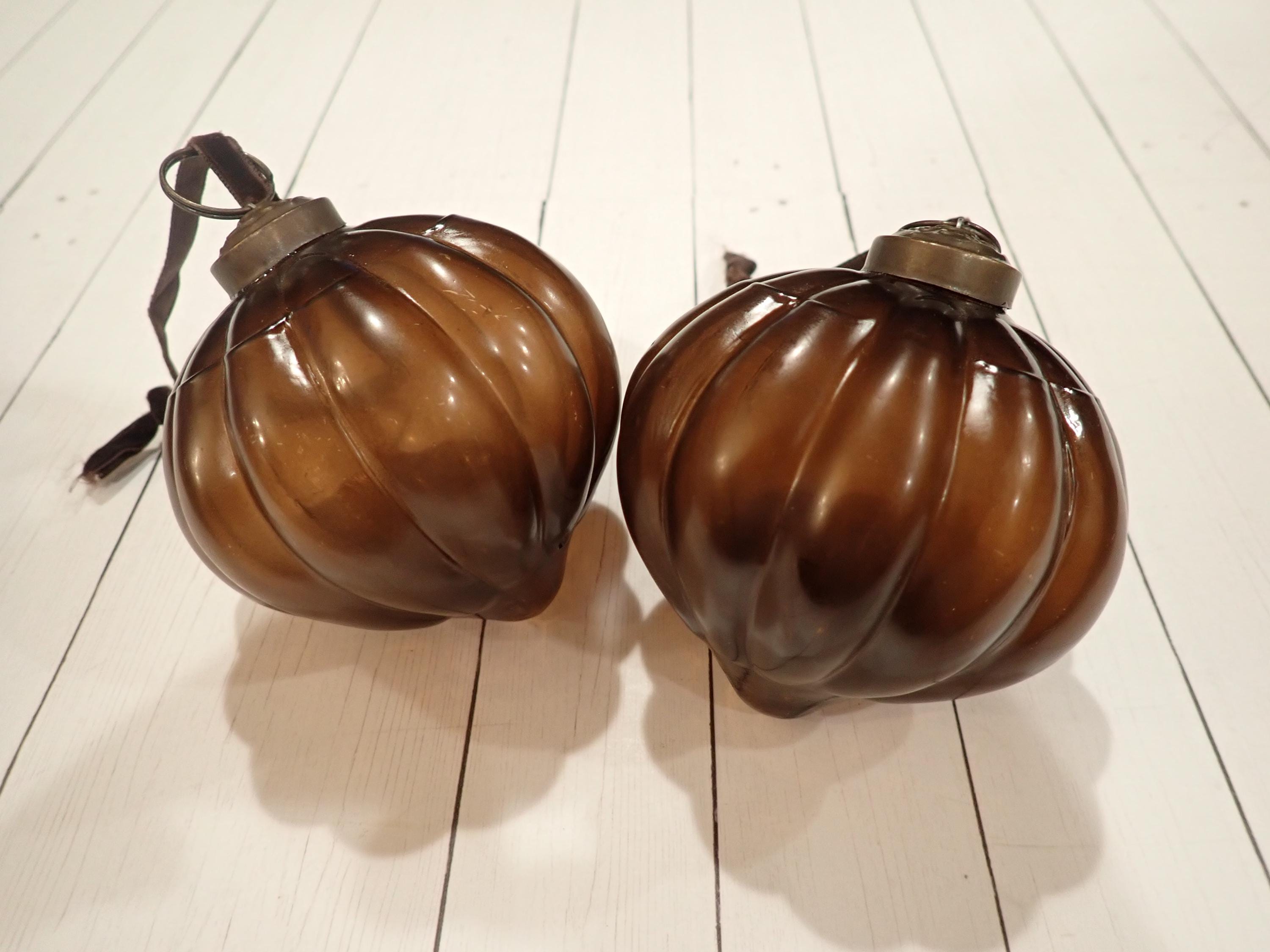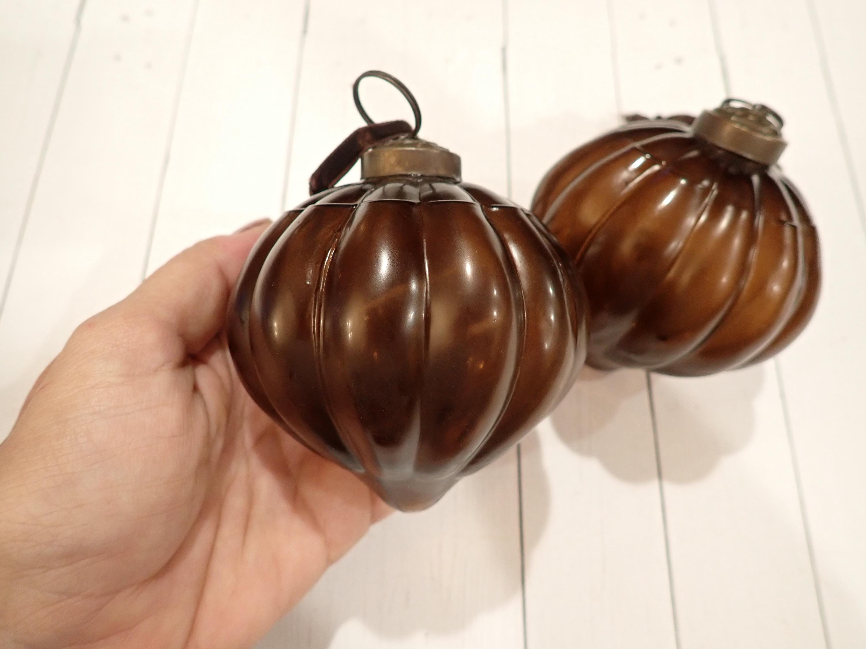 This set of glass ornaments includes 2 matching brown glass Kugel style ornament. These are medium sized ornaments, measuring 3.5" long and 3.5" in diameter. They are a brown glass and have a brown metal cap and loop hanger, as well as a brown cord to hang or tie on to your tree or decor. Both ornaments are in very good condition with no chips or cracks, there are some light scratches here and there. Lovely set of kugel style ornaments!