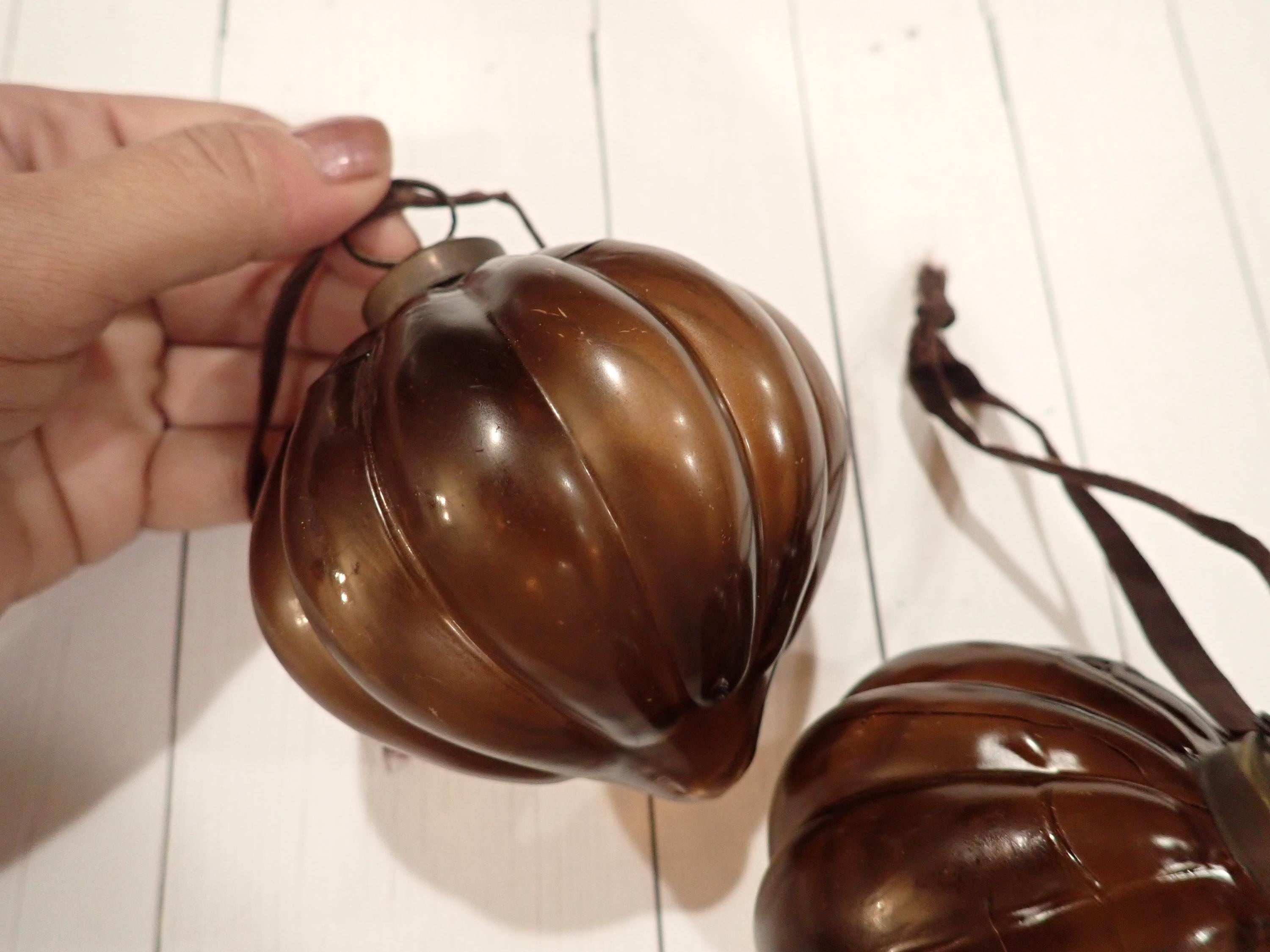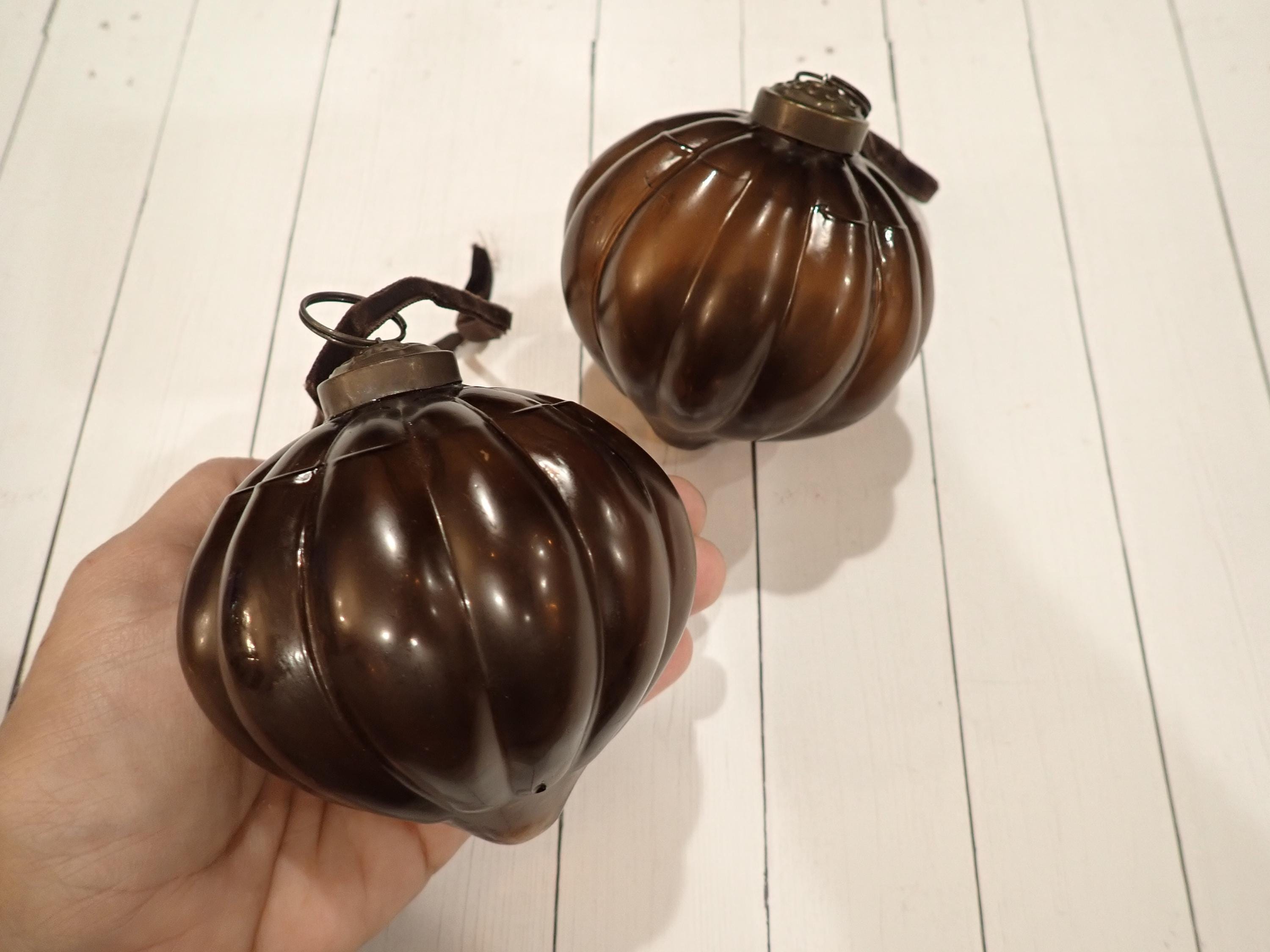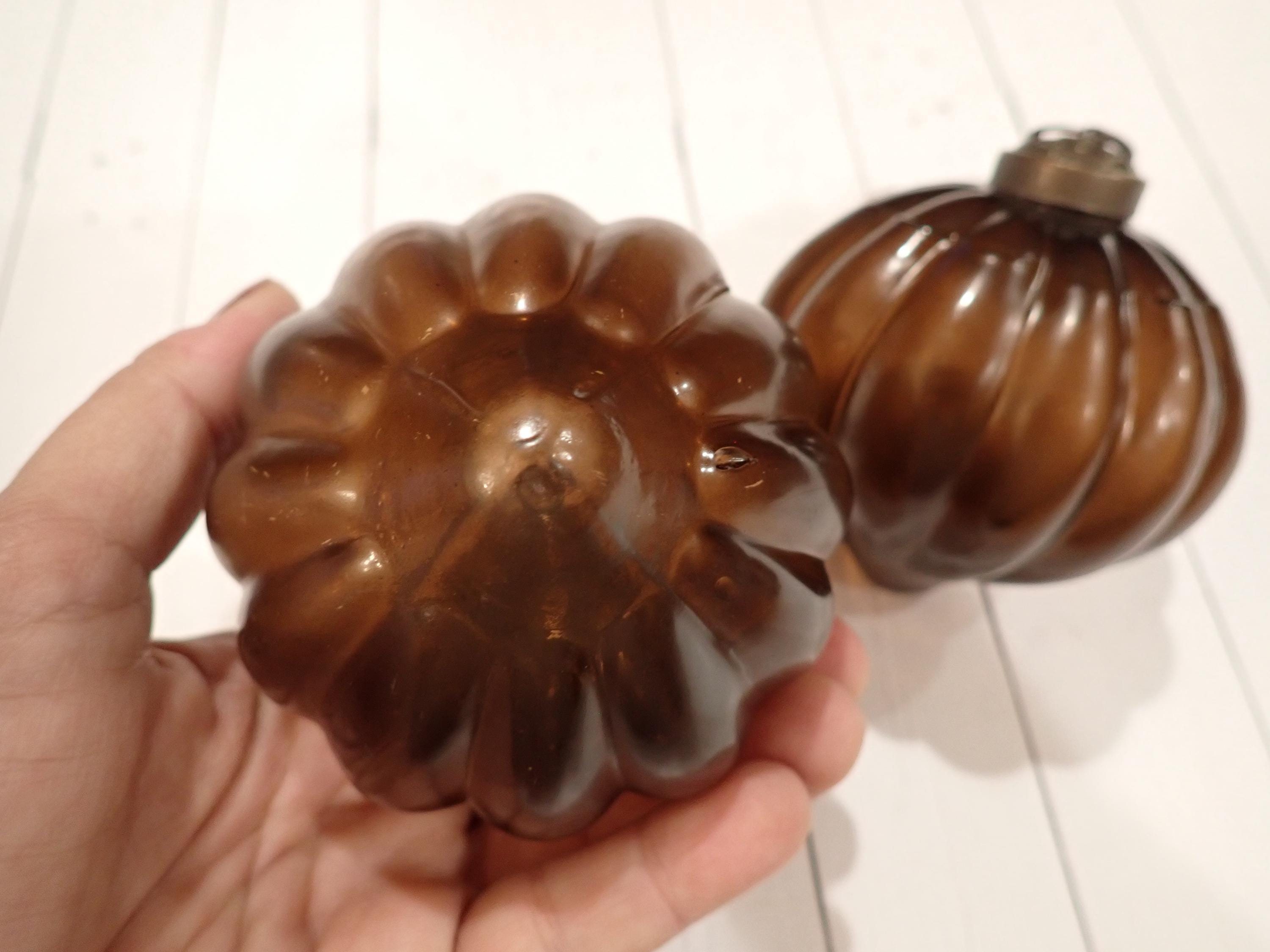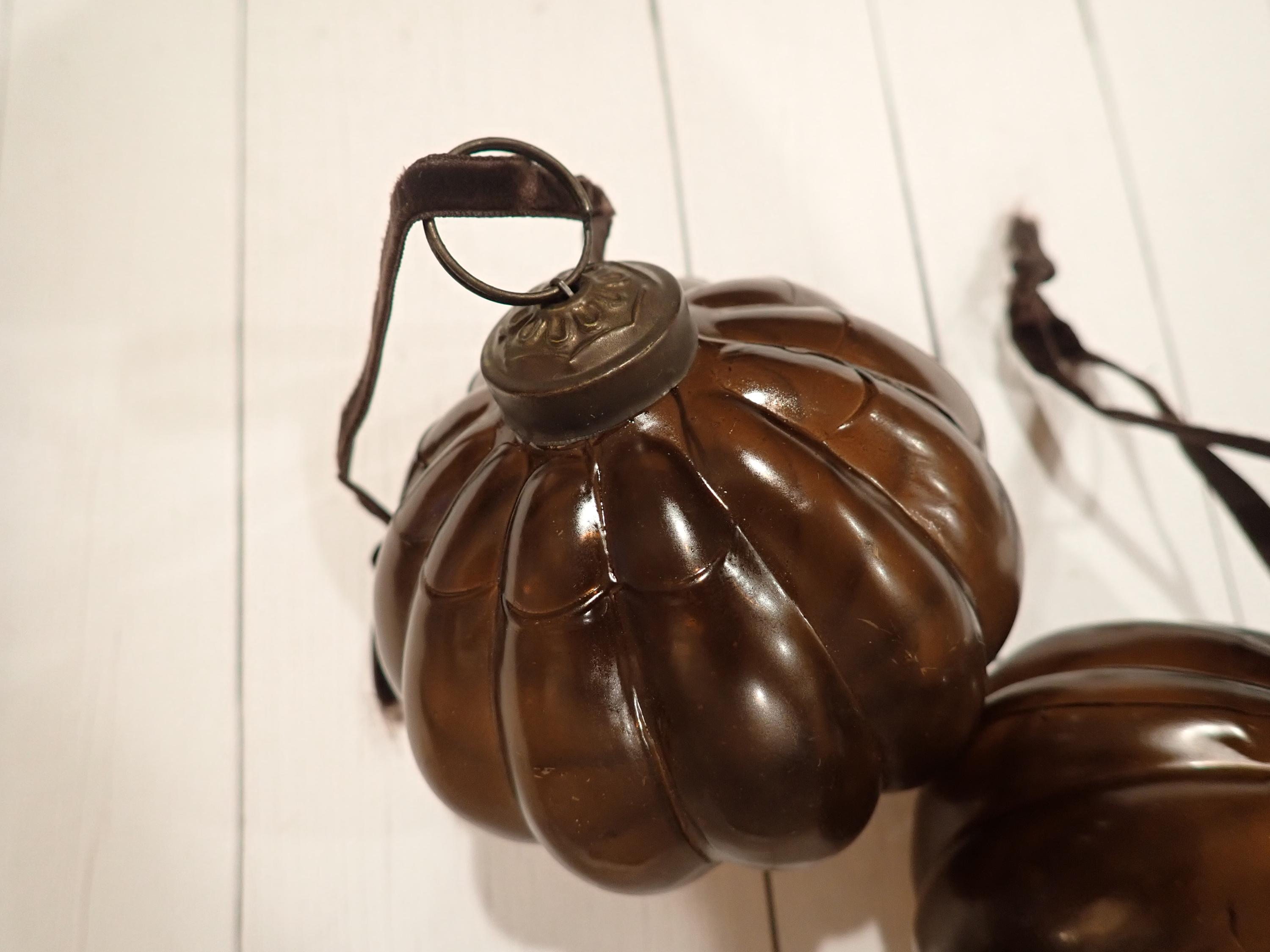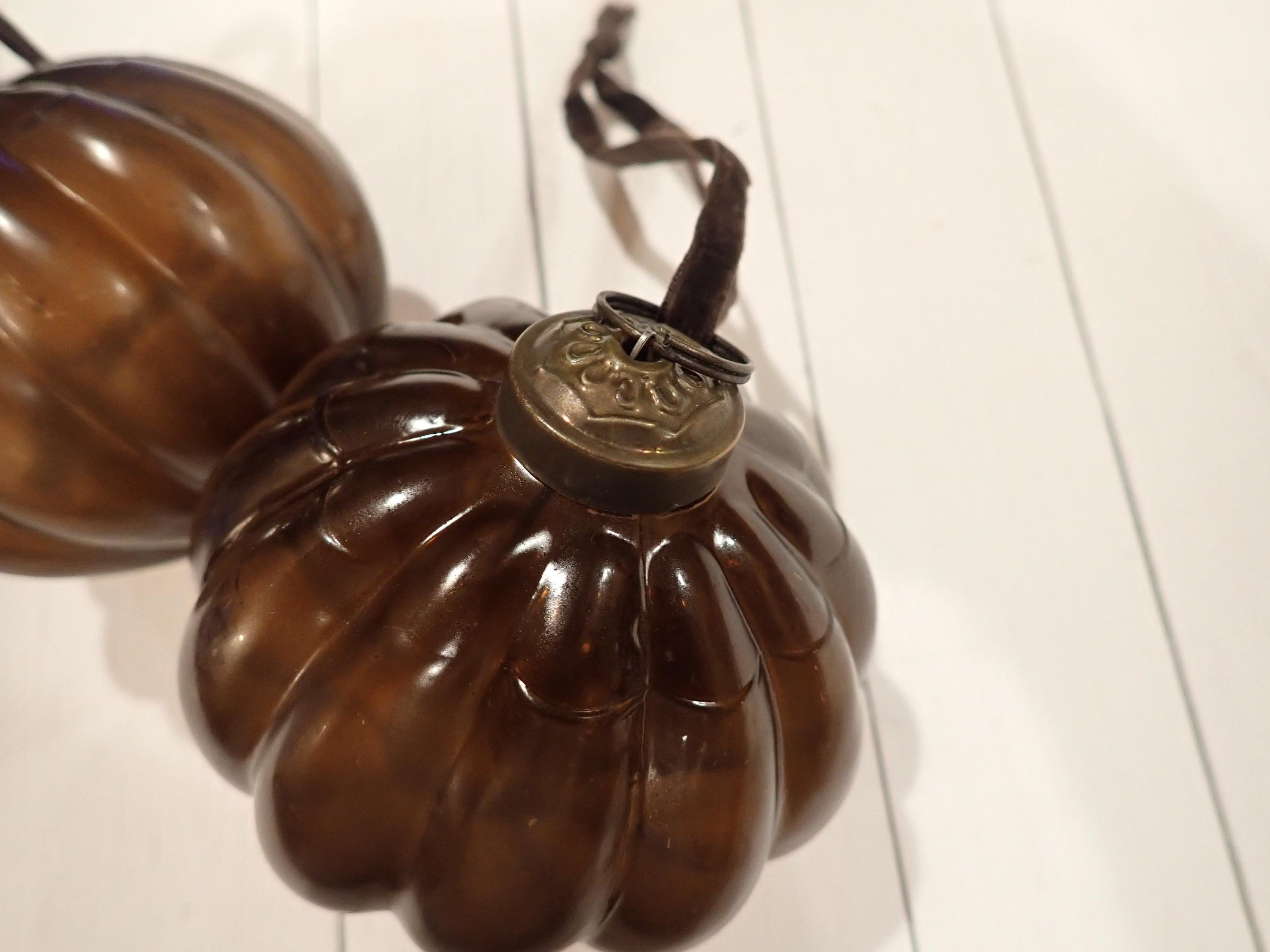 This set of glass ornaments includes 2 matching brown glass Kugel style ornament. These are medium sized ornaments, measuring 3.5" long and 3.5" in diameter. They are a brown glass and have a brown metal cap and loop hanger, as well as a brown cord to hang or tie on to your tree or decor. Both ornaments are in very good condition with no chips or cracks, there are some light scratches here and there. Lovely set of kugel style ornaments!