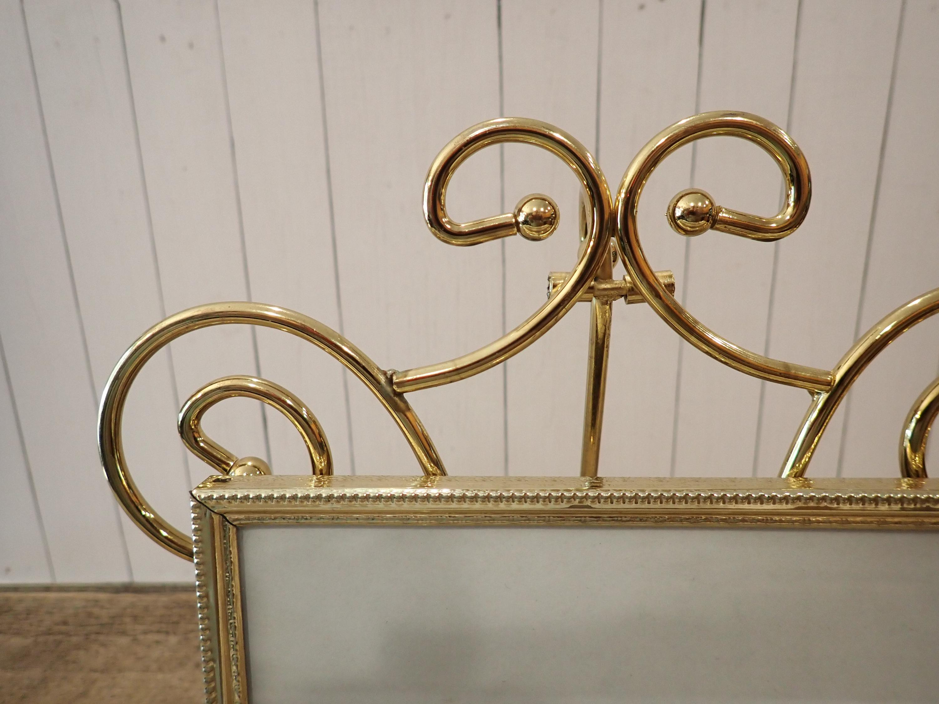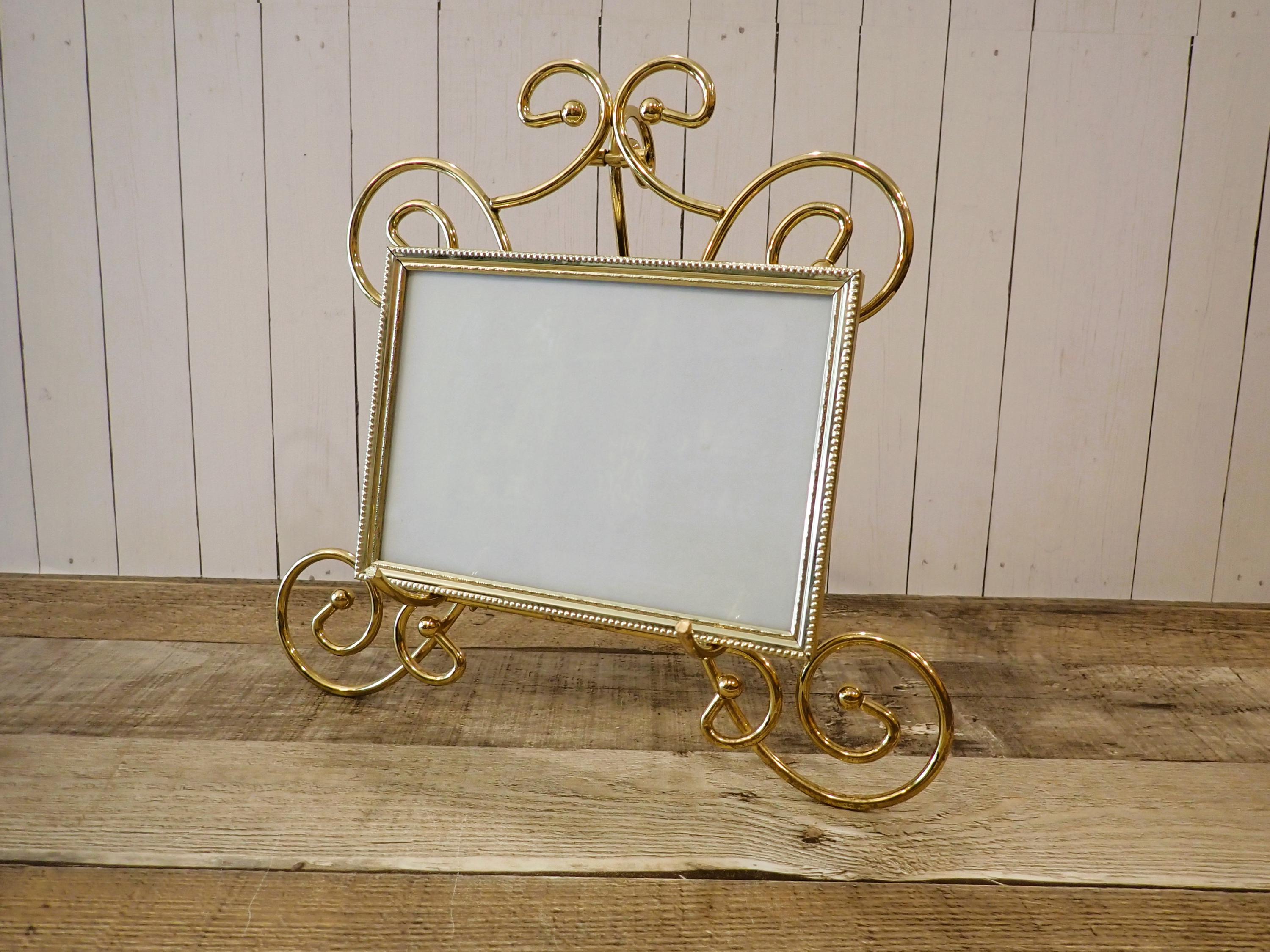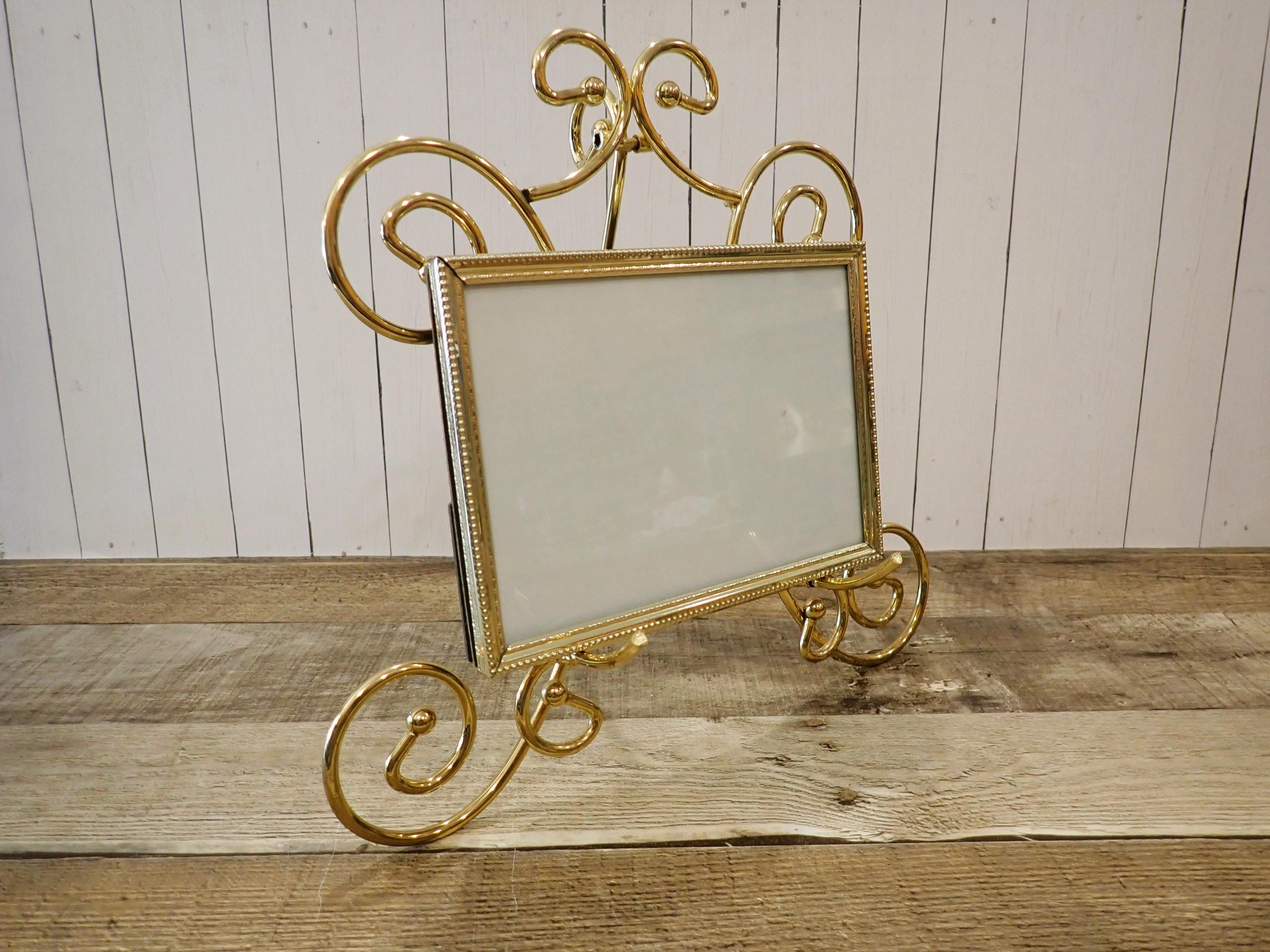 This brass photo frame is a 5x7 frame and sits on a brass/gold colored metal frame stand. The stand is 10.5" tall by 11" wide and can hold one photo frame. Included is one 5x7 photo frame that can rest on the stand wither vertically or horizontally. The frame has a clear glass insert over the photo opening, and a backing piece with a photo stand. The frame and stand are in very nice condition.