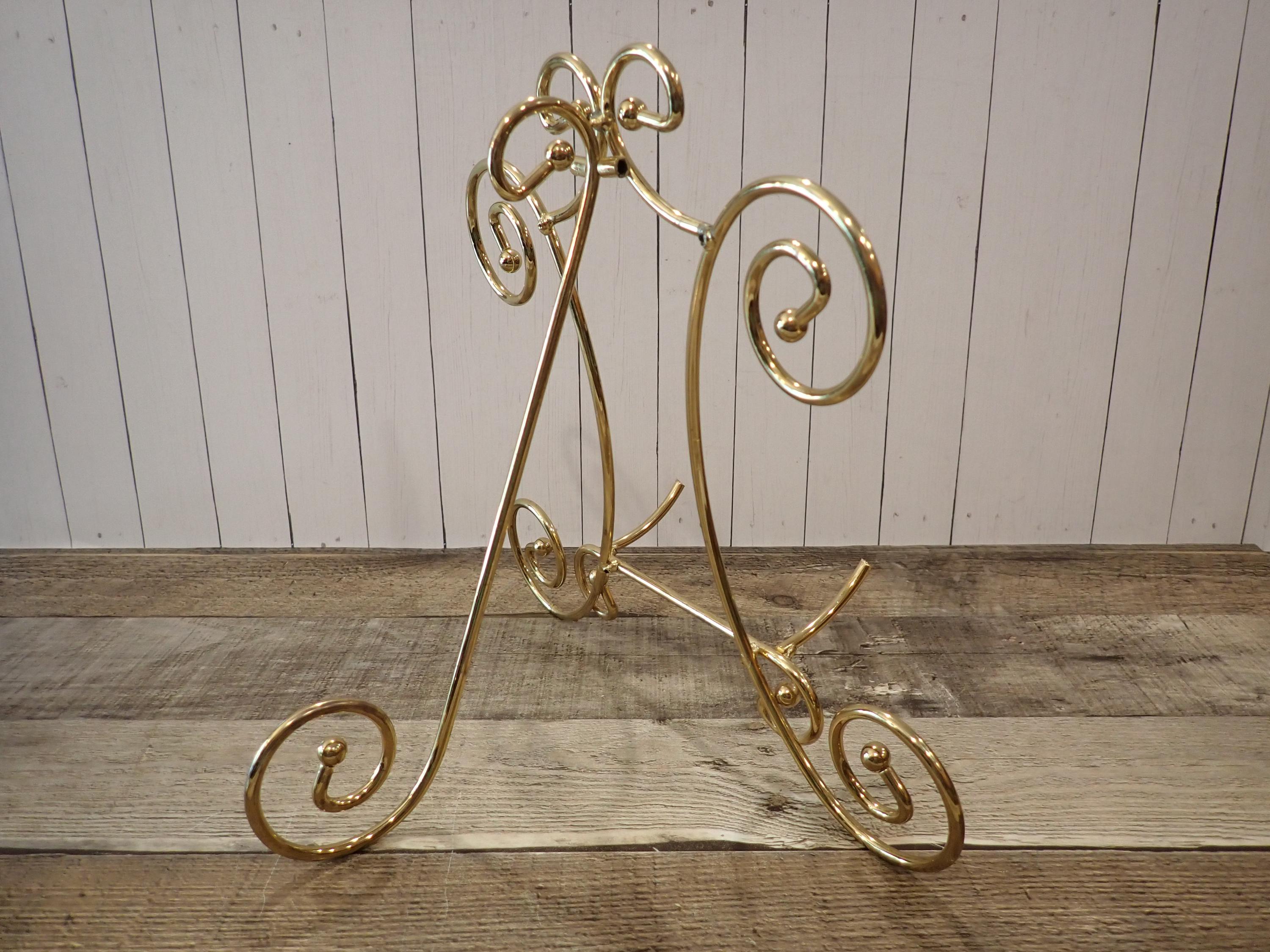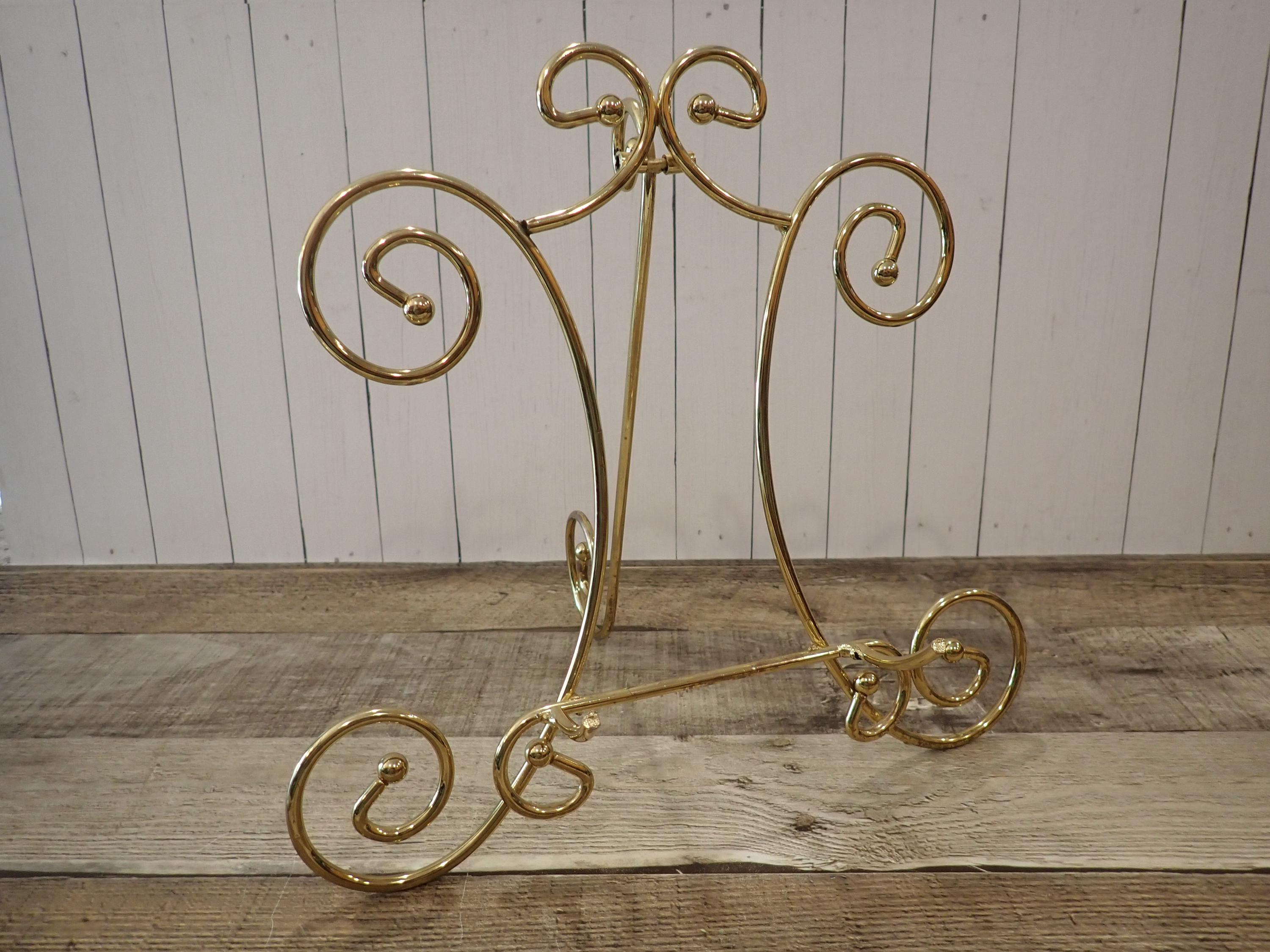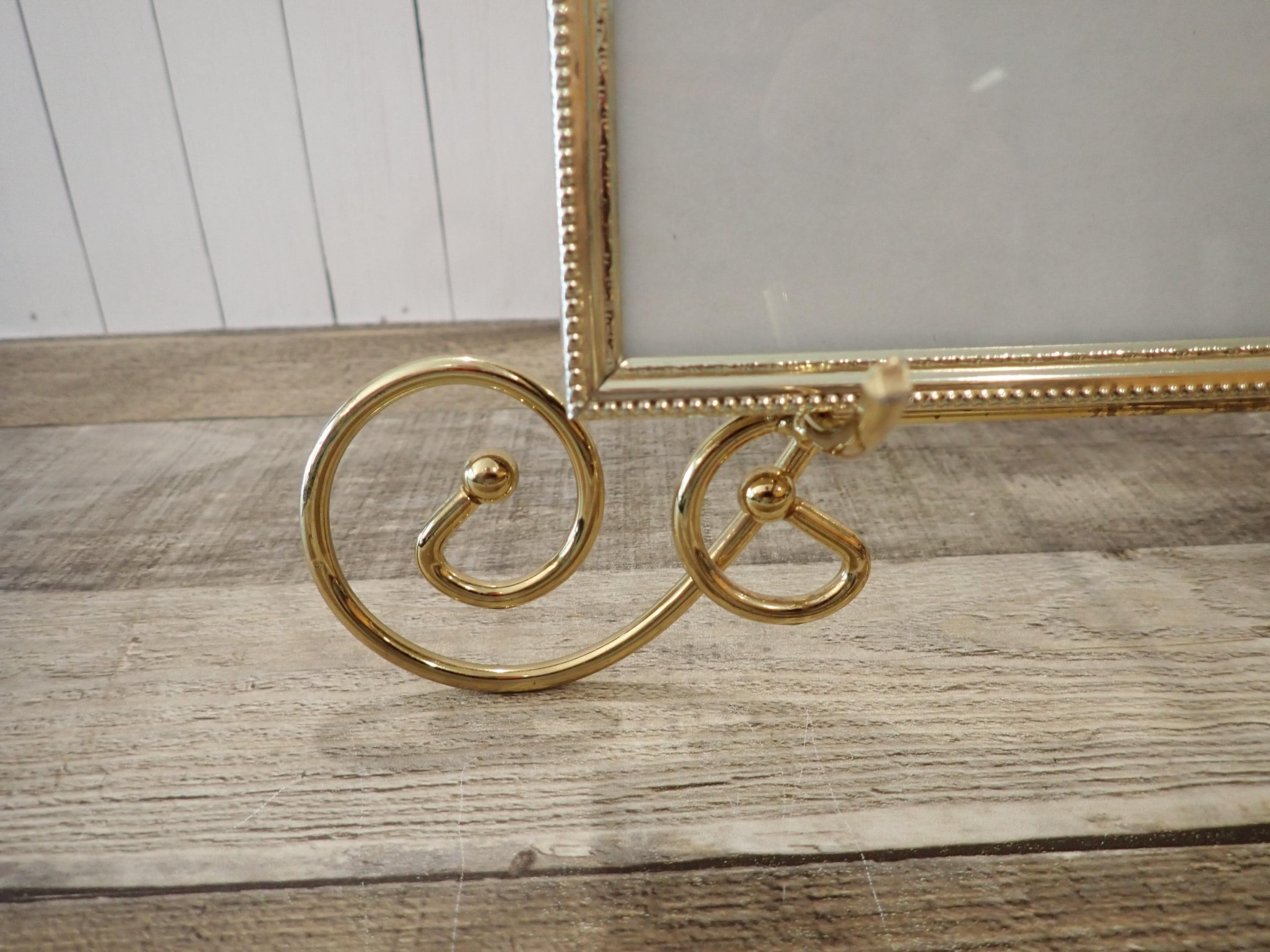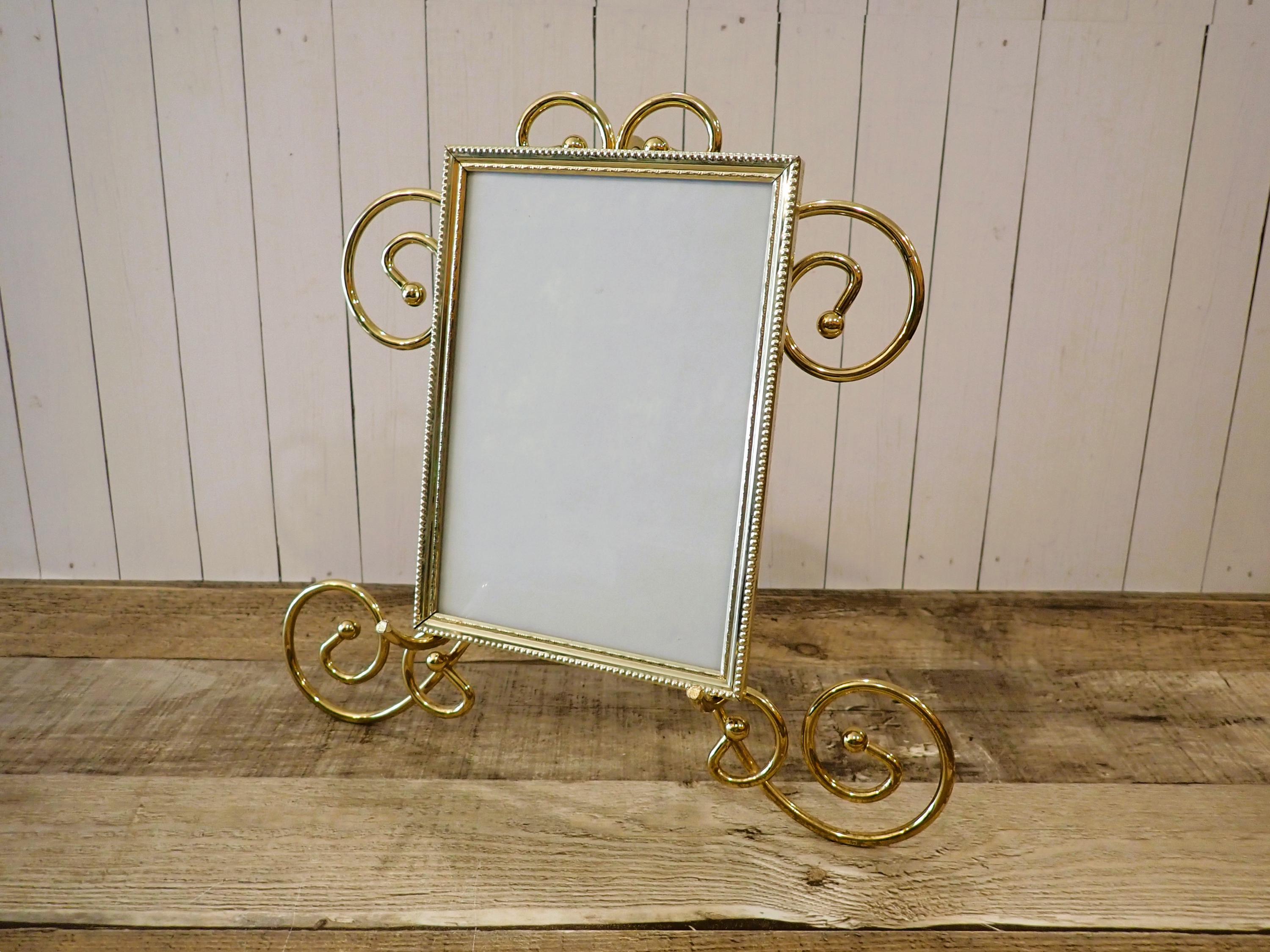 This brass photo frame is a 5x7 frame and sits on a brass/gold colored metal frame stand. The stand is 10.5" tall by 11" wide and can hold one photo frame. Included is one 5x7 photo frame that can rest on the stand wither vertically or horizontally. The frame has a clear glass insert over the photo opening, and a backing piece with a photo stand. The frame and stand are in very nice condition.