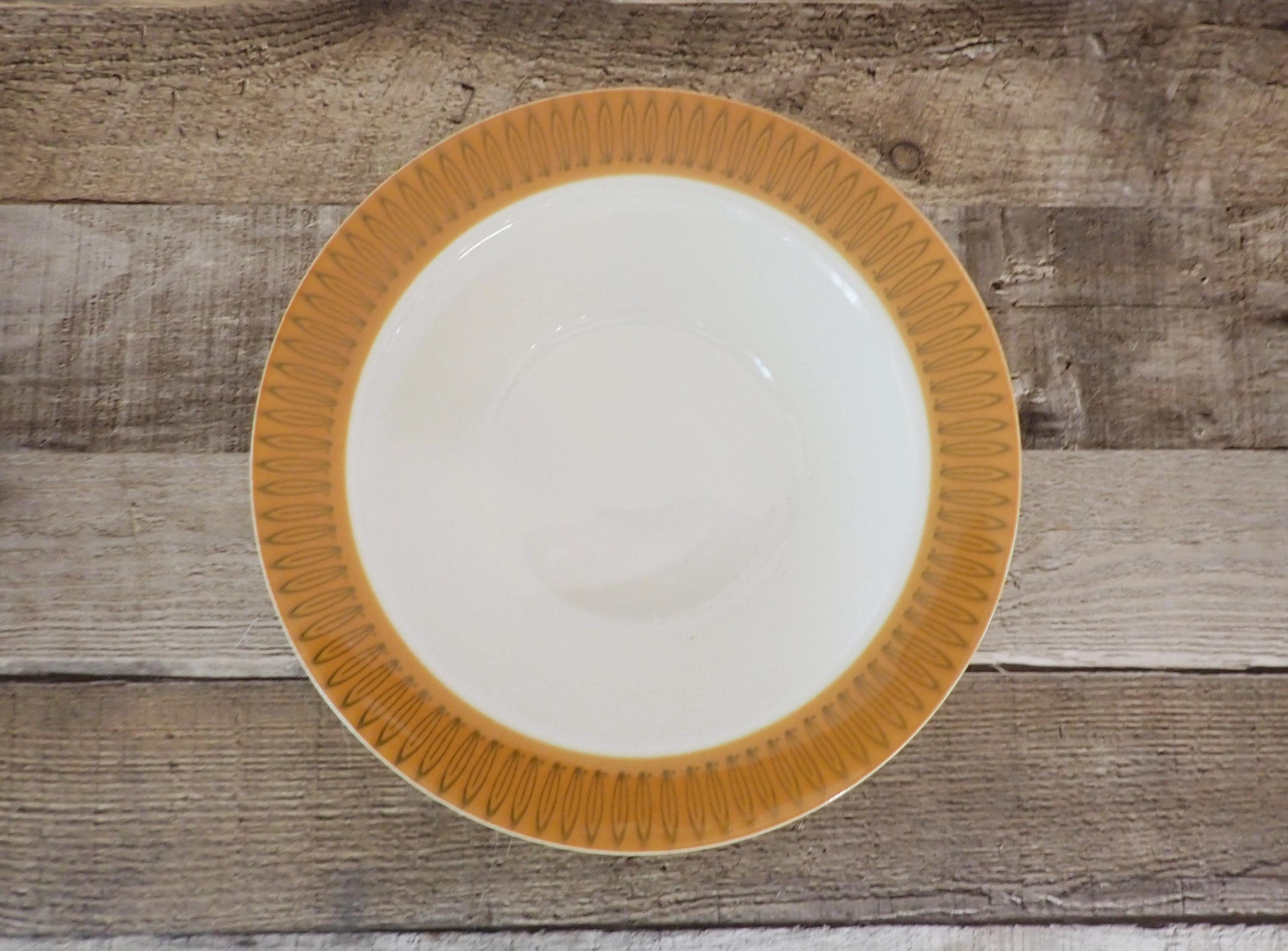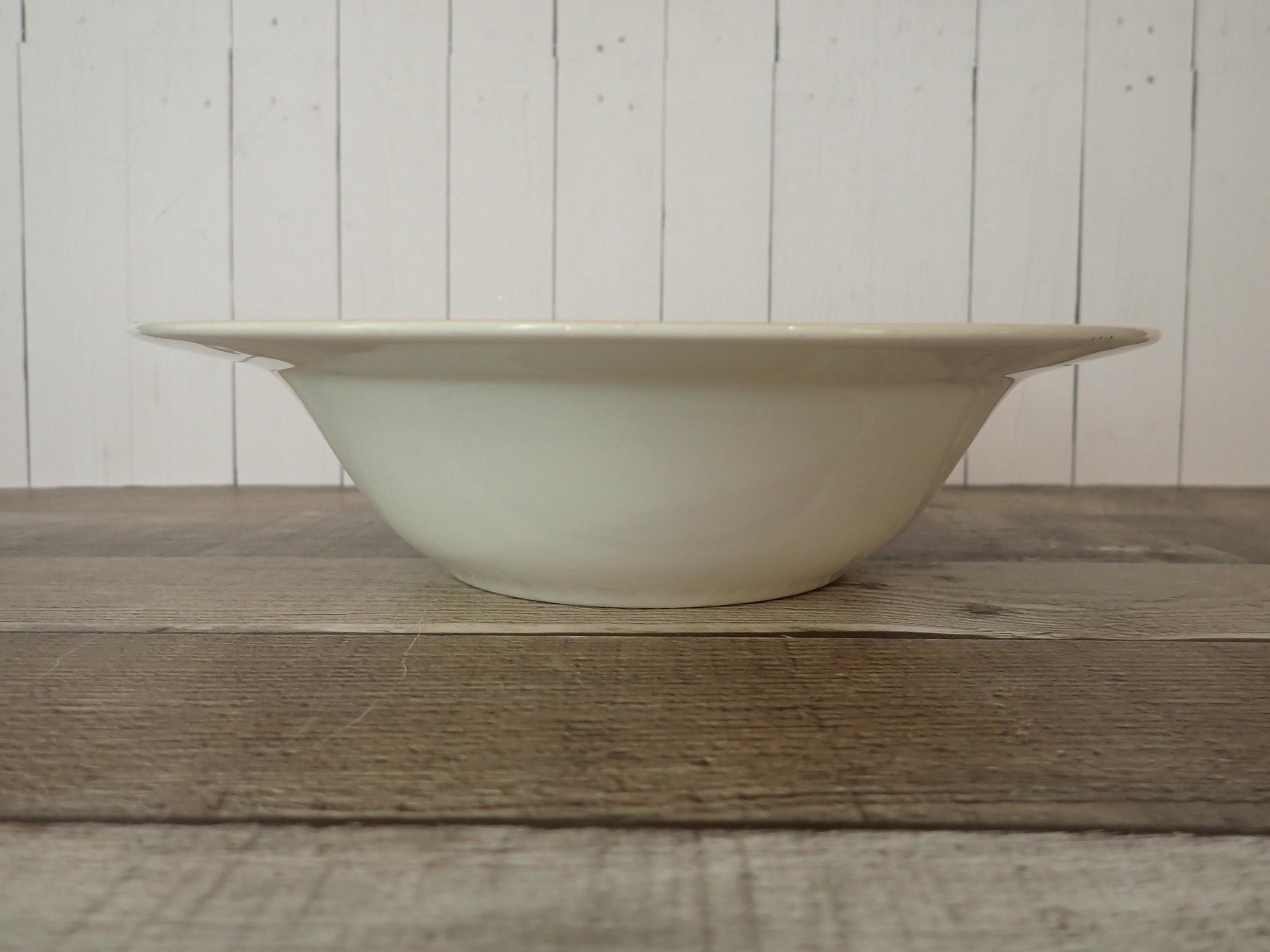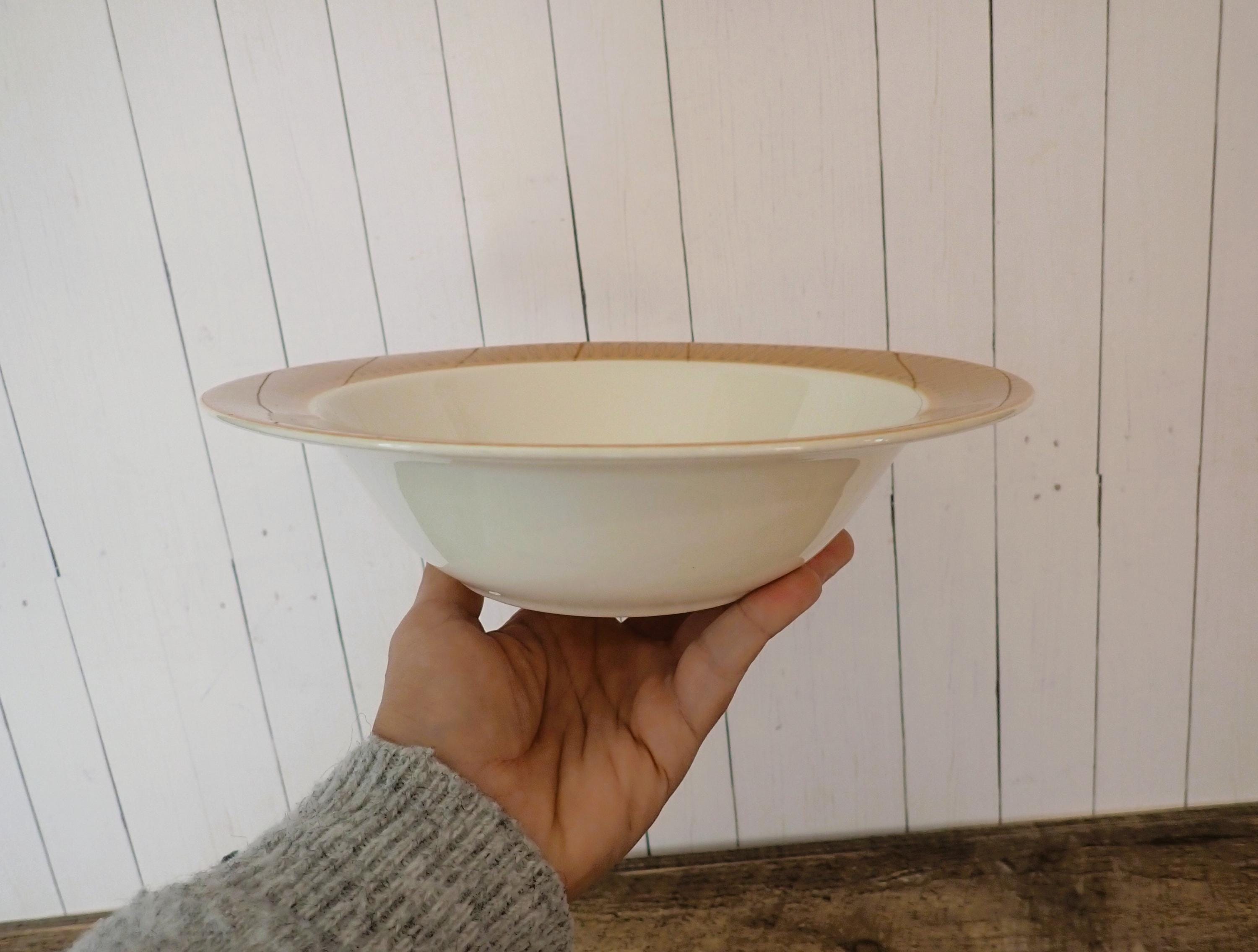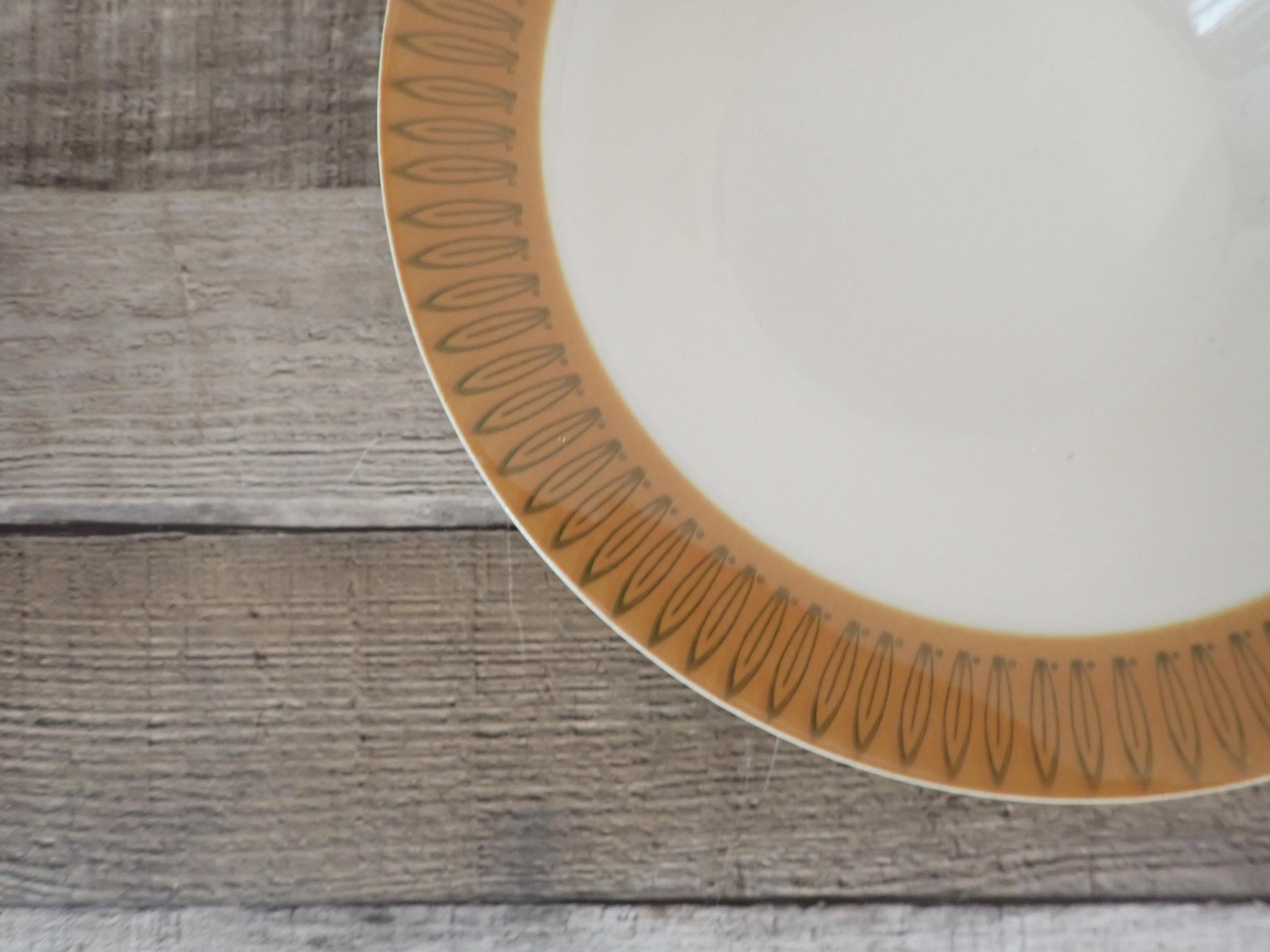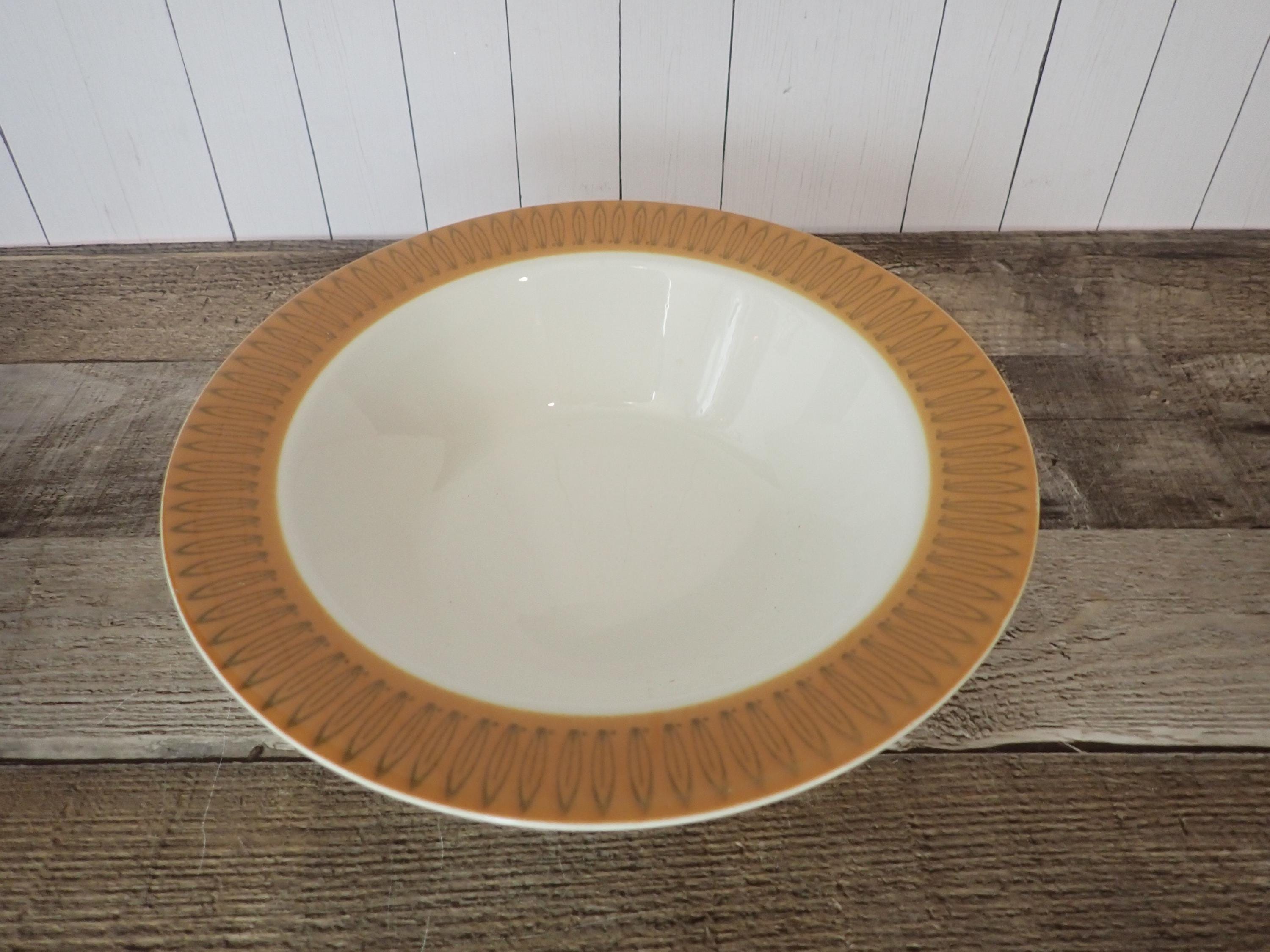 These bowl by Homer Laughlin is in the Morocco pattern and is the 9" round vegetable bowl. It is a white ceramic with a wide golden border with a leaf design around the rim. This bowl is 9" in diameter and 2.25" high at the rim. There is no makers mark on the bowl. The bowl is in very good condition with no chips or cracks.