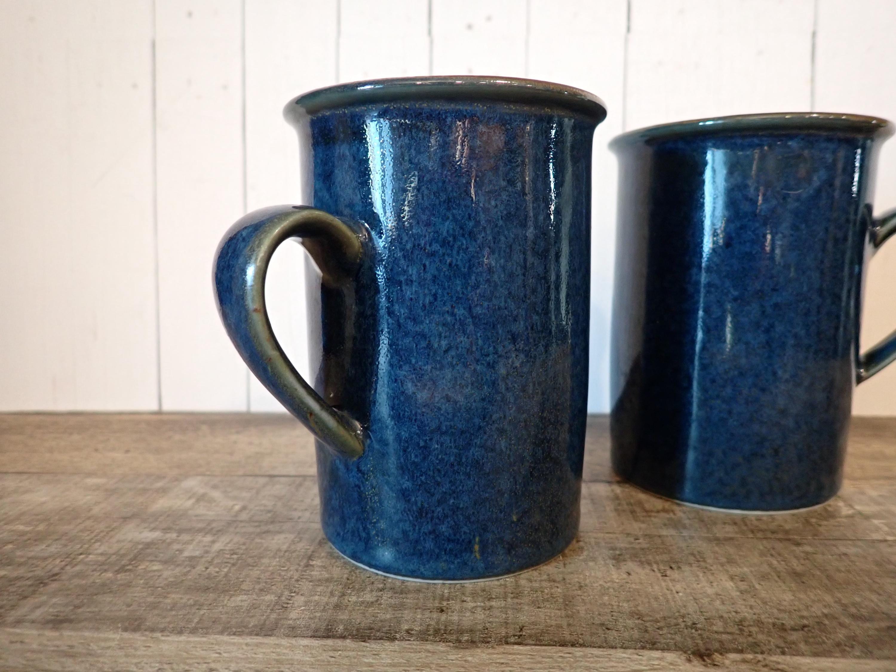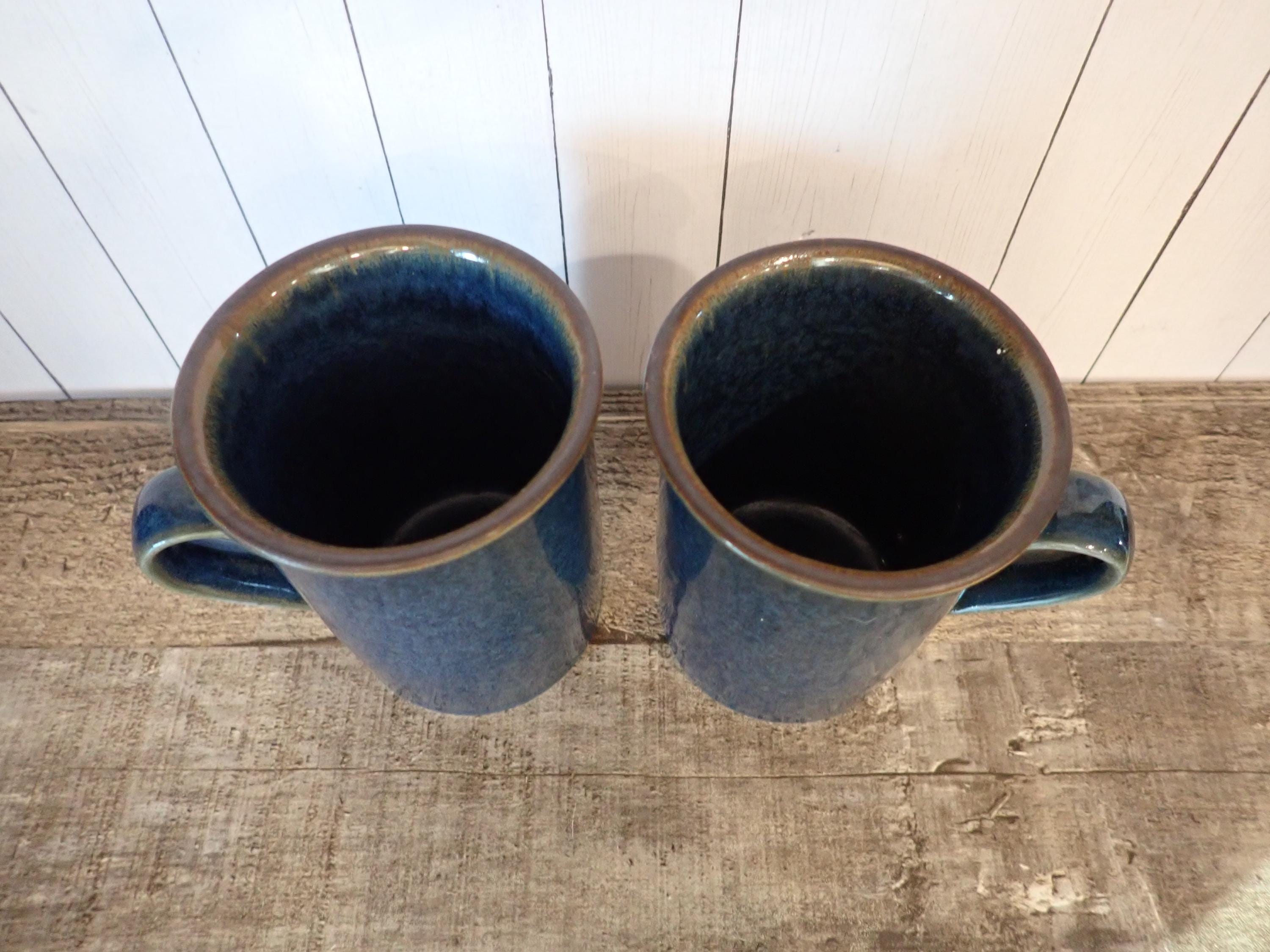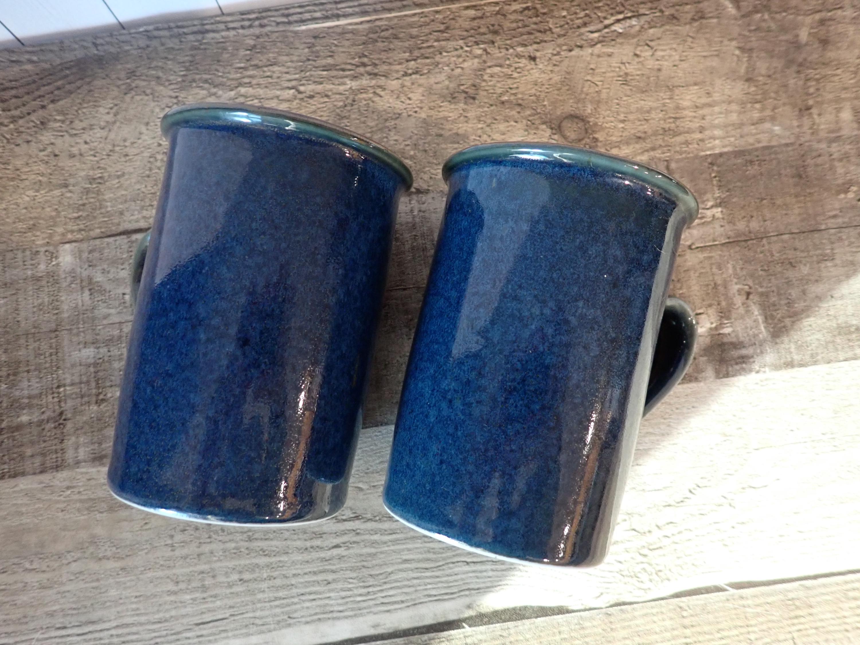 This set of mugs by Dansk in the Sapphire pattern are a blue glazed stoneware. The mugs are 4.5" tall and 3.25" in diameter at the rim. With the handle they are 4.25" wide. They are a darker blue stoneware with a speckled glaze, and a greenish band around the rim. There are no makers marks on the bottom - they have worn away. The mugs can hold 12 oz. filled to the rim. Both mugs are in very good condition with no chips or cracks.