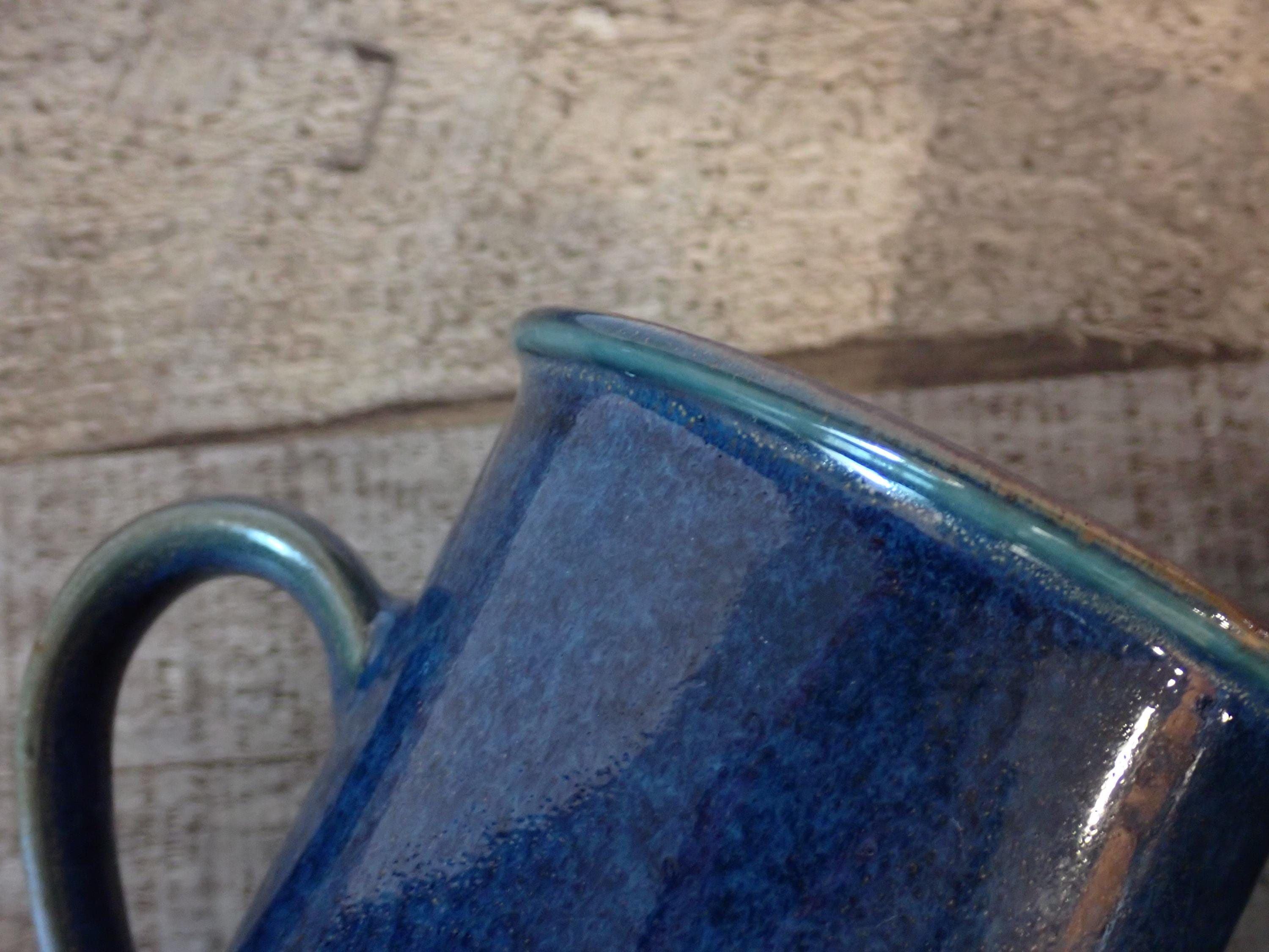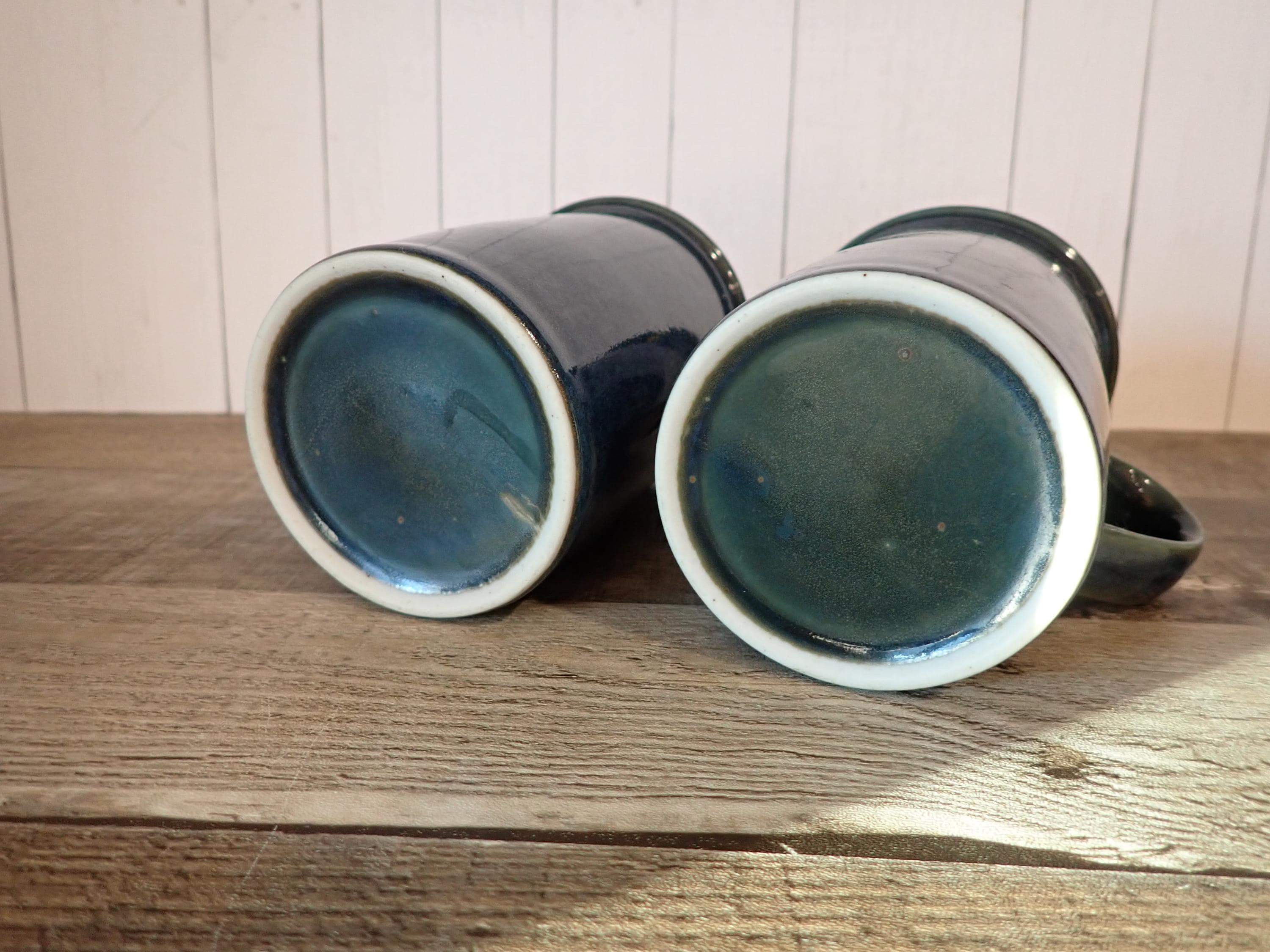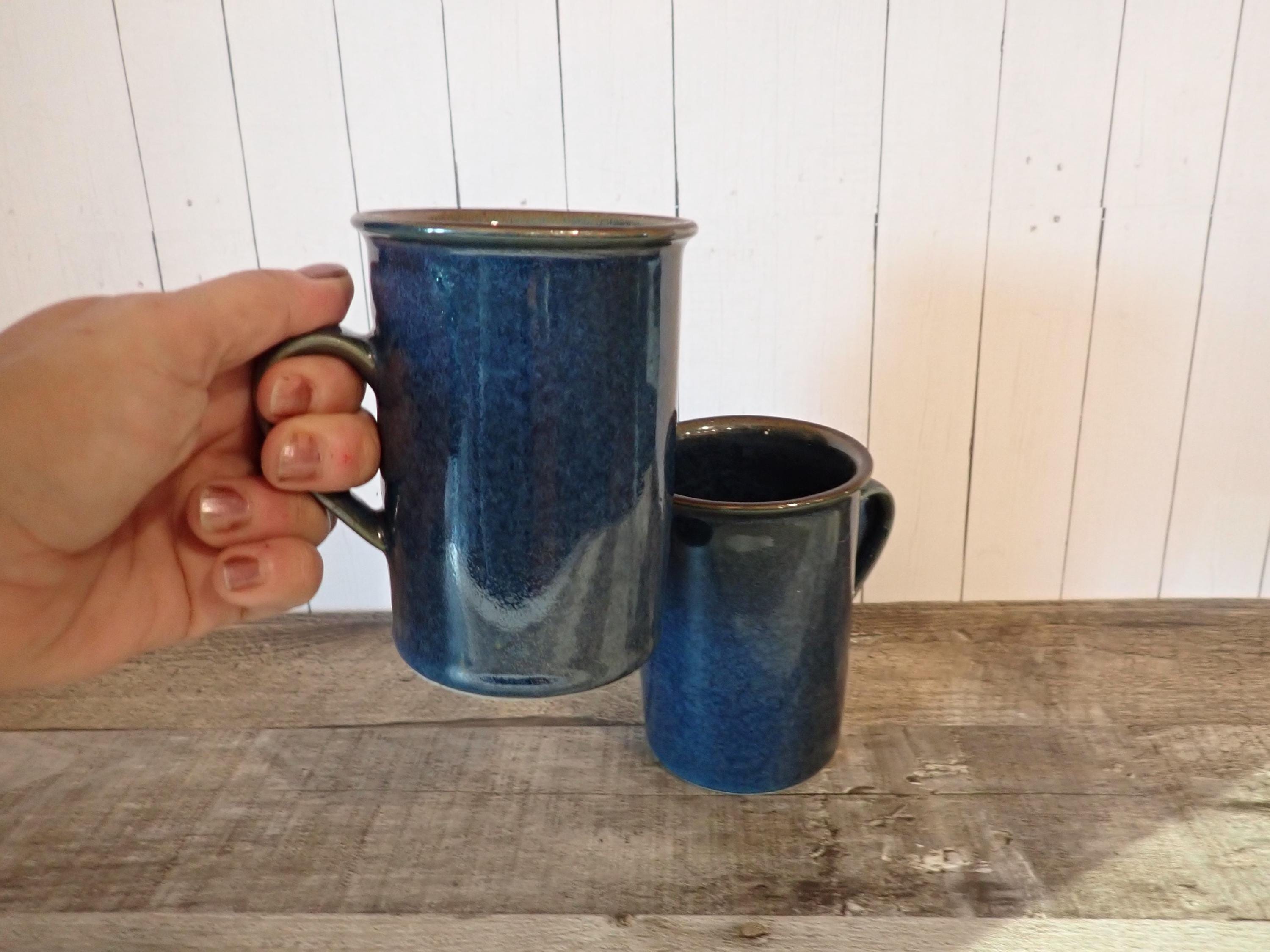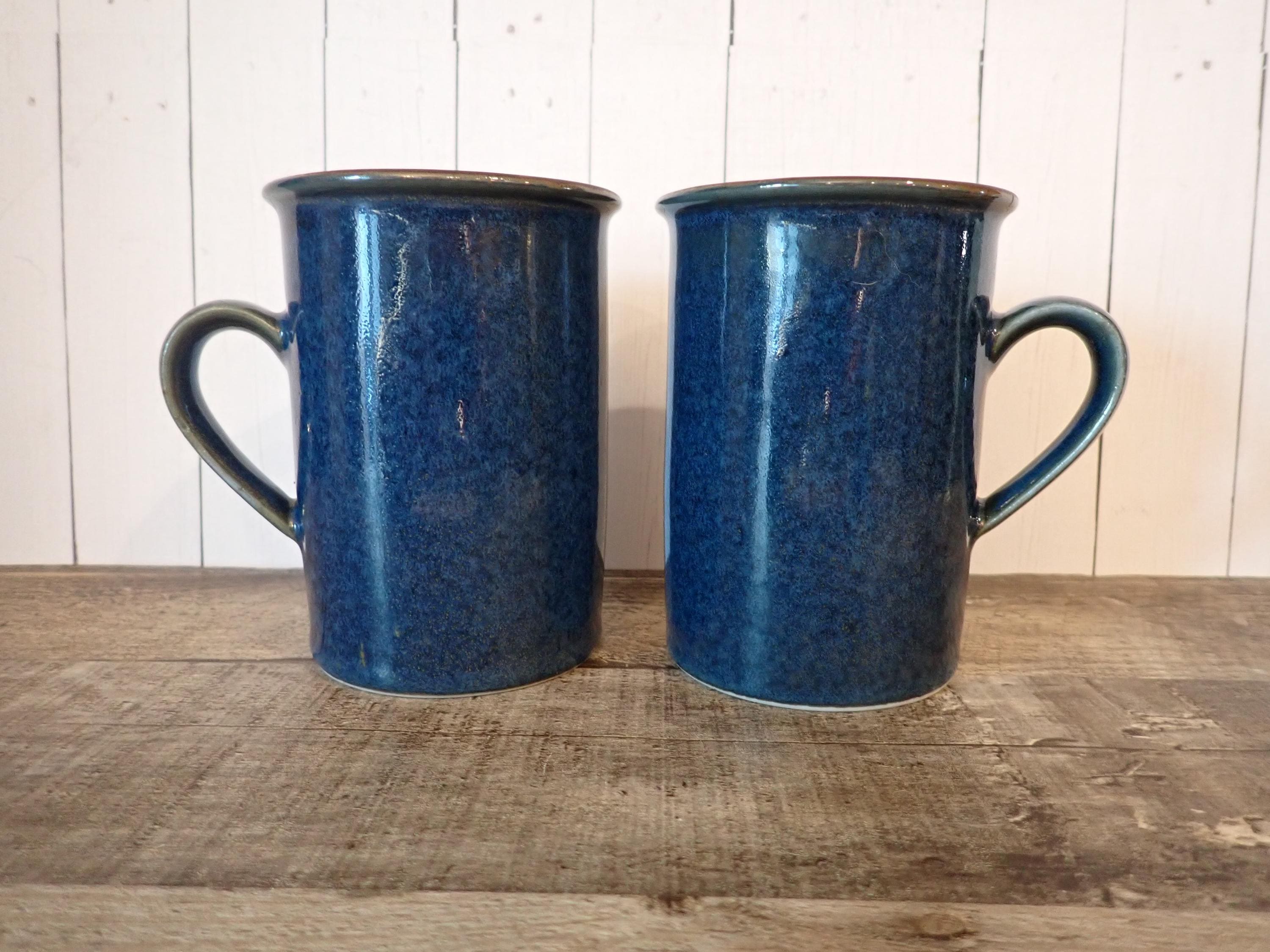 This set of mugs by Dansk in the Sapphire pattern are a blue glazed stoneware. The mugs are 4.5" tall and 3.25" in diameter at the rim. With the handle they are 4.25" wide. They are a darker blue stoneware with a speckled glaze, and a greenish band around the rim. There are no makers marks on the bottom - they have worn away. The mugs can hold 12 oz. filled to the rim. Both mugs are in very good condition with no chips or cracks.