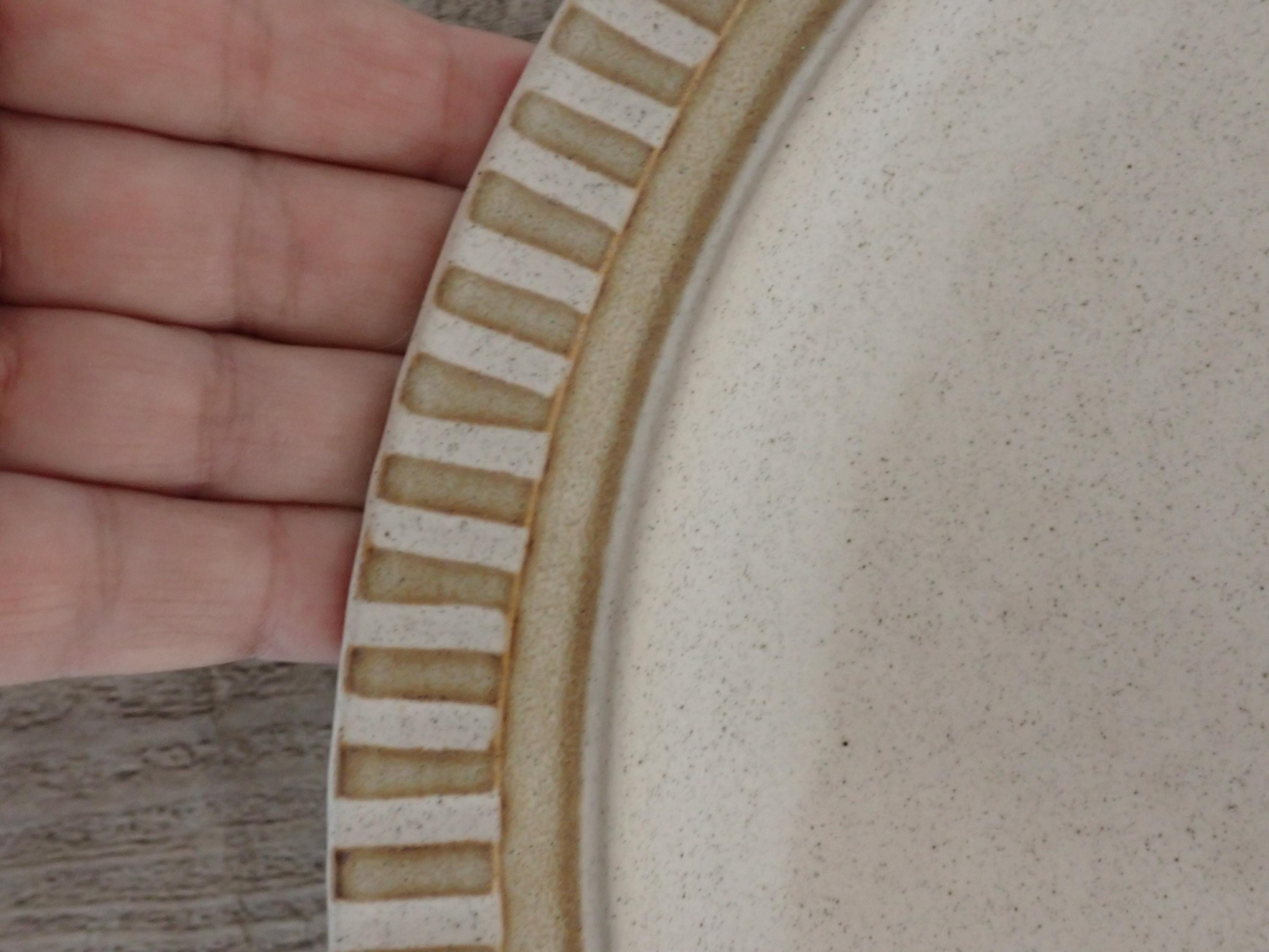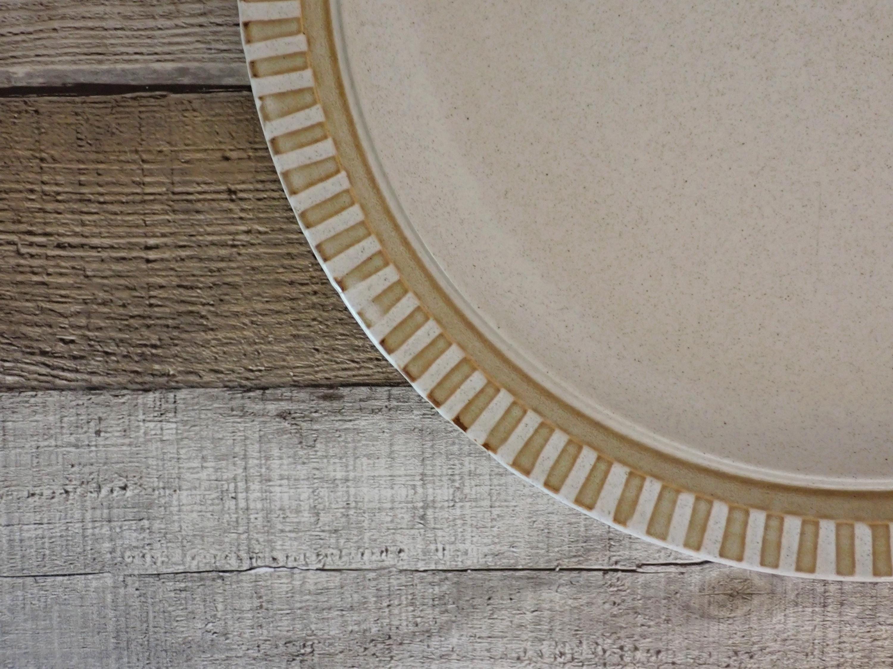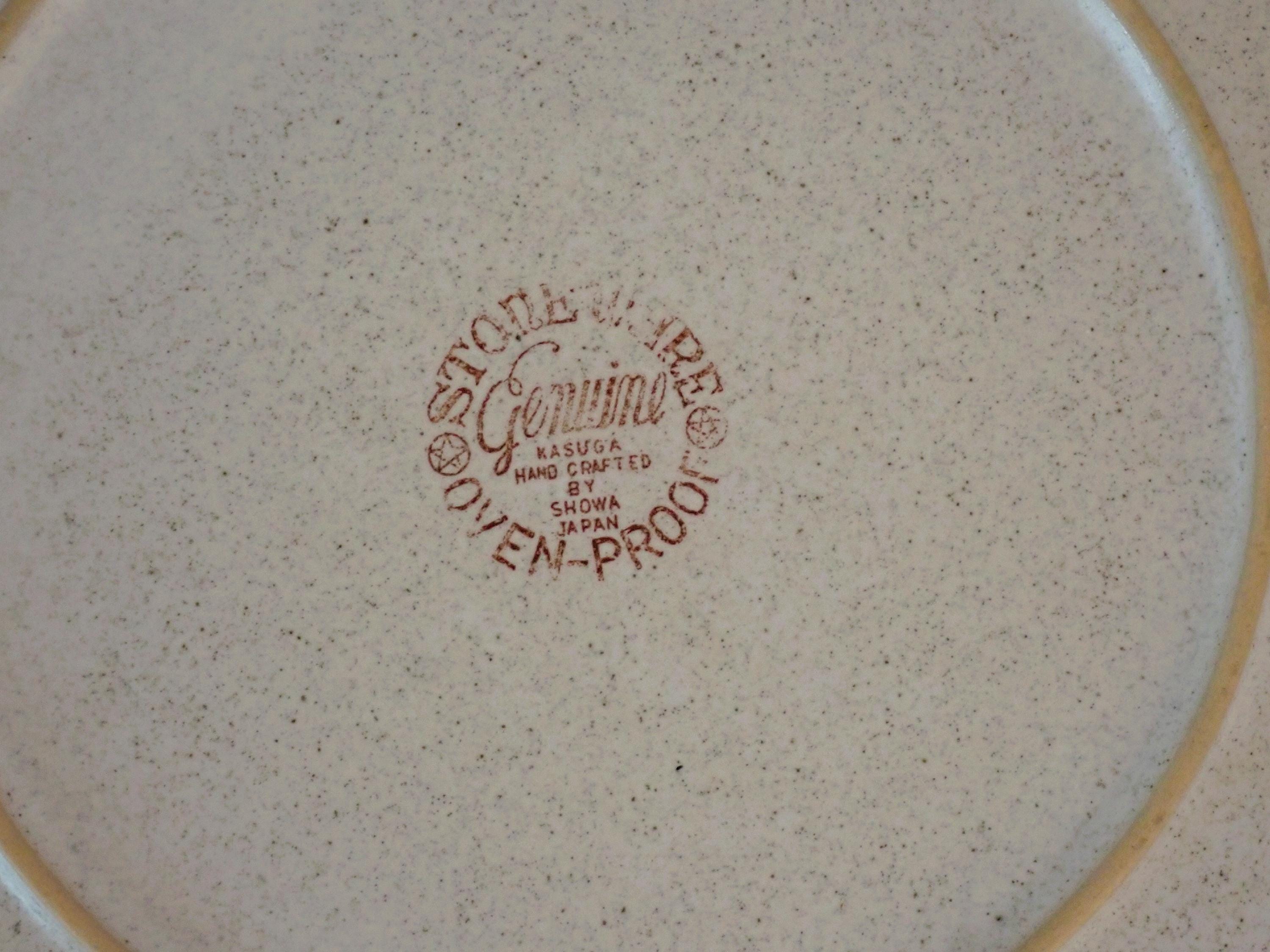 This chop plate by Kasuga is in the Patio (Original) pattern and is 12 1/4" in diameter and 1" high at the rim. It is a beige stoneware with light brown flecking, and has a brown striped band around the rim. The bottom is marked: STONEWARE / GENUINE / KASUGA / HAND CRAFTED / SHOWA / JAPAN / DETERGENT-PROOF. The chop plate is in very good condition with no chips or cracks and very few surface scratches. There are 2 plates available - one has a lighter band around the rim while the other is a bit darker - please choose your plate from the drop-down menu.