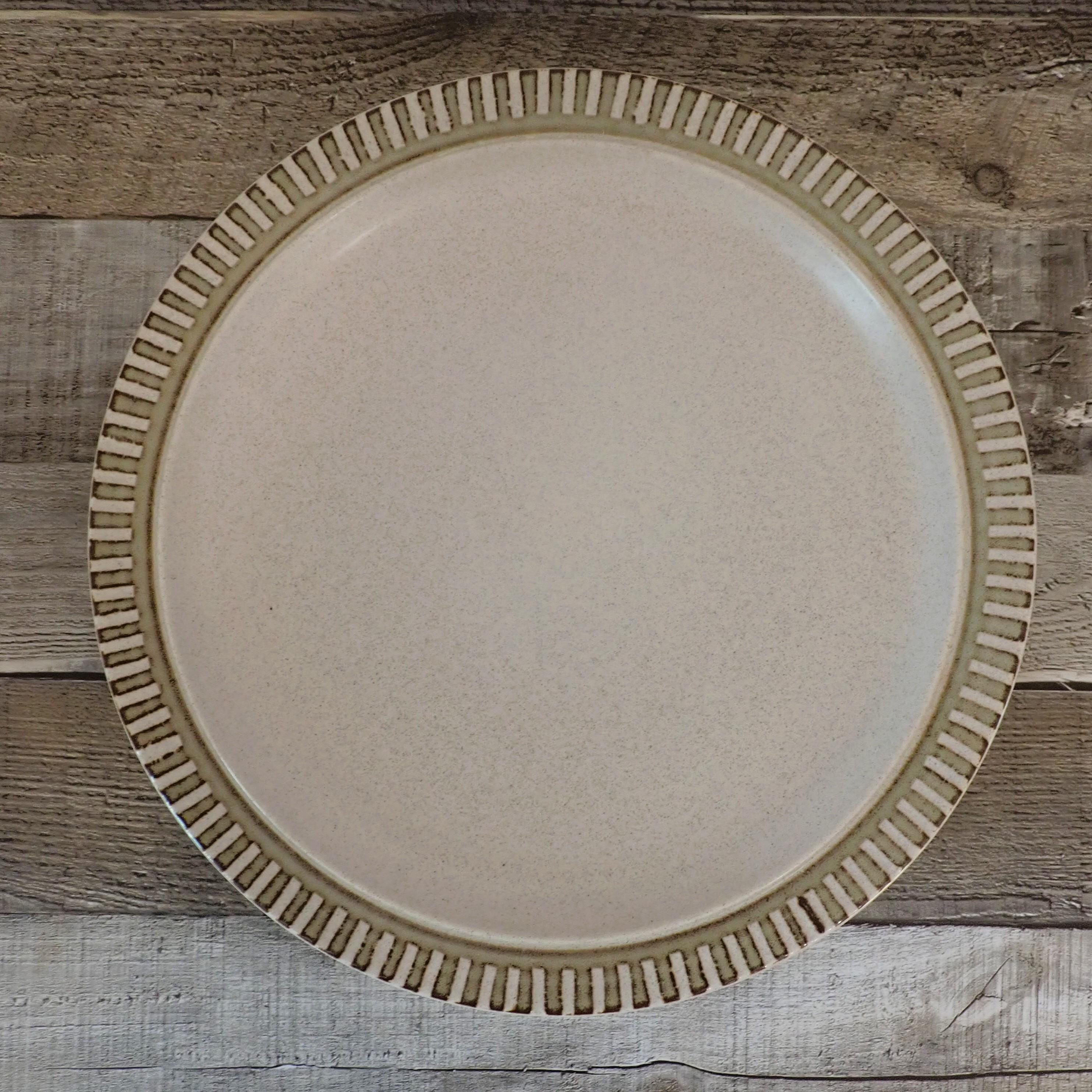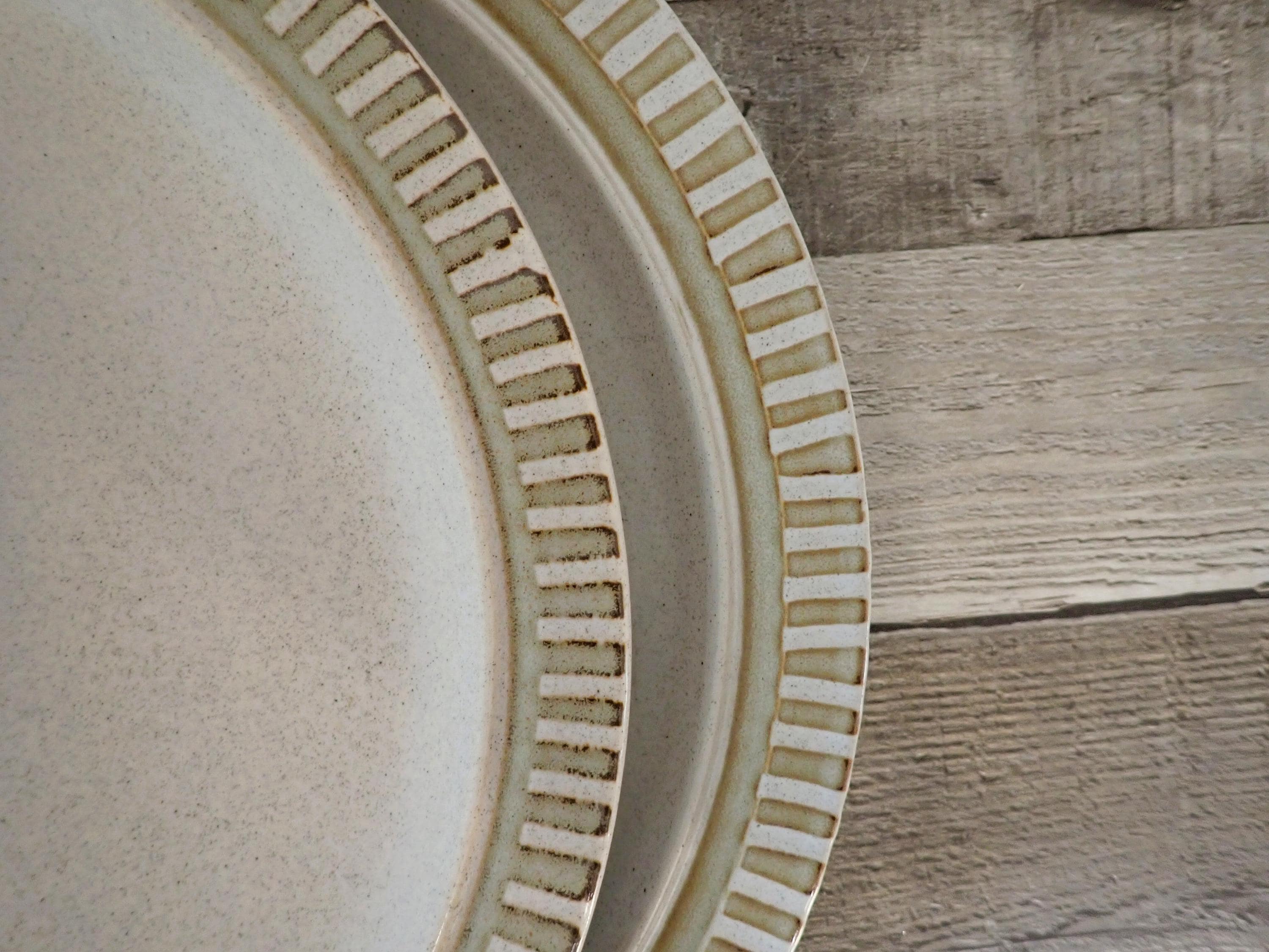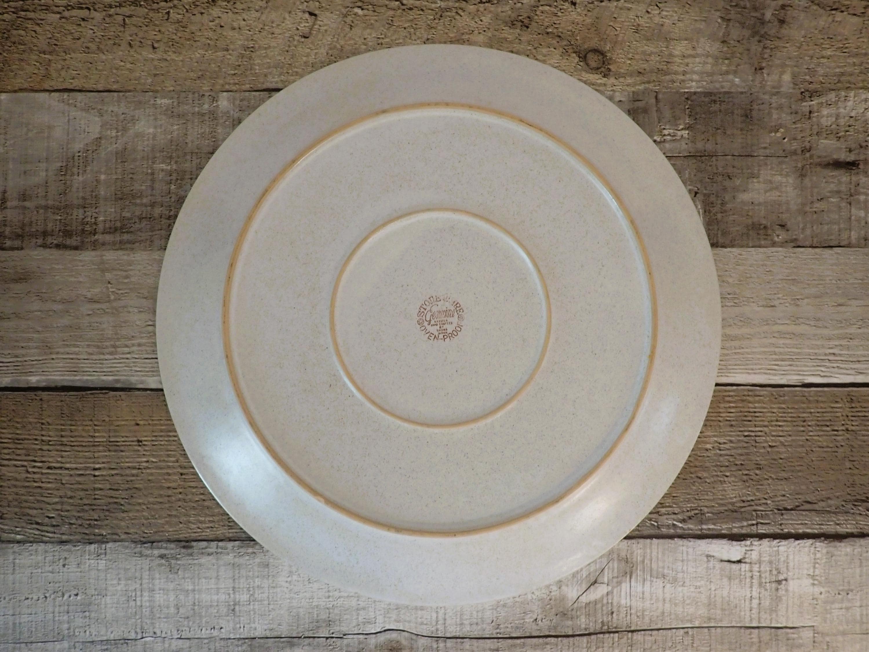 This chop plate by Kasuga is in the Patio (Original) pattern and is 12 1/4" in diameter and 1" high at the rim. It is a beige stoneware with light brown flecking, and has a brown striped band around the rim. The bottom is marked: STONEWARE / GENUINE / KASUGA / HAND CRAFTED / SHOWA / JAPAN / DETERGENT-PROOF. The chop plate is in very good condition with no chips or cracks and very few surface scratches. There are 2 plates available - one has a lighter band around the rim while the other is a bit darker - please choose your plate from the drop-down menu.