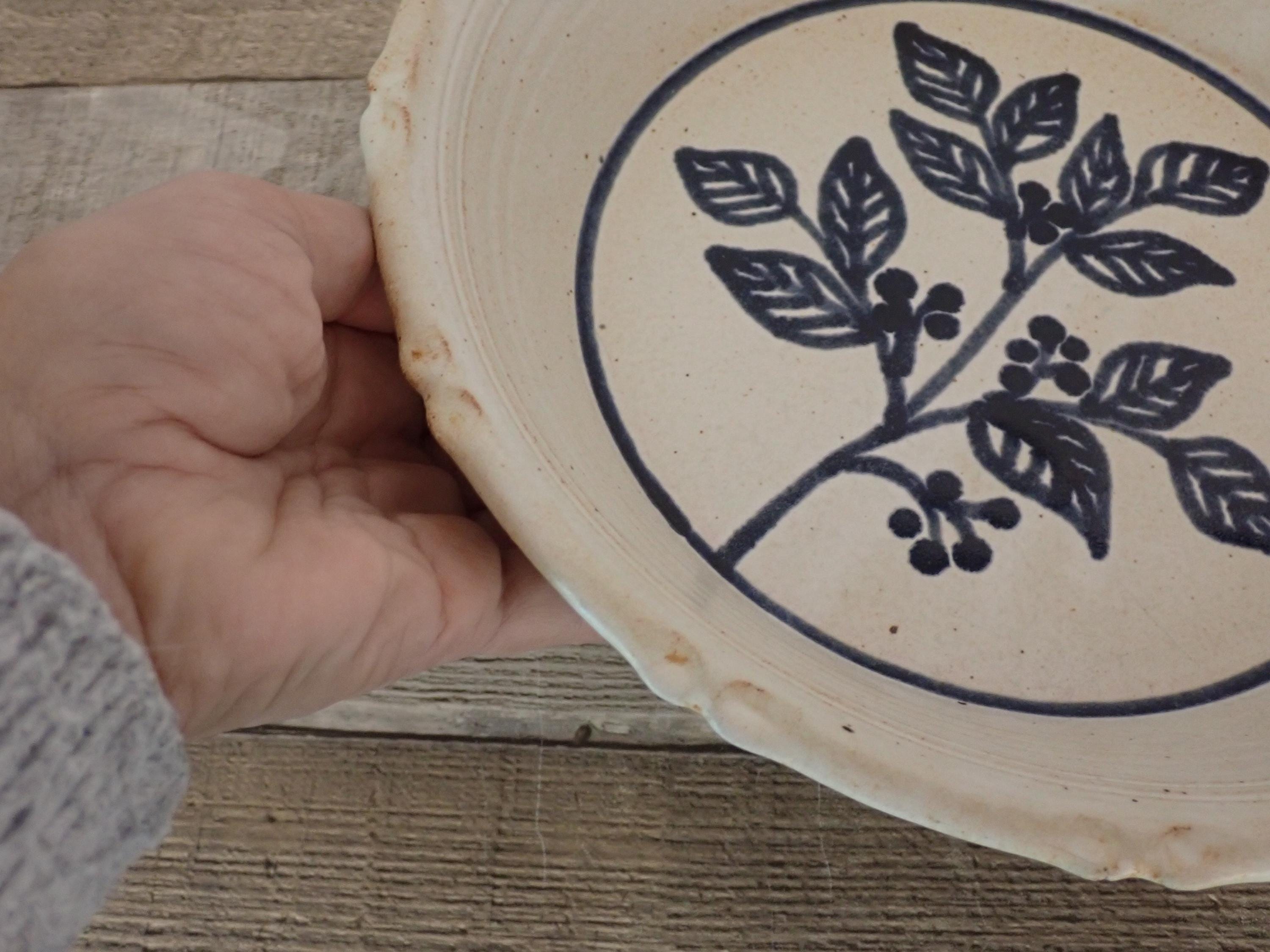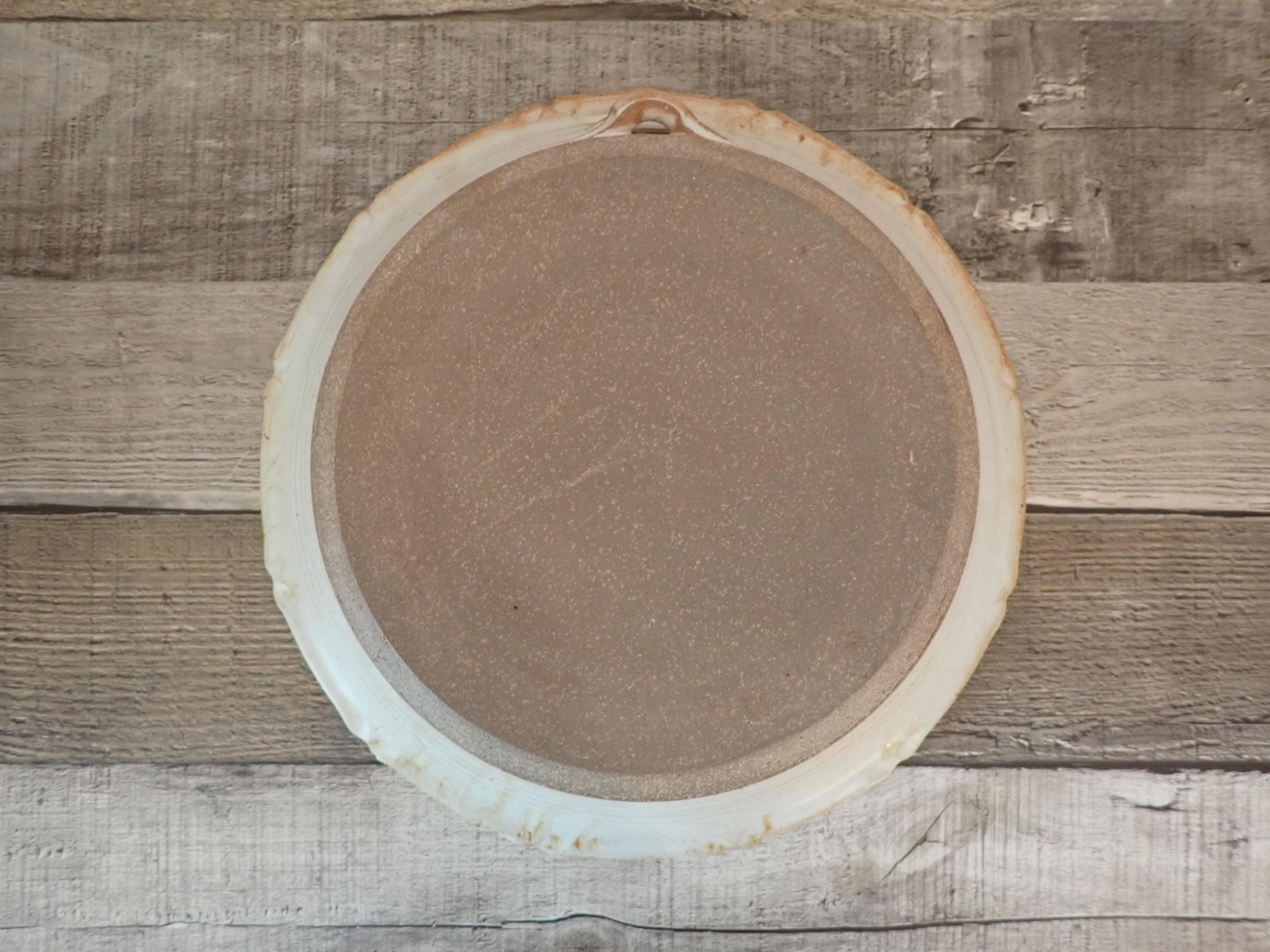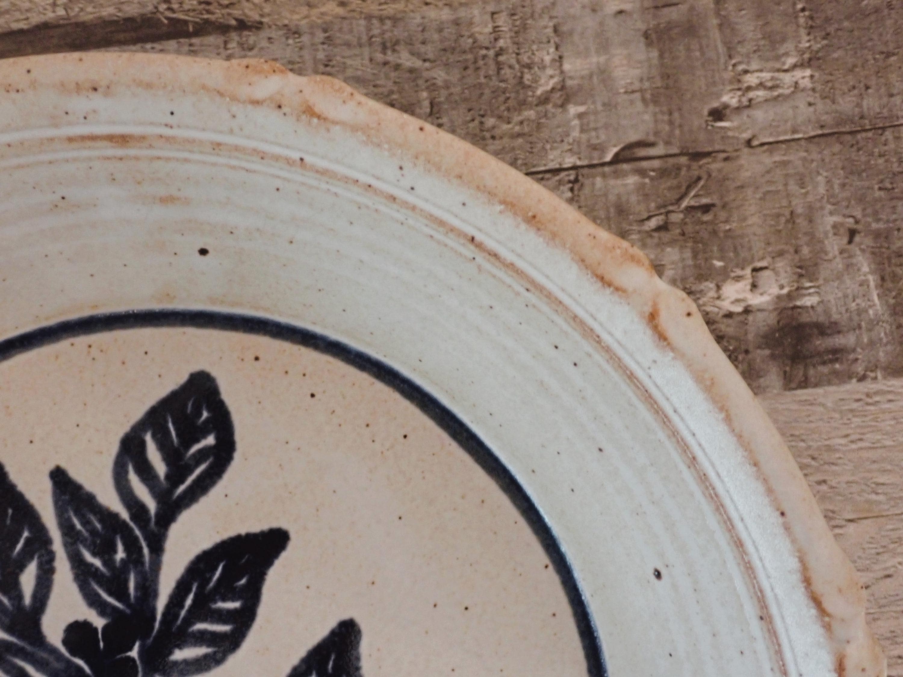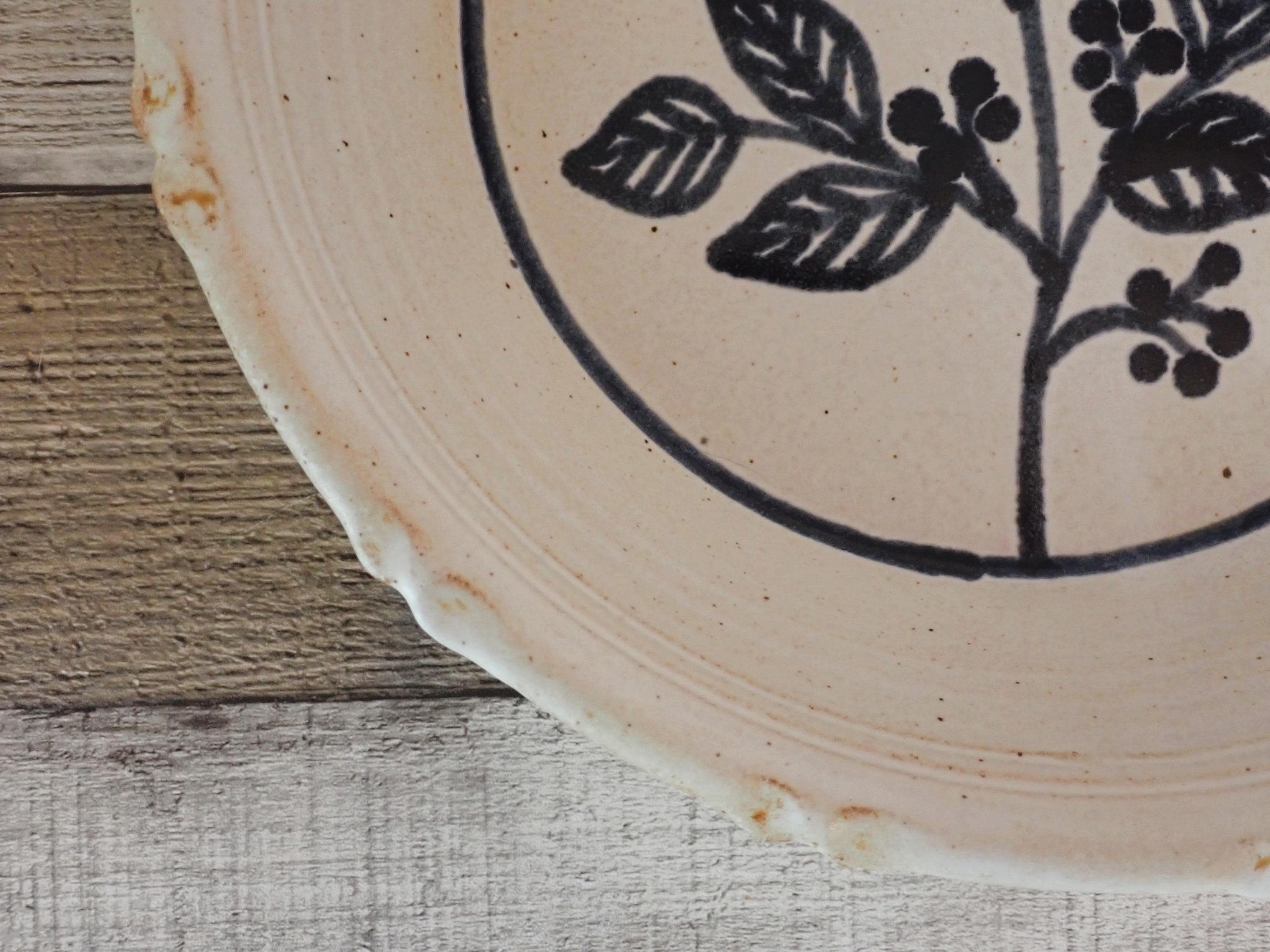 This handmade pie plate is 10" in diameter and 2" deep. It is a tan stoneware piece with a white glaze, and has an indented edge pattern around the rim. The plate is decorated with a blue stem with leaves, and small blue berries. The back is marked with the artists signature that I'm not able to make out. The pie plate is in very nice condition, however there is one small nick on the underside of the rim as shown in the last 2 photos. There is also a hanger on the back if you wish to display!