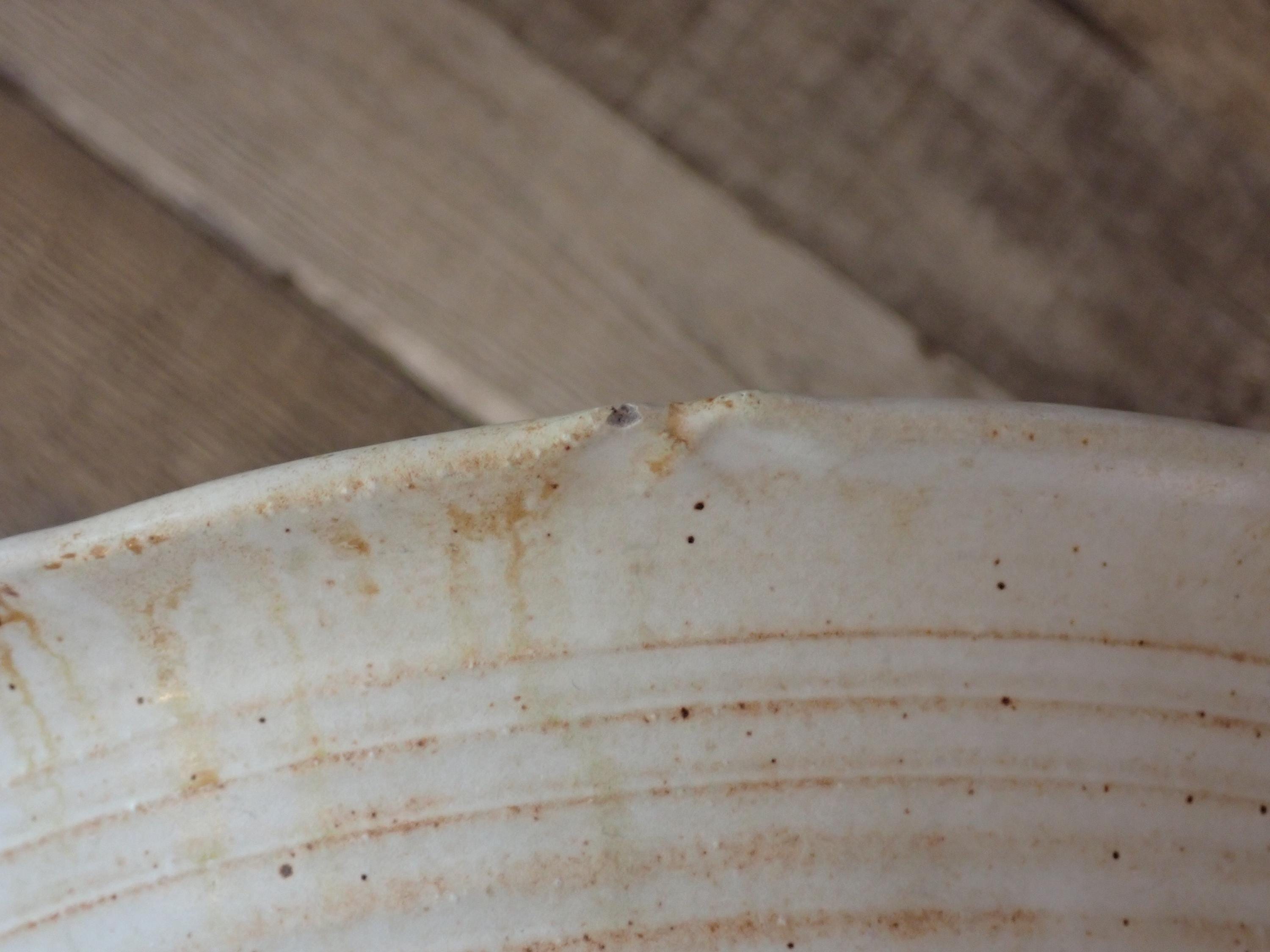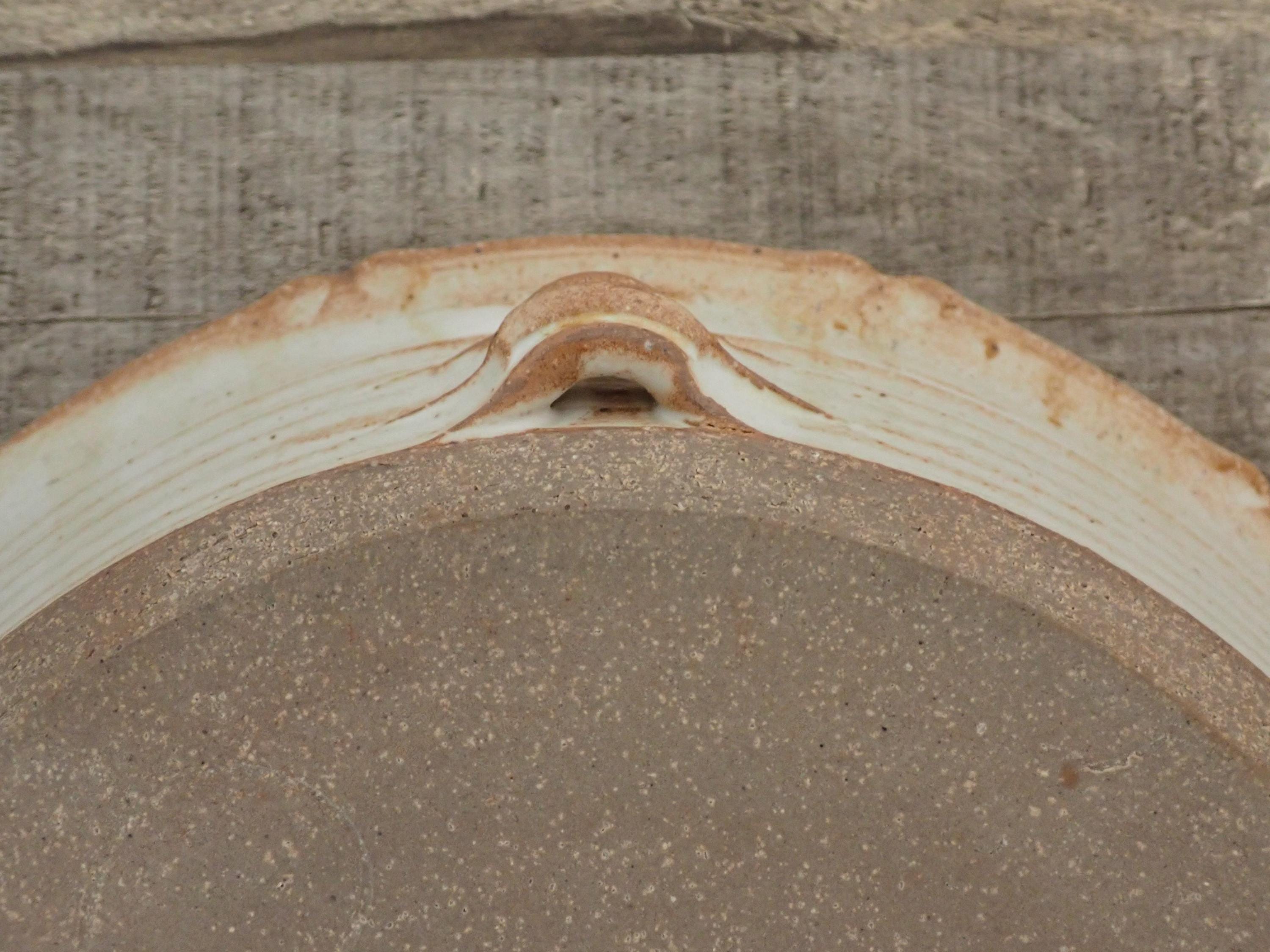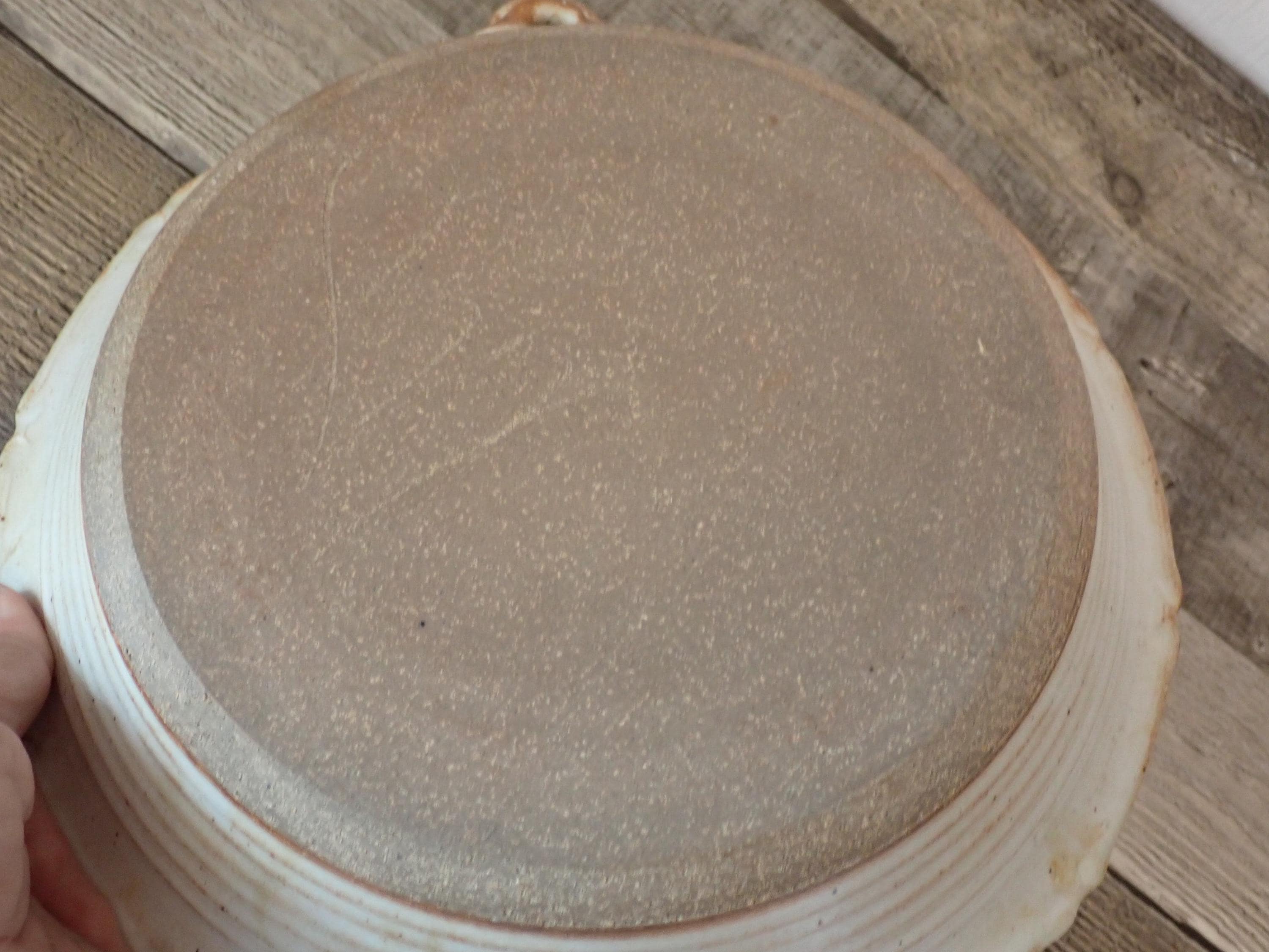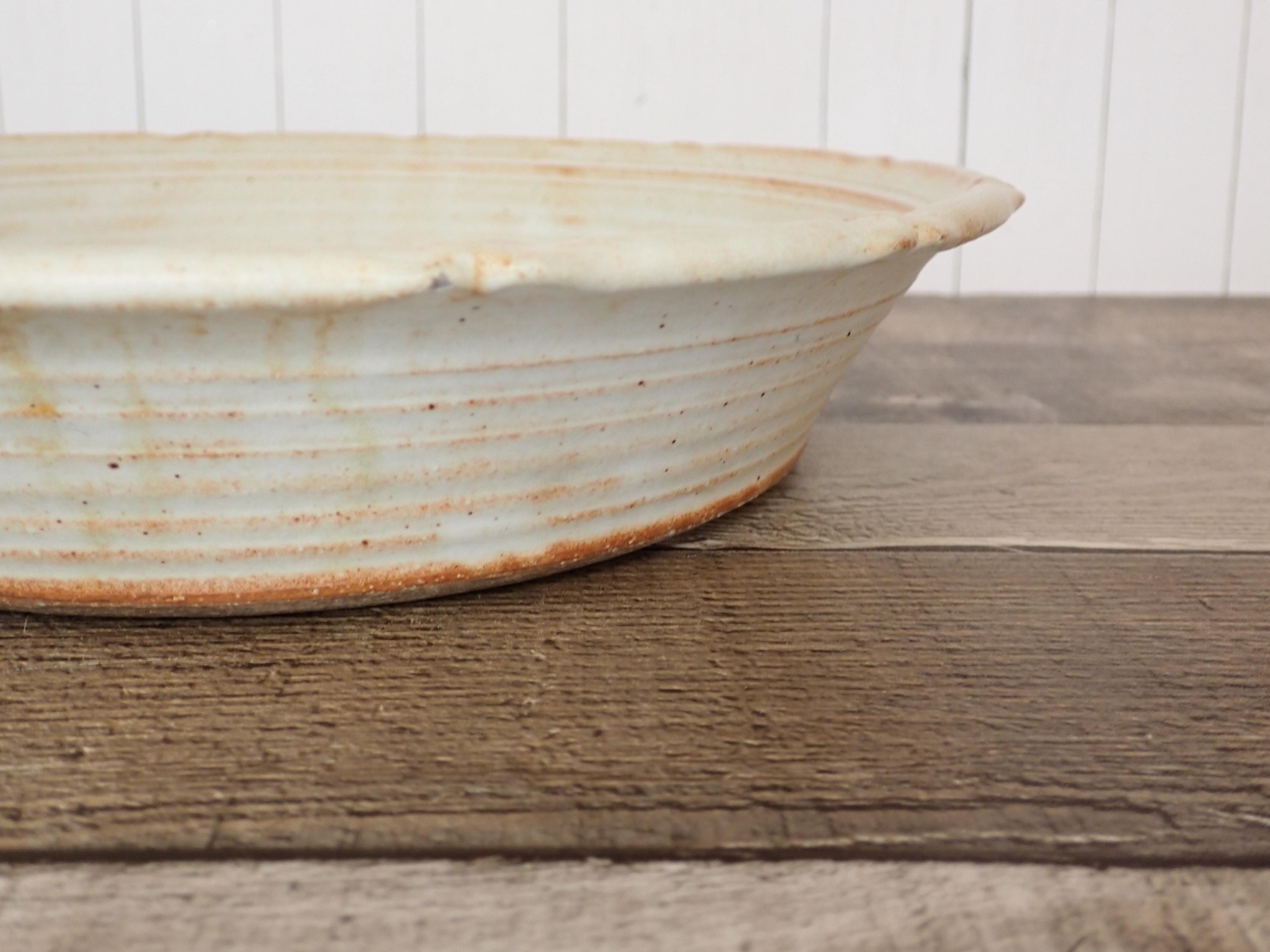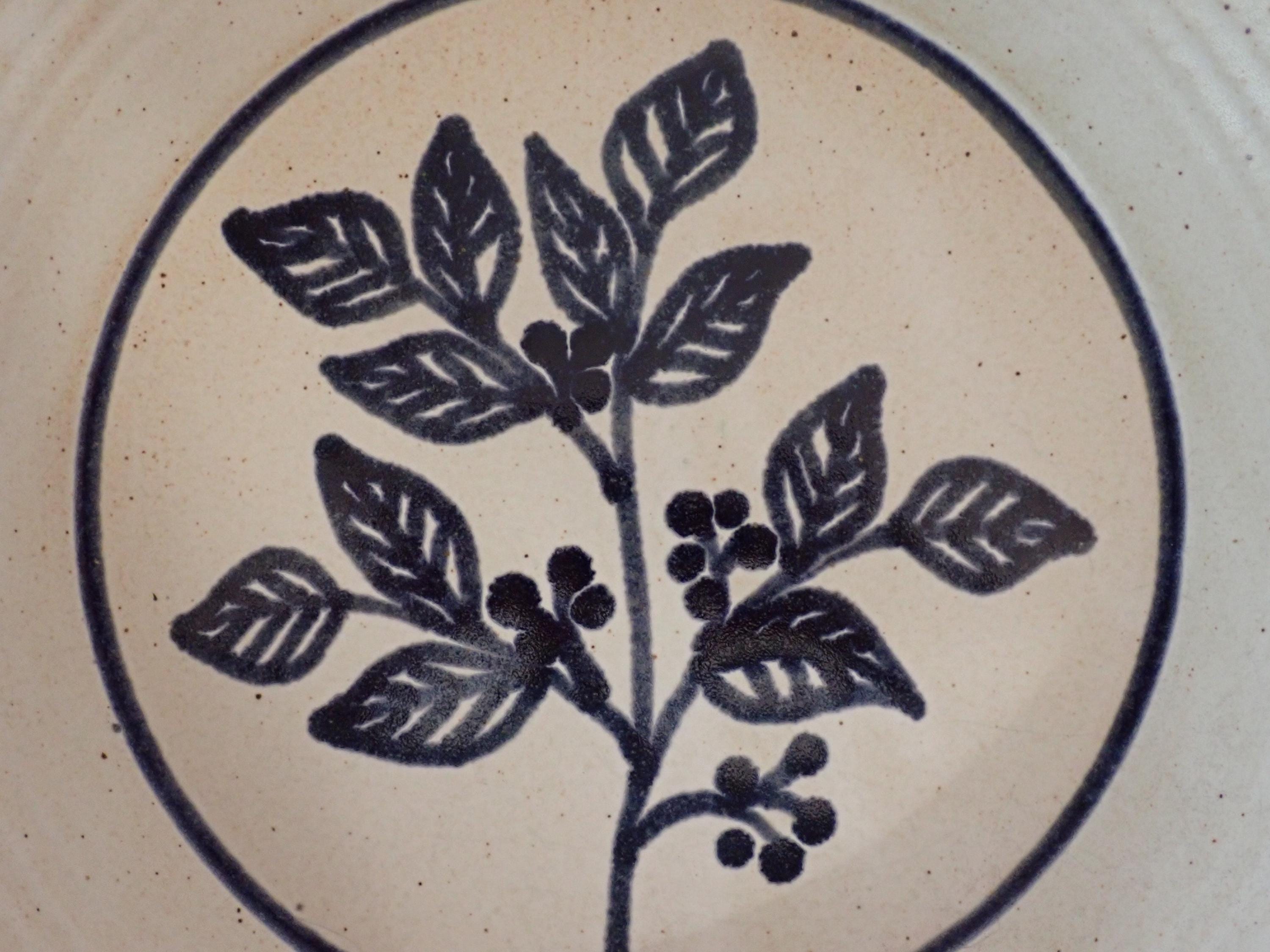 This handmade pie plate is 10" in diameter and 2" deep. It is a tan stoneware piece with a white glaze, and has an indented edge pattern around the rim. The plate is decorated with a blue stem with leaves, and small blue berries. The back is marked with the artists signature that I'm not able to make out. The pie plate is in very nice condition, however there is one small nick on the underside of the rim as shown in the last 2 photos. There is also a hanger on the back if you wish to display!