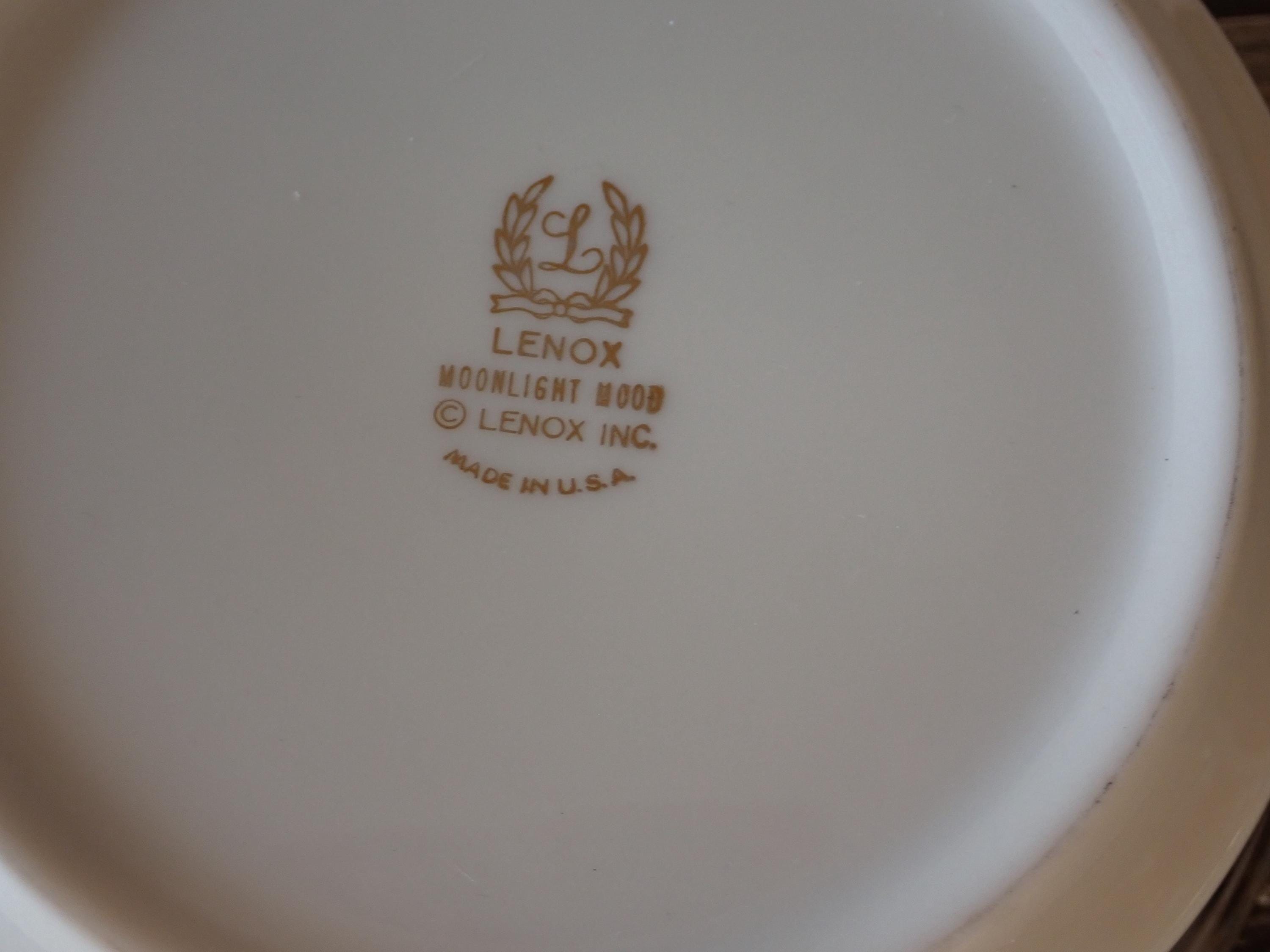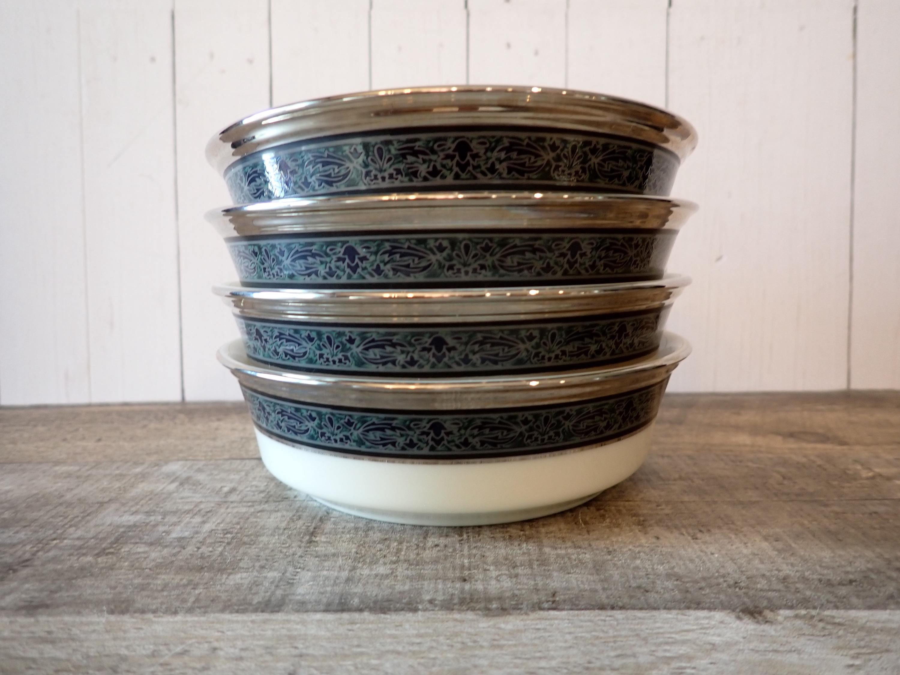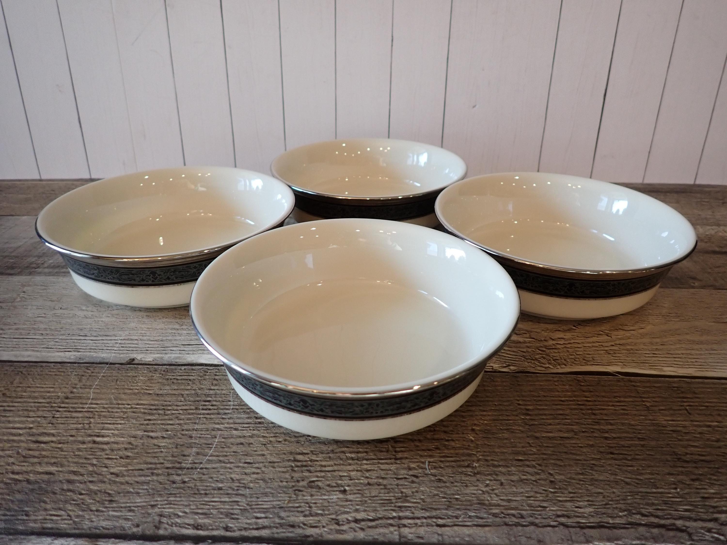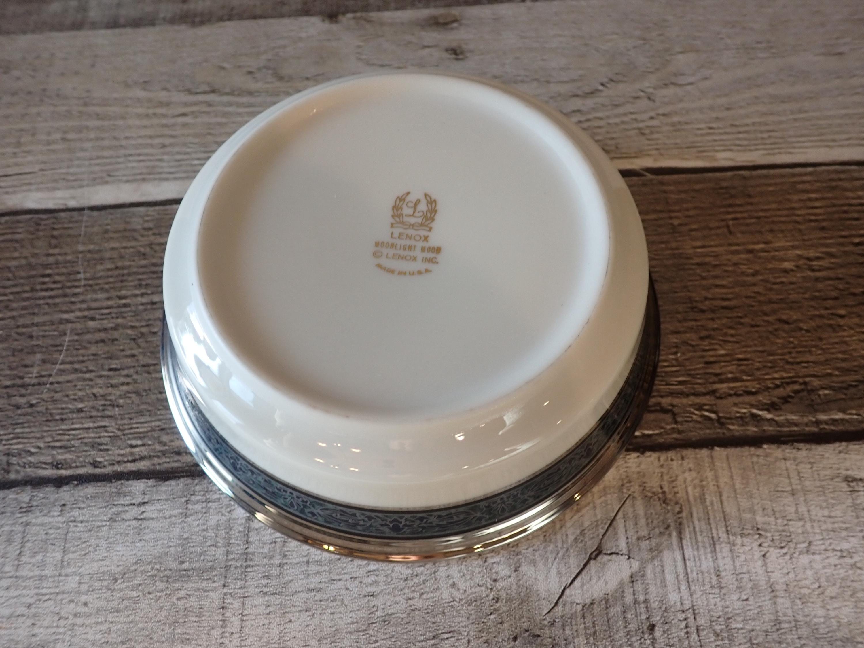 This set of 4 bowls by Lenox are in the Moonlight Mood pattern and are the 5" fruit bowls. The bowls are an ivory white with a black and green band around the rim with a leaf pattern. The rim is accented with a silver band. The bottoms are marked: LENOX / MOONLIGHT MOOD / LENOX INC. / MADE IN USA. All 4 bowls are in very nice condition with no chips or cracks. The graphics are bright and clear. There are 2 sets of 4 available if you are looking for a set of 8 bowls.