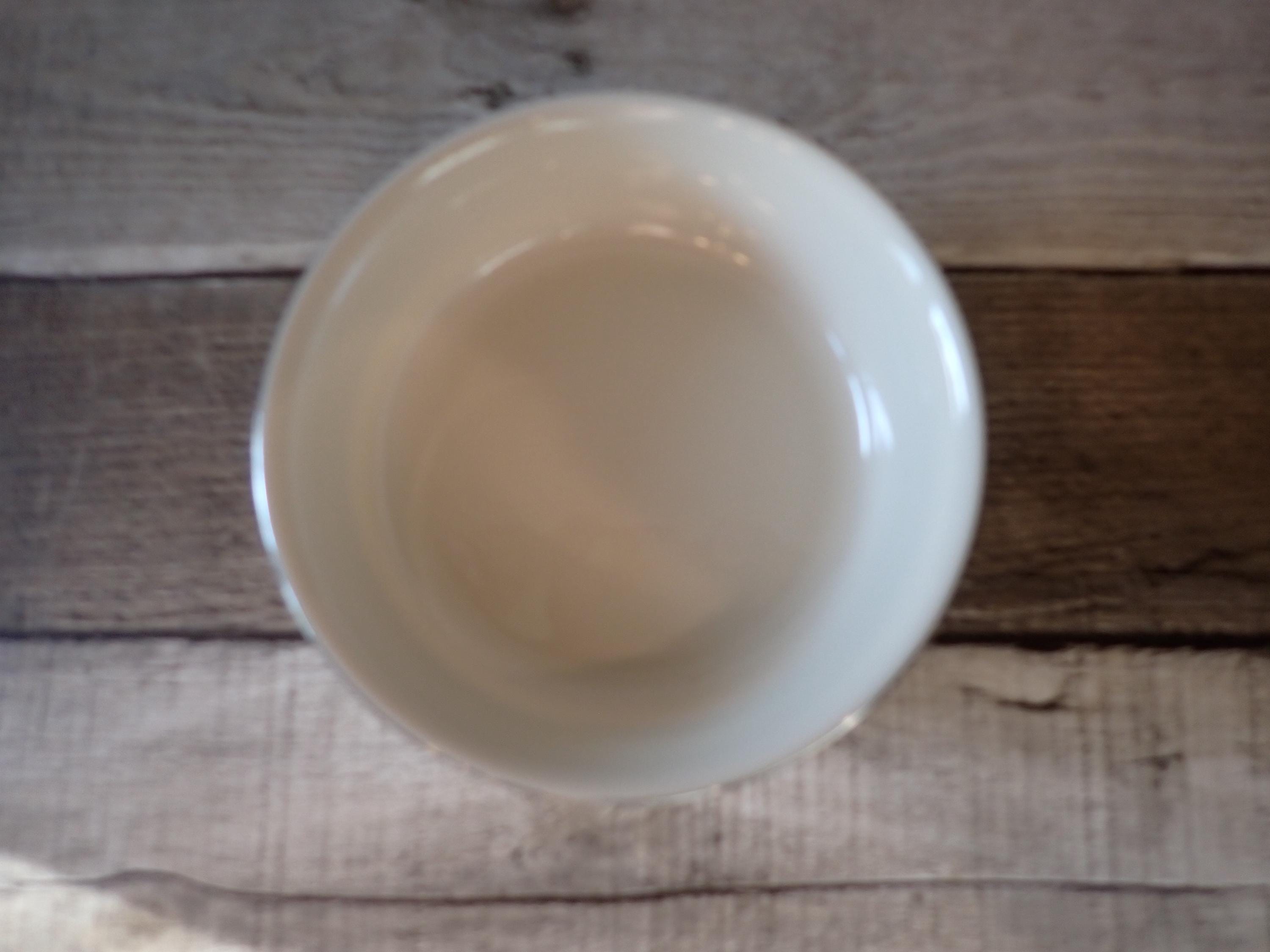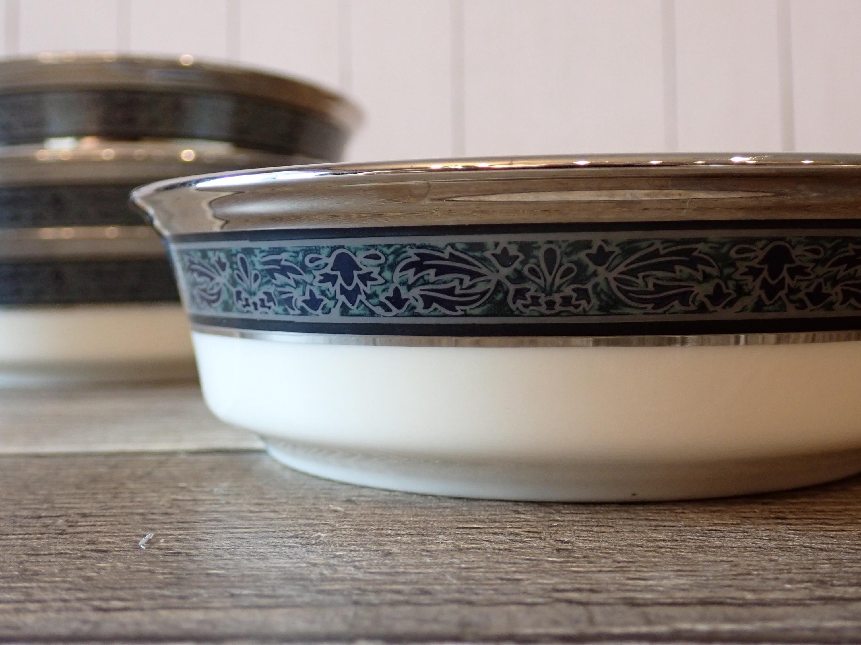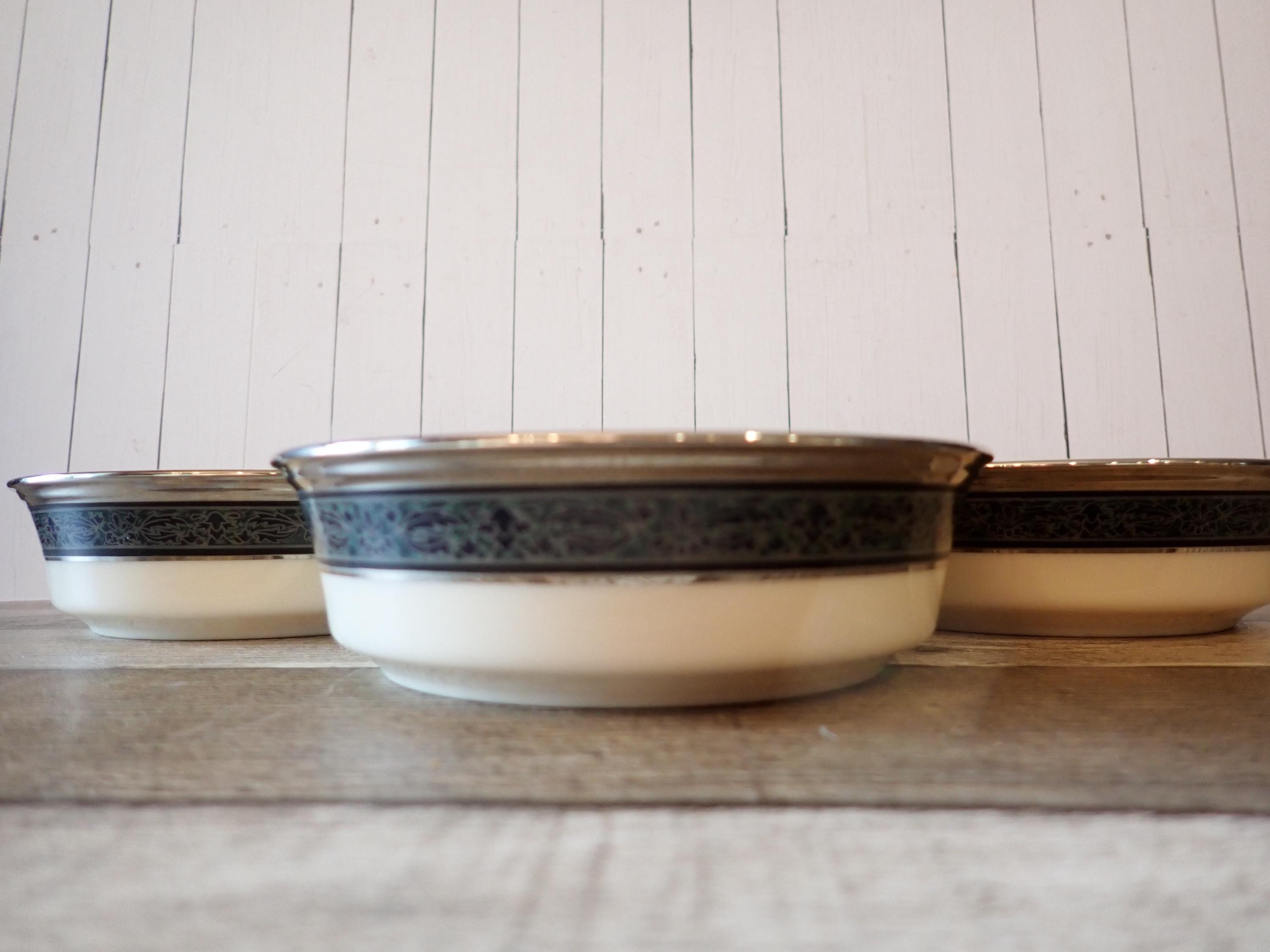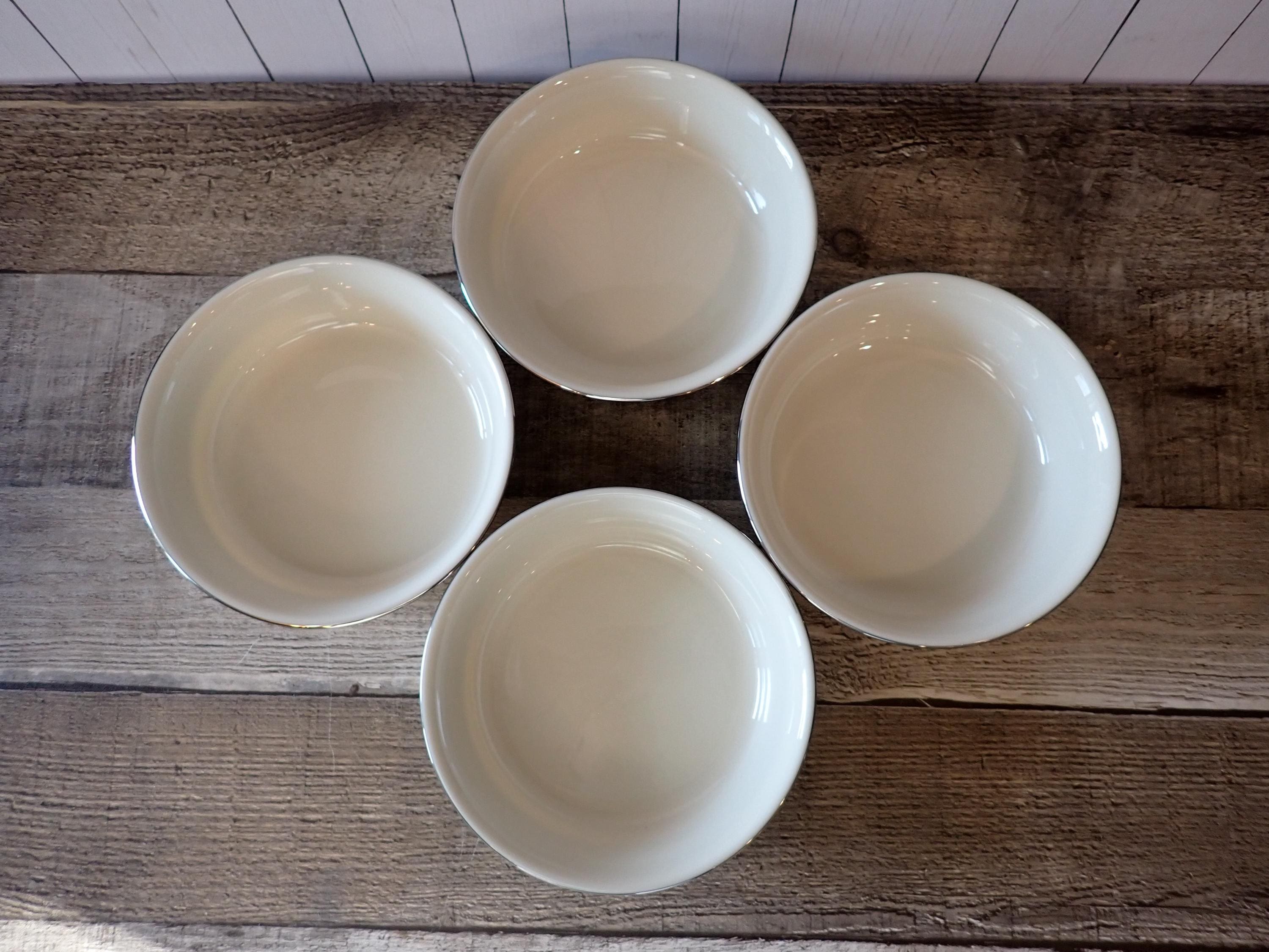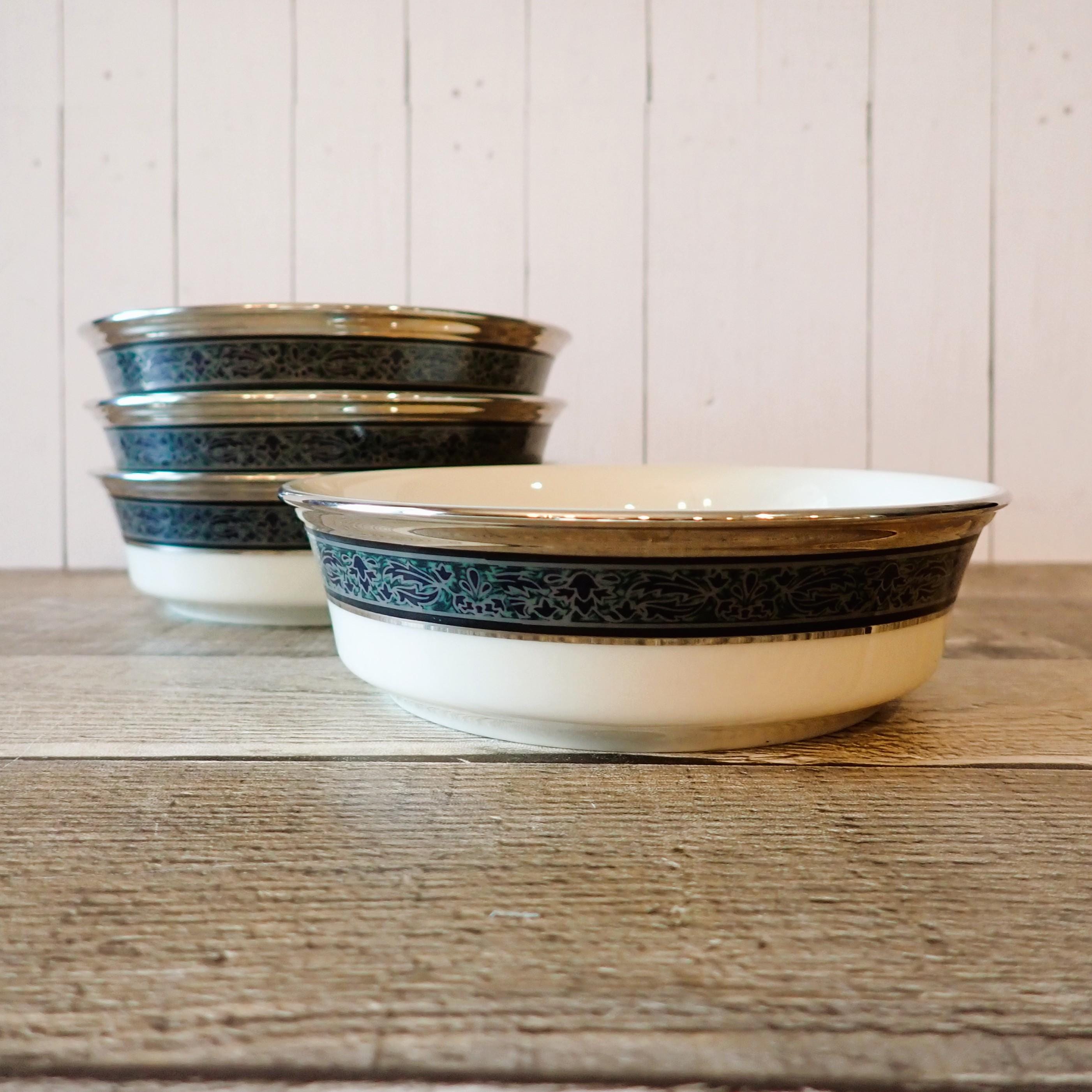This set of 4 bowls by Lenox are in the Moonlight Mood pattern and are the 5" fruit bowls. The bowls are an ivory white with a black and green band around the rim with a leaf pattern. The rim is accented with a silver band. The bottoms are marked: LENOX / MOONLIGHT MOOD / LENOX INC. / MADE IN USA. All 4 bowls are in very nice condition with no chips or cracks. The graphics are bright and clear. There are 2 sets of 4 available if you are looking for a set of 8 bowls.