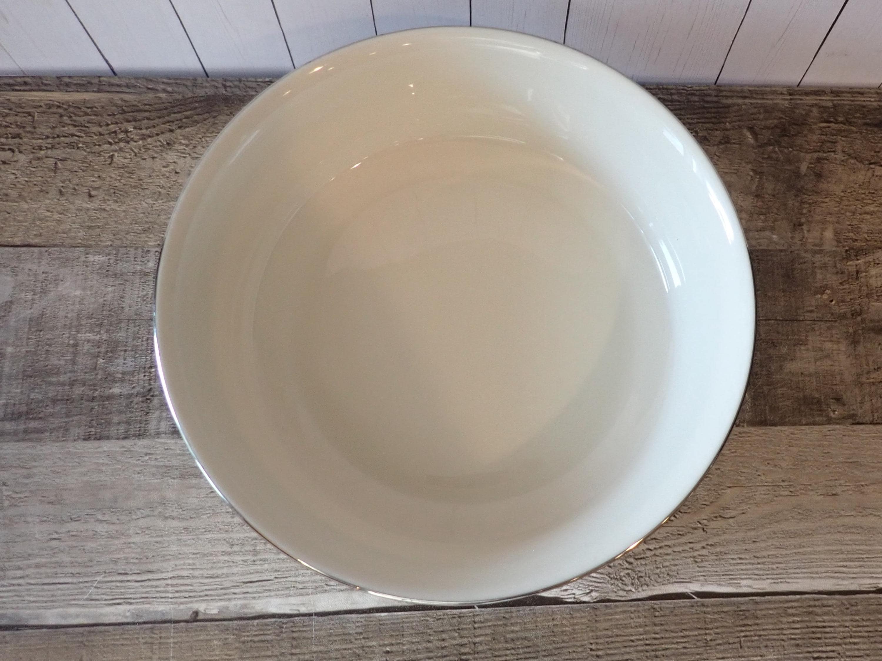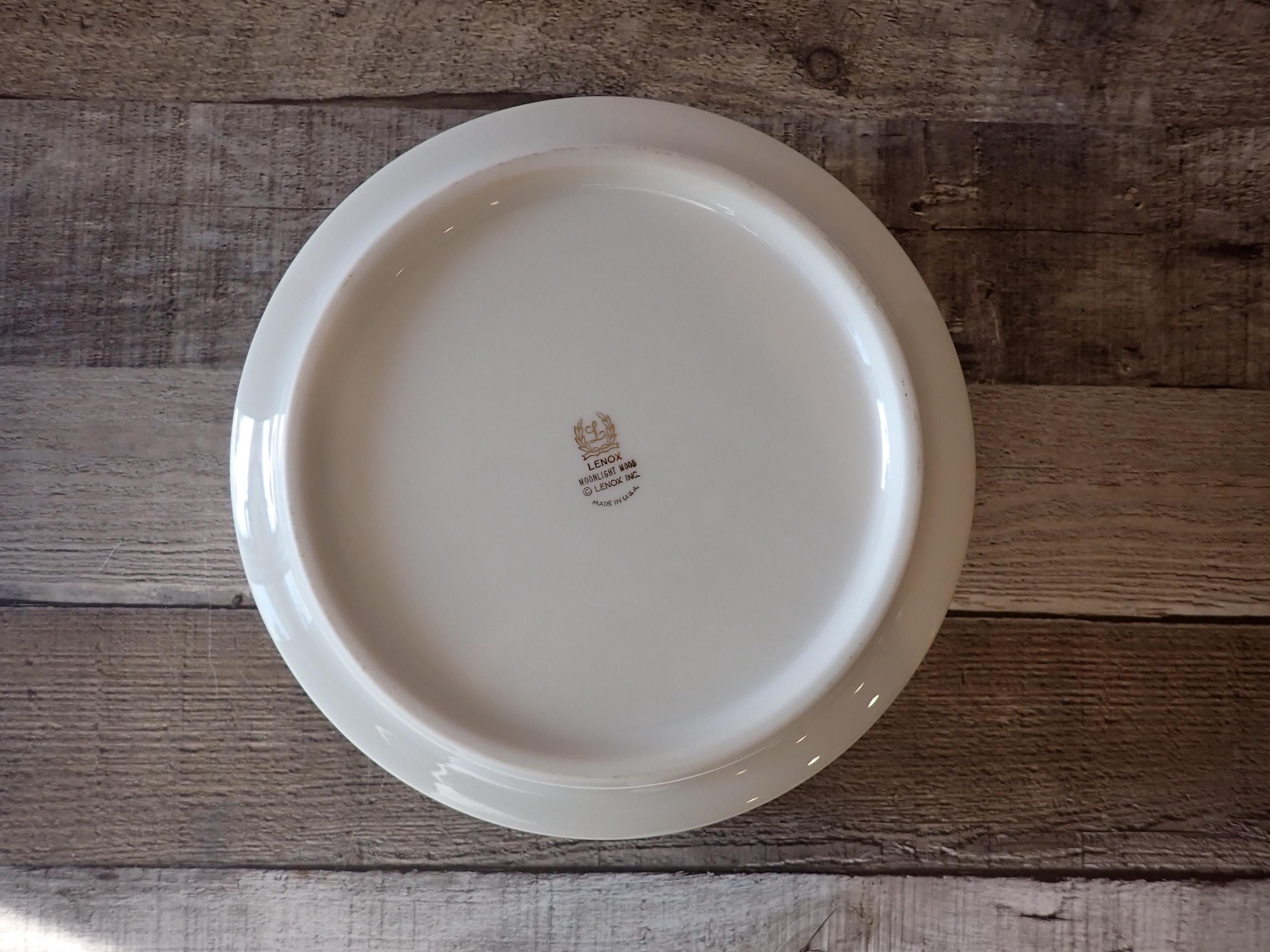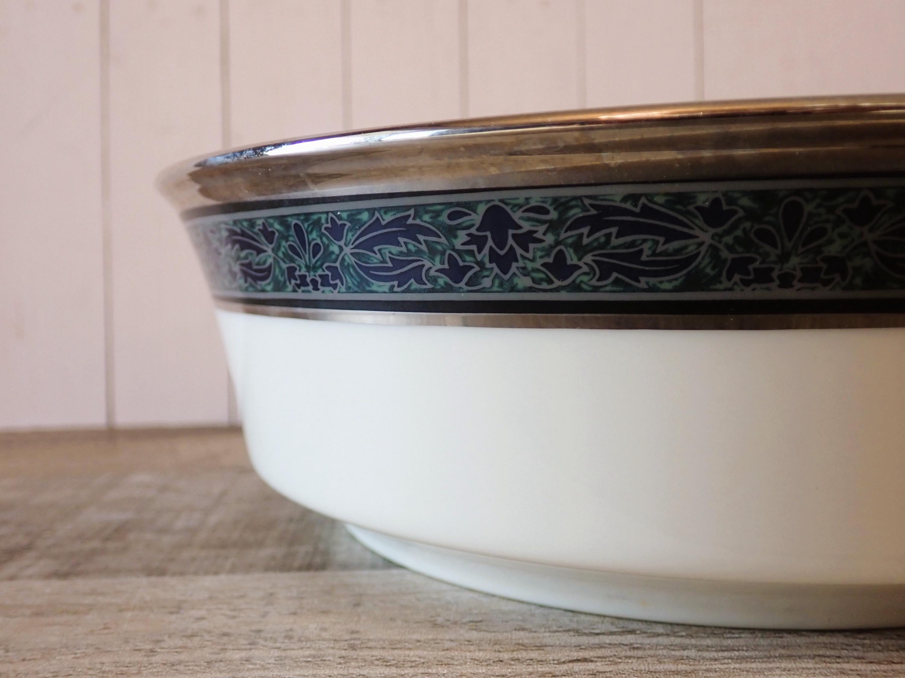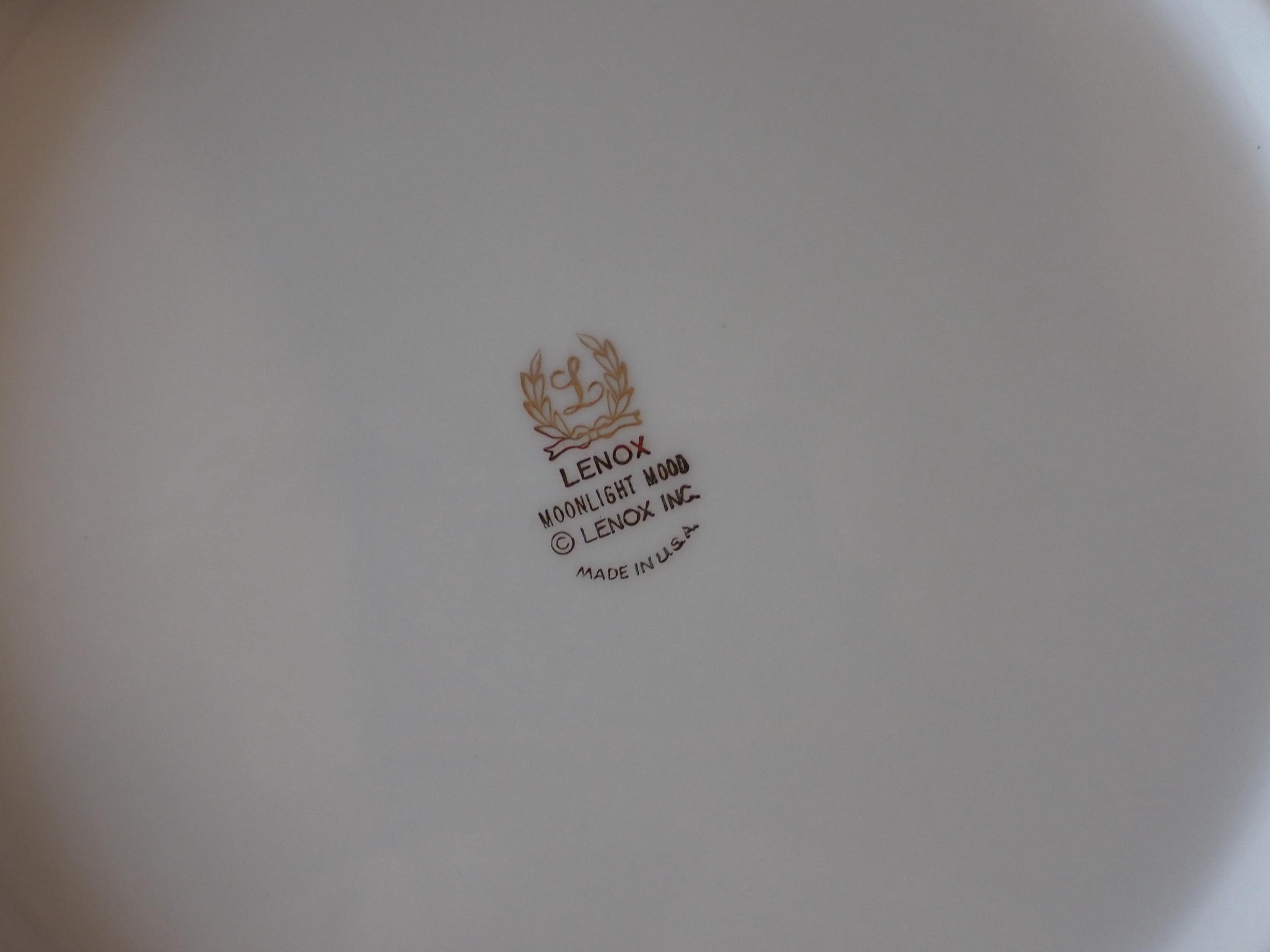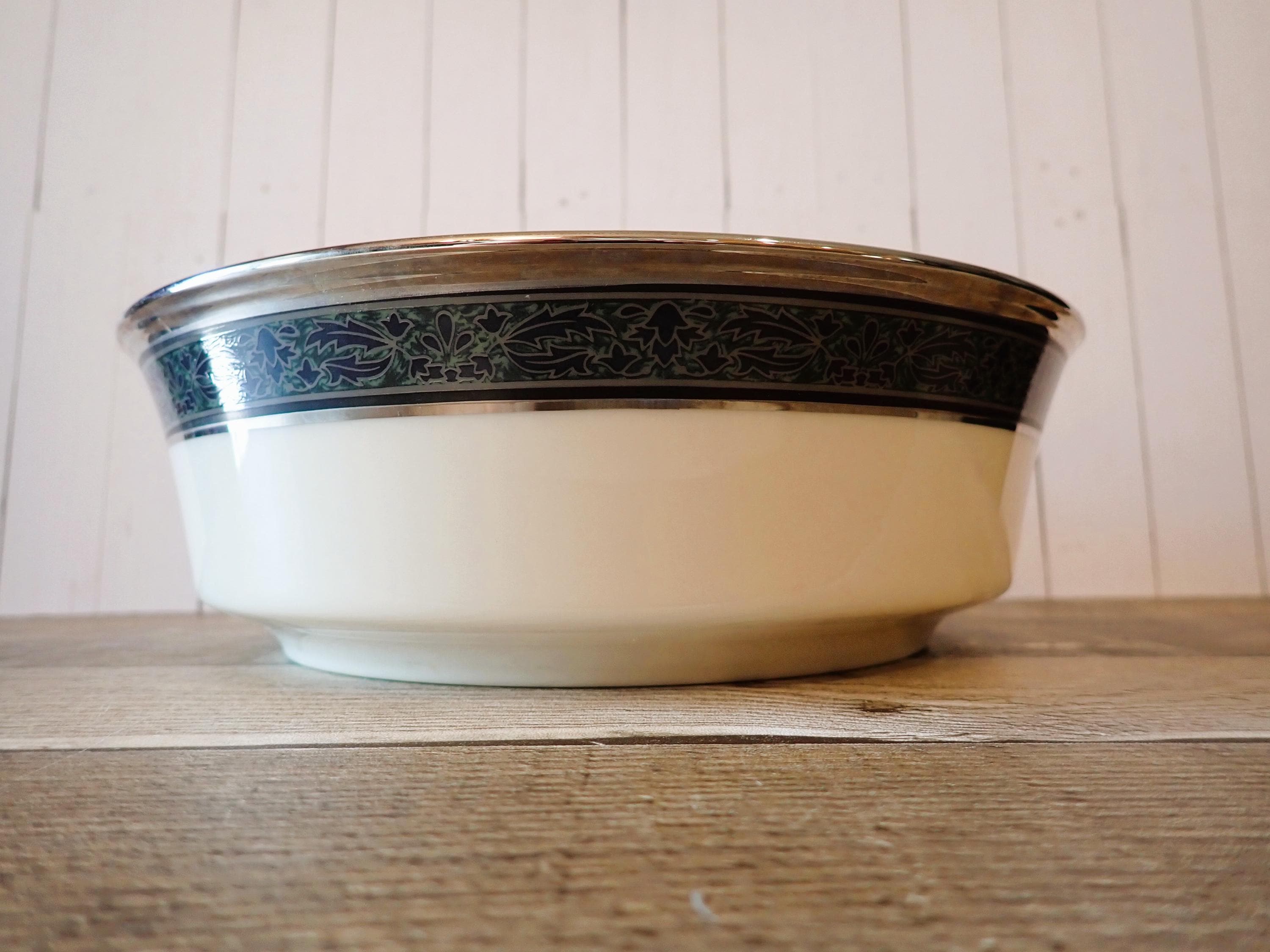 This lovely vegetable bowl by Lenox is in the Moonlight Mood pattern and is 9.25" in diameter and 3" tall. The bowl is an ivory white with a black and green band around the rim with a leaf pattern. The rim is accented with a silver band. The bottom is marked: LENOX / MOONLIGHT MOOD / LENOX INC. / MADE IN USA. The bowl is in very good condition with no chips or cracks. The graphics are bright and clear.