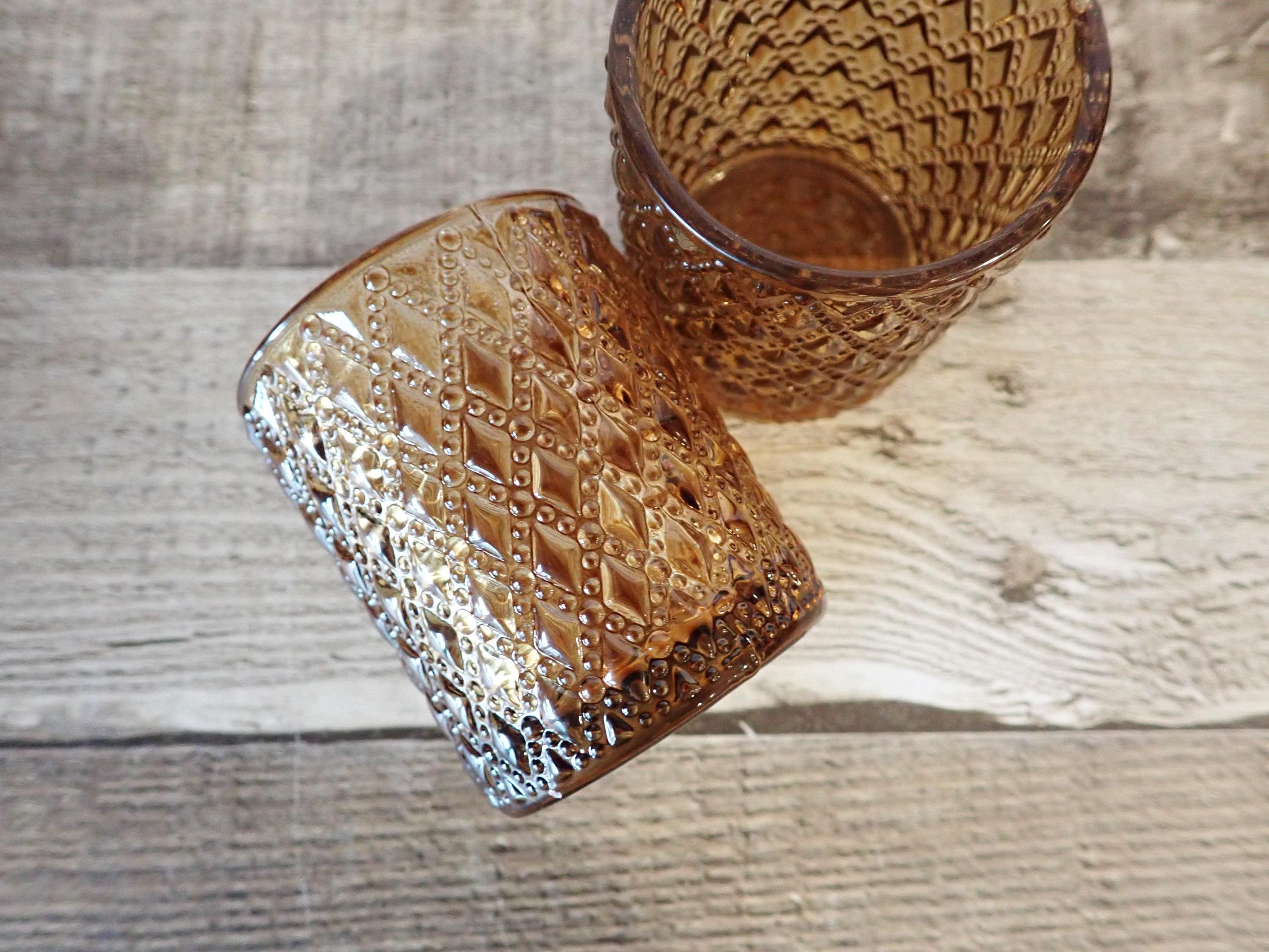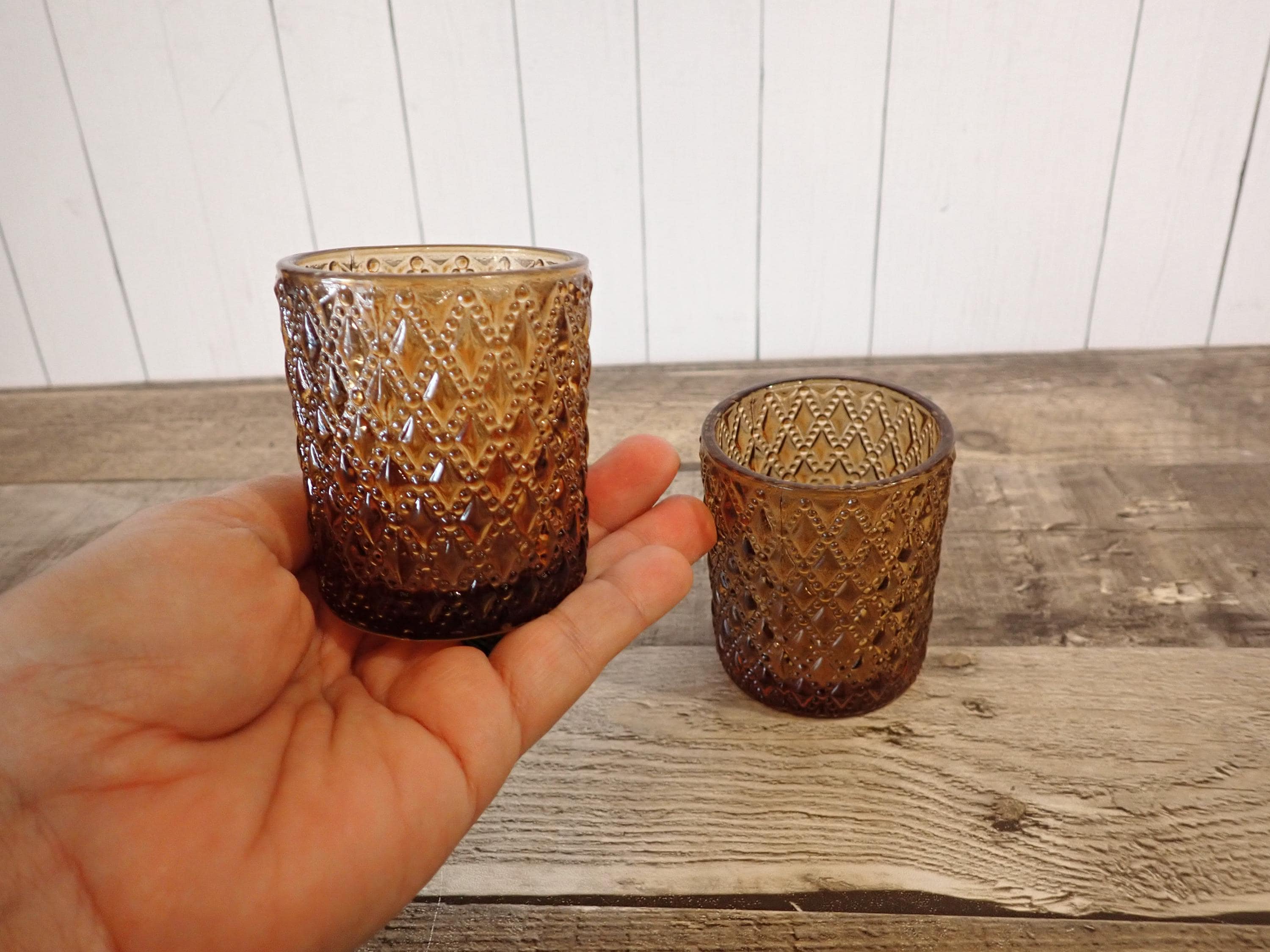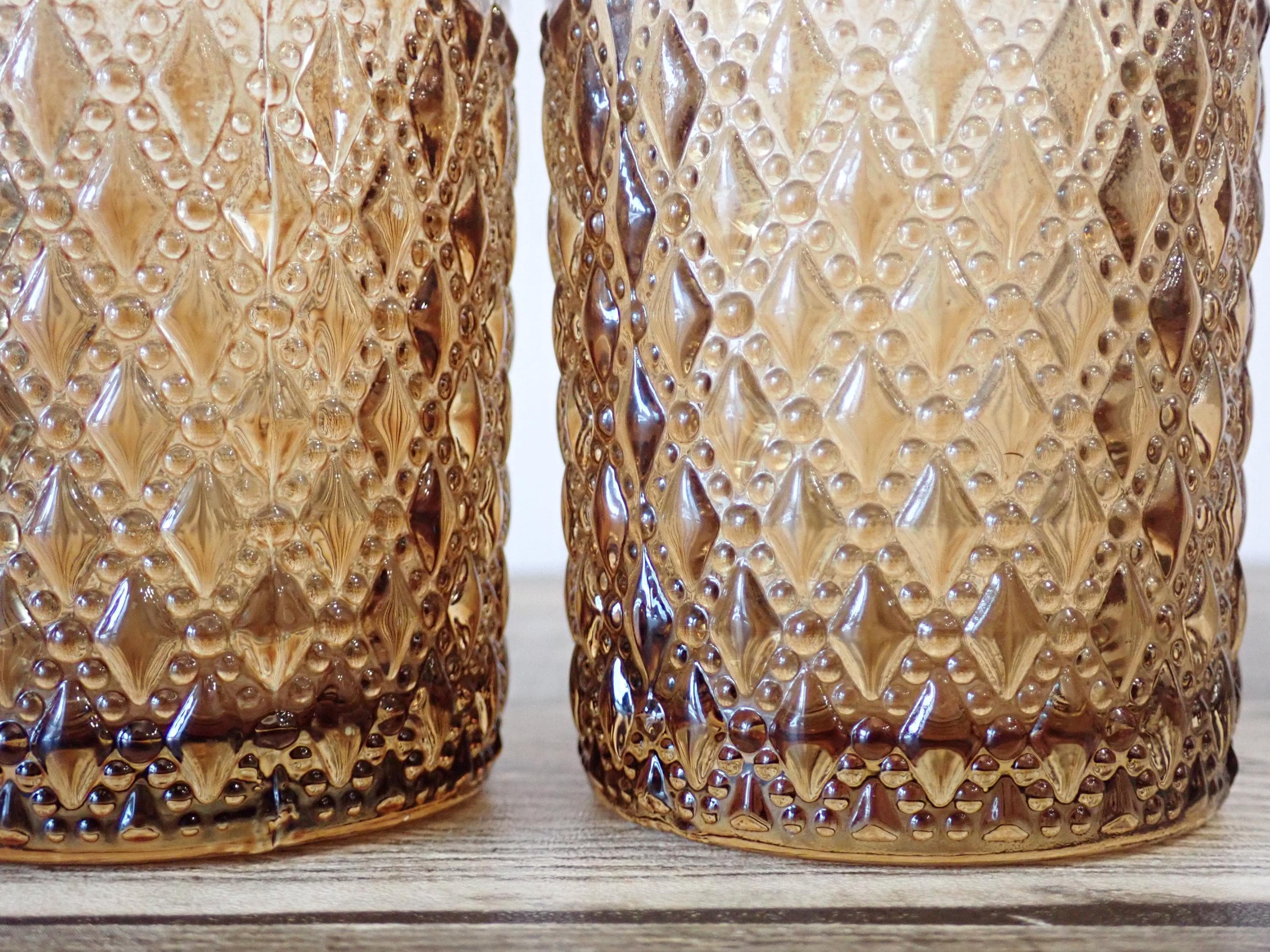This set of 2 amber/orange colored glass candle holders measure 2.5" tall and 2.5" in diameter. They have a 1.75" opening at the top to hold a tealight or small votive candle. They have a quilted diamond design in the glass. Both of the candle holders are in very good condition with no chips or cracks.