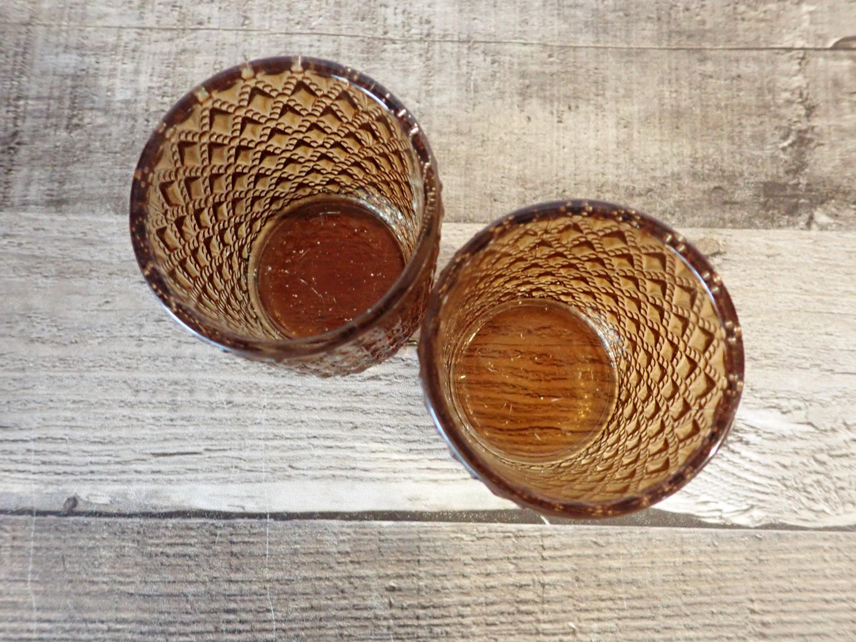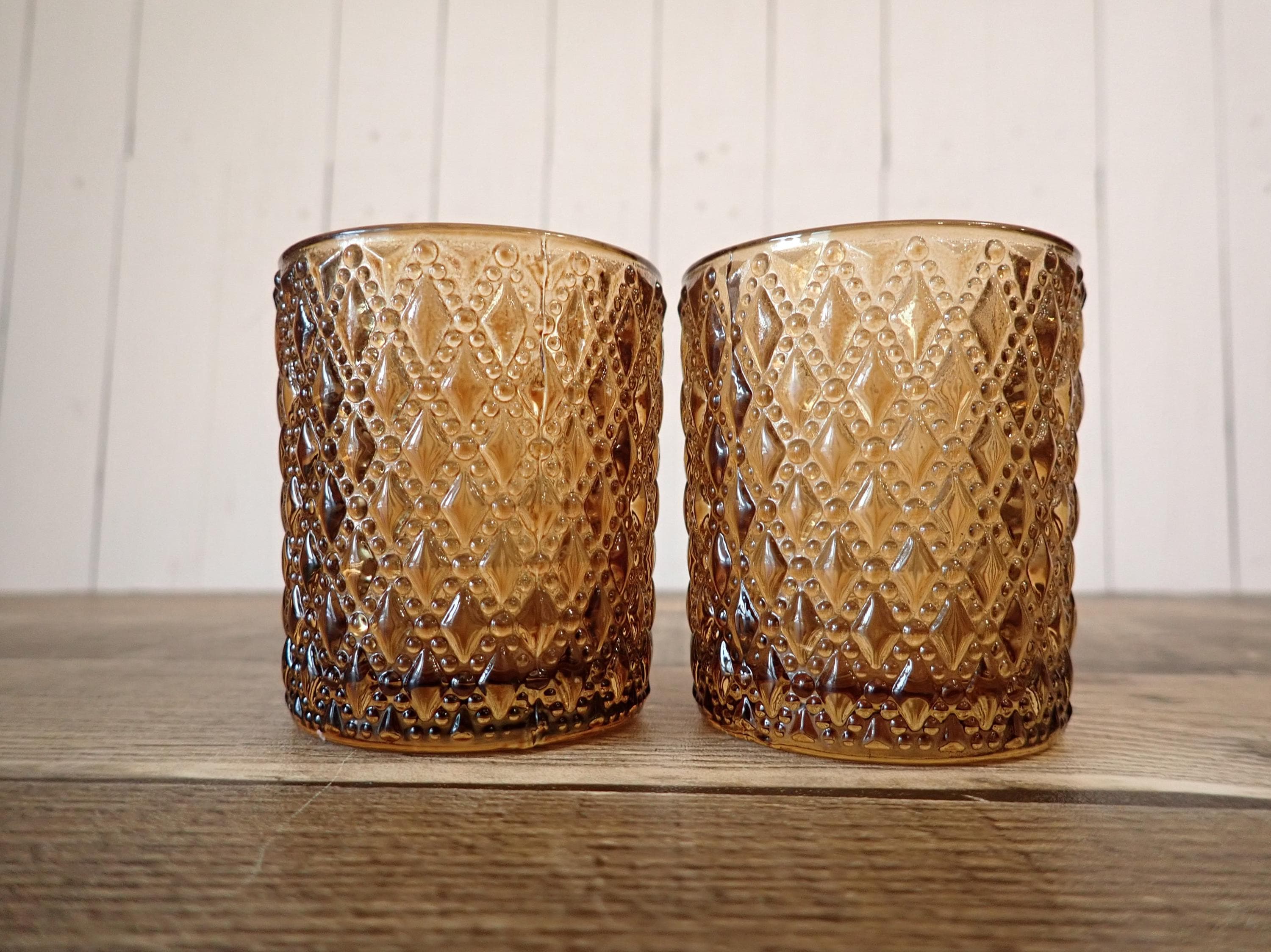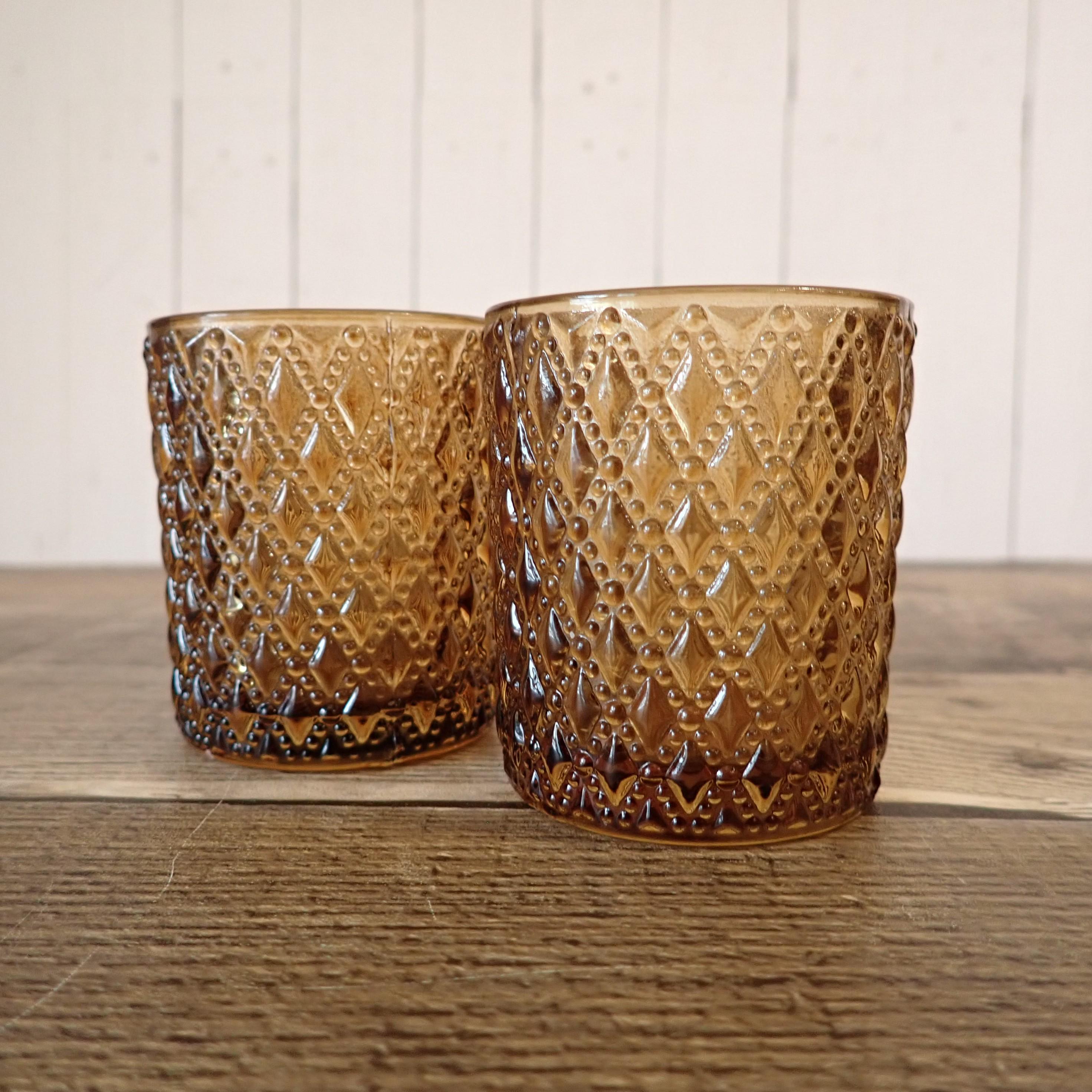 This set of 2 amber/orange colored glass candle holders measure 2.5" tall and 2.5" in diameter. They have a 1.75" opening at the top to hold a tealight or small votive candle. They have a quilted diamond design in the glass. Both of the candle holders are in very good condition with no chips or cracks.