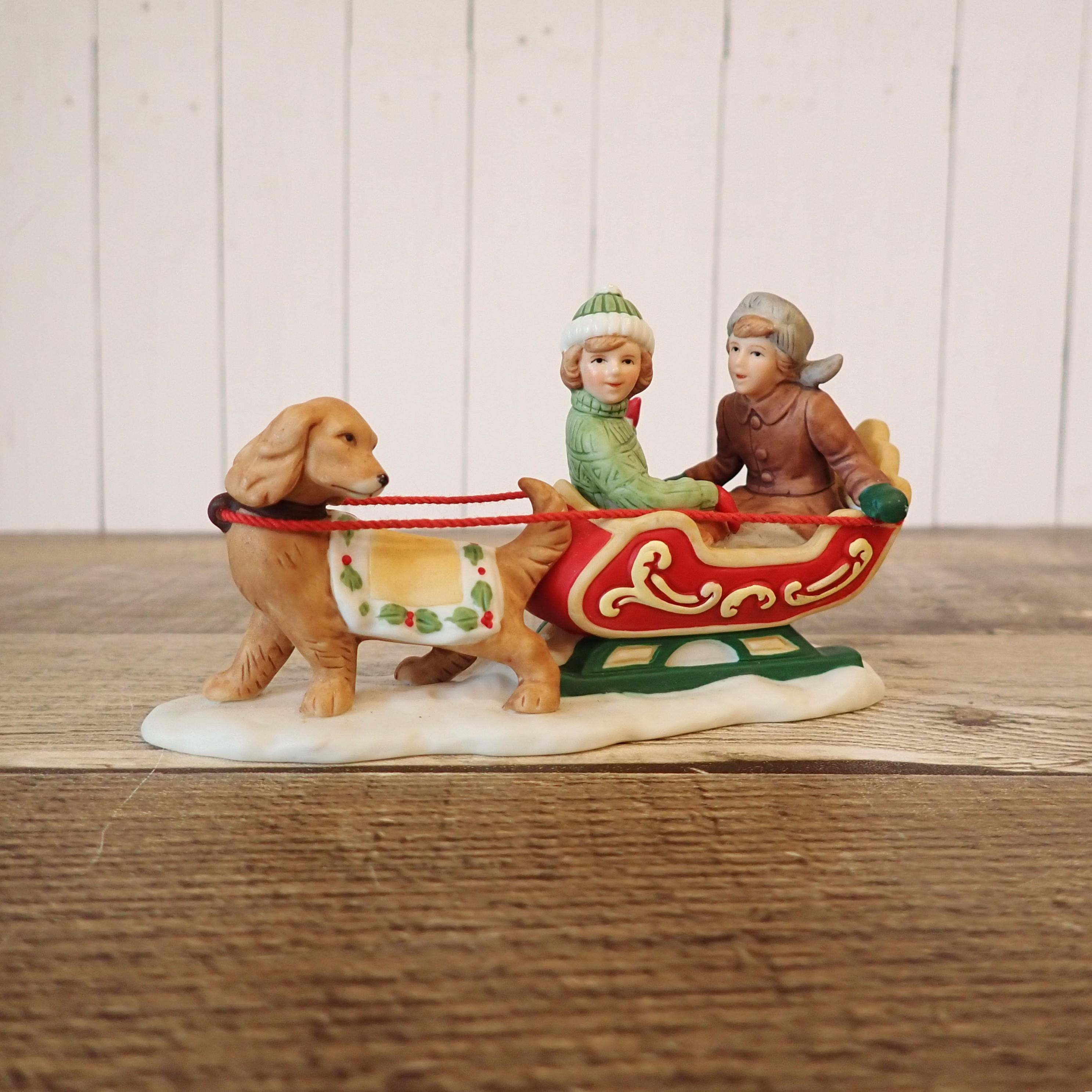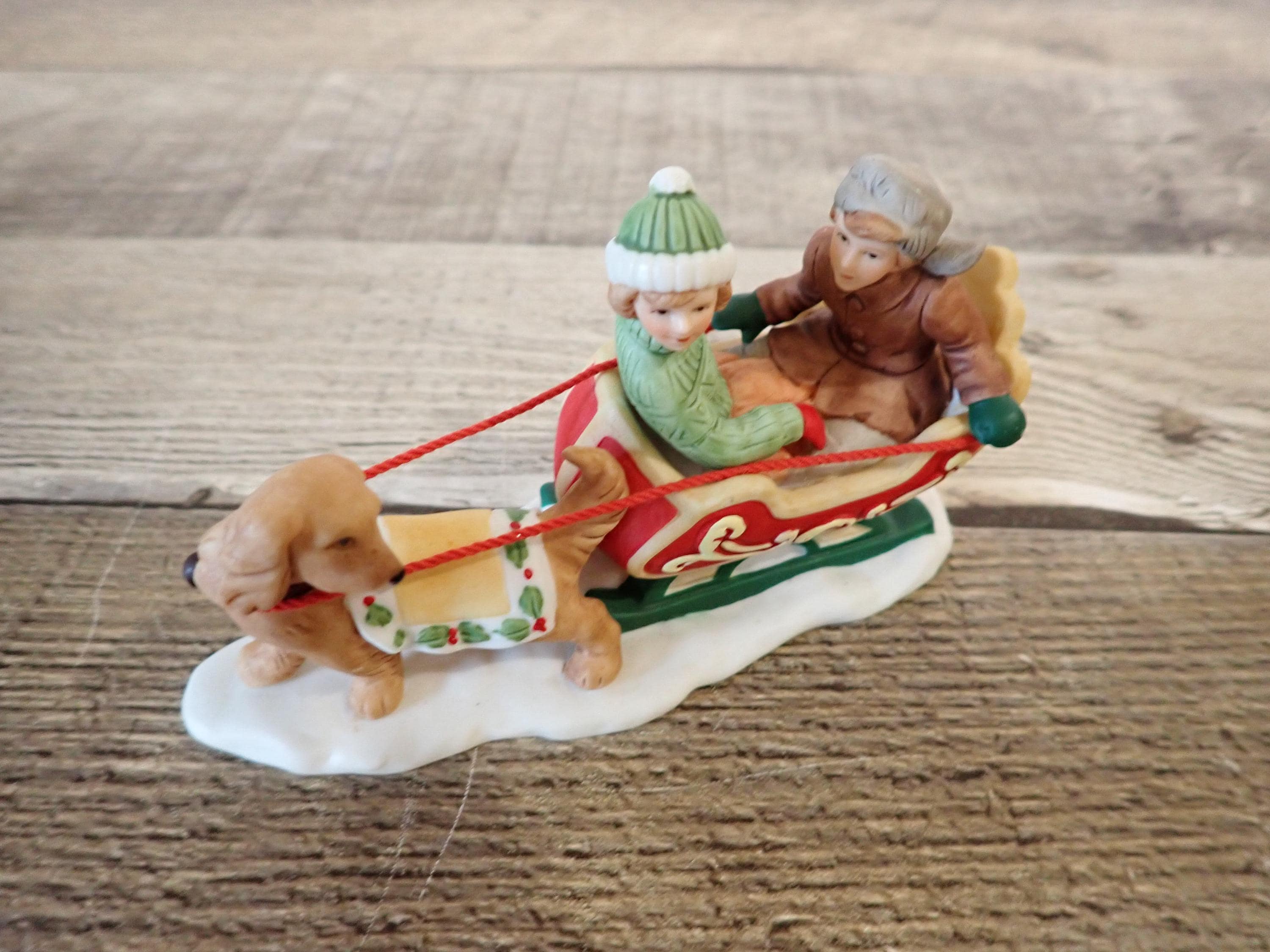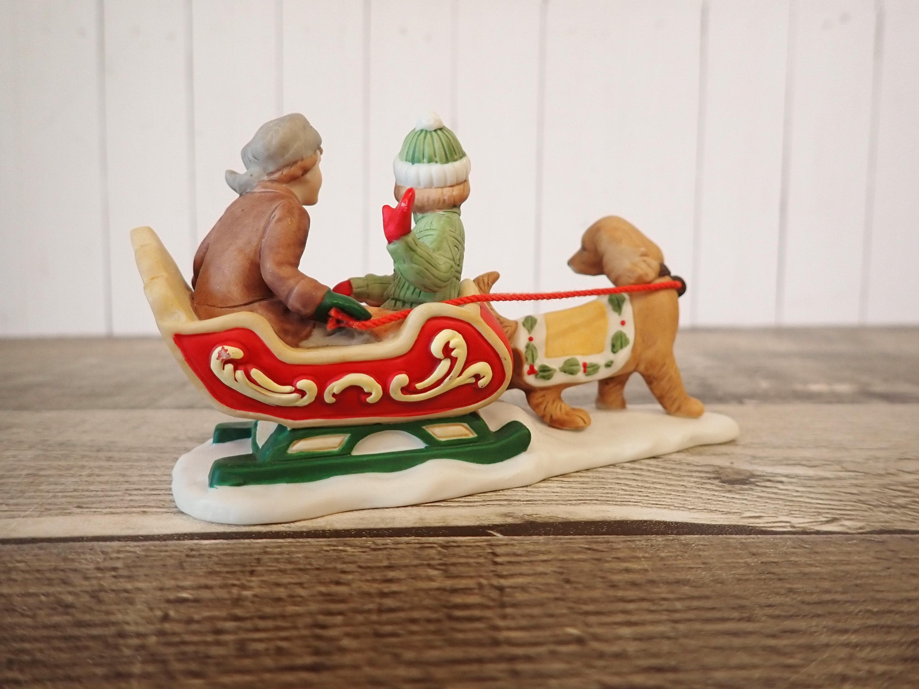 This Lefton Colonial Village figurine is piece 00268 and has a dog pulling a sled with a boy and girl inside. The piece is 4.5" long, 1.75" deep, and 2.5" tall. The piece is marked 1991 Geo Z Lefton / 00268 on the bottom. The figurine is in very good condition with no chips or cracks. There is a little bit of wear to the red paint along the edge of the red mitten.