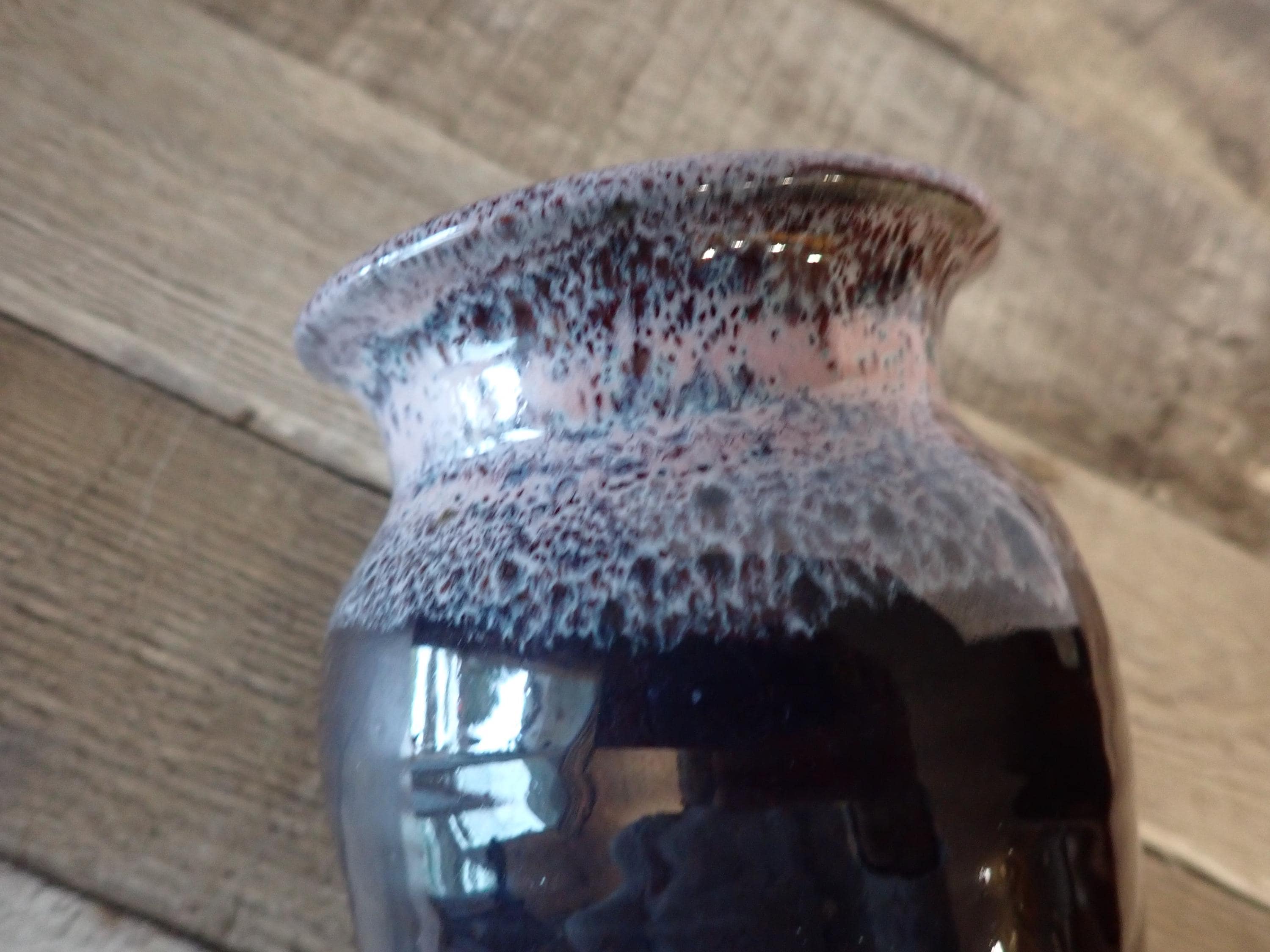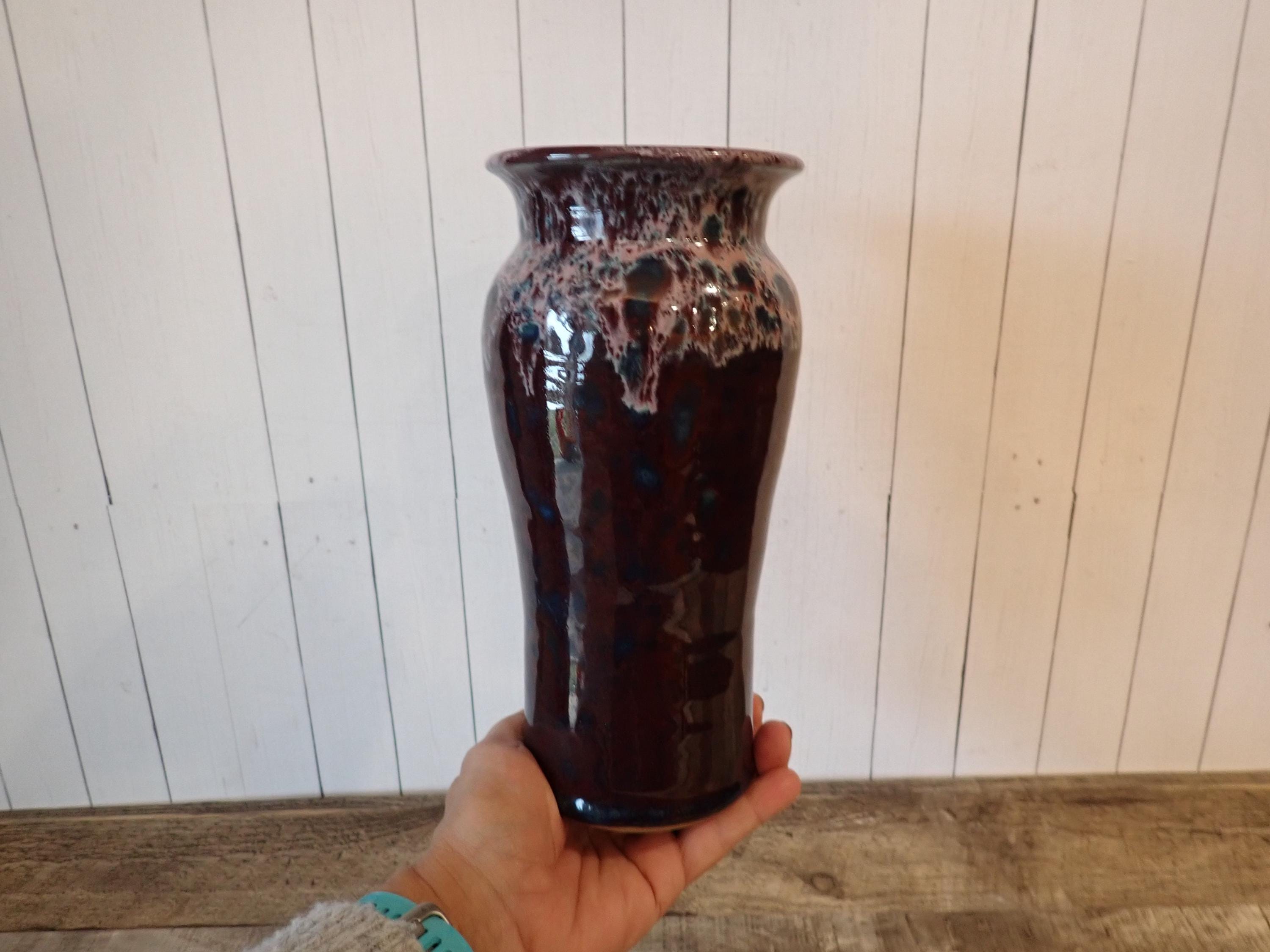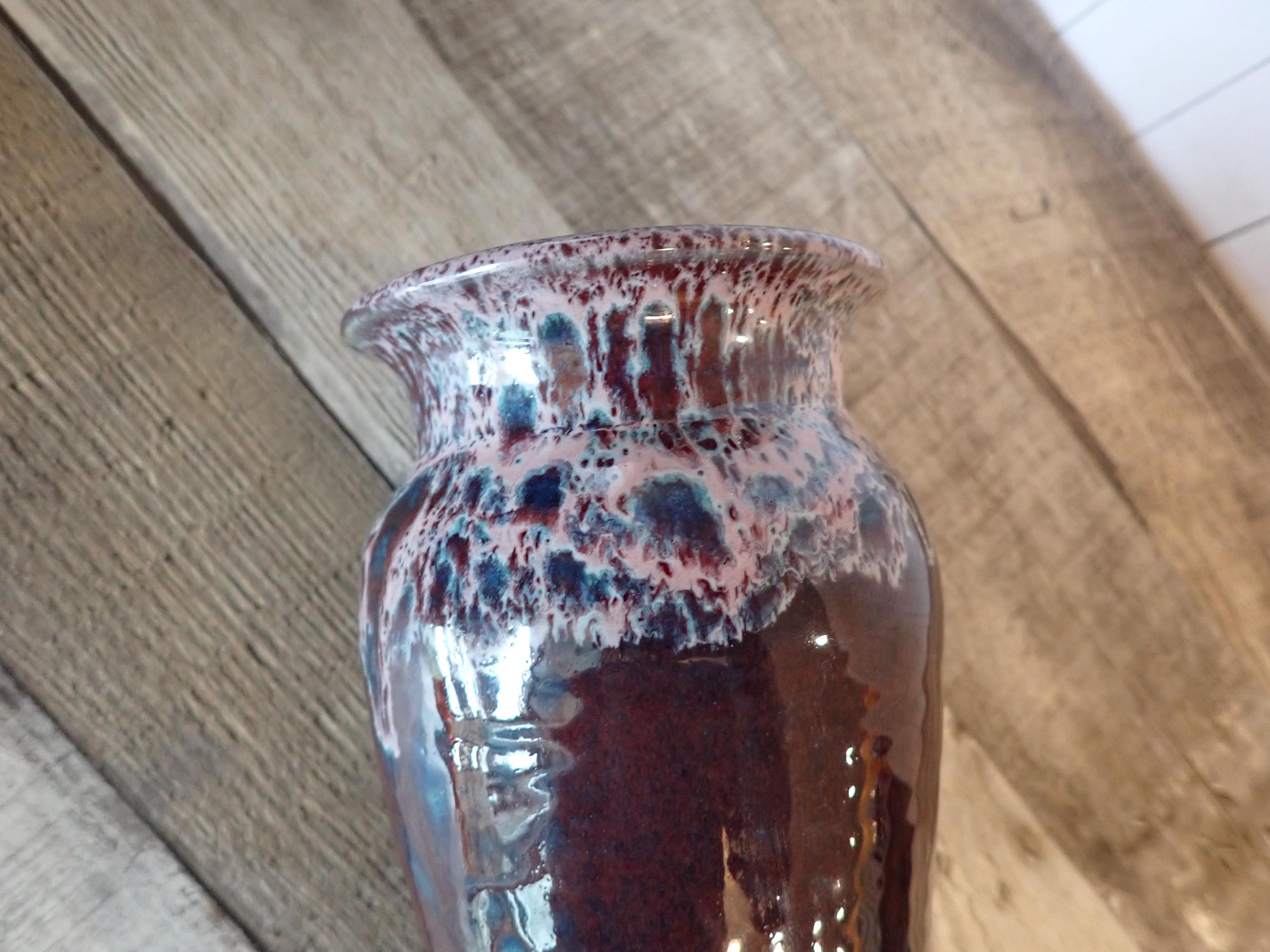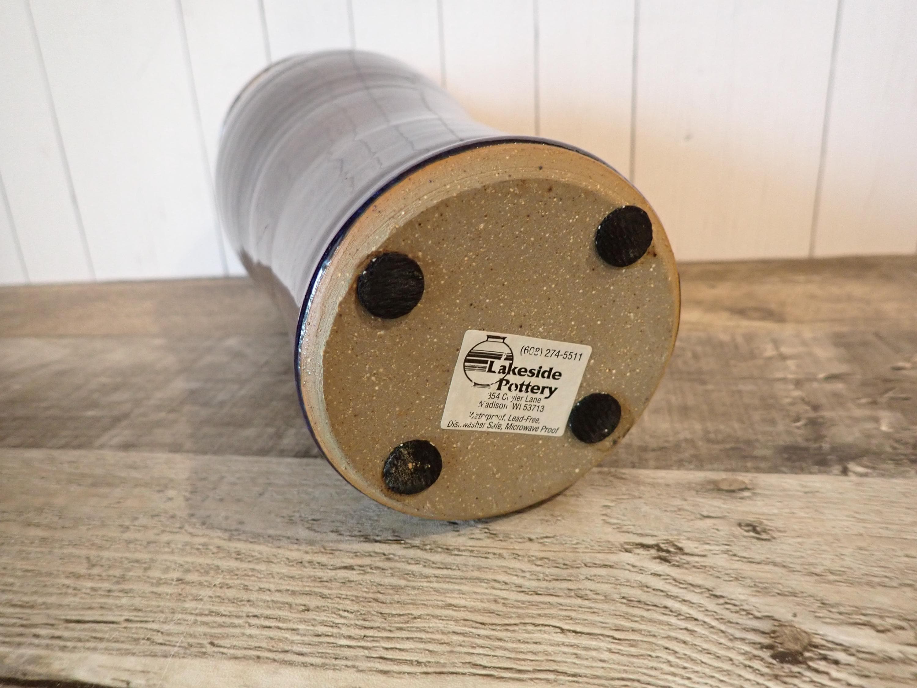 This stoneware vase is 9" tall and 4.5" in diameter at the widest point. It is a handmade pottery piece, and has an original label on the bottom by the artist - Lakeside Pottery from Madison, WI. The vase is a purple glazed stoneware with pink drip edge around the rim. The body of the vase has some darker purple spots throughout the vase. The vase is in very nice condition with no chips or cracks.